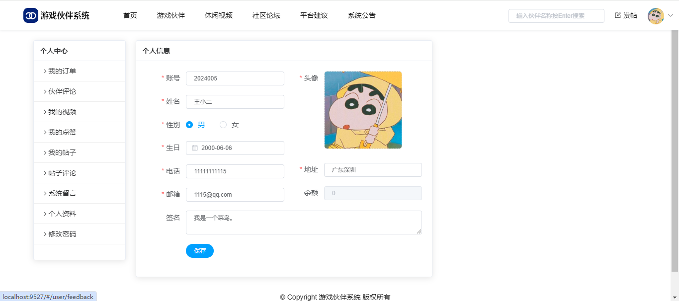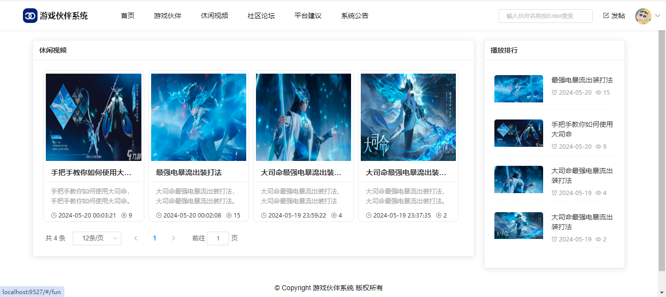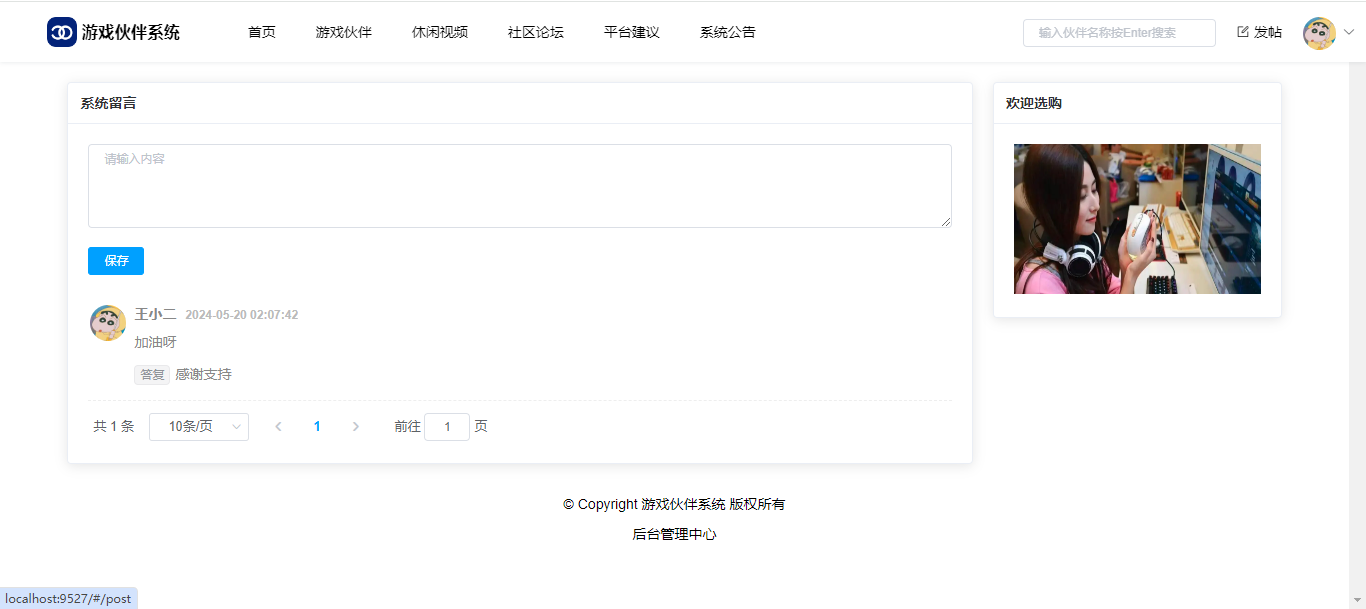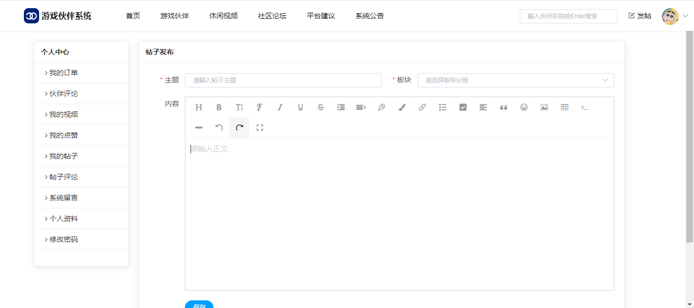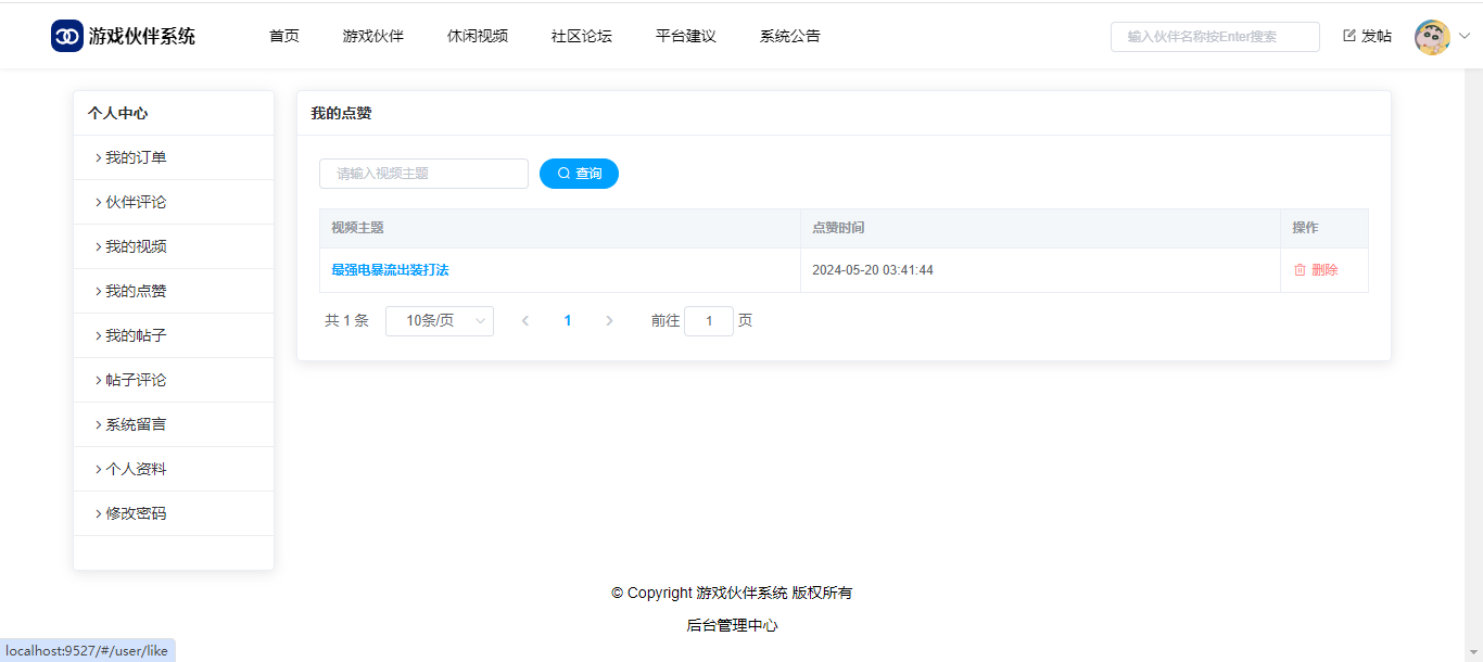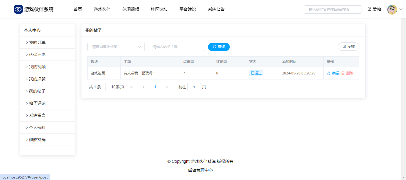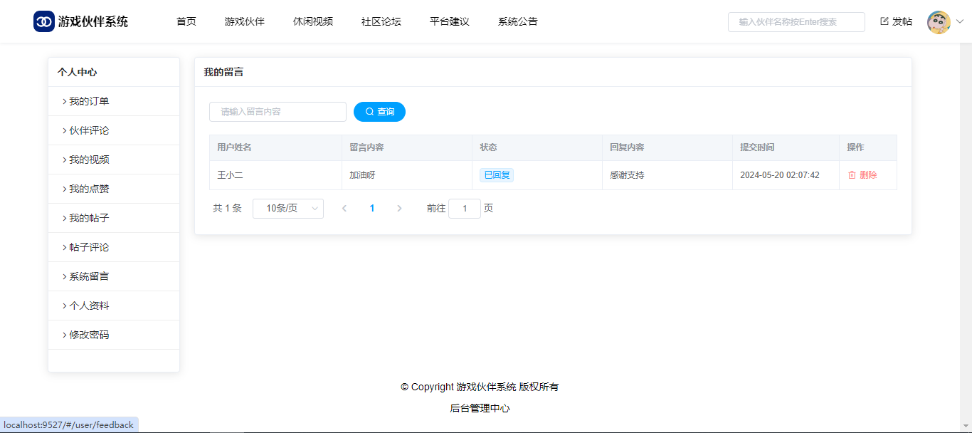 用户:查看前台;查看游戏伙伴并且预约或评论;发布休闲视频;查看帖子、发帖、评论;平台建议;查看公告;个人中心可以看到我的预约订单,我对伙伴的评论、我的视频、我的点赞、我的帖子、帖子评论、系统留言、个人资料、修改密码。