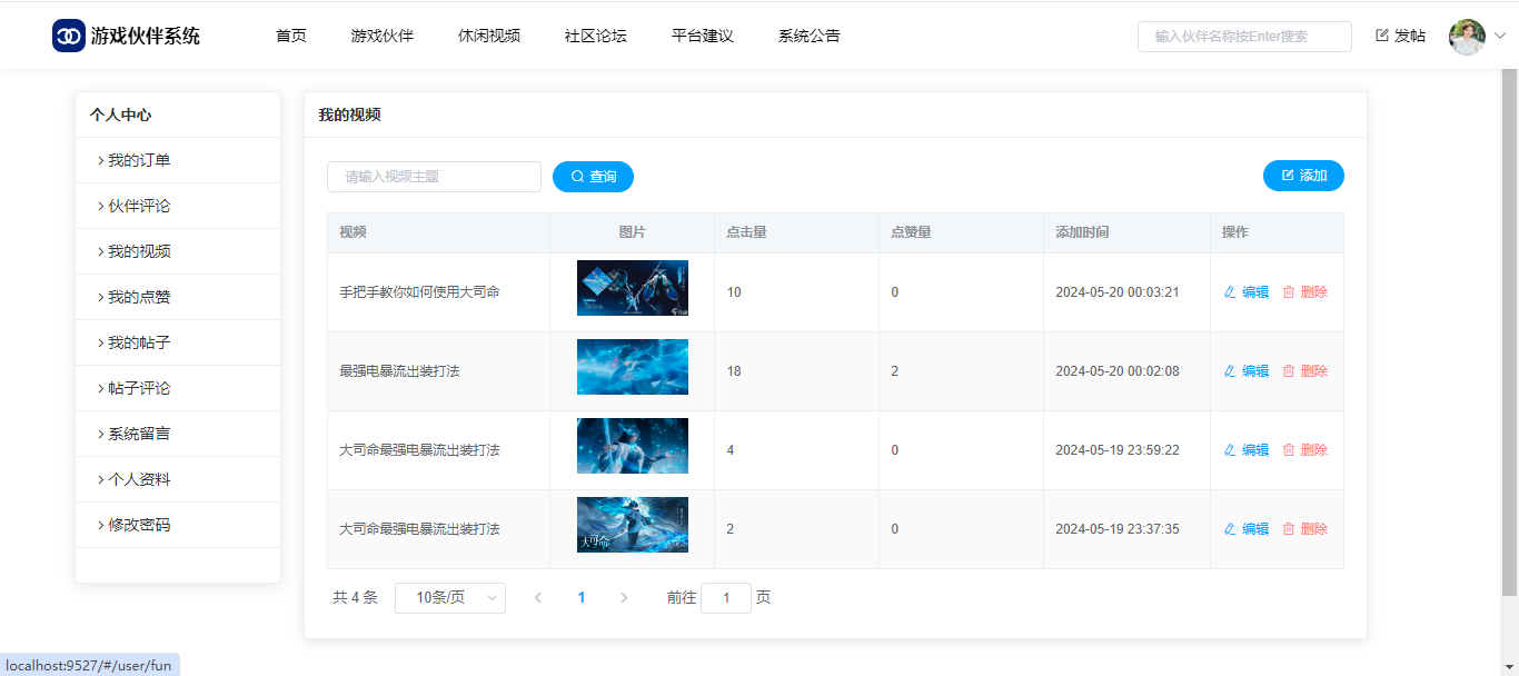 伙伴:查看前台;发布休闲视频;查看帖子、发帖、评论;平台建议;查看公告;个人中心可以看到用户的预约订单,用户对我的评论、我的视频、我的点赞、我的帖子、帖子评论、系统留言、个人资料、修改密码。