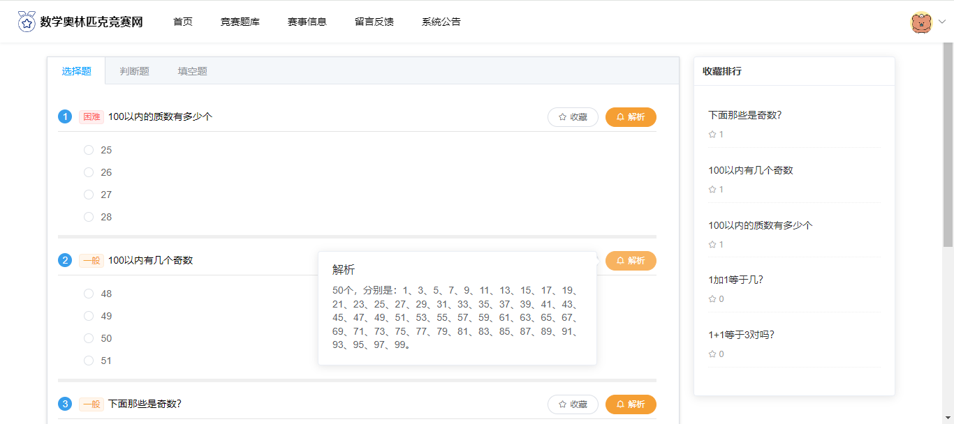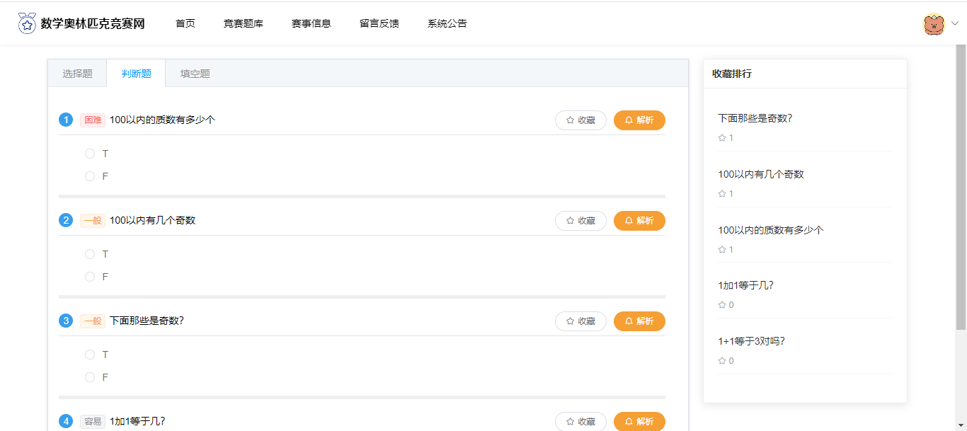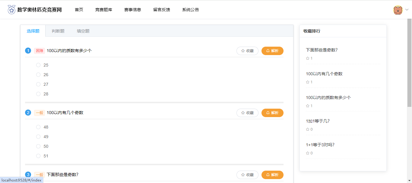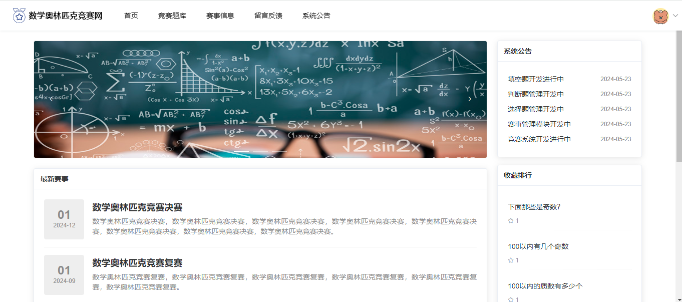 用户:首页、竞赛题库(选择题、判断题、填空题收藏或解析)、赛事管理(报名)、留言反馈、系统公告;用户还具有个人中心,可以管理我的收藏、我的报名、我的留言、个人资料、修改密码。