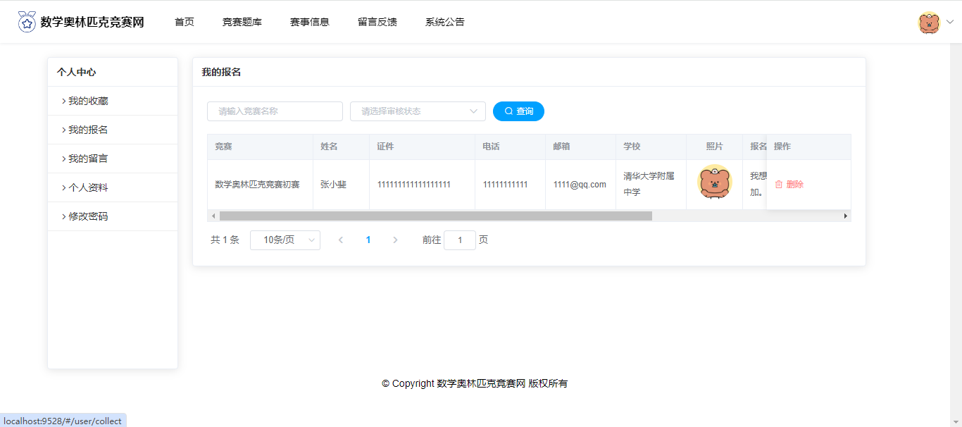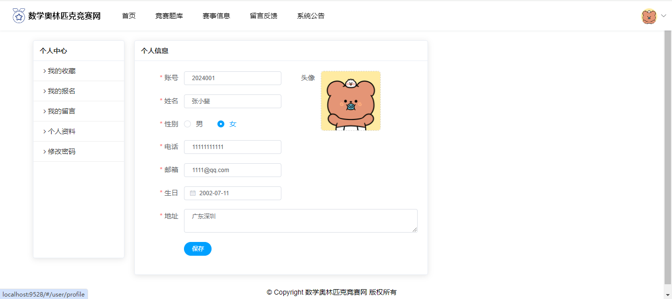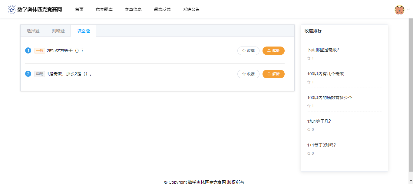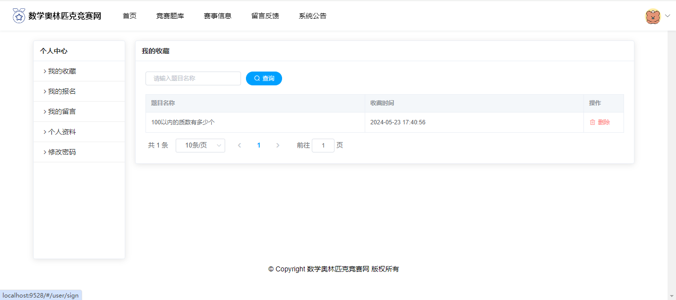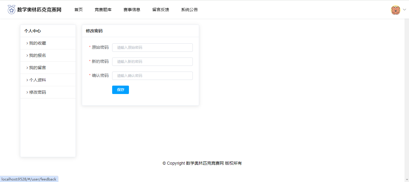 用户:首页、竞赛题库(选择题、判断题、填空题收藏或解析)、赛事管理(报名)、留言反馈、系统公告;用户还具有个人中心,可以管理我的收藏、我的报名、我的留言、个人资料、修改密码。
