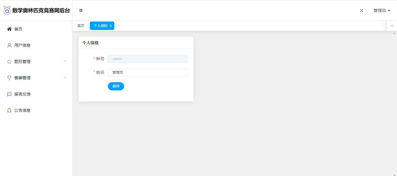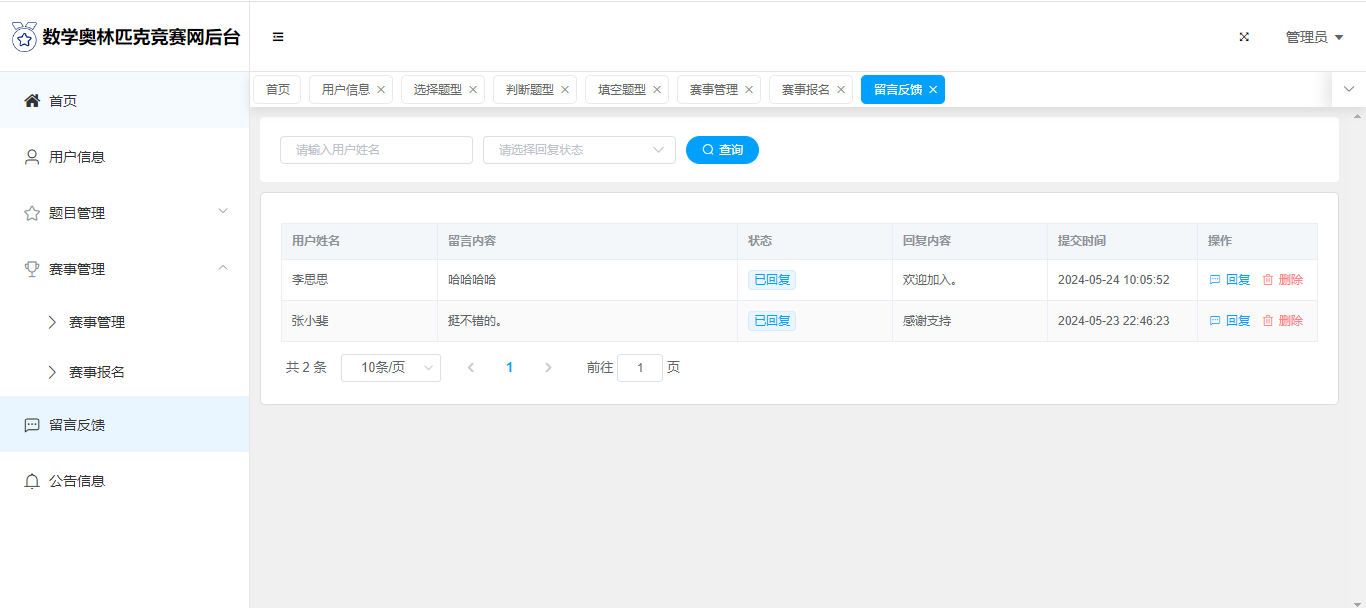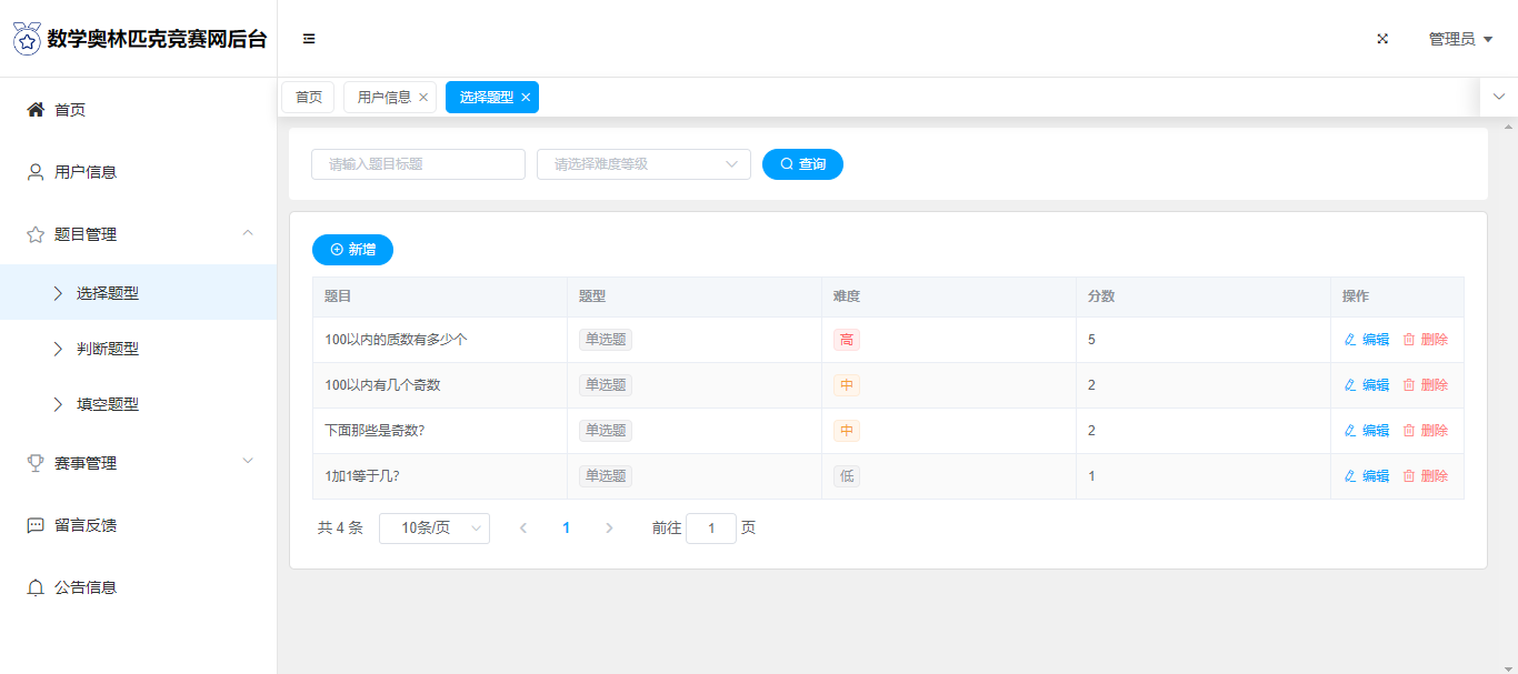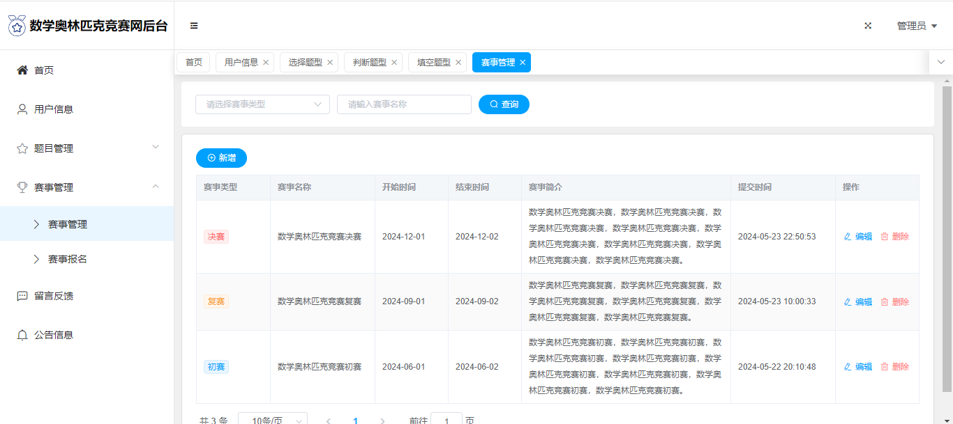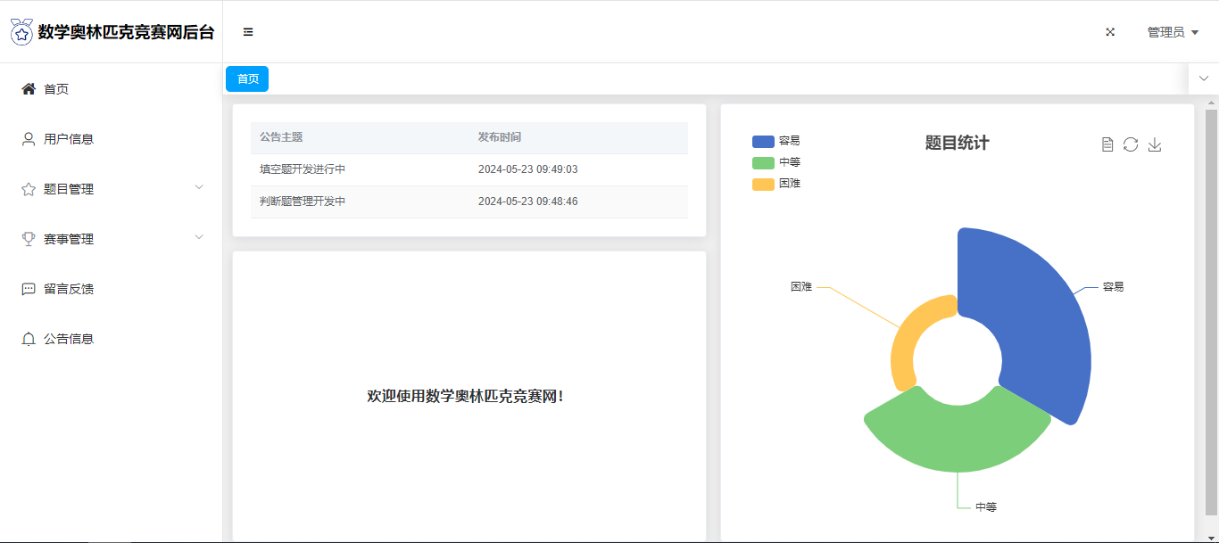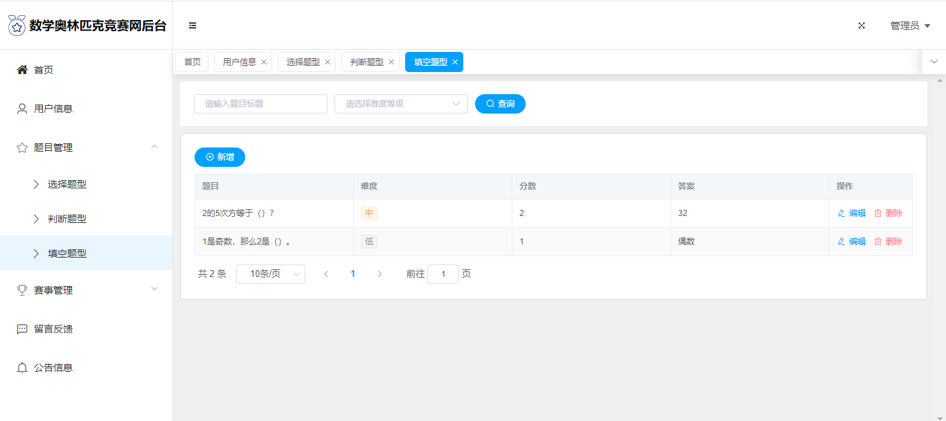 管理员:首页统计、用户管理;题目管理(选择题管理、判断题管理、填空题管理);赛事管理(赛事管理、赛事报名);留言反馈;公告信息;个人信息;密码修改;