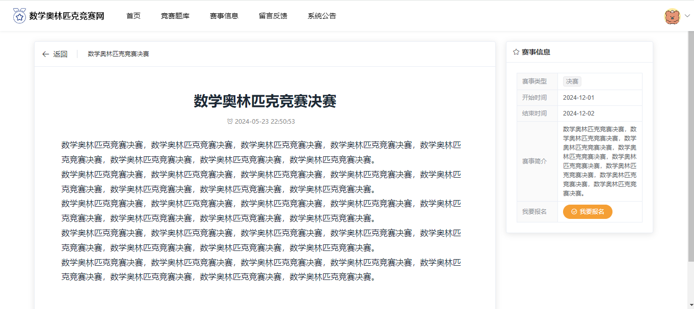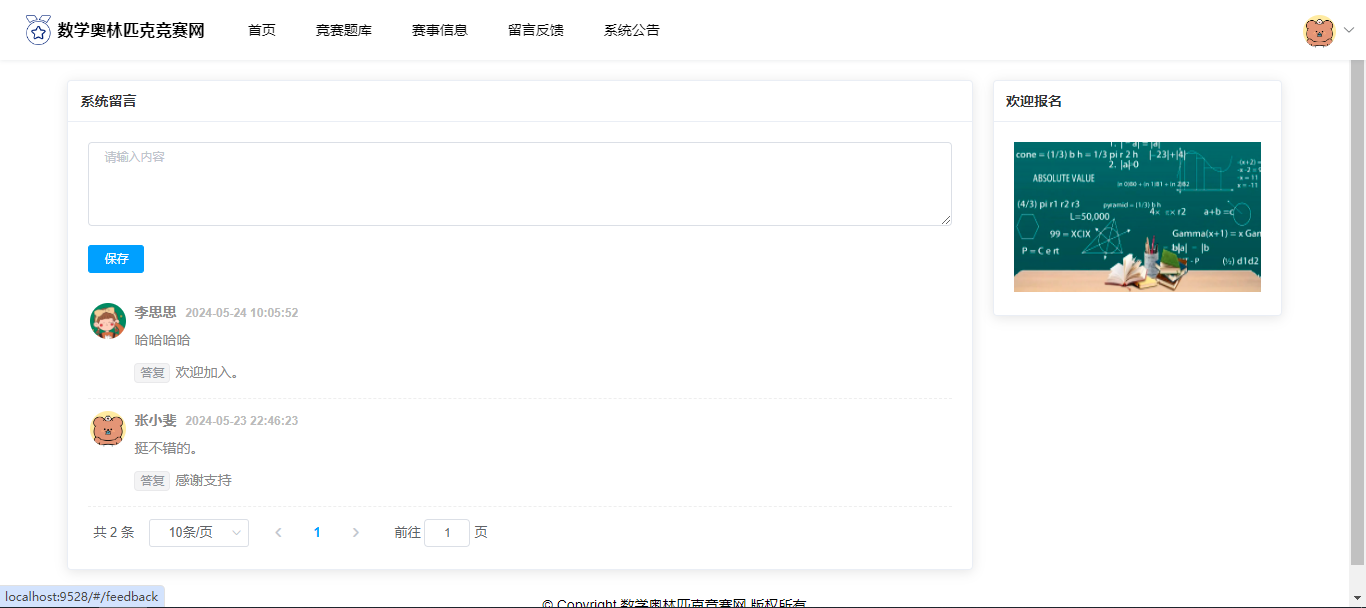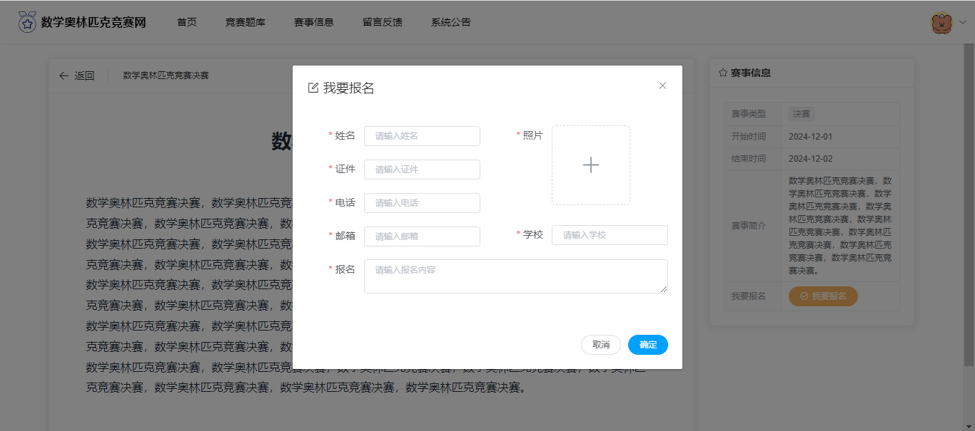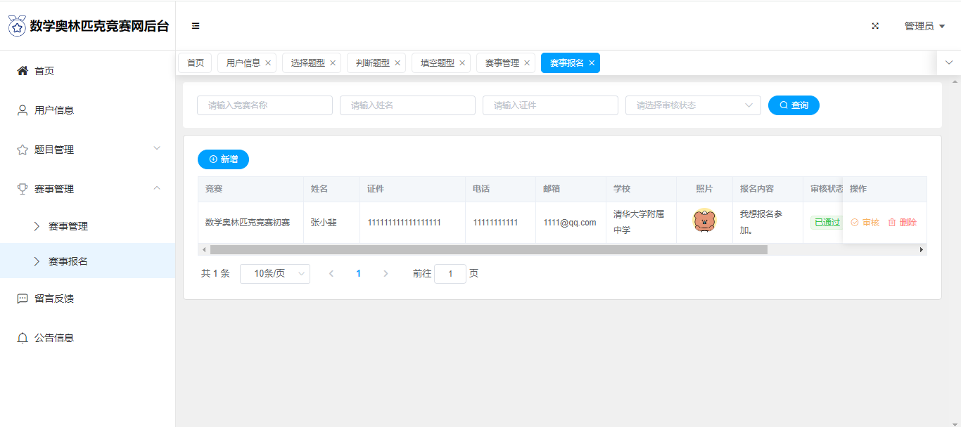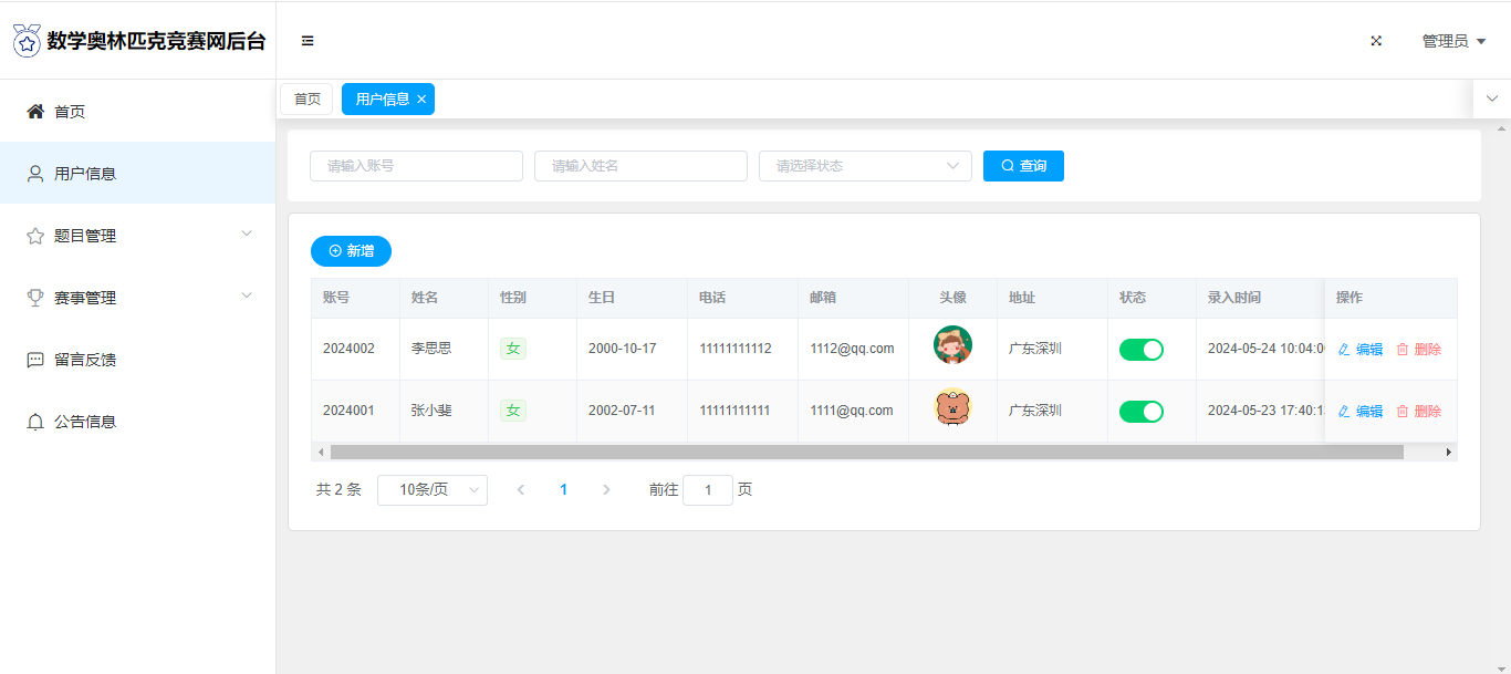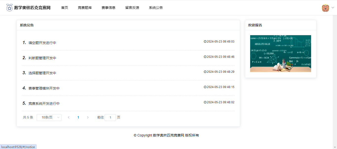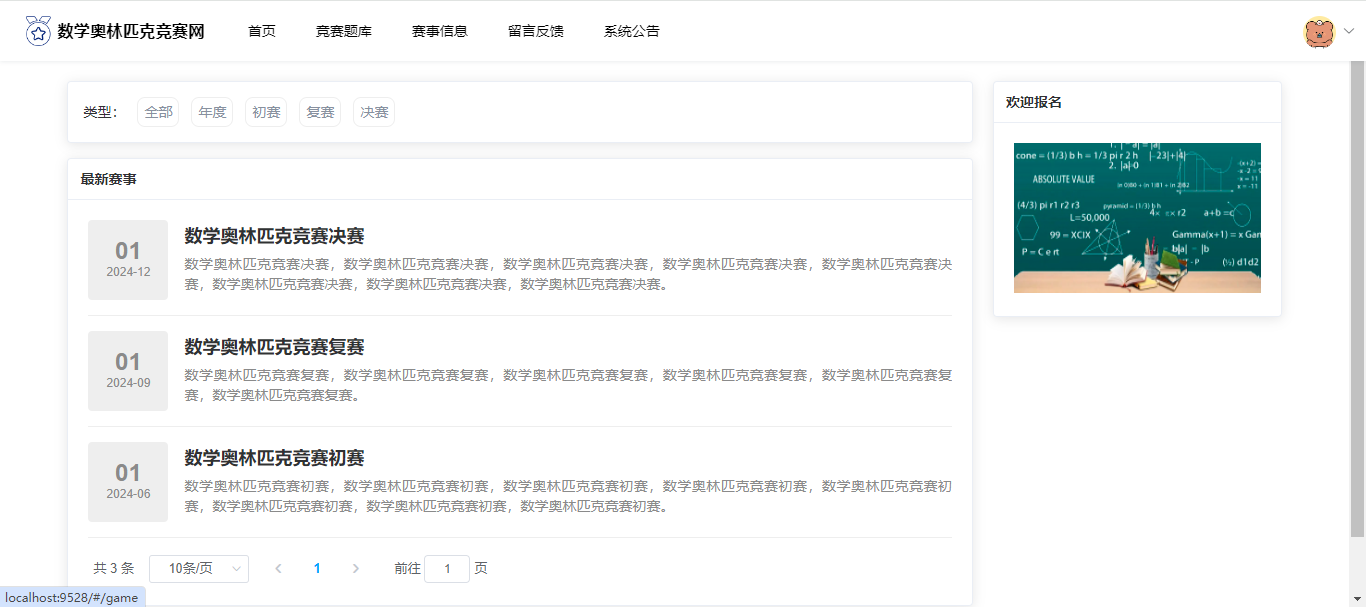 管理员:首页统计、用户管理;题目管理(选择题管理、判断题管理、填空题管理);赛事管理(赛事管理、赛事报名);留言反馈;公告信息;个人信息;密码修改;