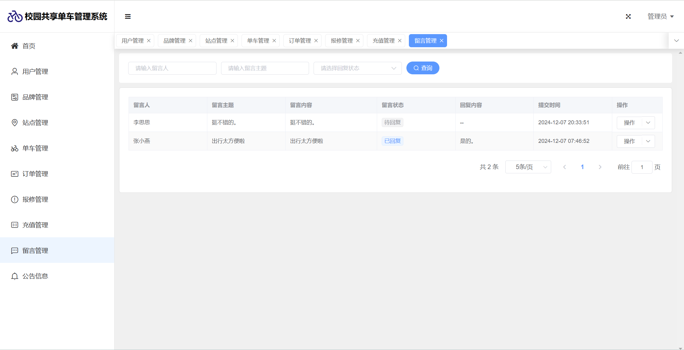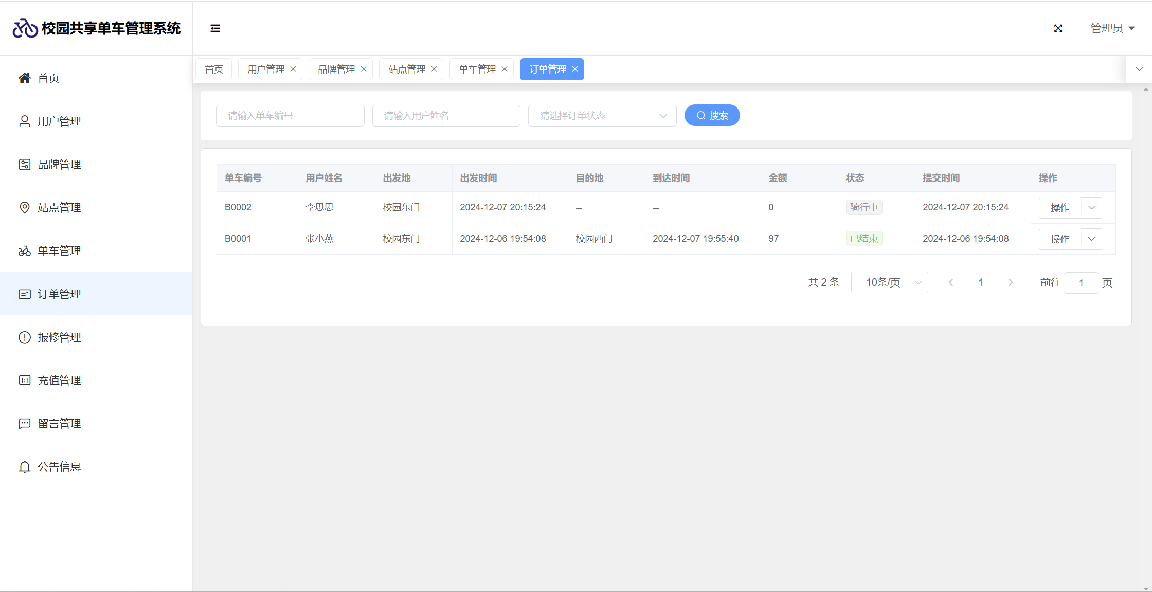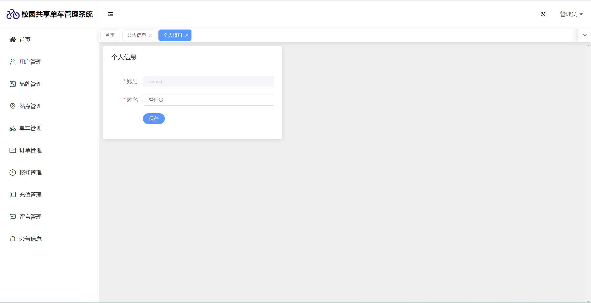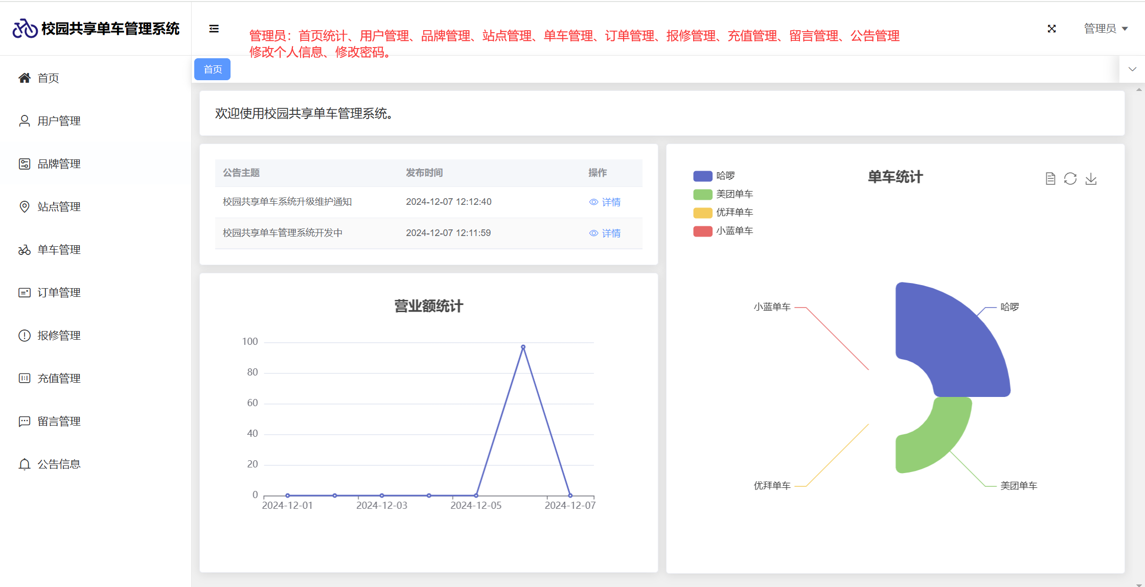 管理员:首页统计、用户管理、品牌管理、站点管理、单车管理、订单管理、报修管理、充值管理、留言管理、公告管理、个人信息、密码修改。