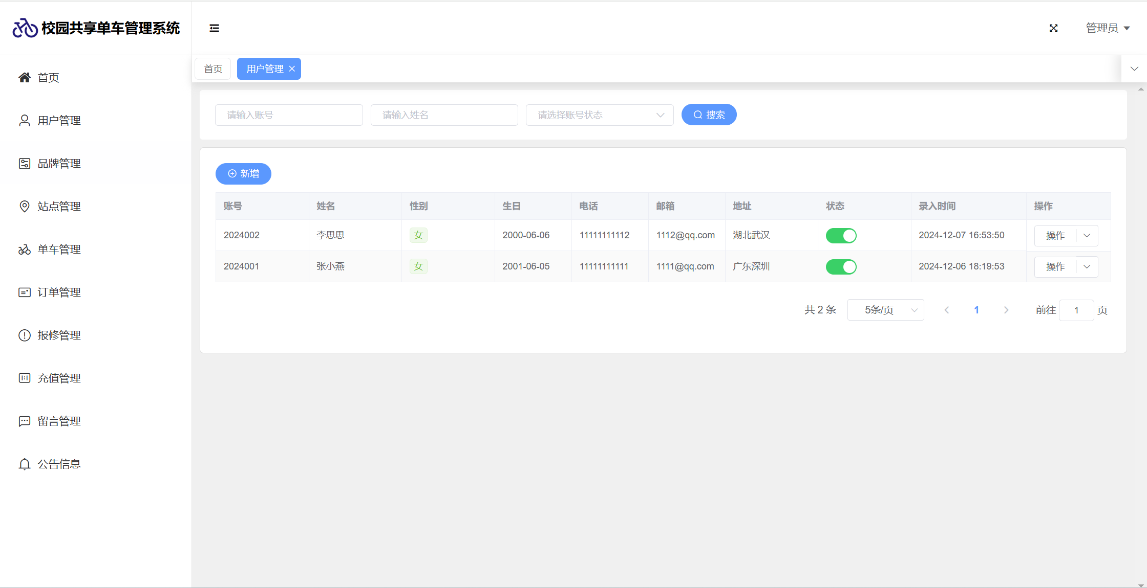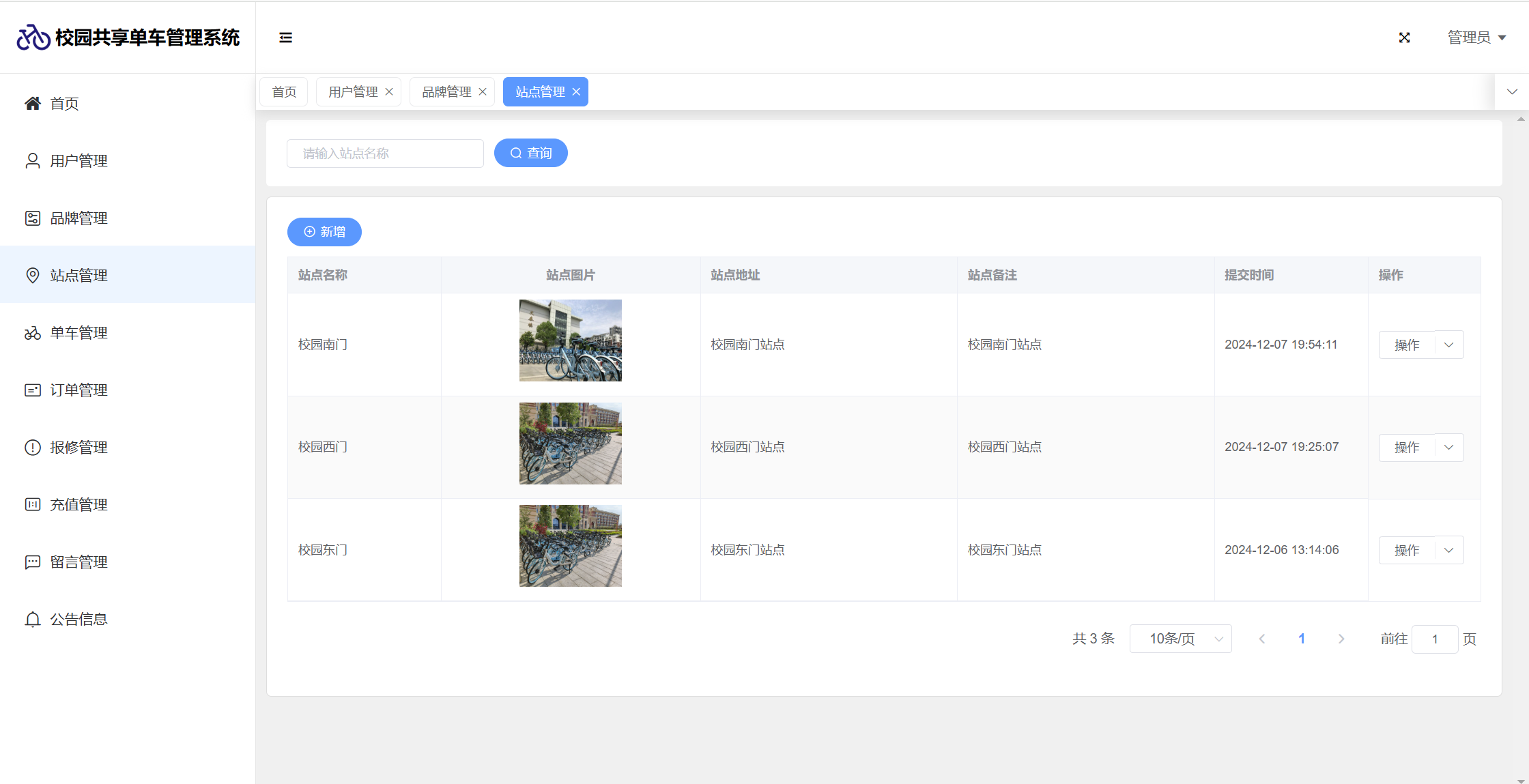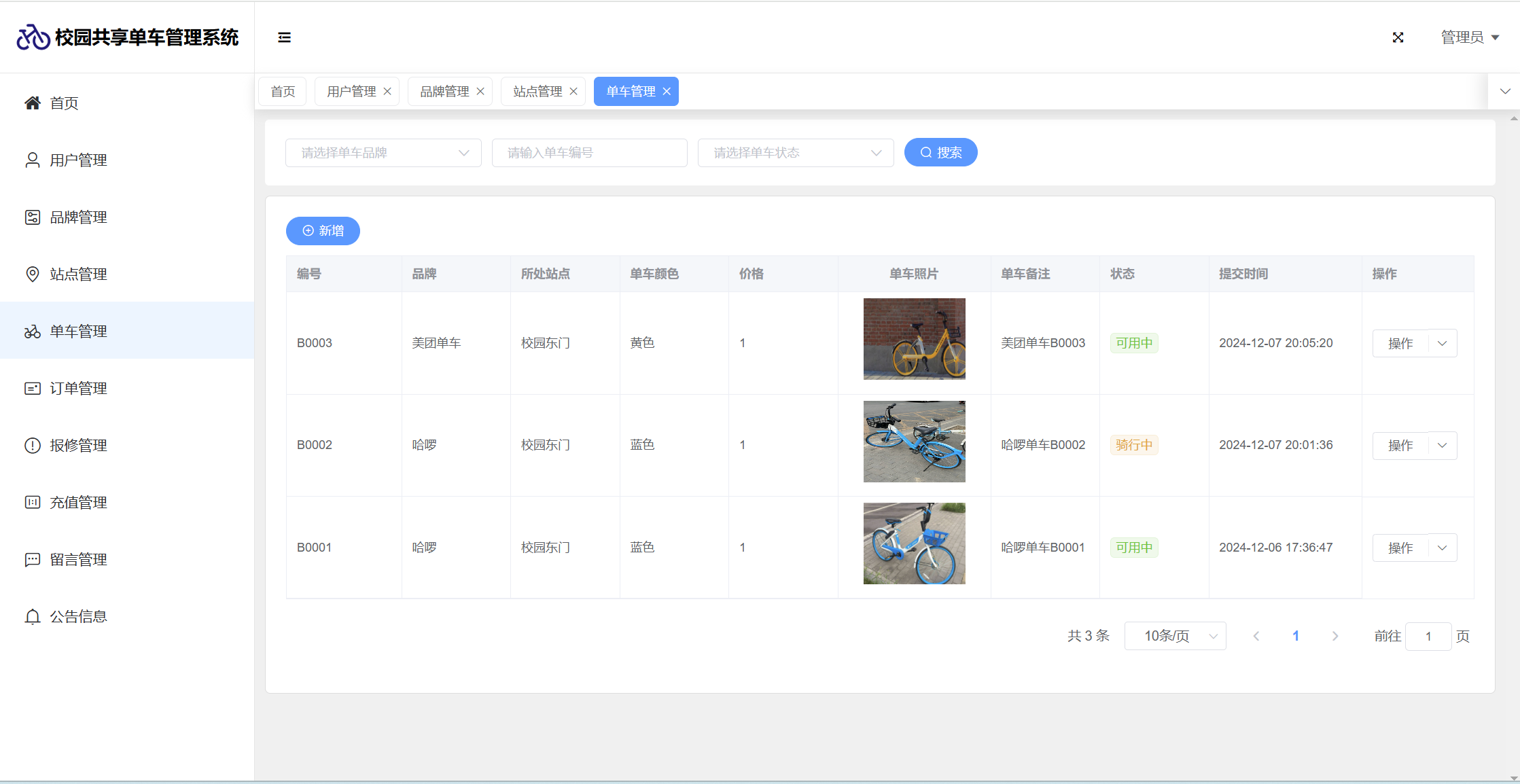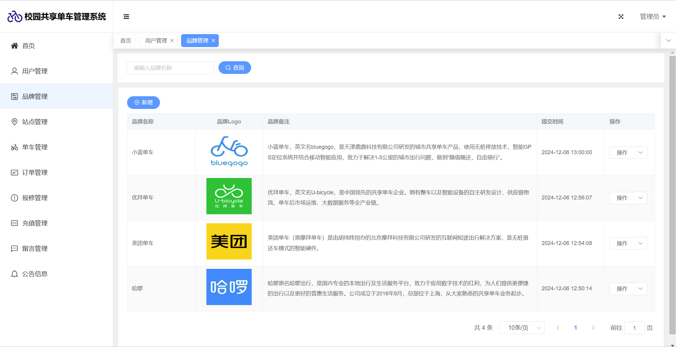 管理员:首页统计、用户管理、品牌管理、站点管理、单车管理、订单管理、报修管理、充值管理、留言管理、公告管理、个人信息、密码修改。