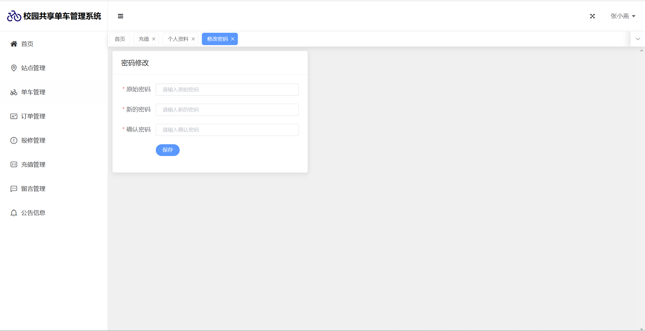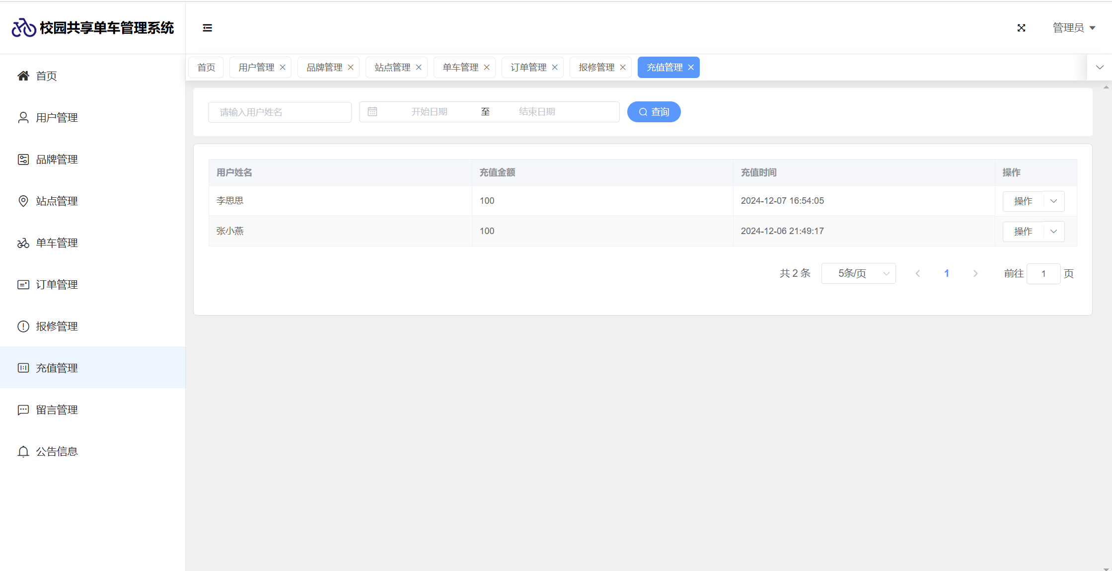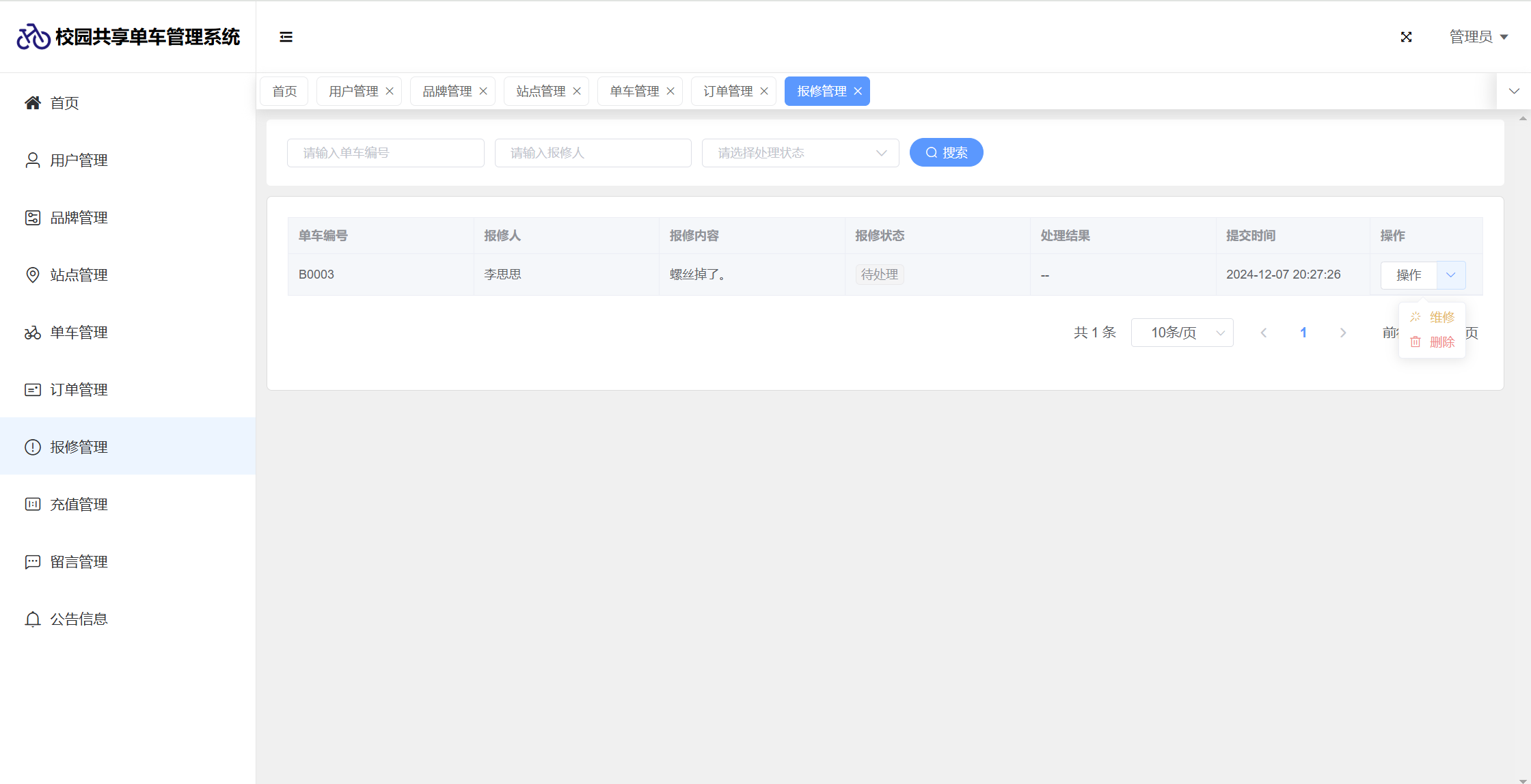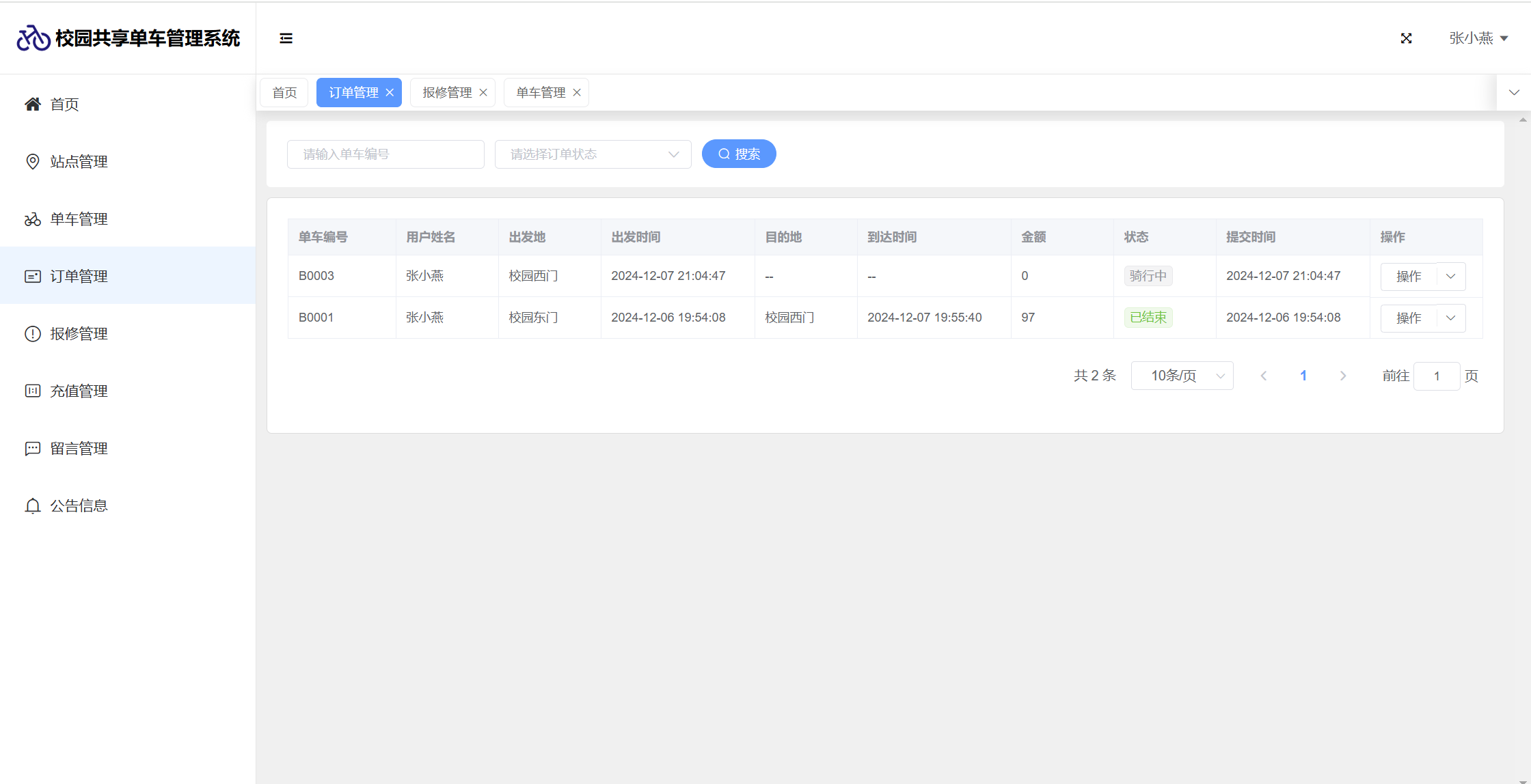 管理员:首页统计、用户管理、品牌管理、站点管理、单车管理、订单管理、报修管理、充值管理、留言管理、公告管理、个人信息、密码修改。