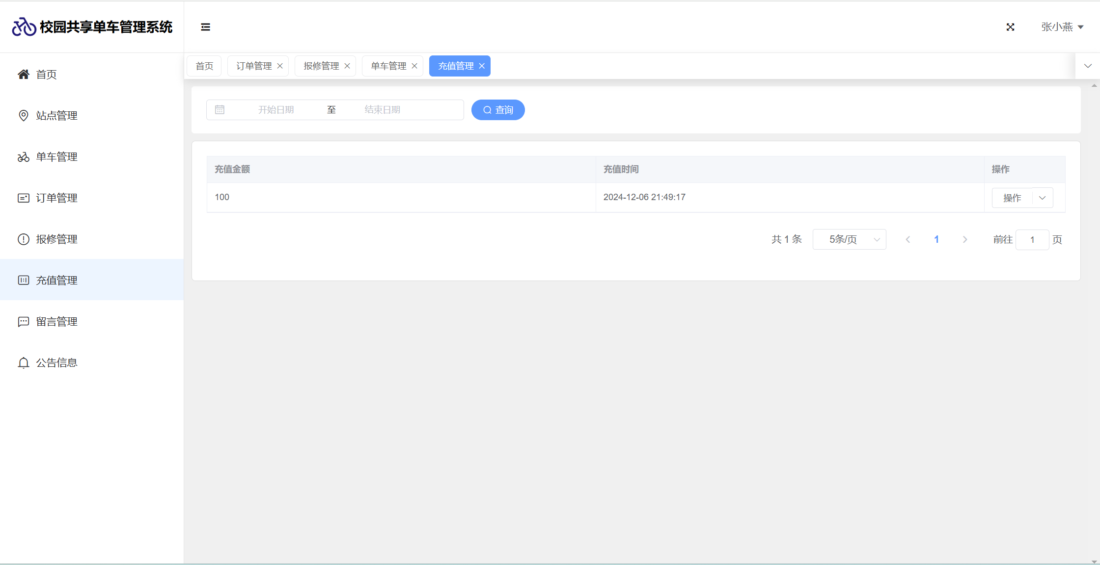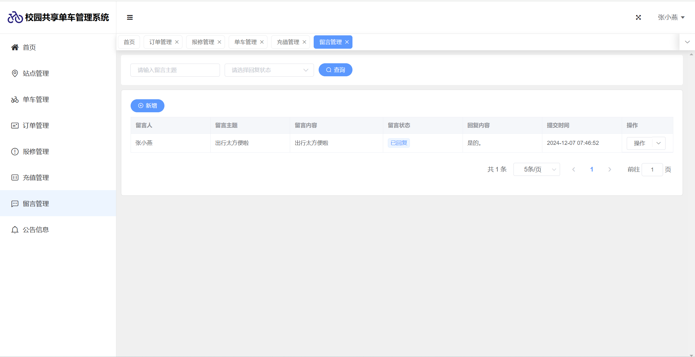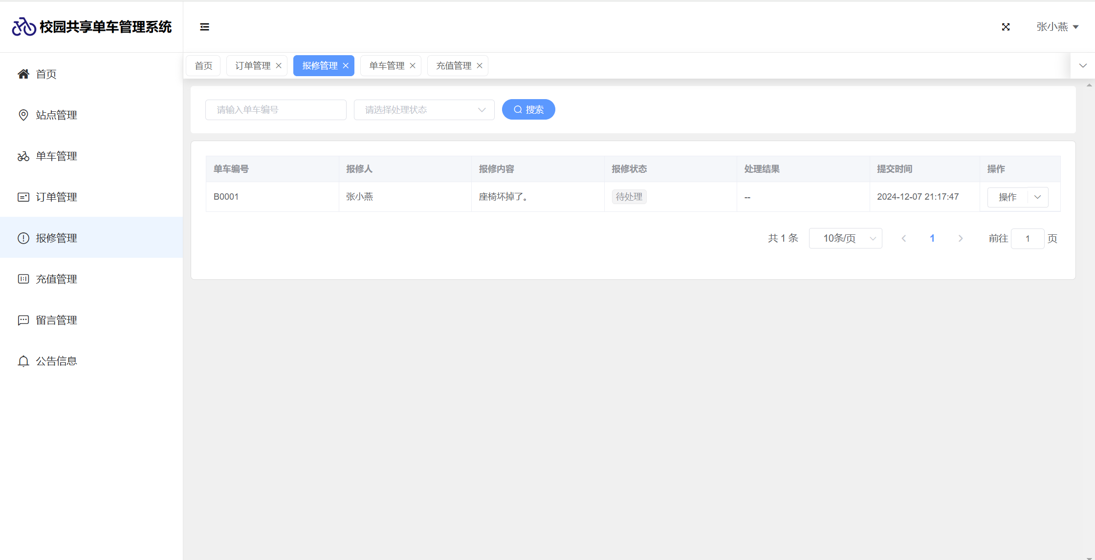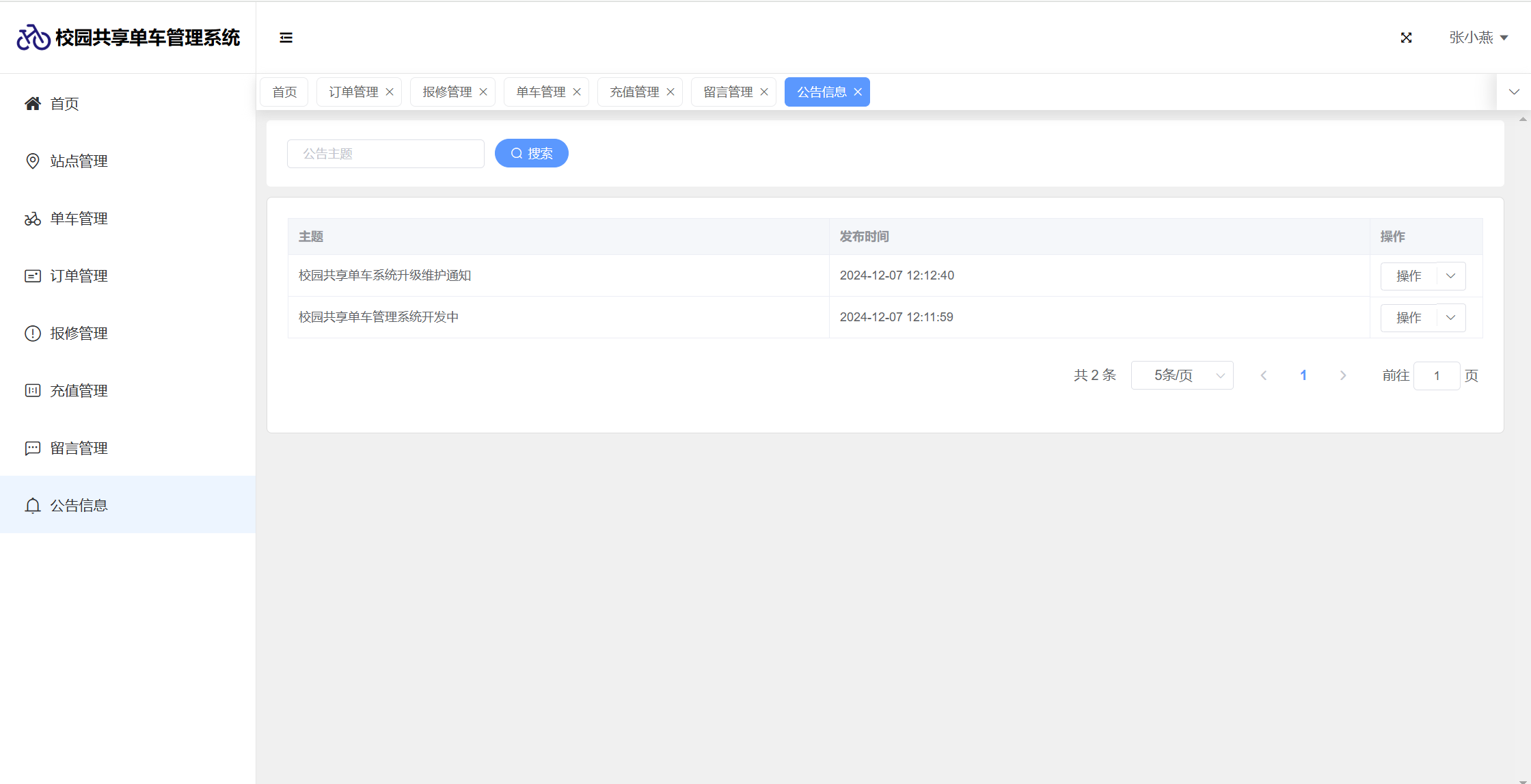 管理员:首页统计、用户管理、品牌管理、站点管理、单车管理、订单管理、报修管理、充值管理、留言管理、公告管理、个人信息、密码修改。