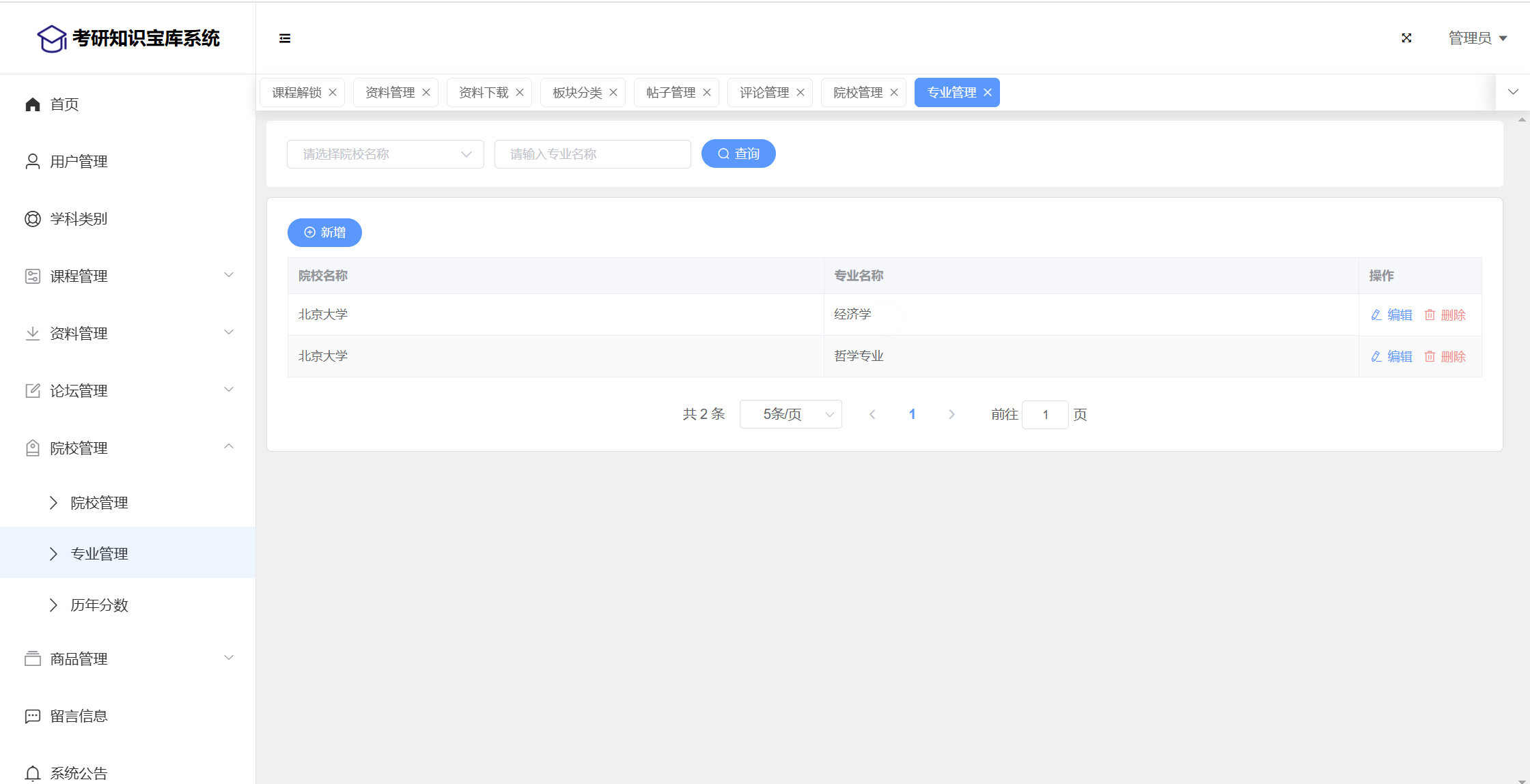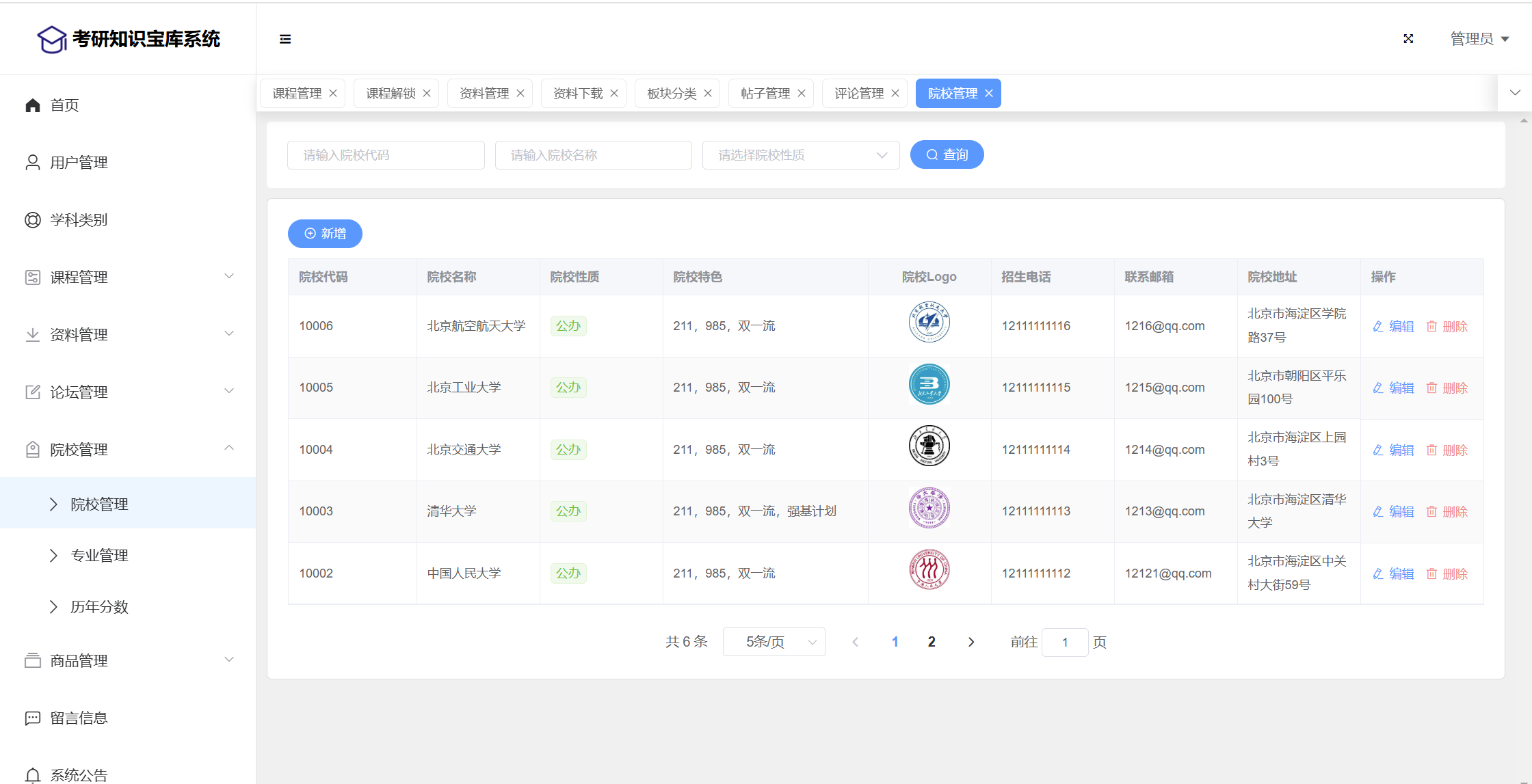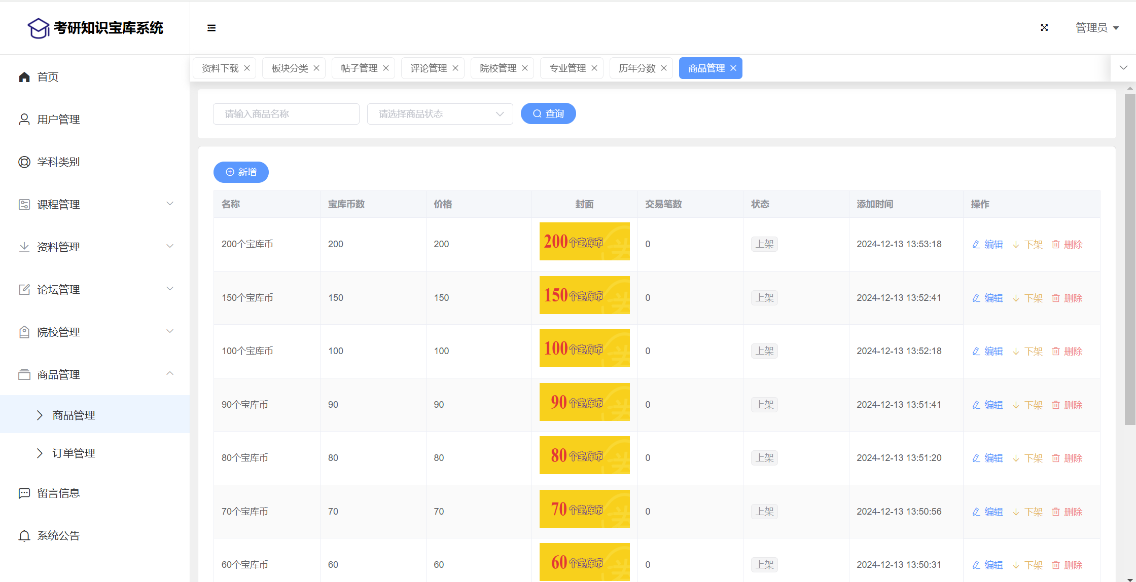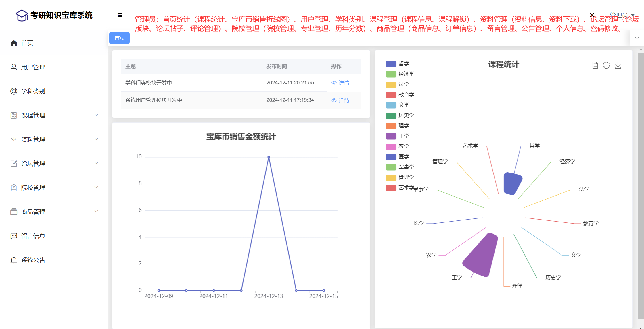 管理员:首页统计(课程统计、宝库币销售折线图)、用户管理、学科类别、课程管理(课程信息、课程解锁)、资料管理(资料信息、资料下载)、论坛管理(论坛版块、论坛帖子、评论管理)、院校管理(院校管理、专业管理、历年分数)、商品管理(商品信息、订单信息)、留言管理、公告管理、个人信息、密码修改。