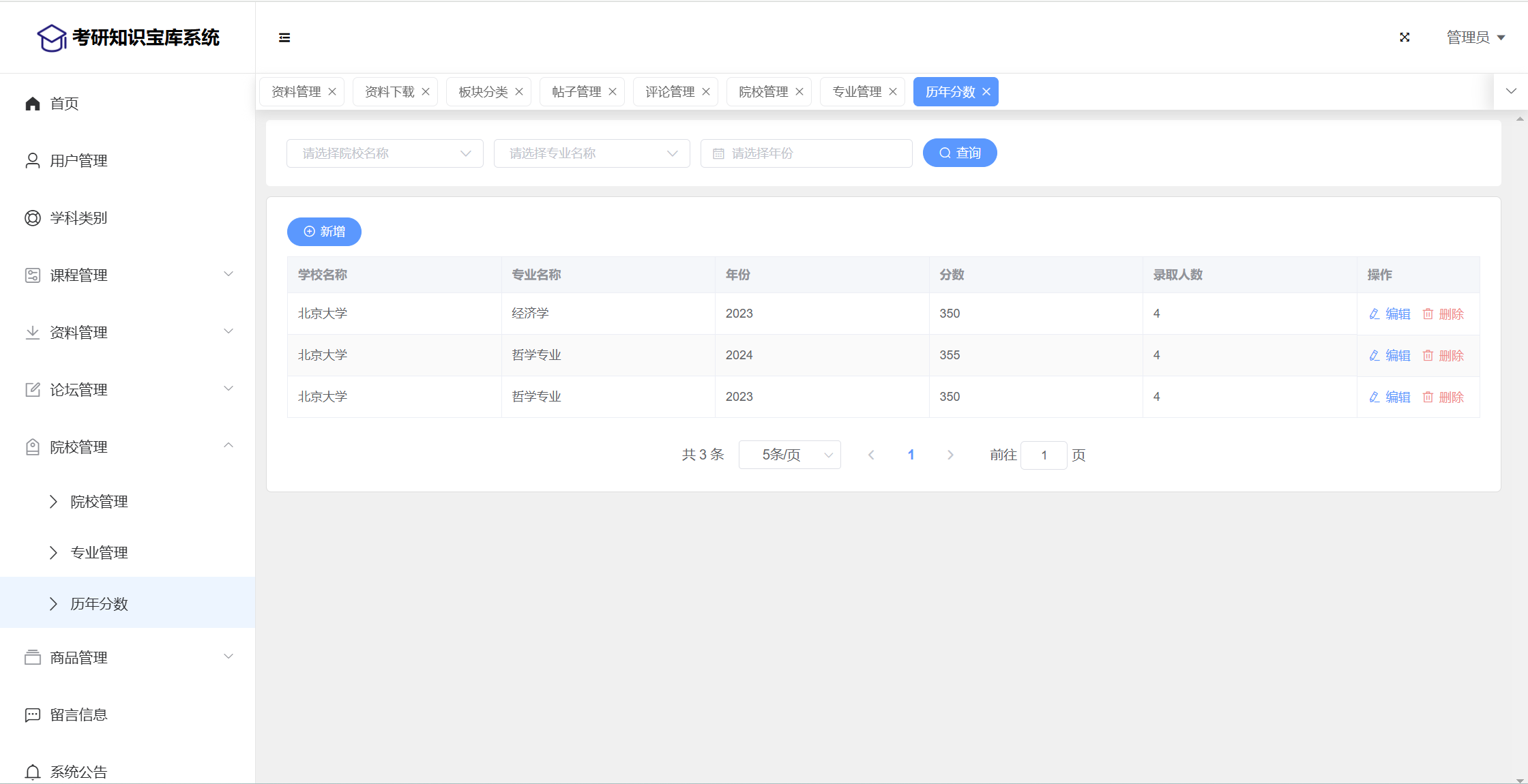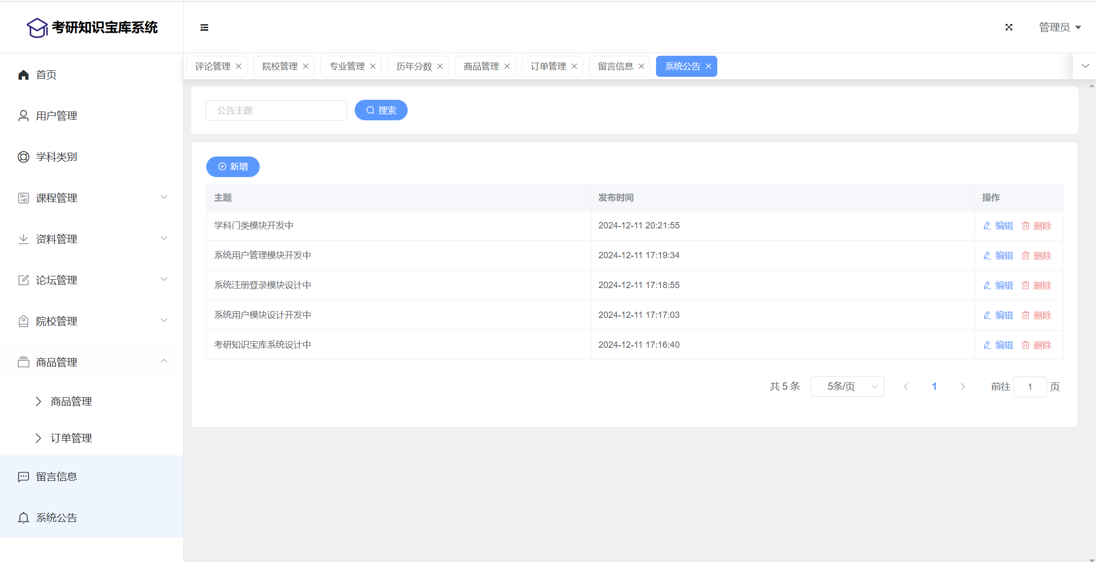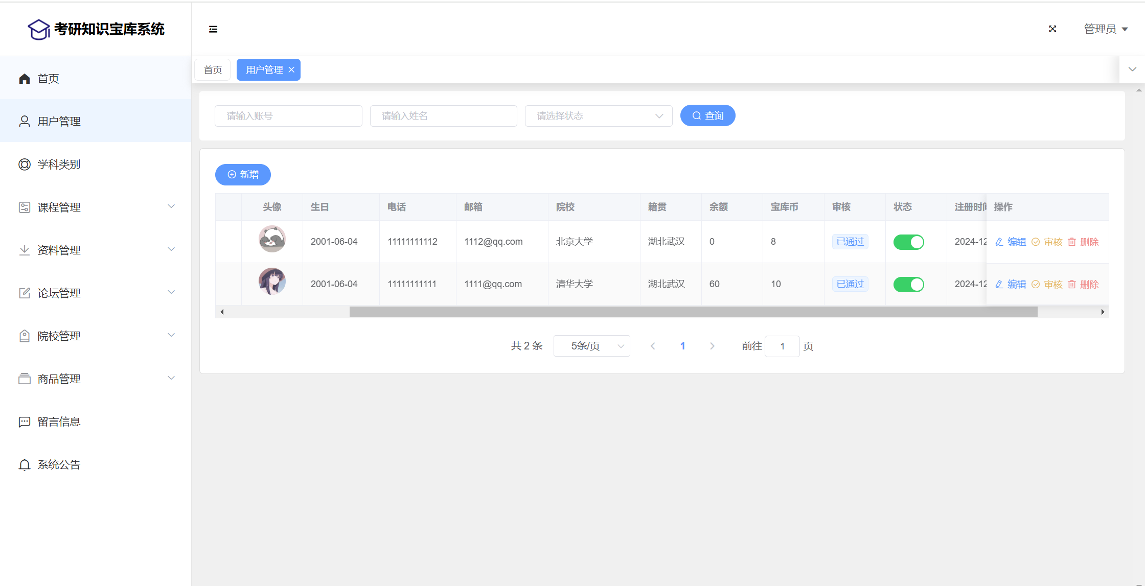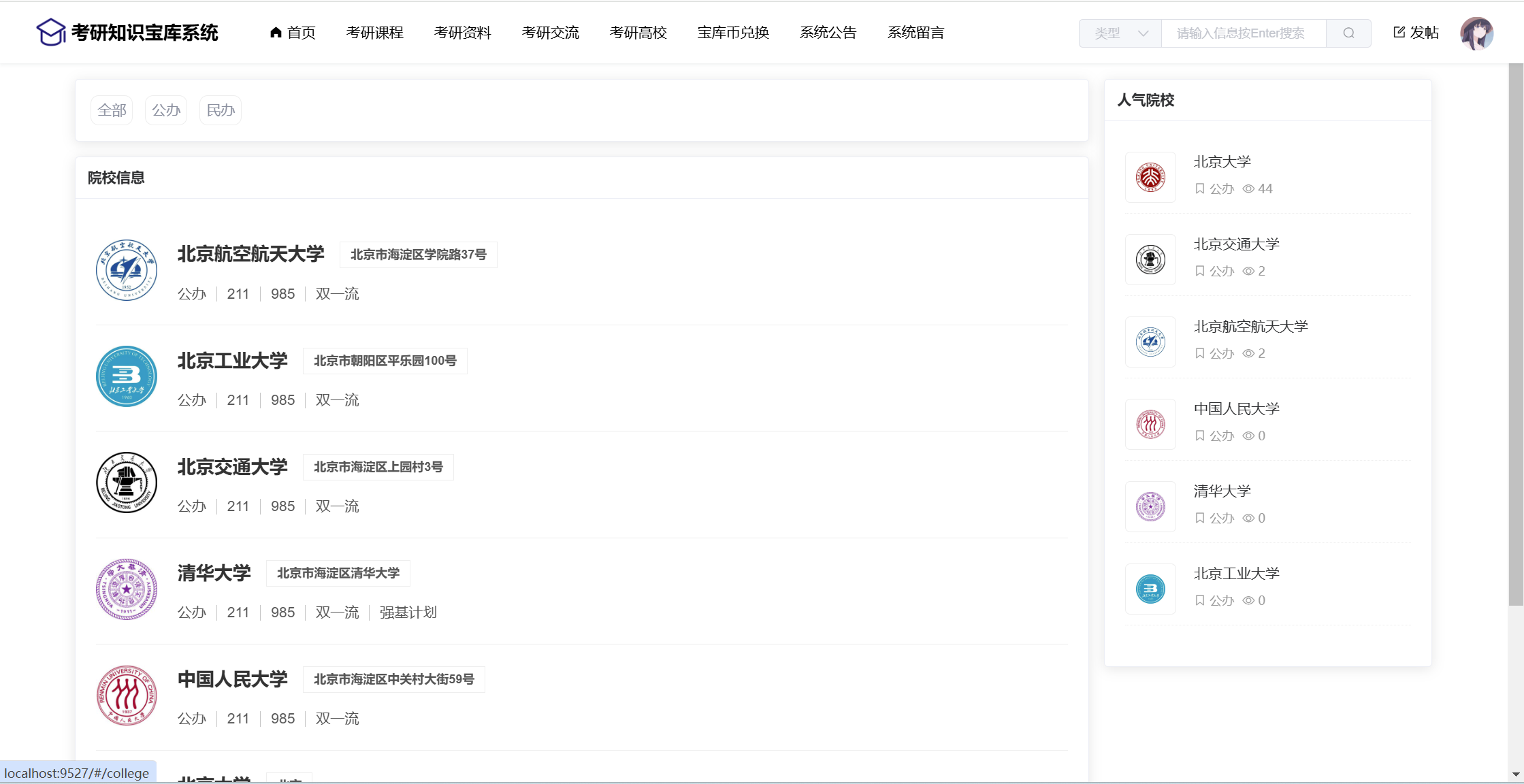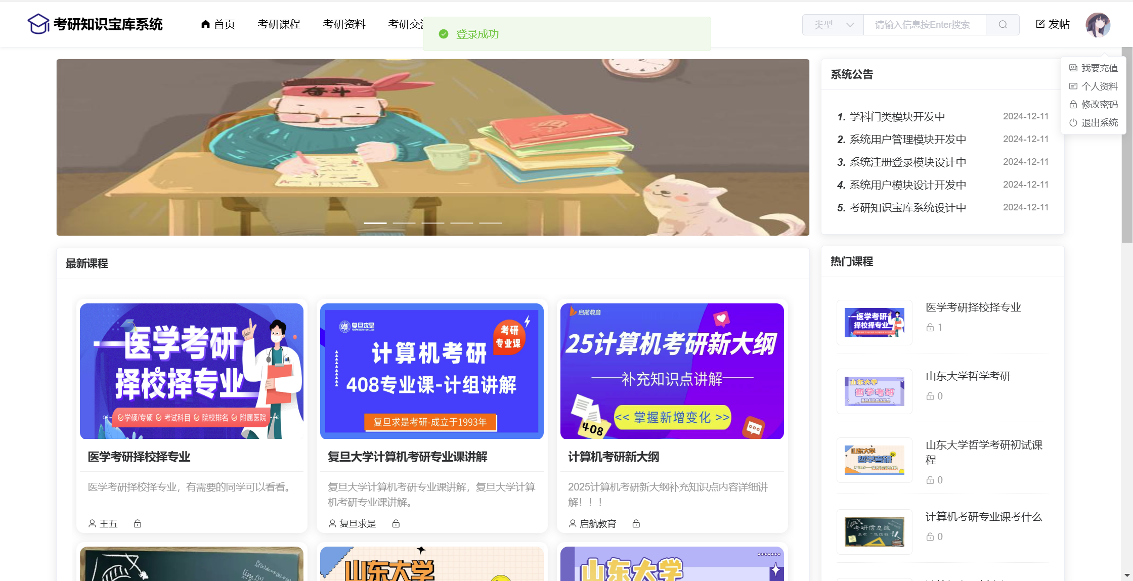 管理员:首页统计(课程统计、宝库币销售折线图)、用户管理、学科类别、课程管理(课程信息、课程解锁)、资料管理(资料信息、资料下载)、论坛管理(论坛版块、论坛帖子、评论管理)、院校管理(院校管理、专业管理、历年分数)、商品管理(商品信息、订单信息)、留言管理、公告管理、个人信息、密码修改。