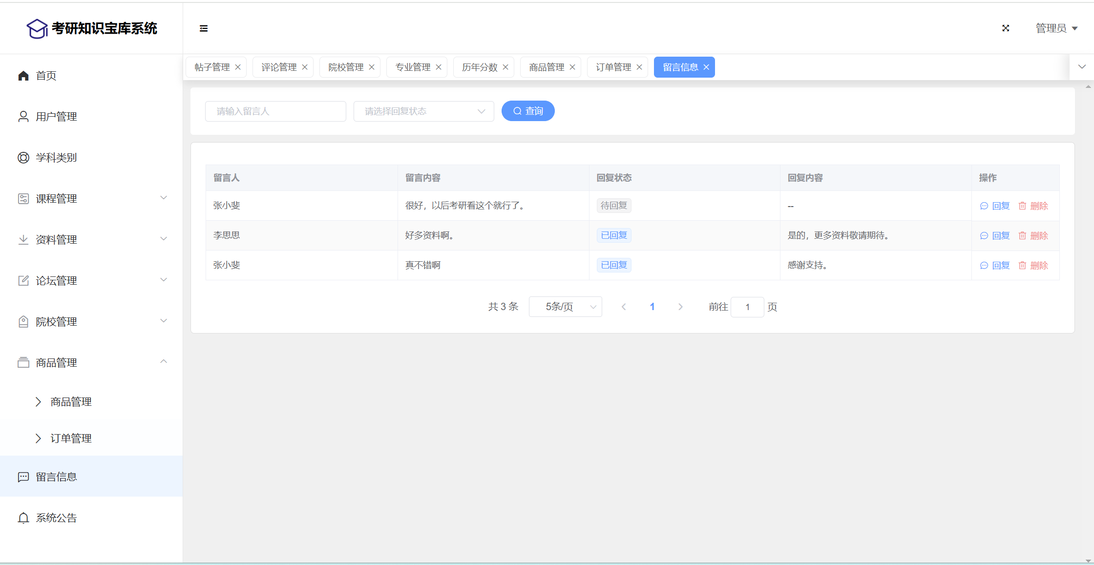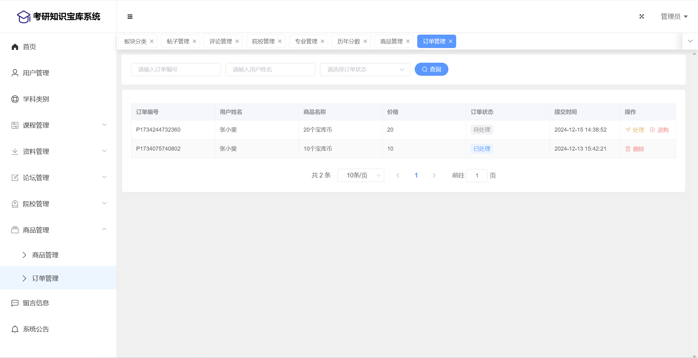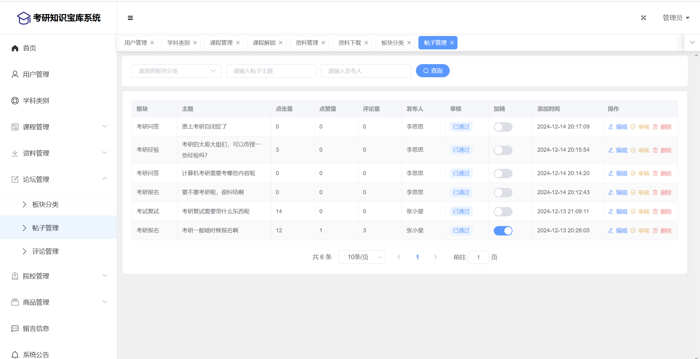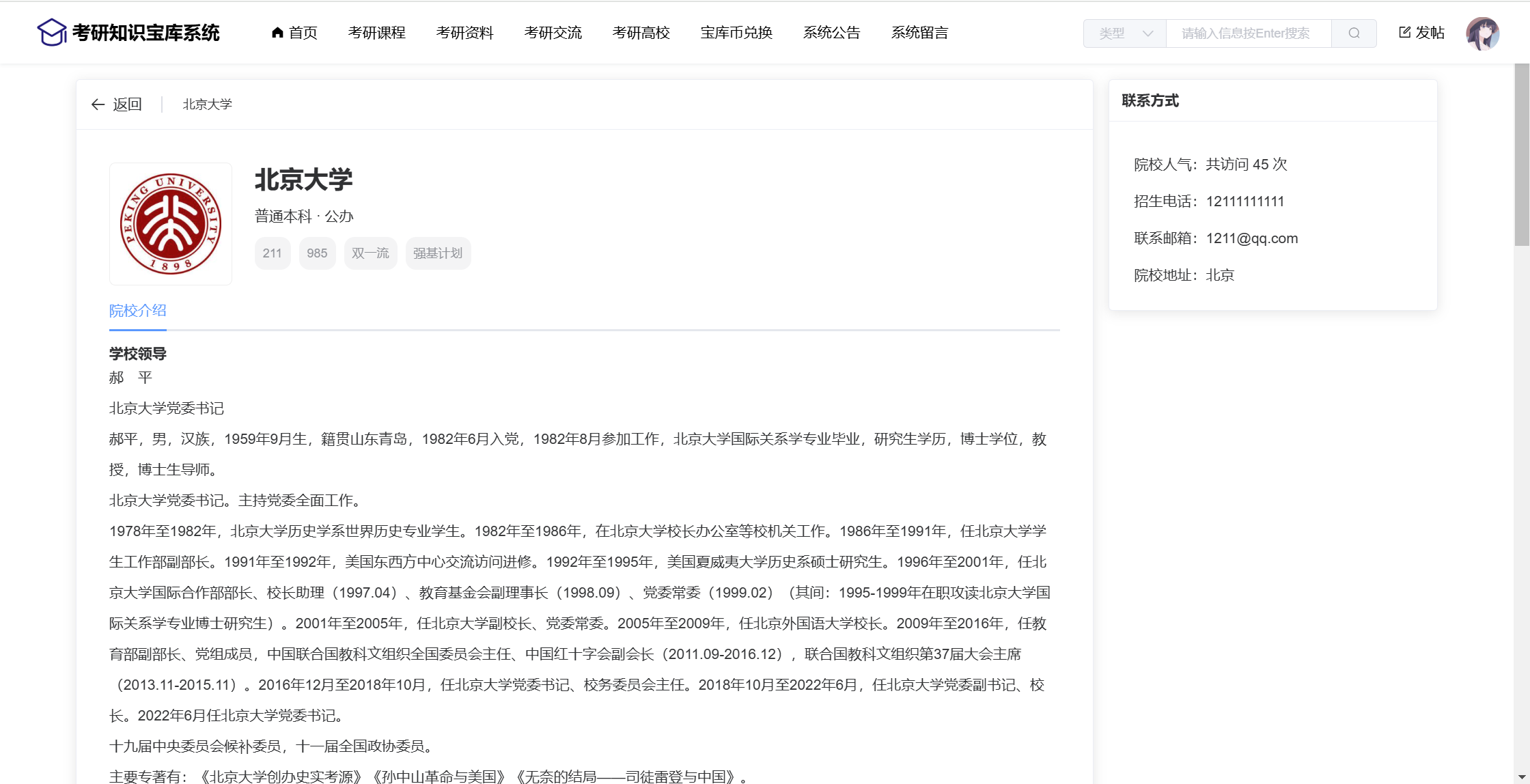 管理员:首页统计(课程统计、宝库币销售折线图)、用户管理、学科类别、课程管理(课程信息、课程解锁)、资料管理(资料信息、资料下载)、论坛管理(论坛版块、论坛帖子、评论管理)、院校管理(院校管理、专业管理、历年分数)、商品管理(商品信息、订单信息)、留言管理、公告管理、个人信息、密码修改。