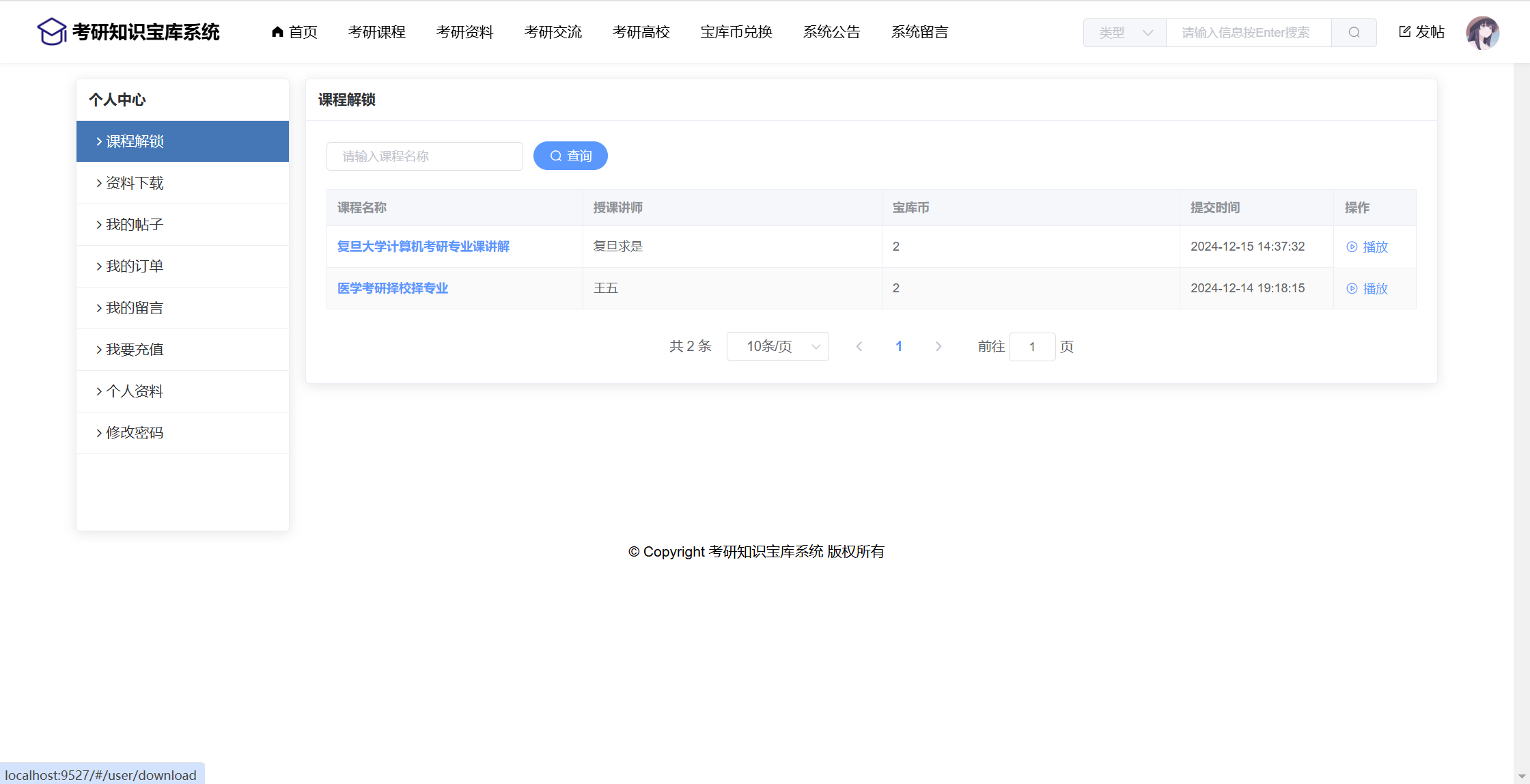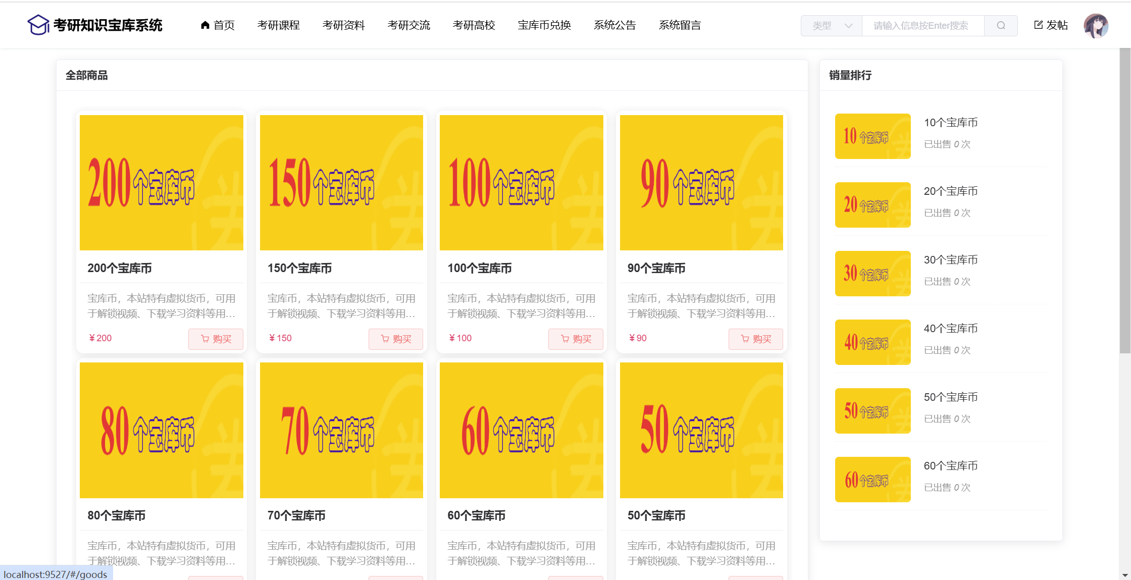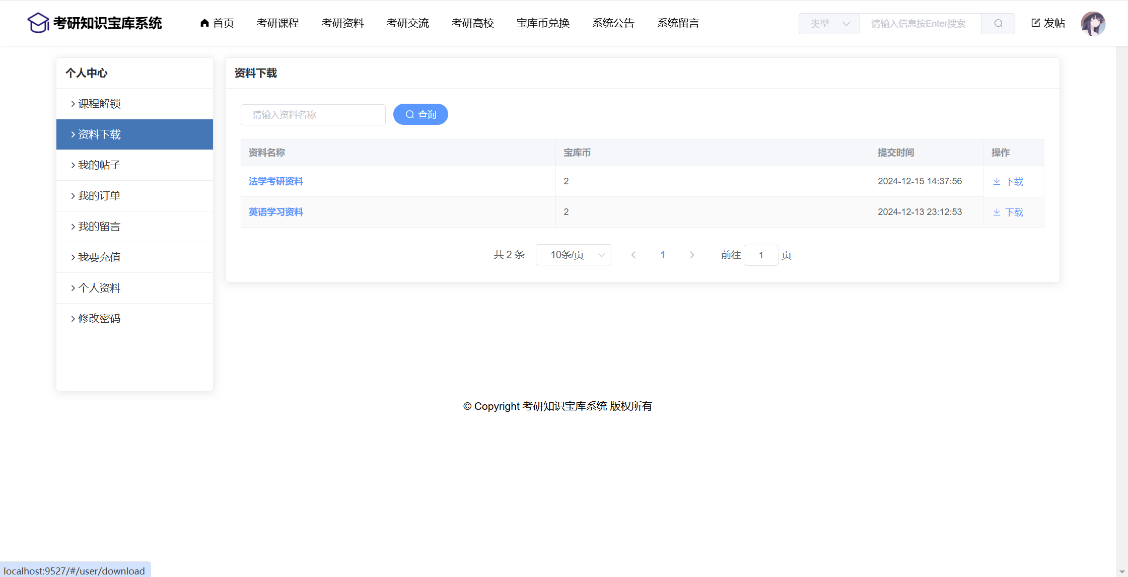 用户:注册、登录、首页、考研课程(课程详情、课程解锁)、考研资料(资料下载)、考研交流(帖子板块、帖子信息、帖子评论)、考研高校(专业、分数)、宝库币兑换、系统公告、系统留言、用户还有个人中心功能:课程解锁、资料下载、我的帖子、我的订单、我的留言、我要充值、修改个人资料、修改密码