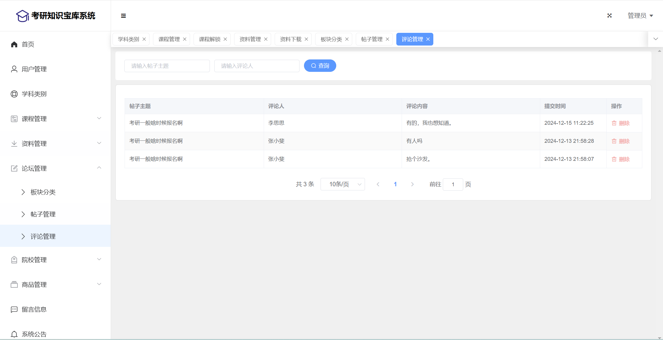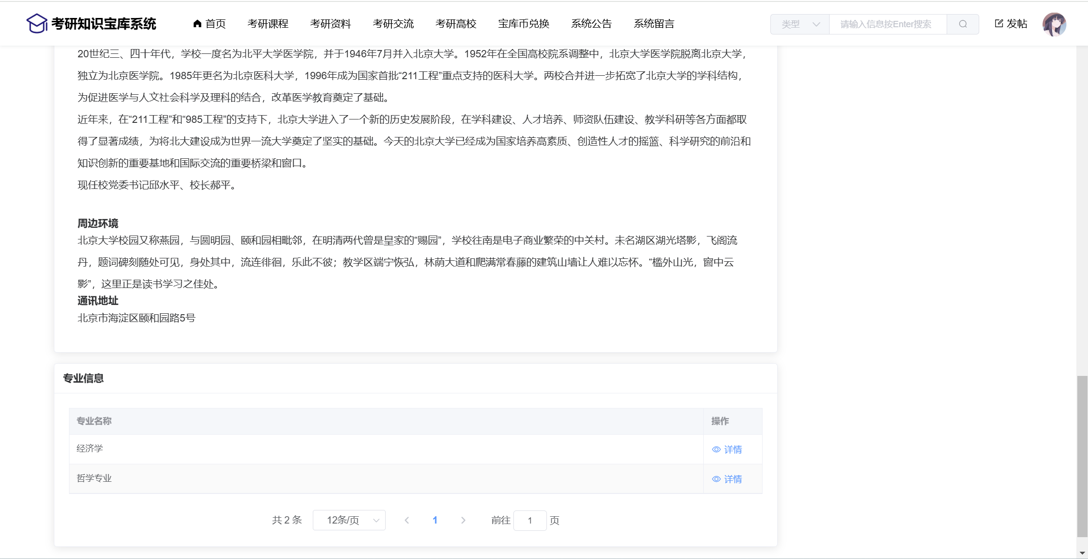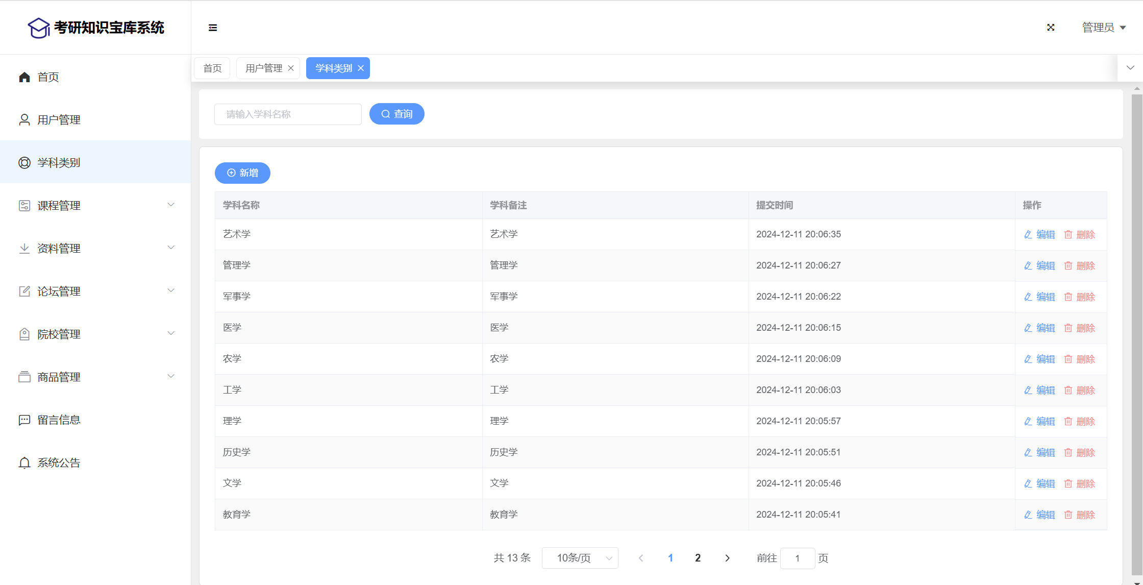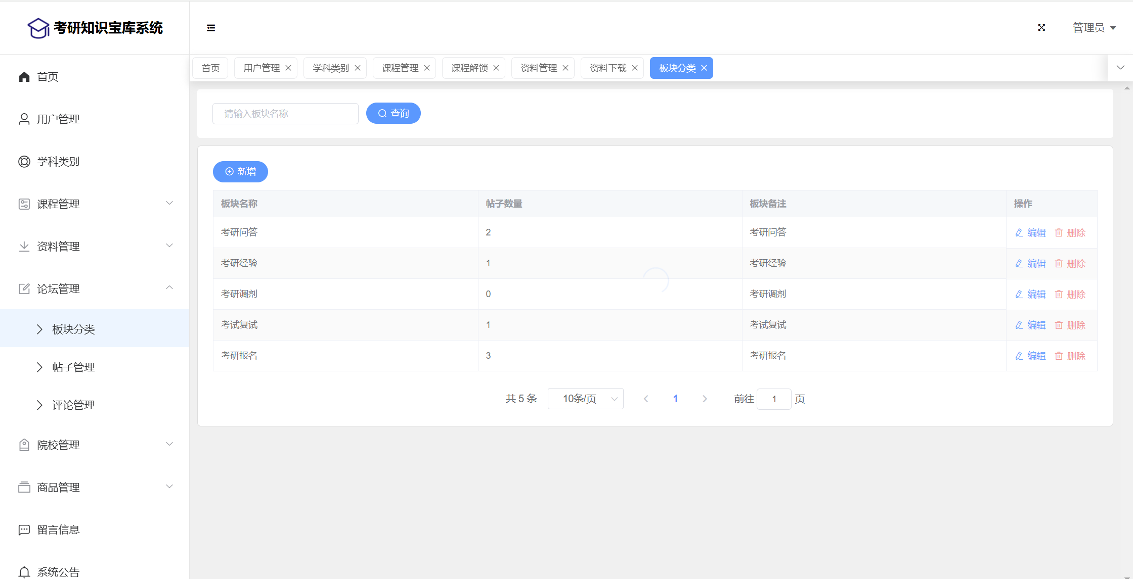 基于SpringBoot+Vue前后端分离的考研知识宝库系统,系统包含管理员、用户角色,功能如下: