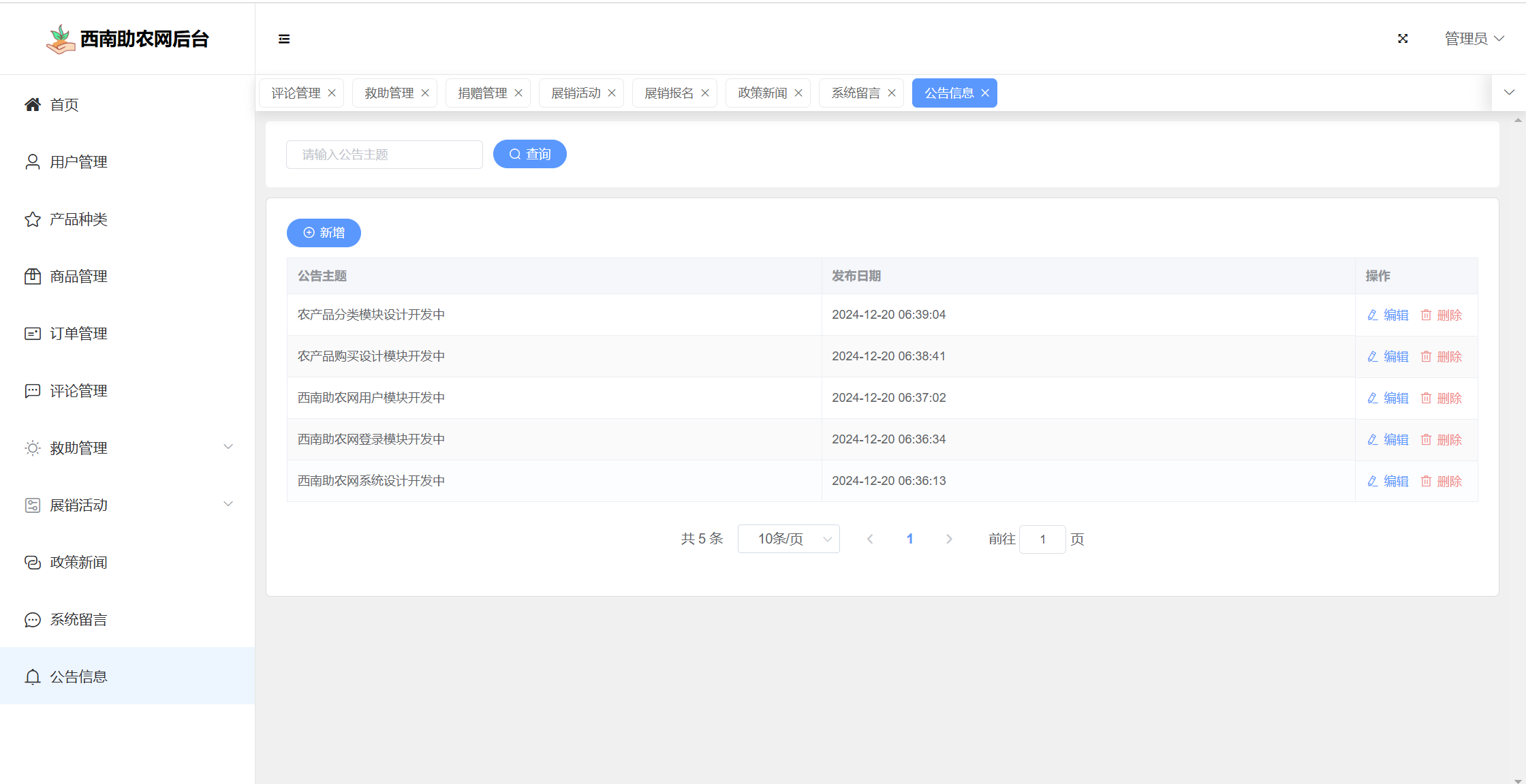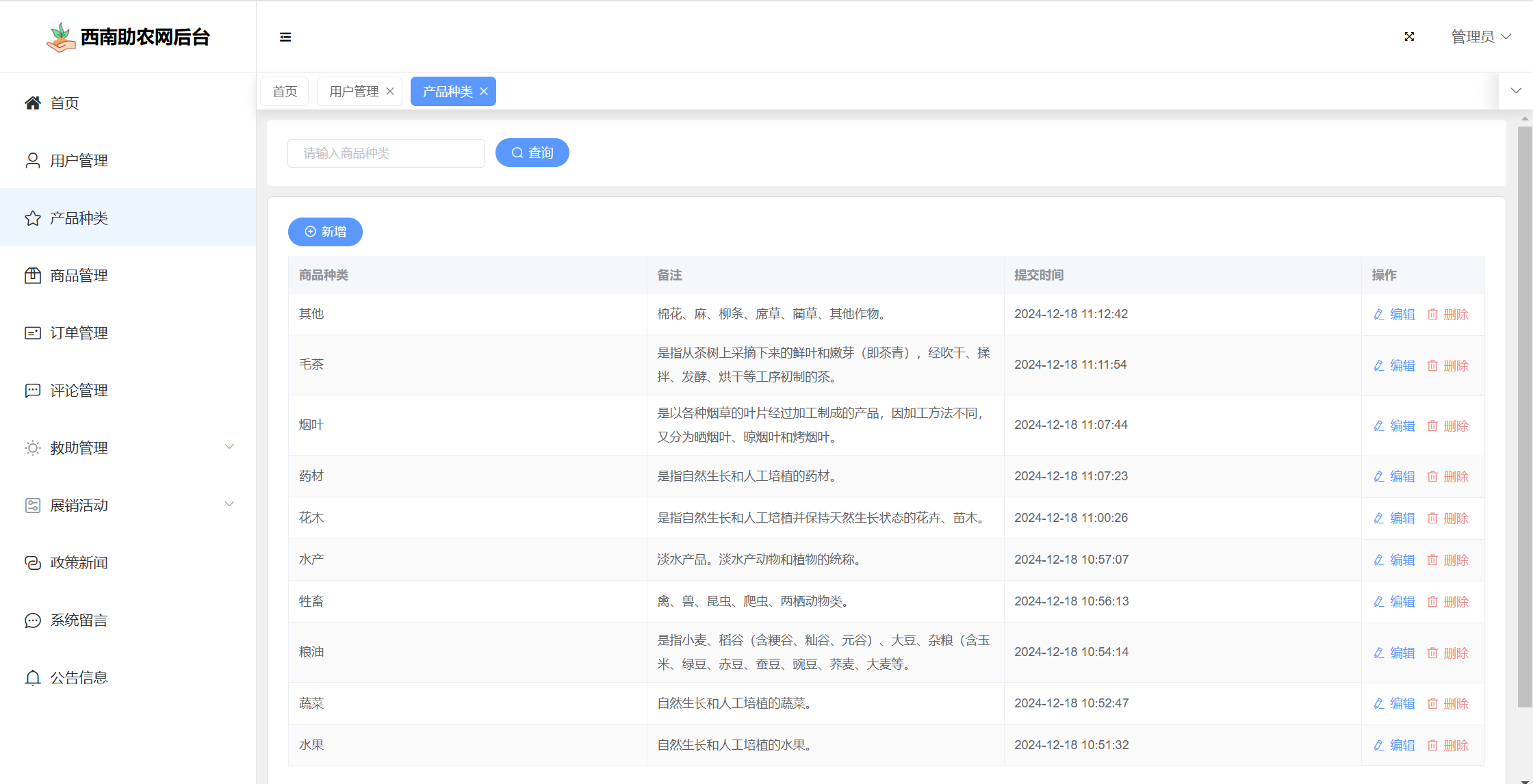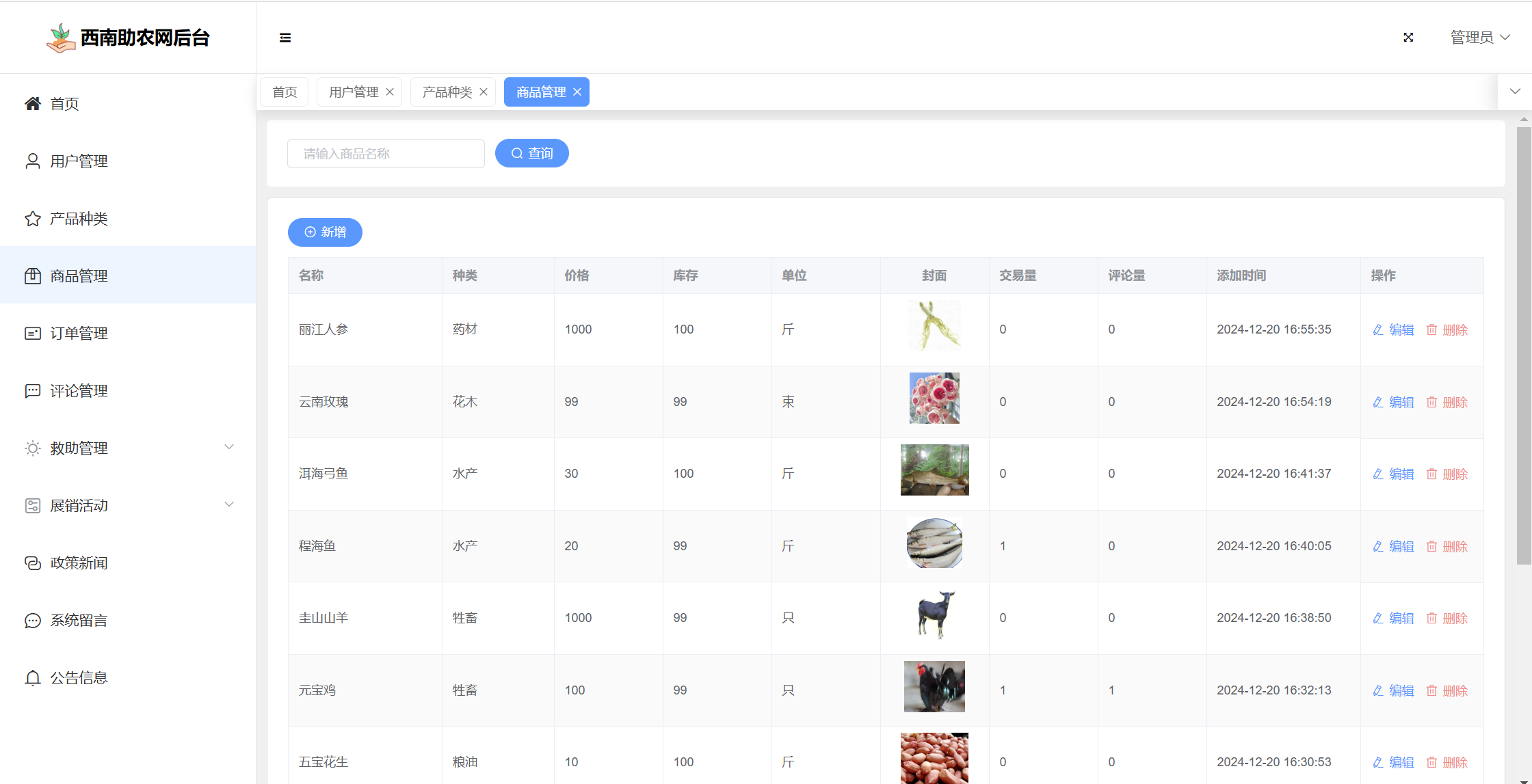 基于SpringBoot+Vue前后端分离的西南助农网站系统,系统包含管理员、用户角色,功能如下:
