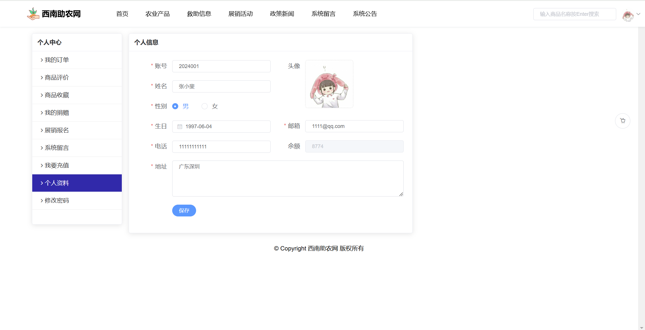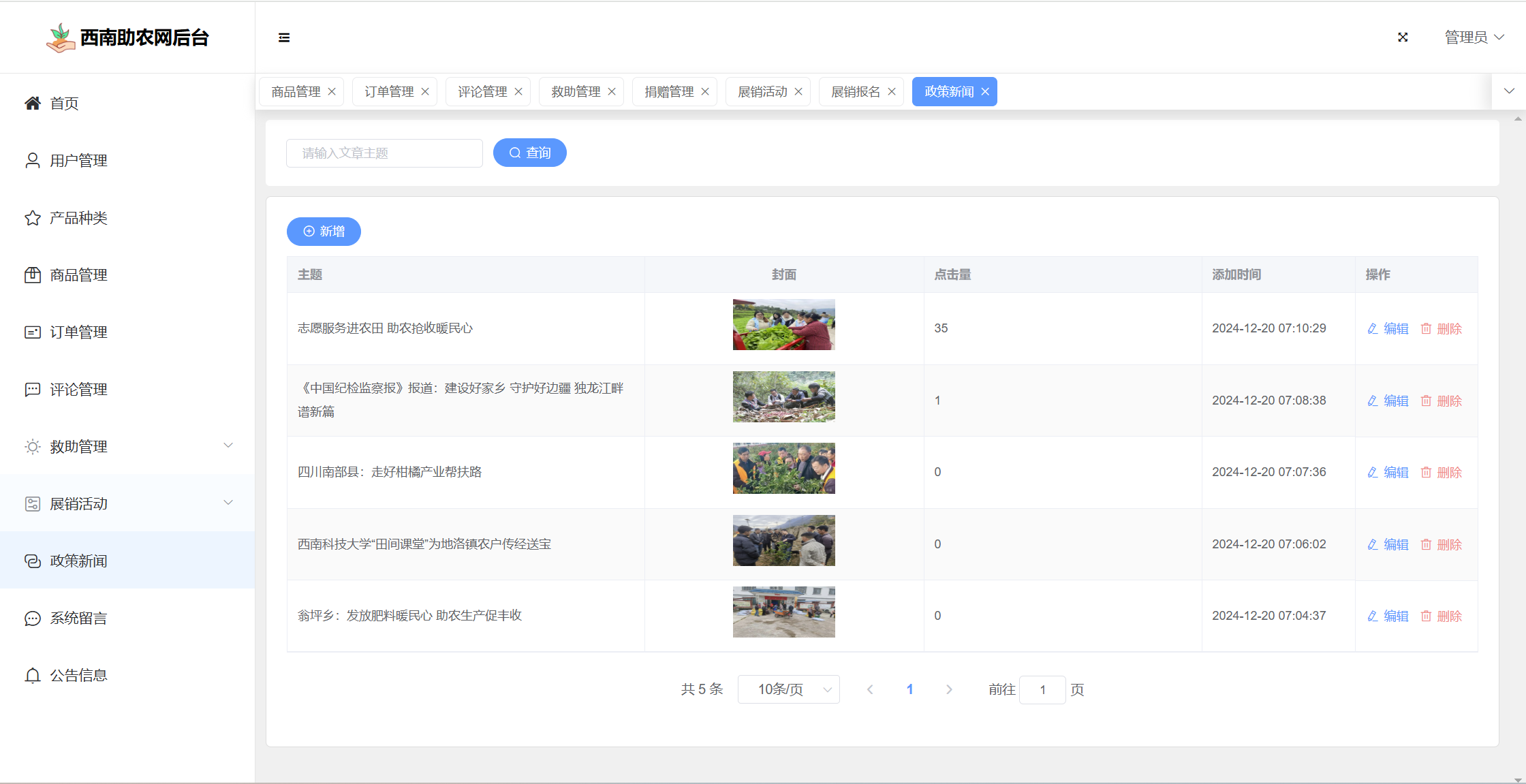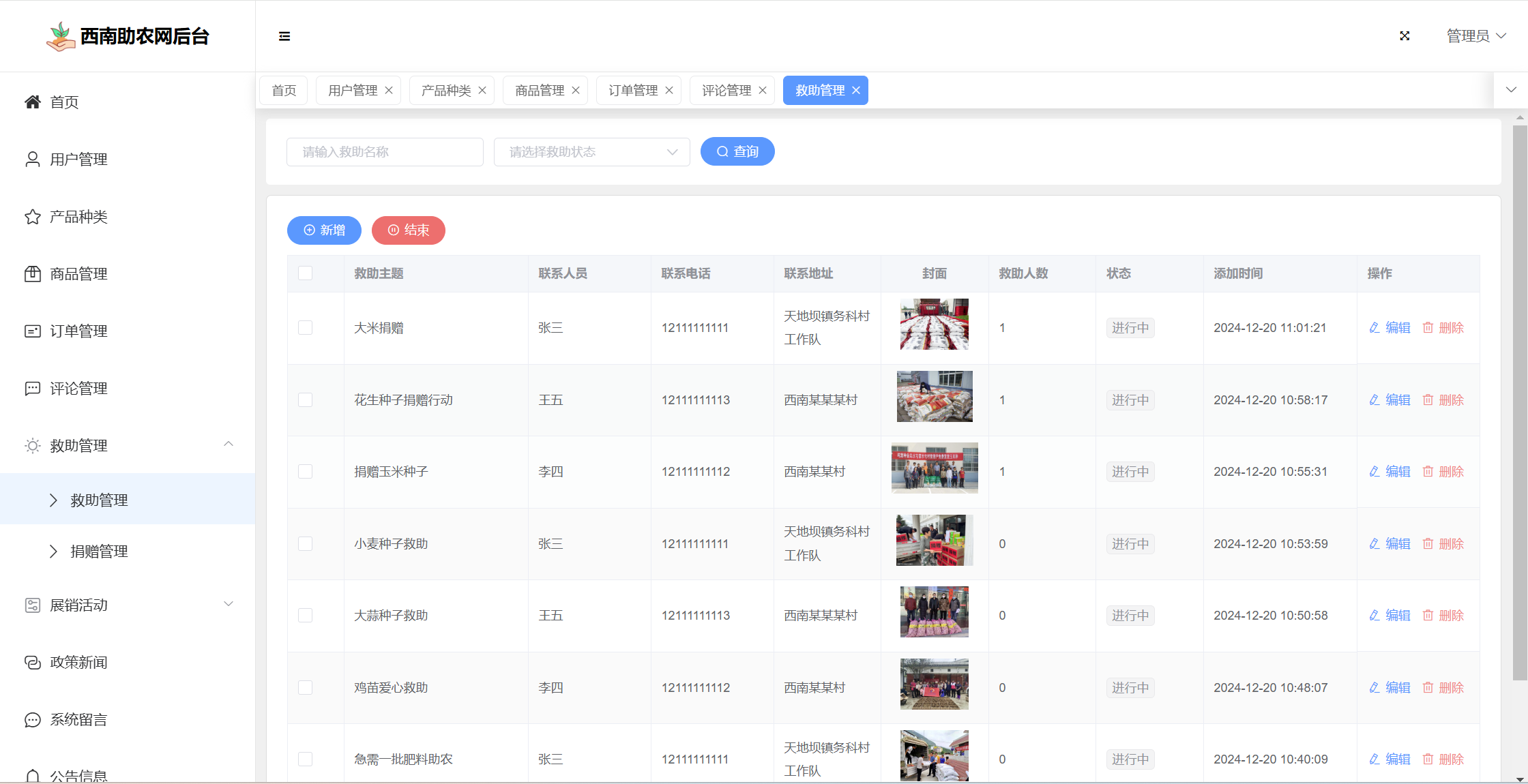 基于SpringBoot+Vue前后端分离的西南助农网站系统,系统包含管理员、用户角色,功能如下: