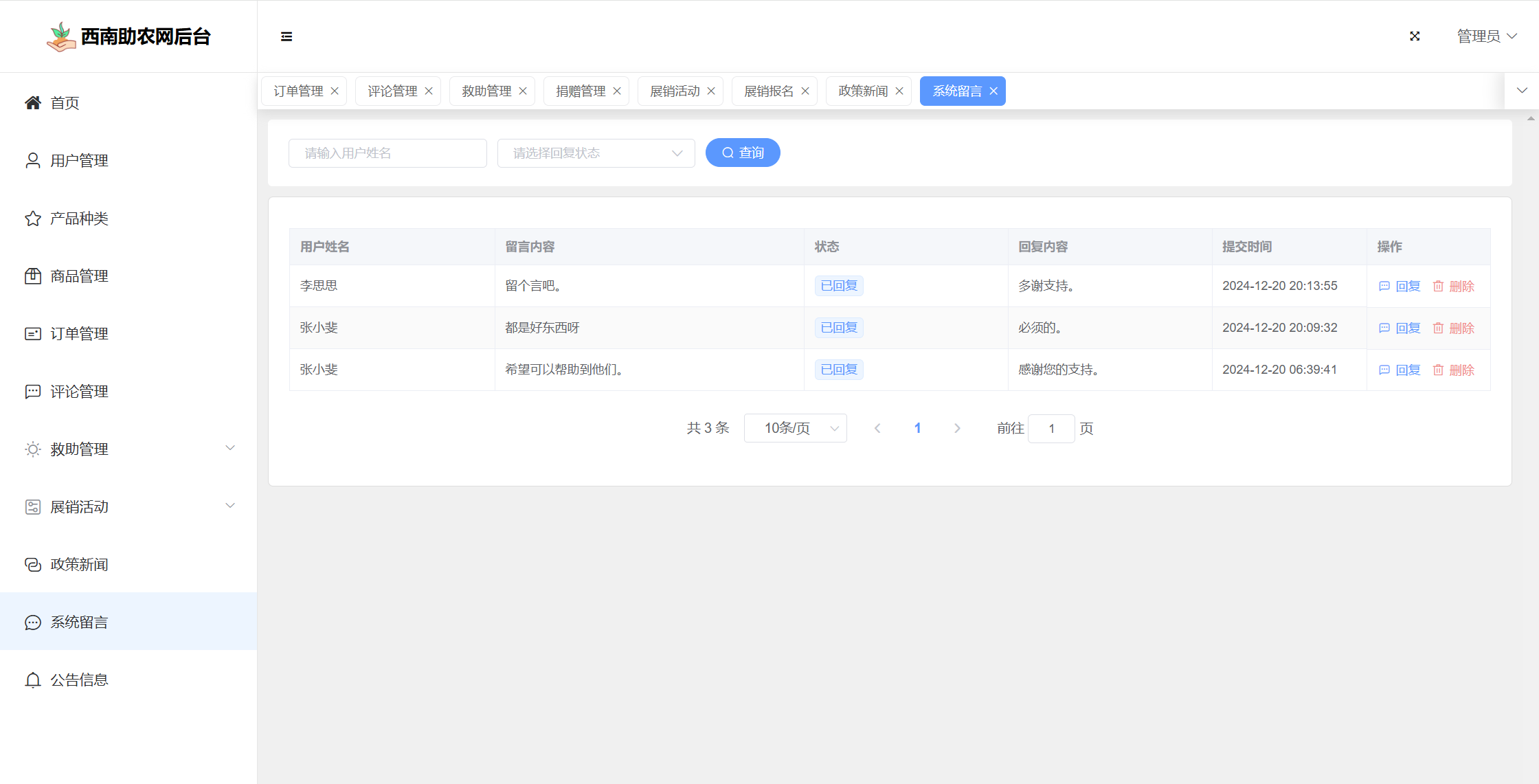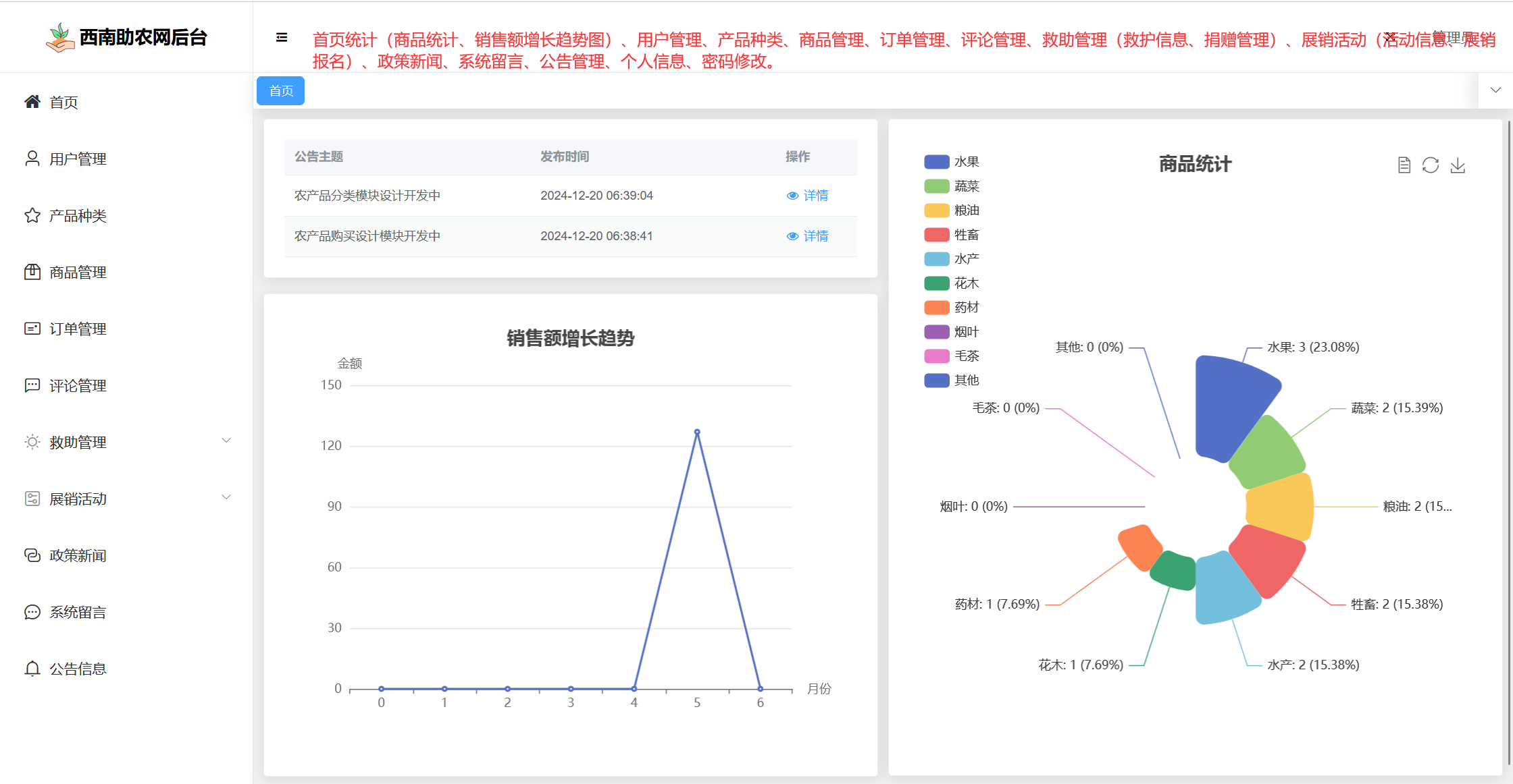管理员:首页统计(商品统计、销售额增长趋势图)、用户管理、产品种类、商品管理、订单管理、评论管理、救助管理(救护信息、捐赠管理)、展销活动(活动信息、展销报名)、政策新闻、系统留言、公告管理、个人信息、密码修改。