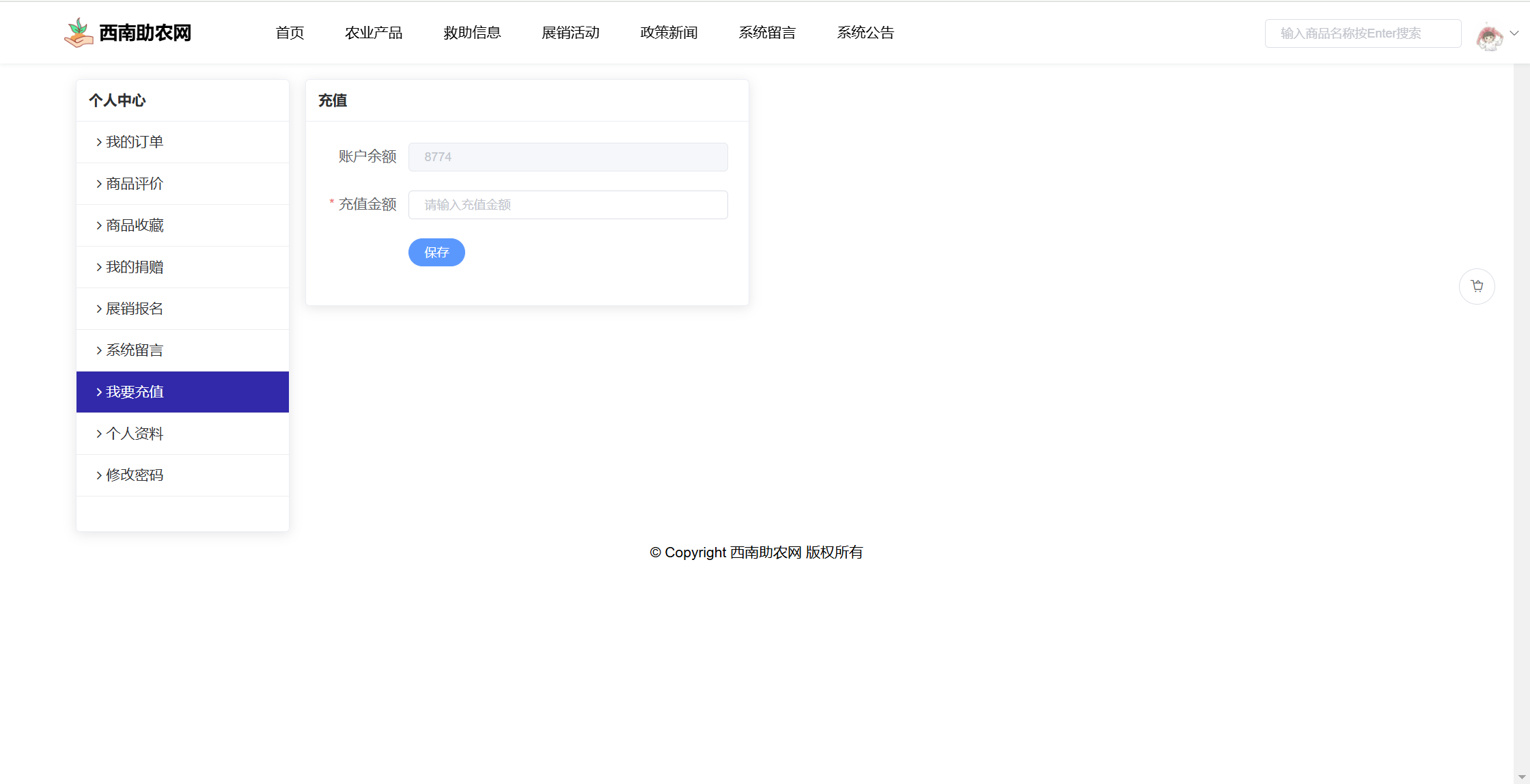 用户:注册、登录、首页、农业产品商城(分类、商品信息、商品详情、加入购物车、下单、评论)、救助信息(救助详情、捐赠)、展销活动(活动信息、活动报名)、政策新闻、系统留言、系统公告。用户还有个人中心功能:我的订单、商品评价、商品收藏、我的捐赠、展销报名、系统留言、我要充值、修改个人资料、修改密码
