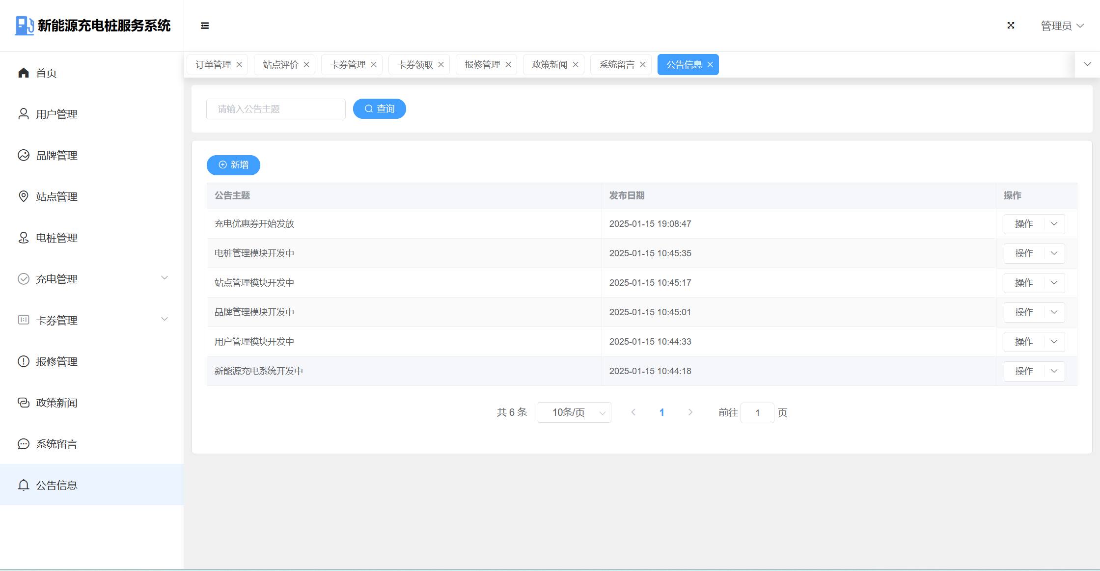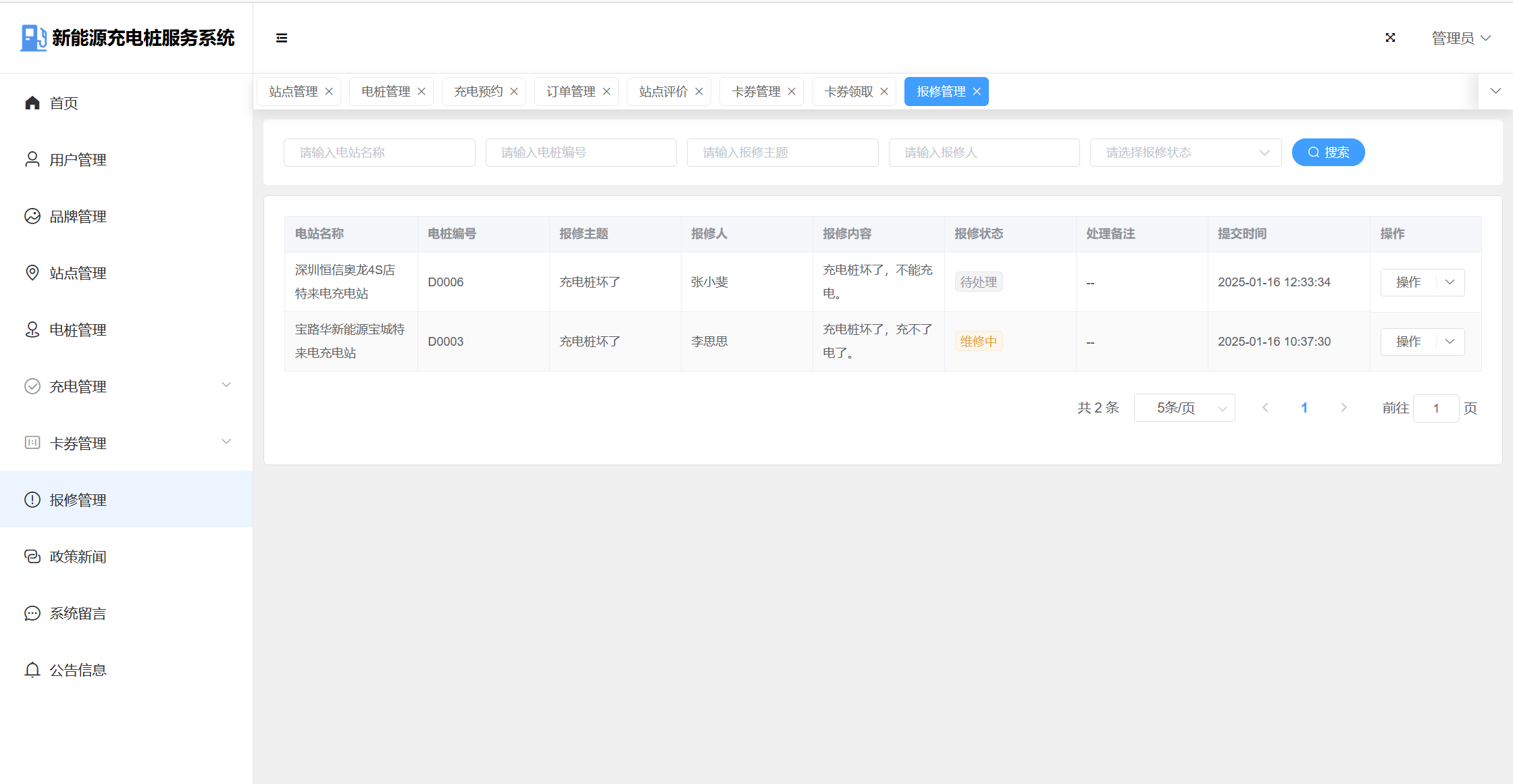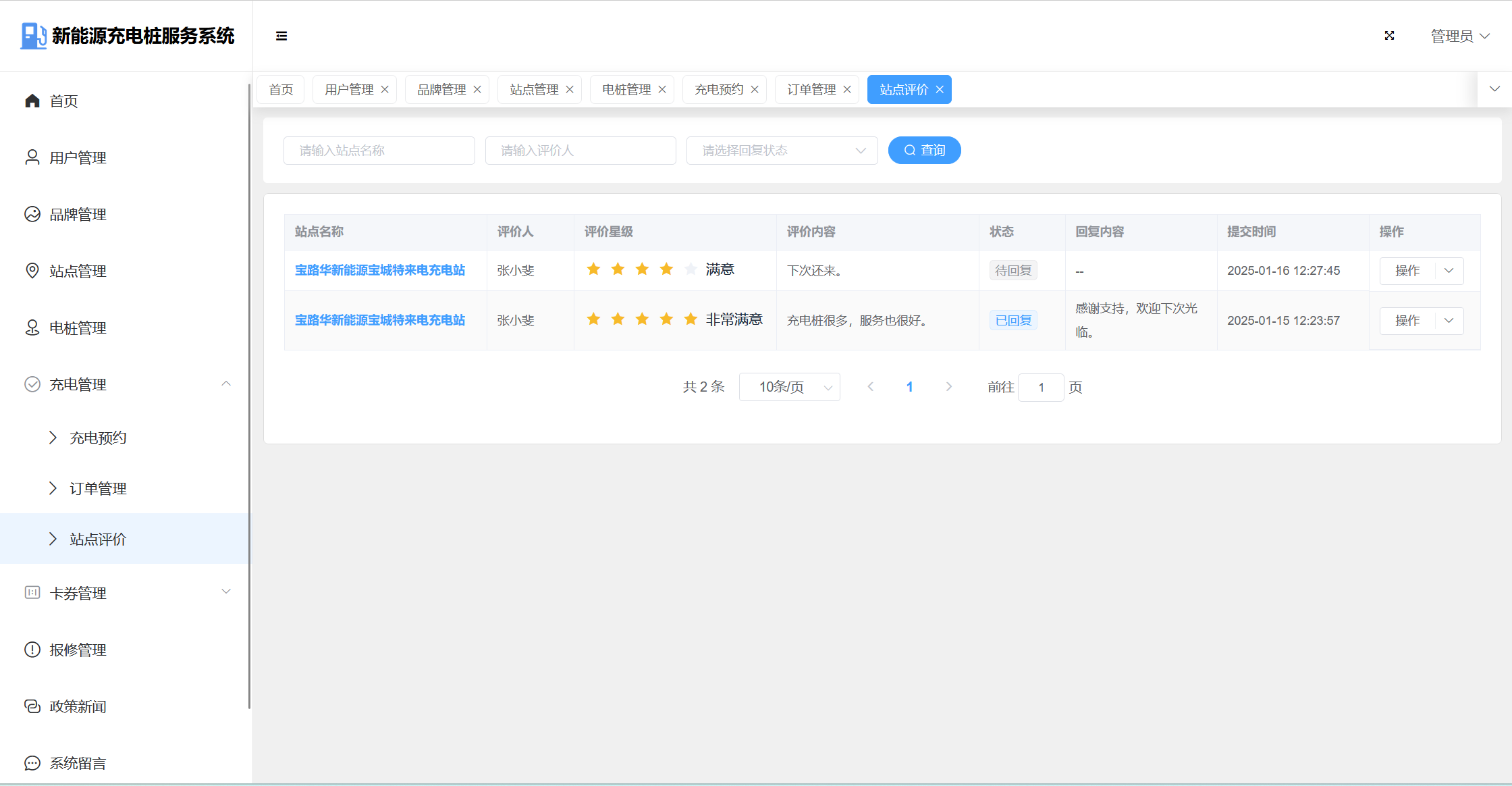 管理员:首页统计(充电金额统计、站点统计)、用户管理、品牌管理、站点管理、电桩管理、充电管理(充电预约、订单管理、站点评价)、卡券管理(卡券管理、卡券领取)、报修管理、政策新闻、系统留言、公告信息。