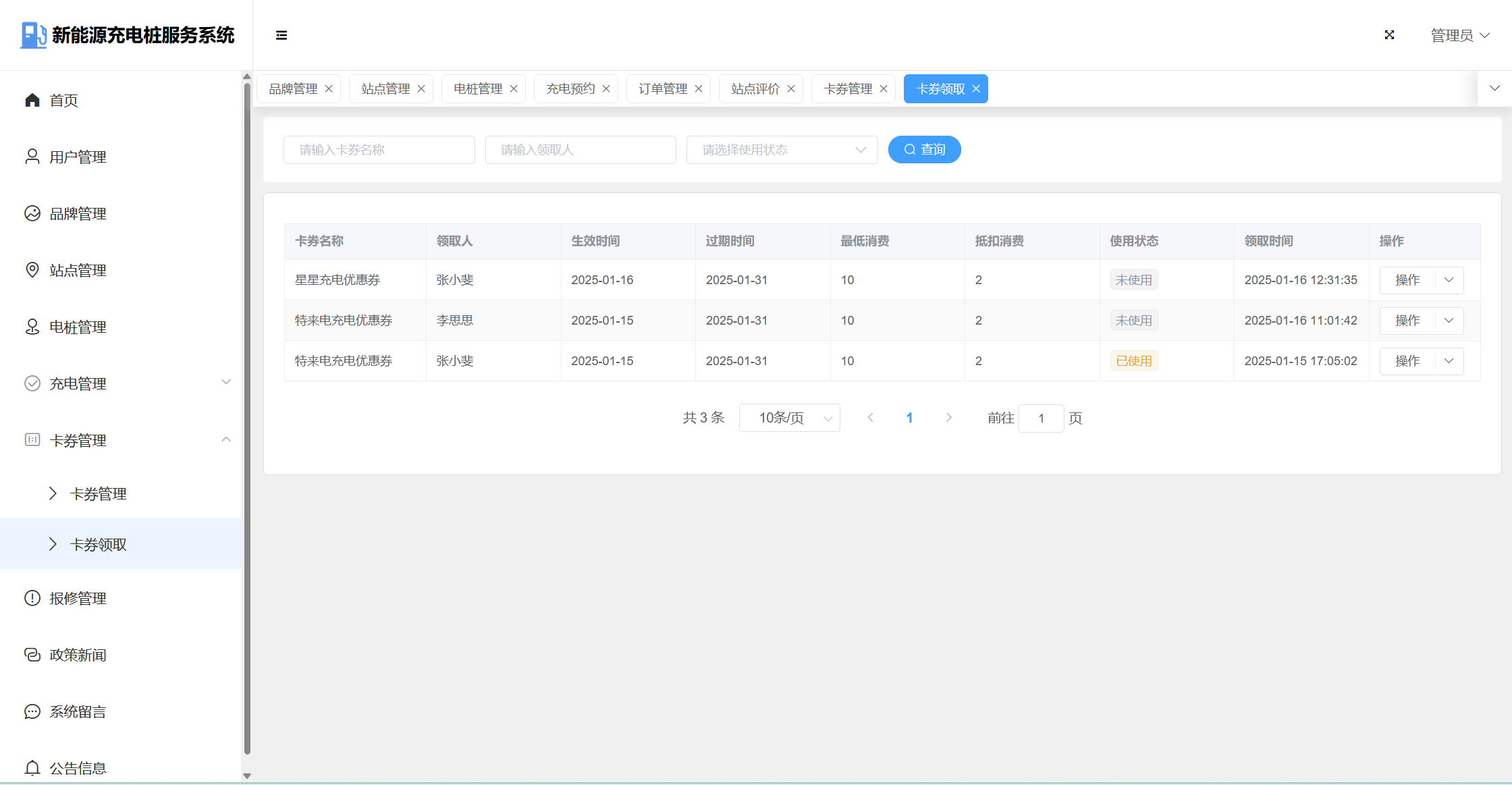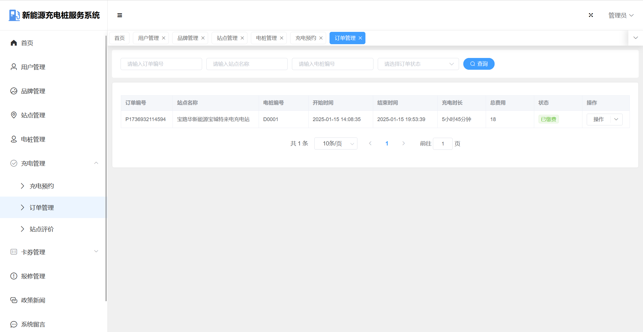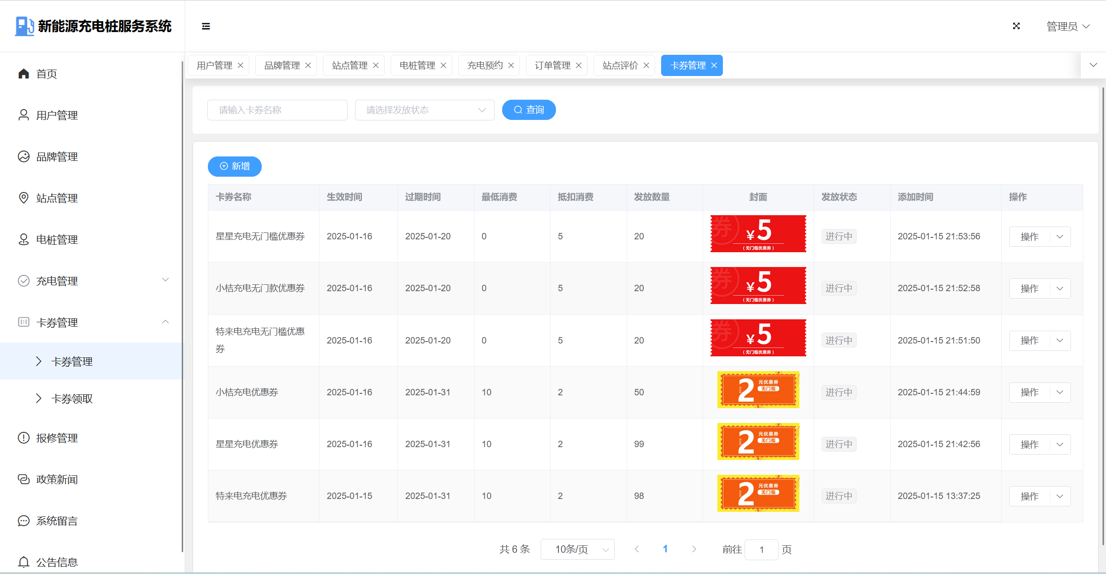 管理员:首页统计(充电金额统计、站点统计)、用户管理、品牌管理、站点管理、电桩管理、充电管理(充电预约、订单管理、站点评价)、卡券管理(卡券管理、卡券领取)、报修管理、政策新闻、系统留言、公告信息。