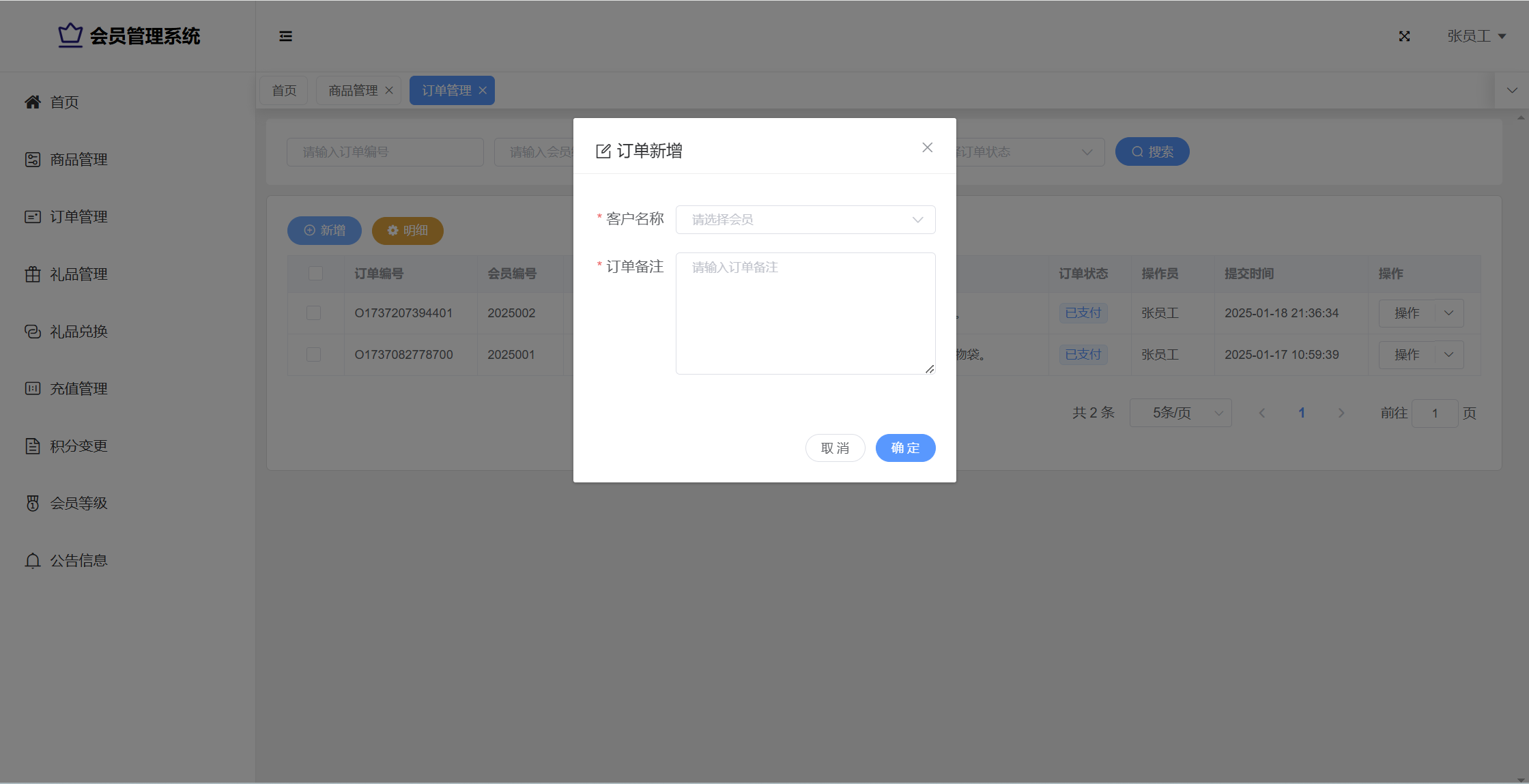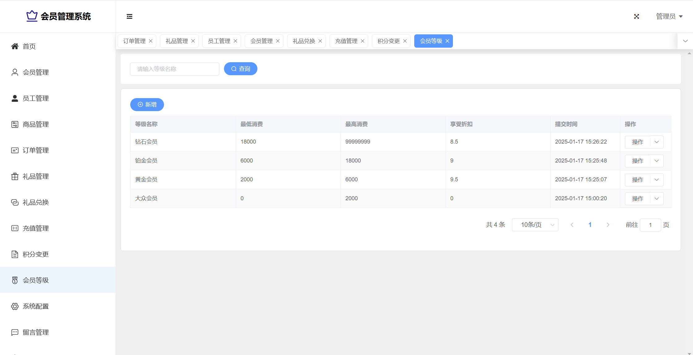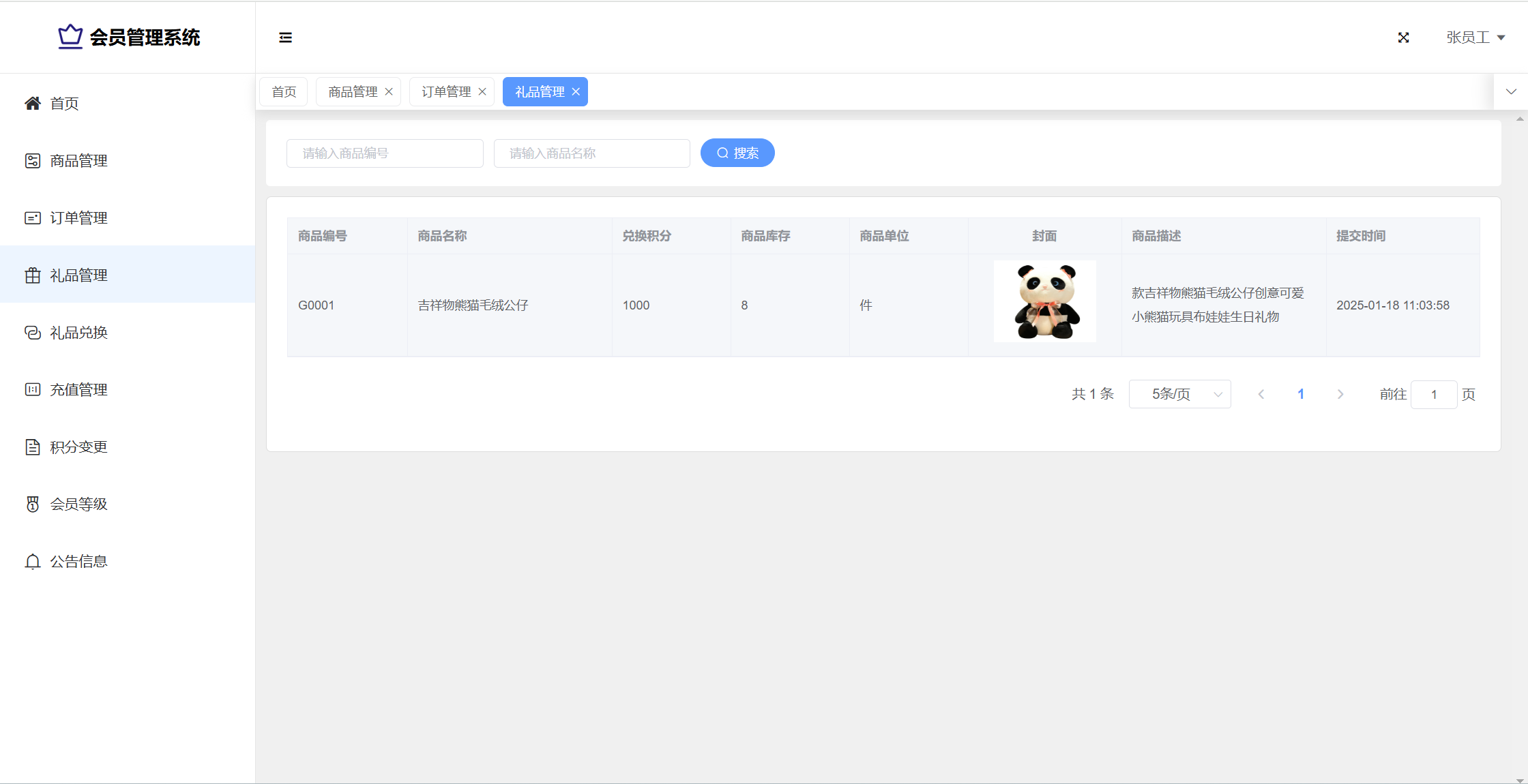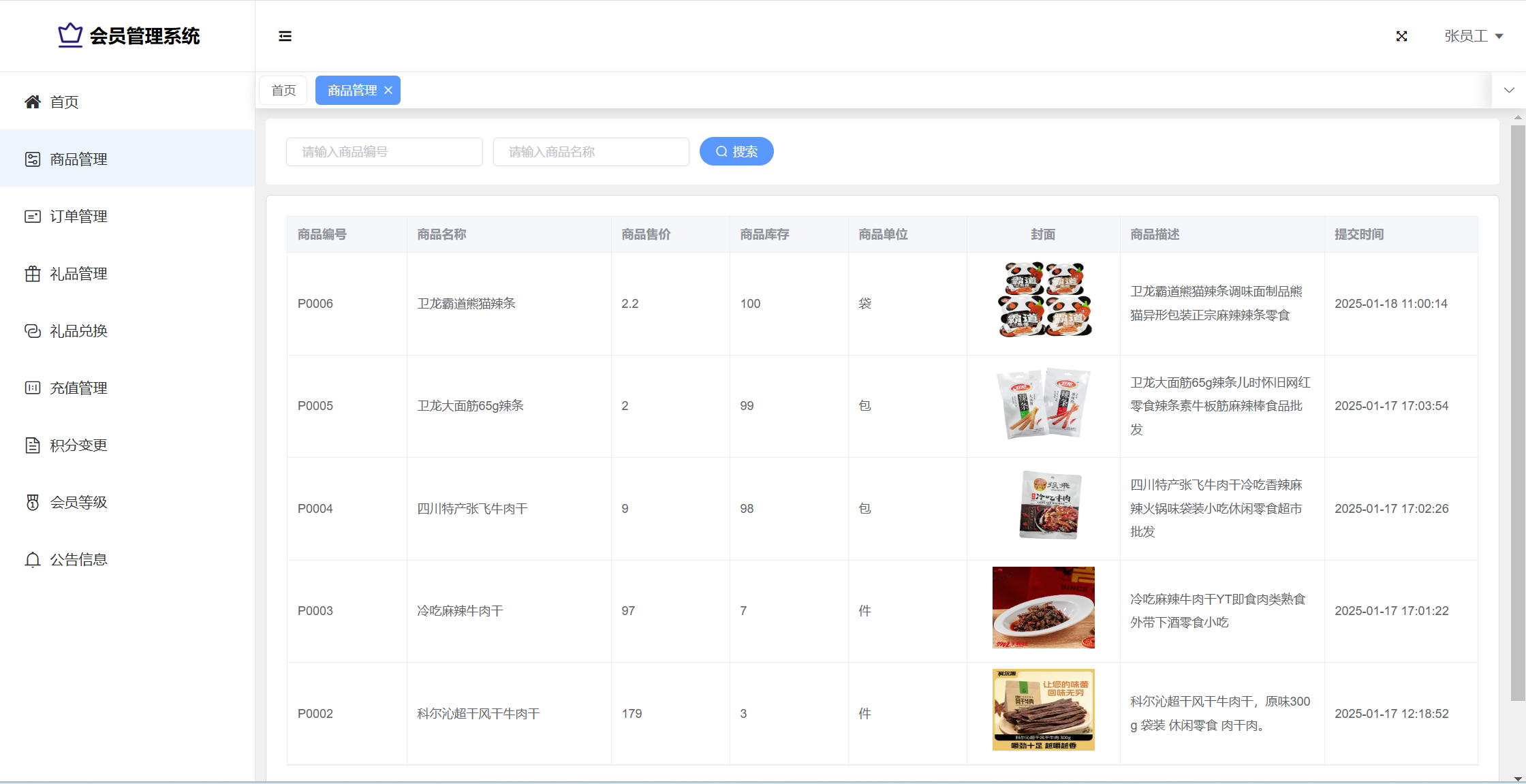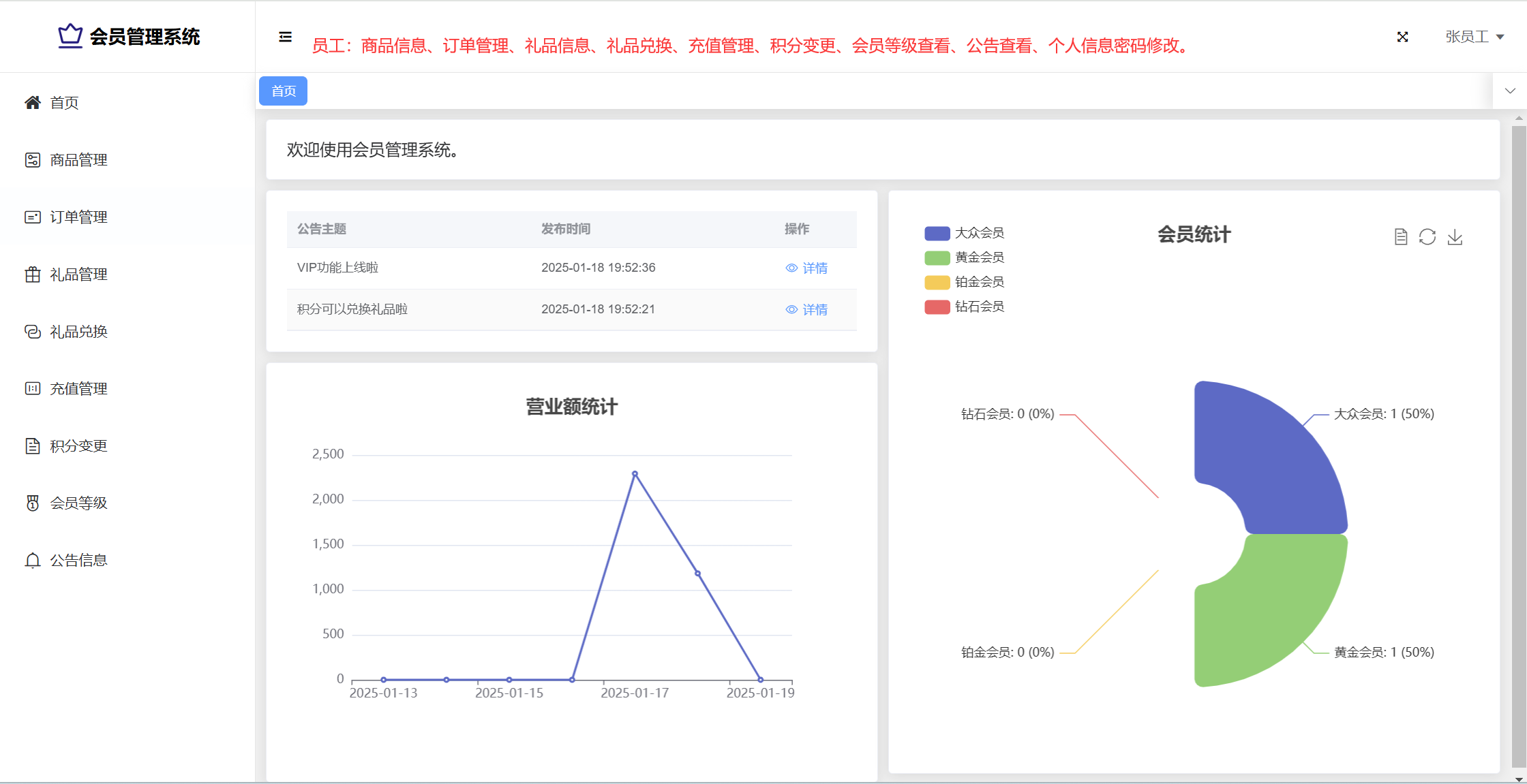 员工:商品信息、订单管理、礼品信息、礼品兑换、充值管理、积分变更、会员等级查看、公告查看、个人信息密码修改。