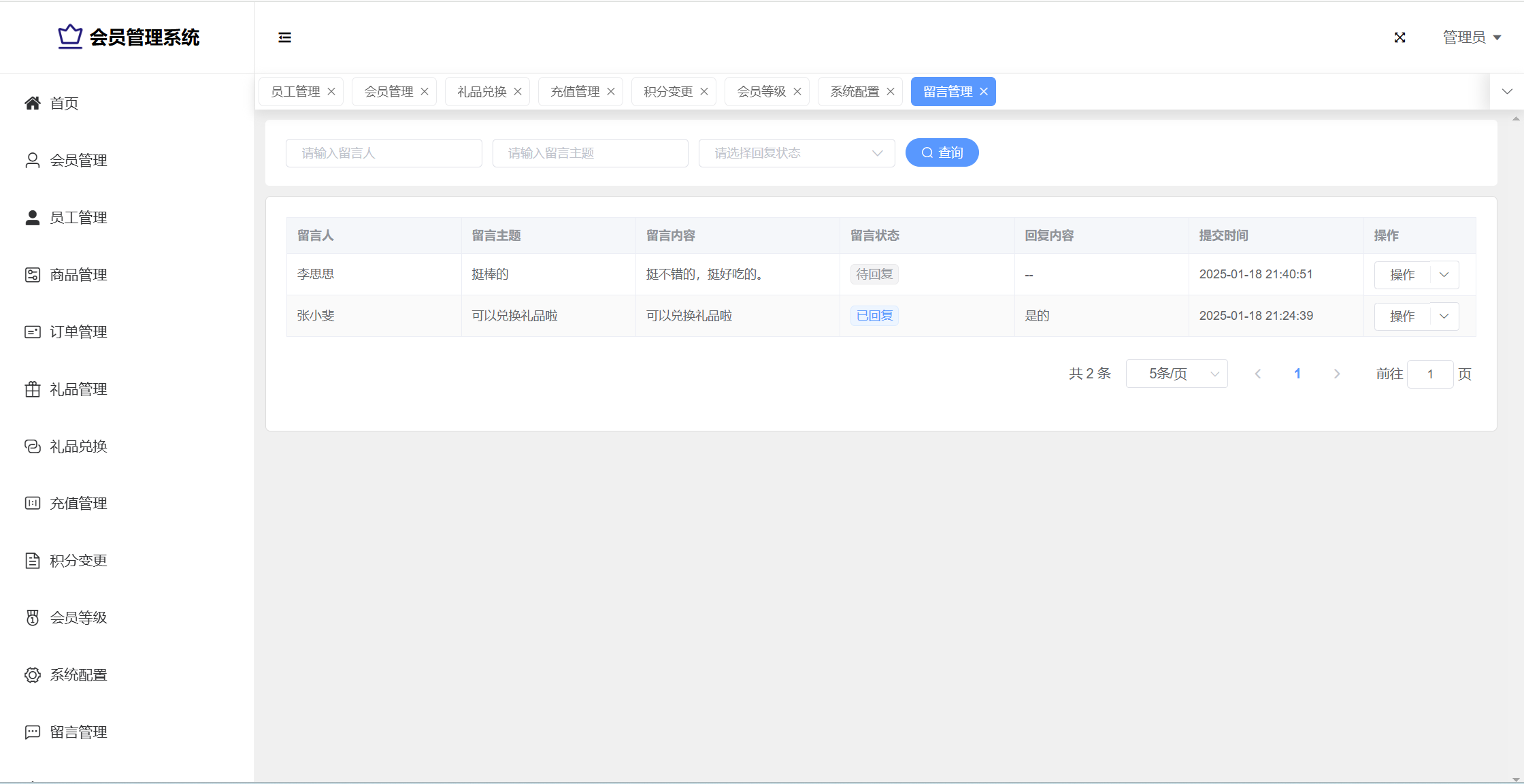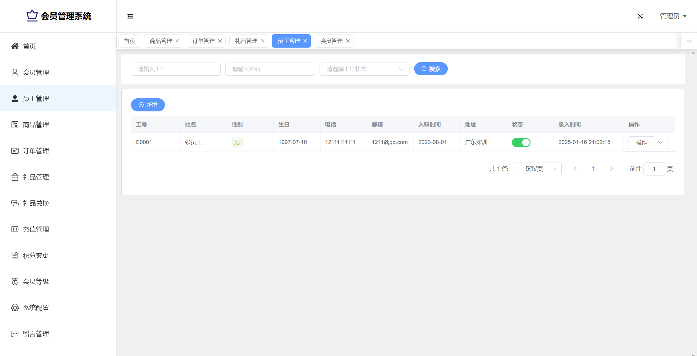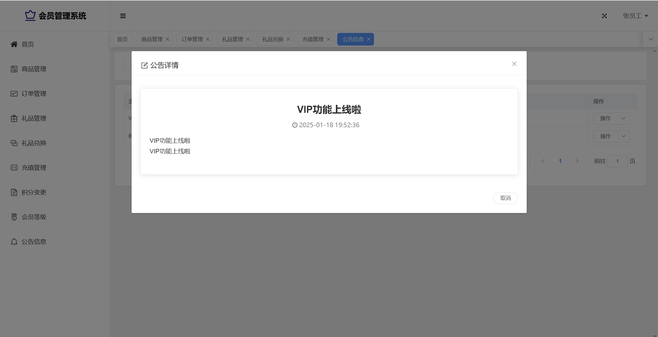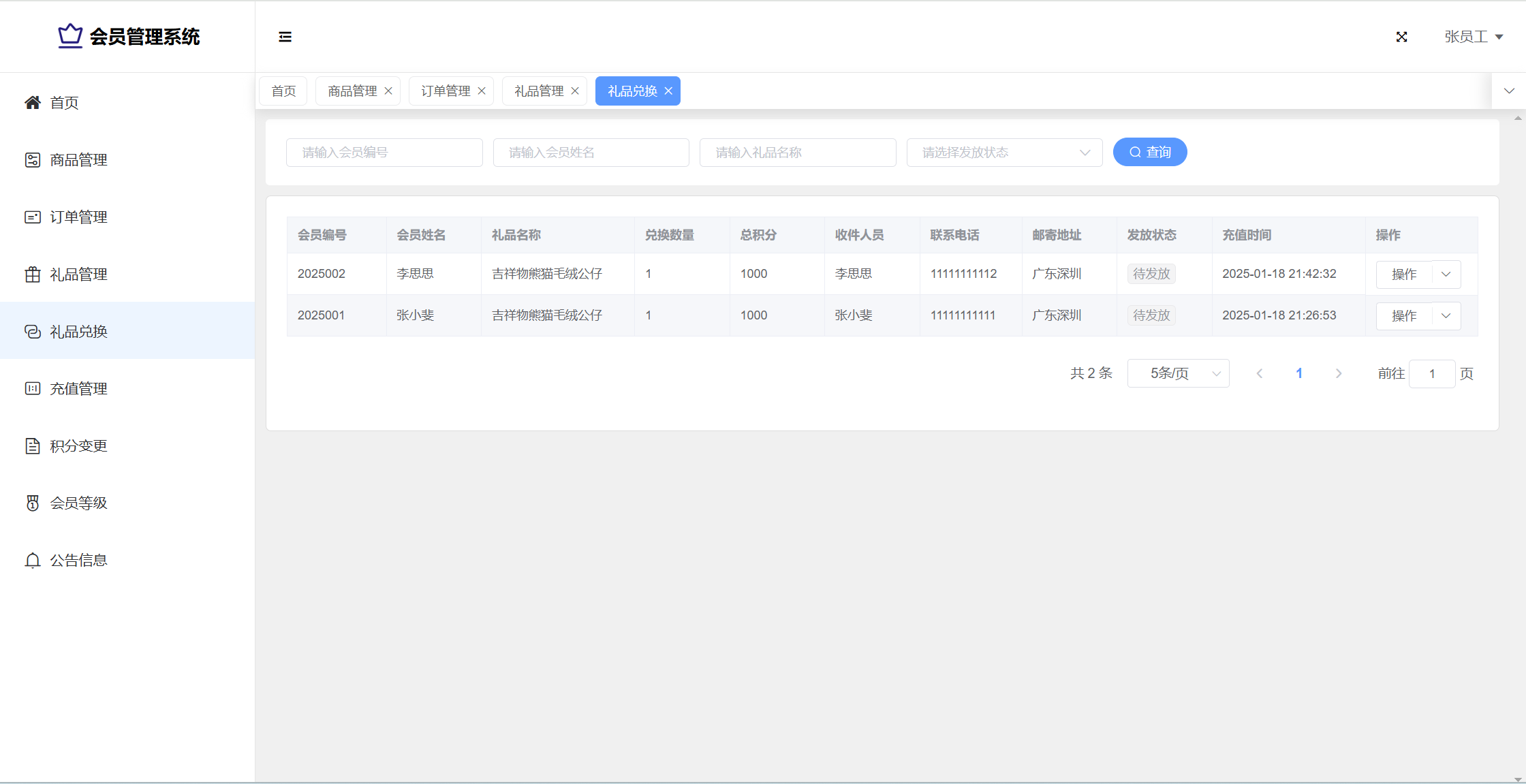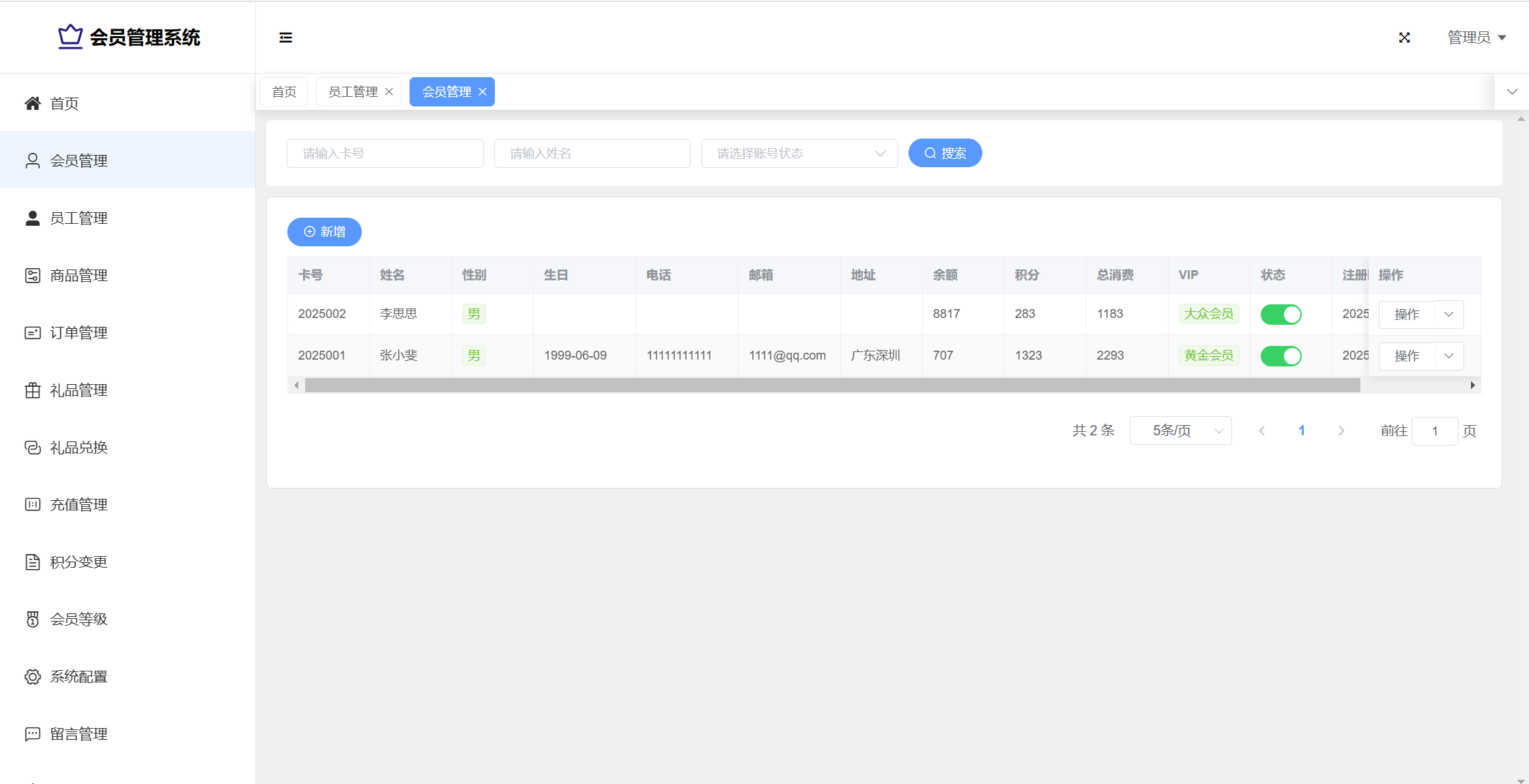 员工:商品信息、订单管理、礼品信息、礼品兑换、充值管理、积分变更、会员等级查看、公告查看、个人信息密码修改。