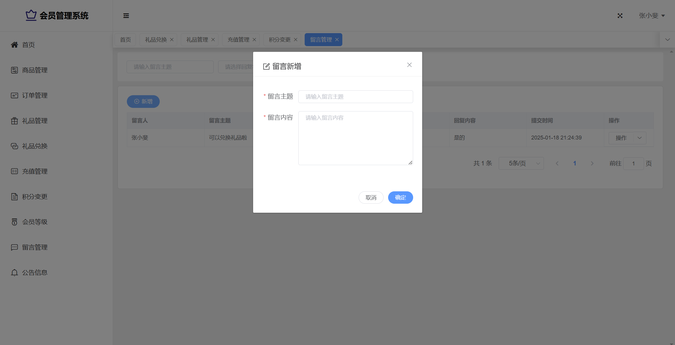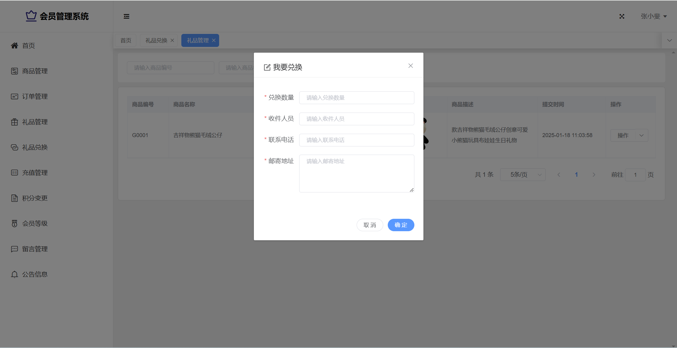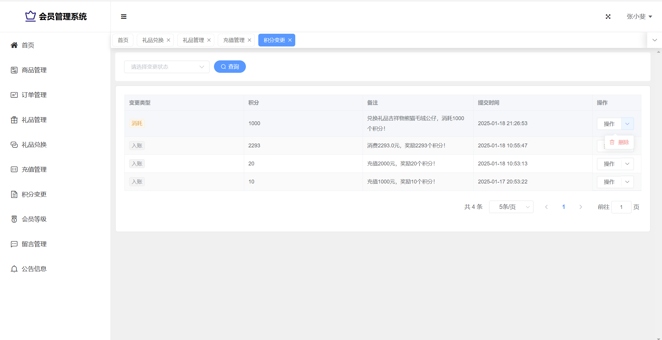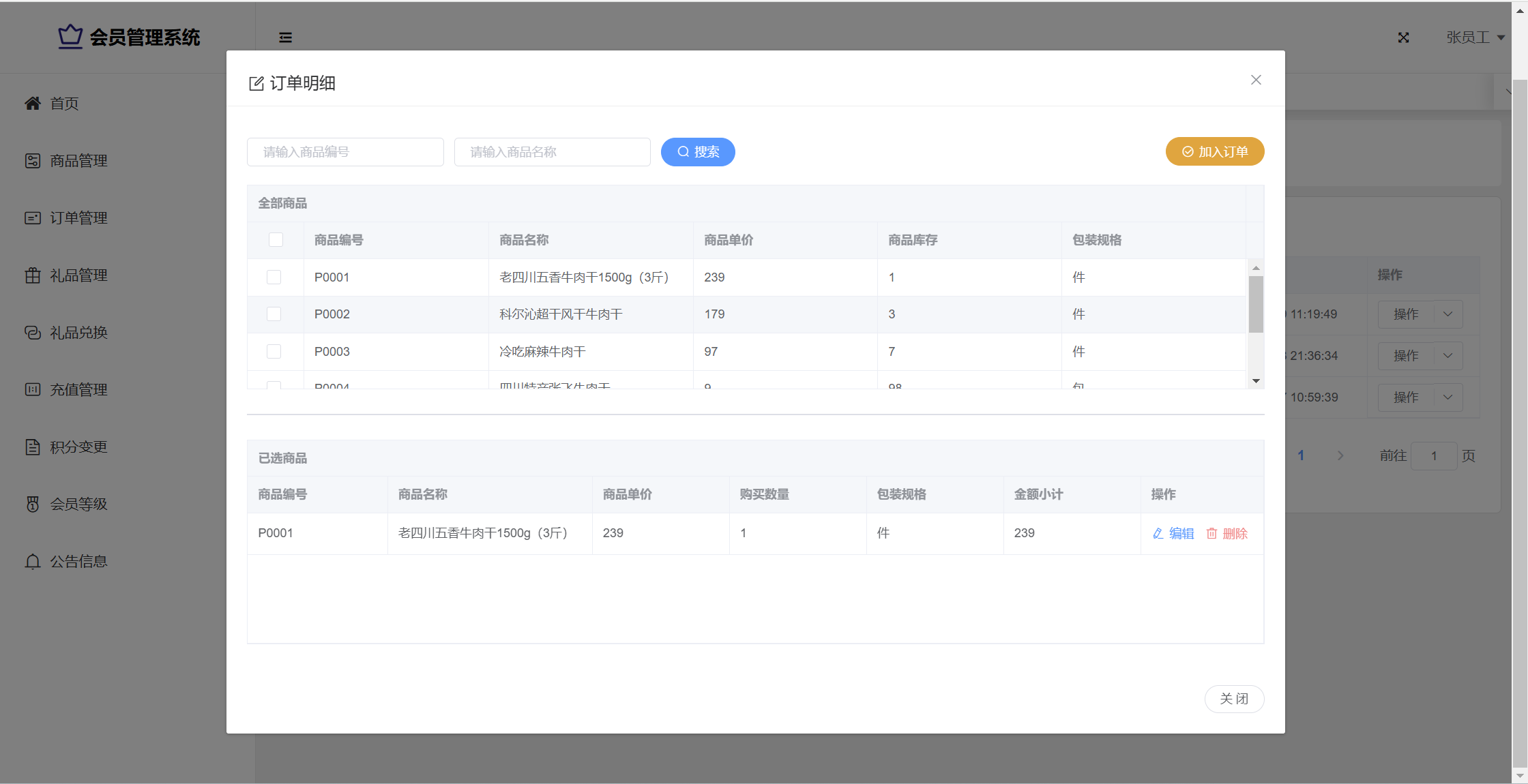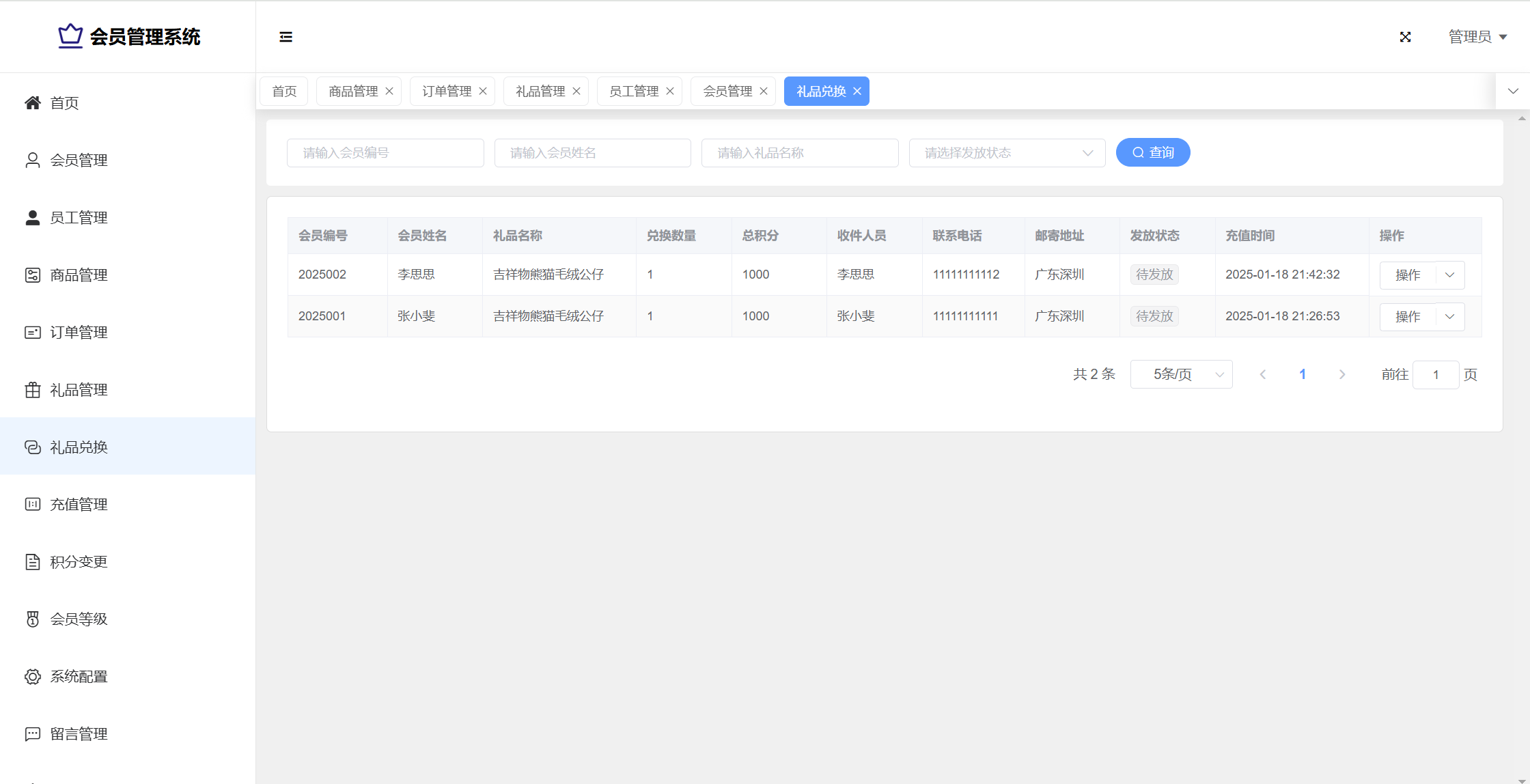 员工:商品信息、订单管理、礼品信息、礼品兑换、充值管理、积分变更、会员等级查看、公告查看、个人信息密码修改。