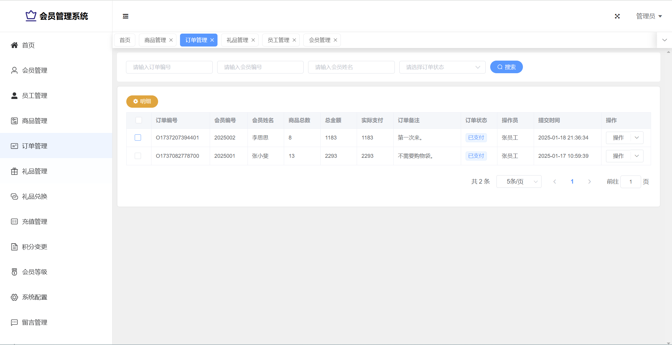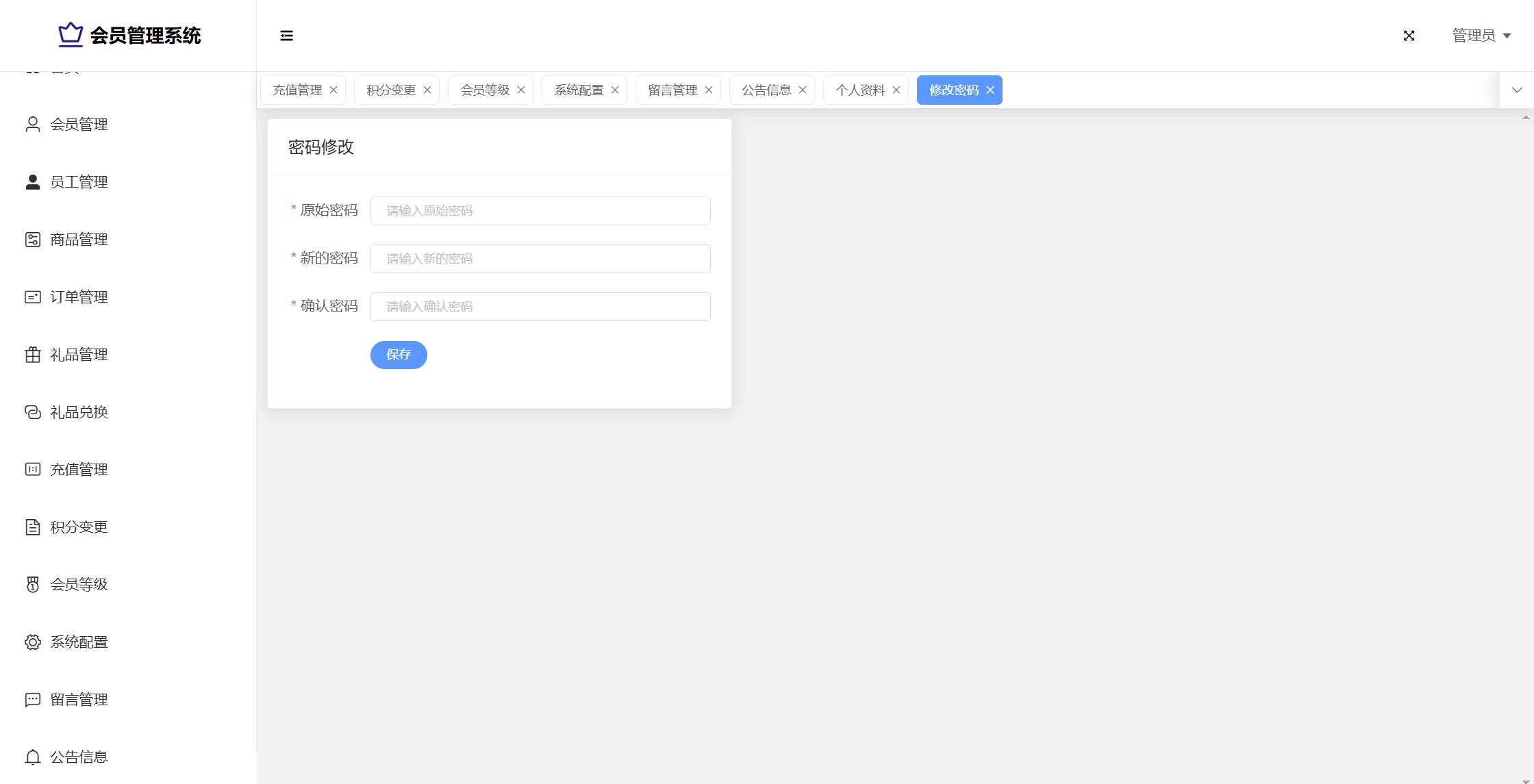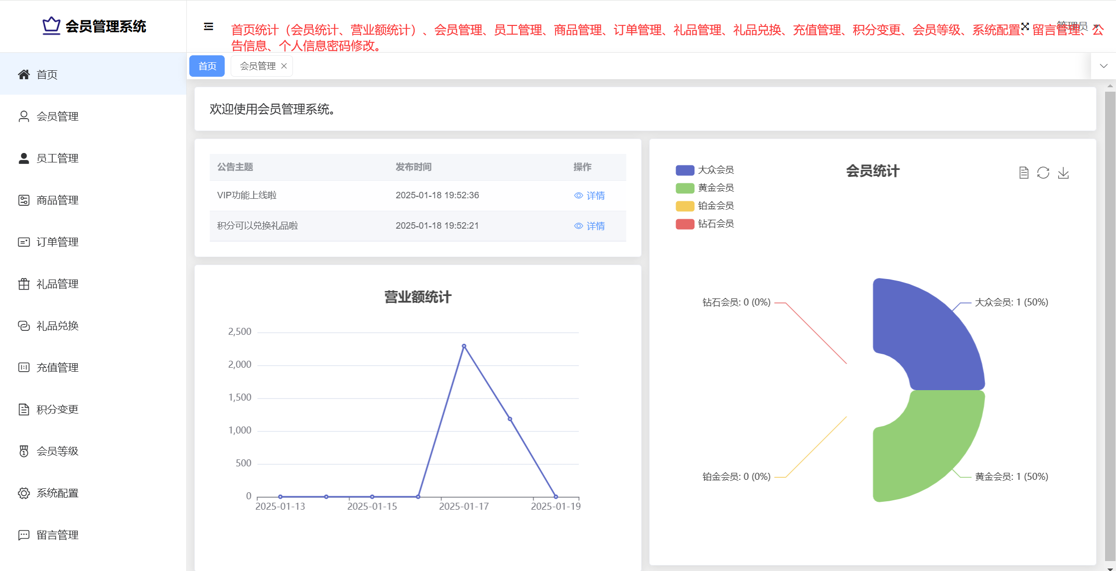 管理员:首页统计(会员统计、营业额统计)、会员管理、员工管理、商品管理、订单管理、礼品管理、礼品兑换、充值管理、积分变更、会员等级、系统配置、留言管理、公告信息、个人信息密码修改。