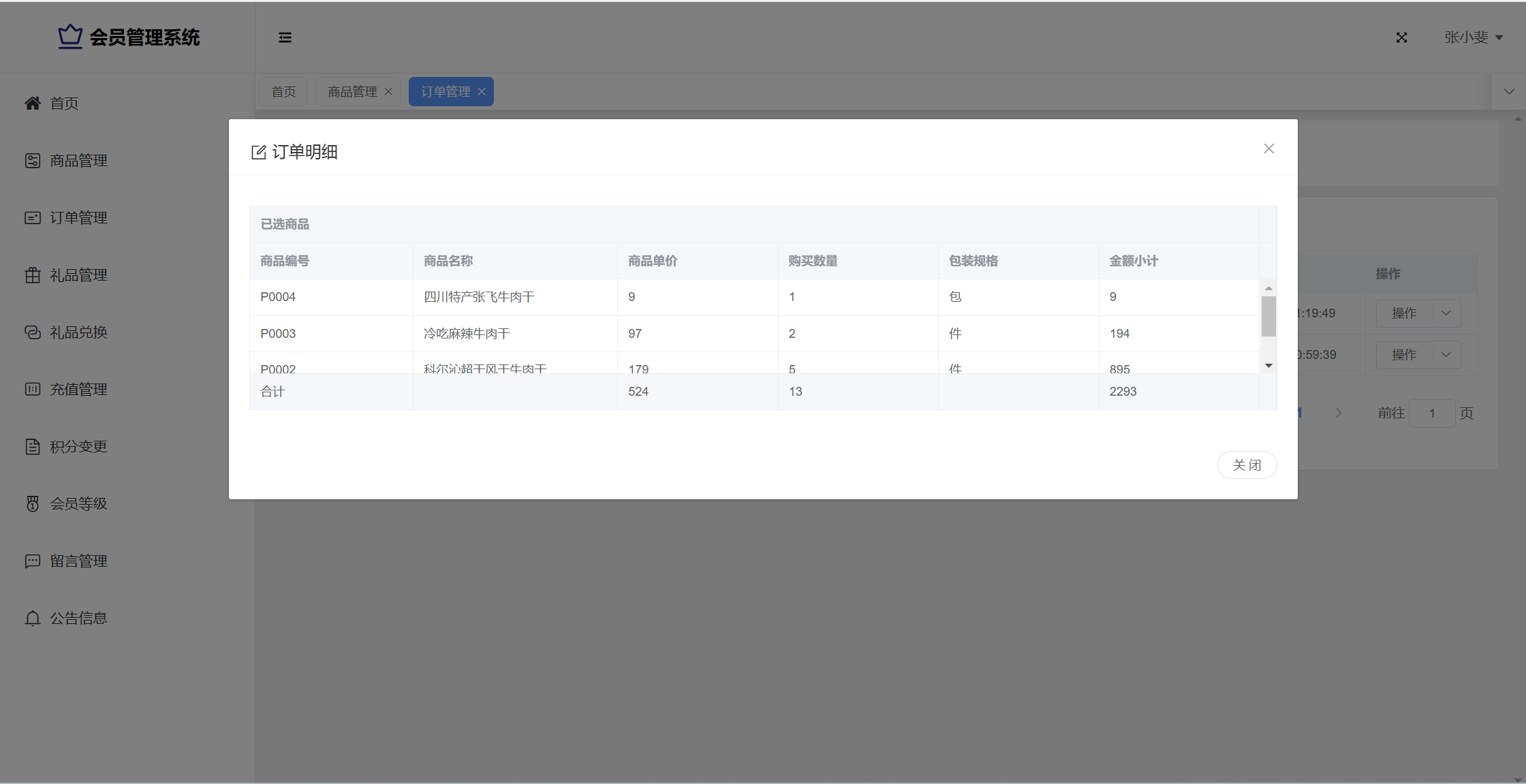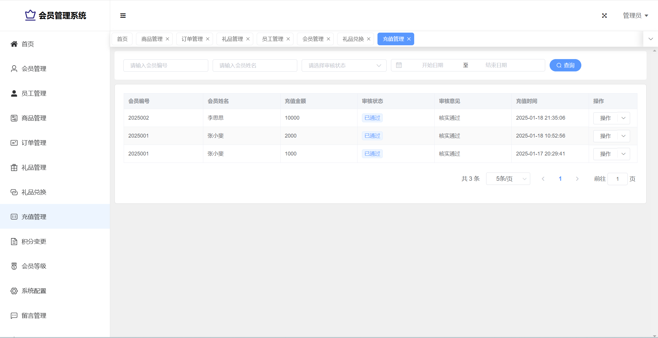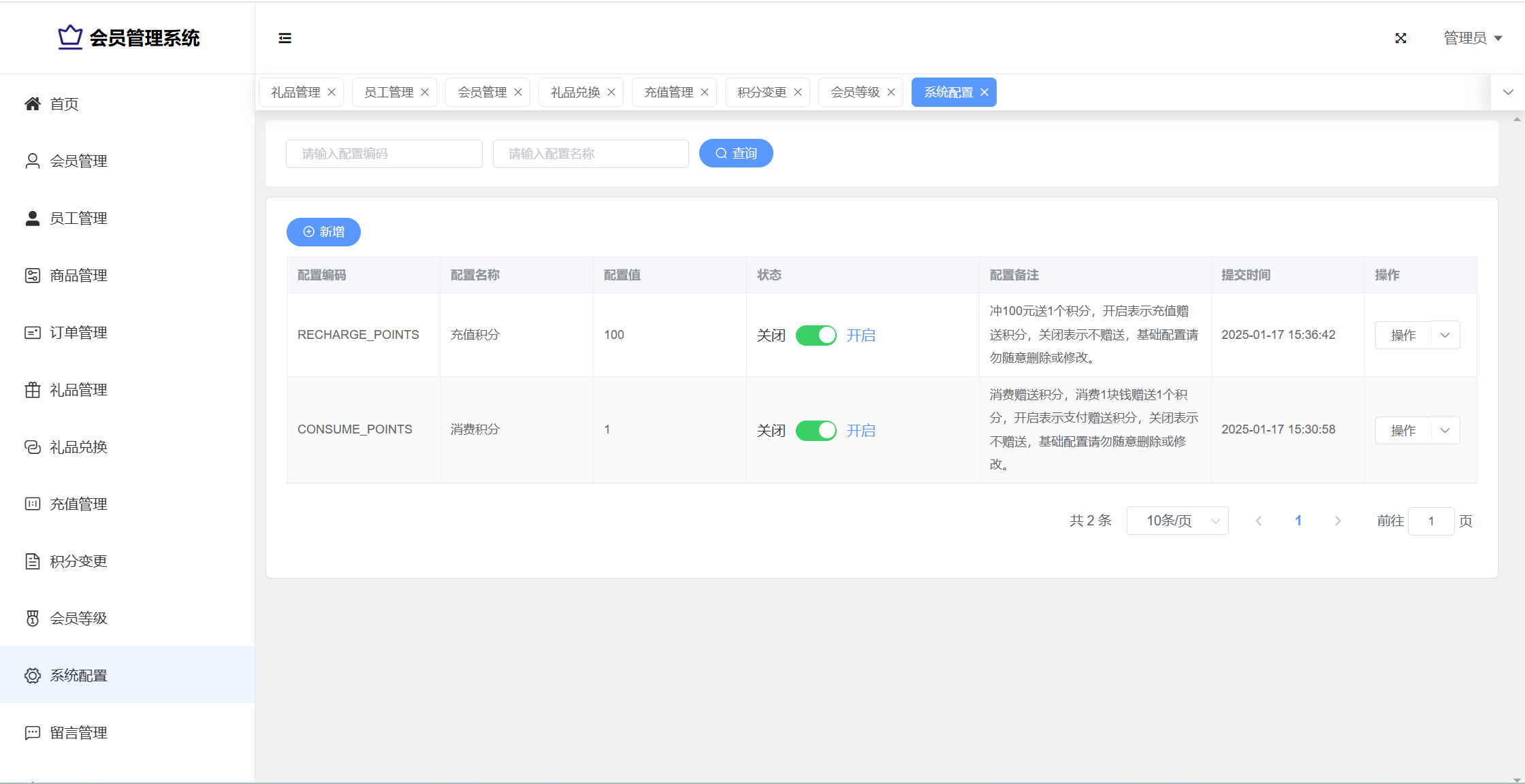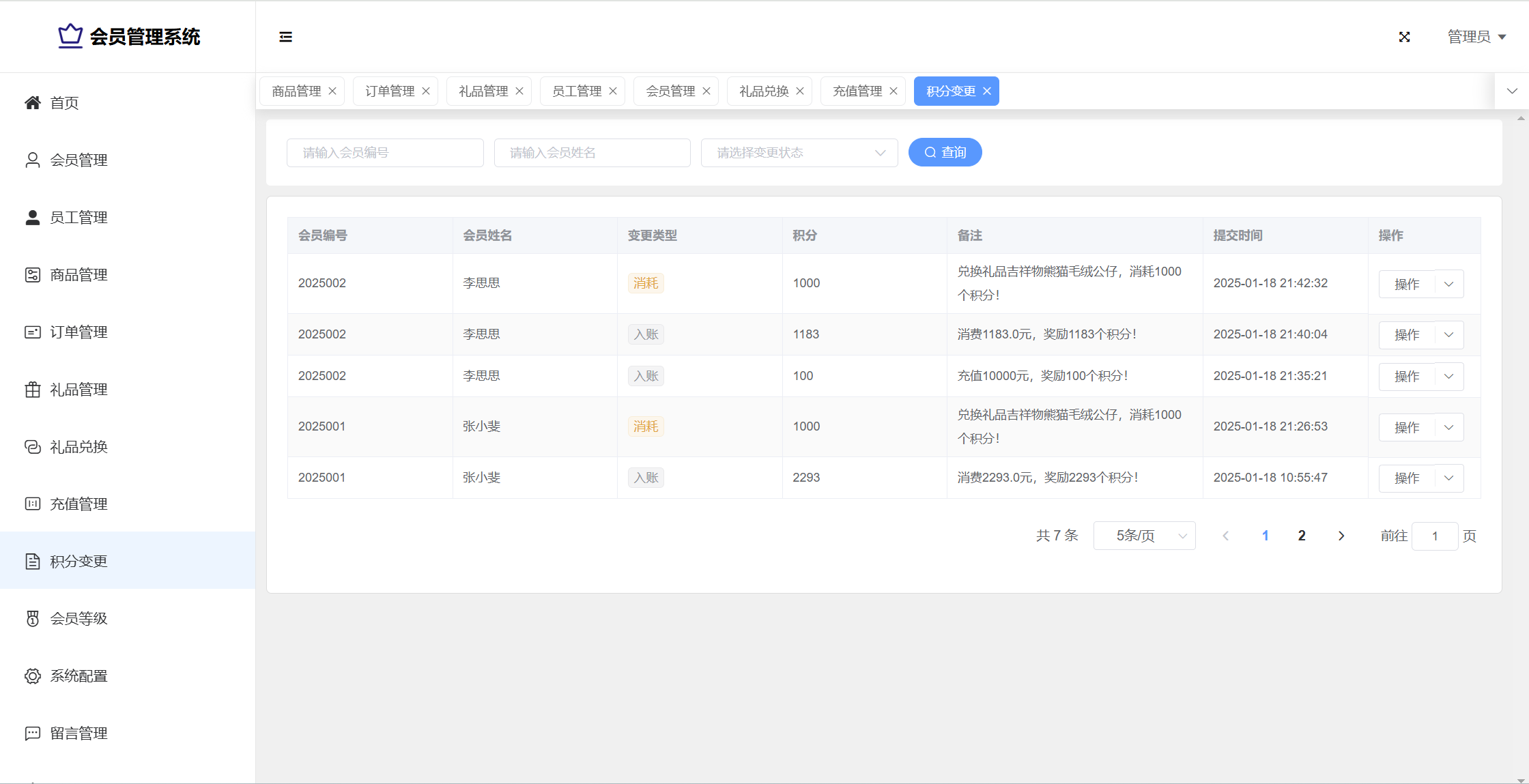 管理员:首页统计(会员统计、营业额统计)、会员管理、员工管理、商品管理、订单管理、礼品管理、礼品兑换、充值管理、积分变更、会员等级、系统配置、留言管理、公告信息、个人信息密码修改。