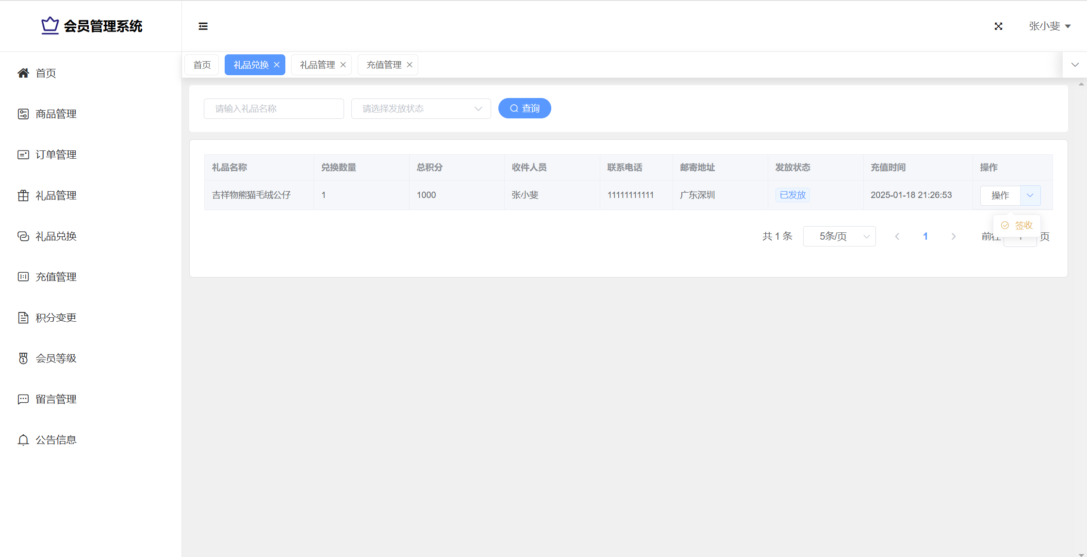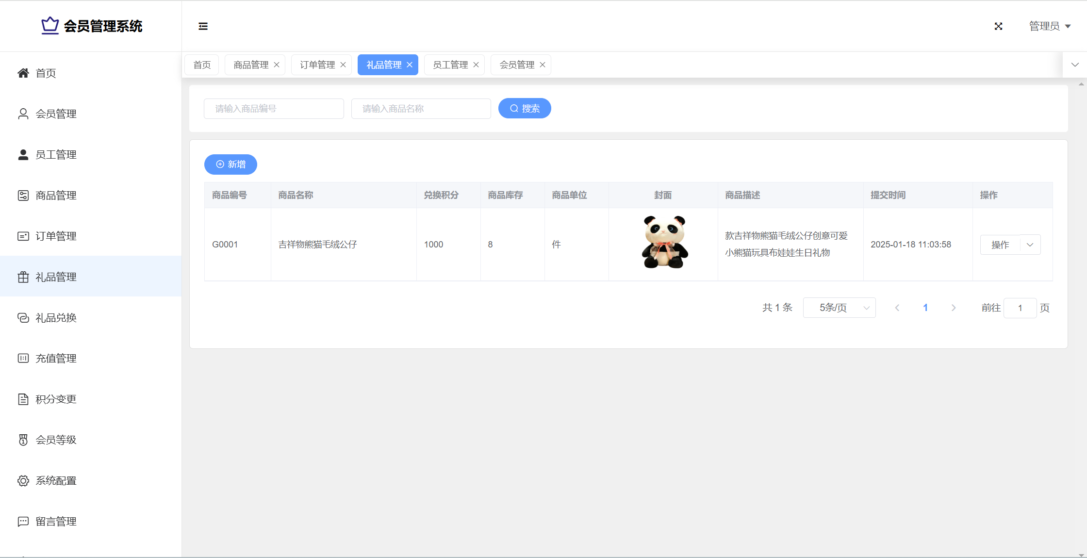 会员:注册、登录(支持人脸识别登录)、商品查看、订单查看、礼品查看(兑换)、礼品兑换管理、充值管理、积分变更、会员等级、留言管理、公告信息、个人信息、修改密码、充值。