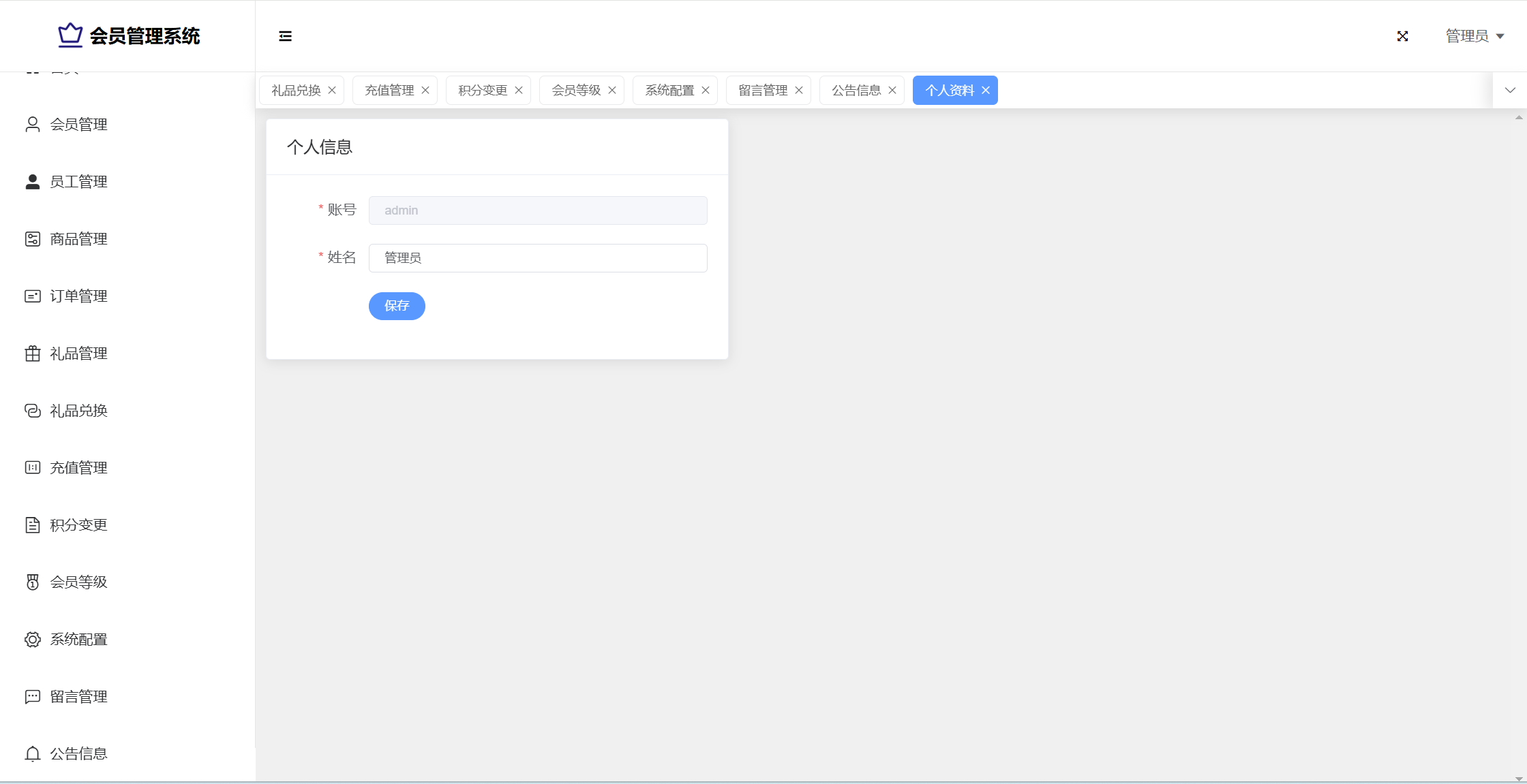 基于SpringBoot+Vue前后端分离的会员信息管理网站,系统包含管理员、员工、会员角色,功能如下:
