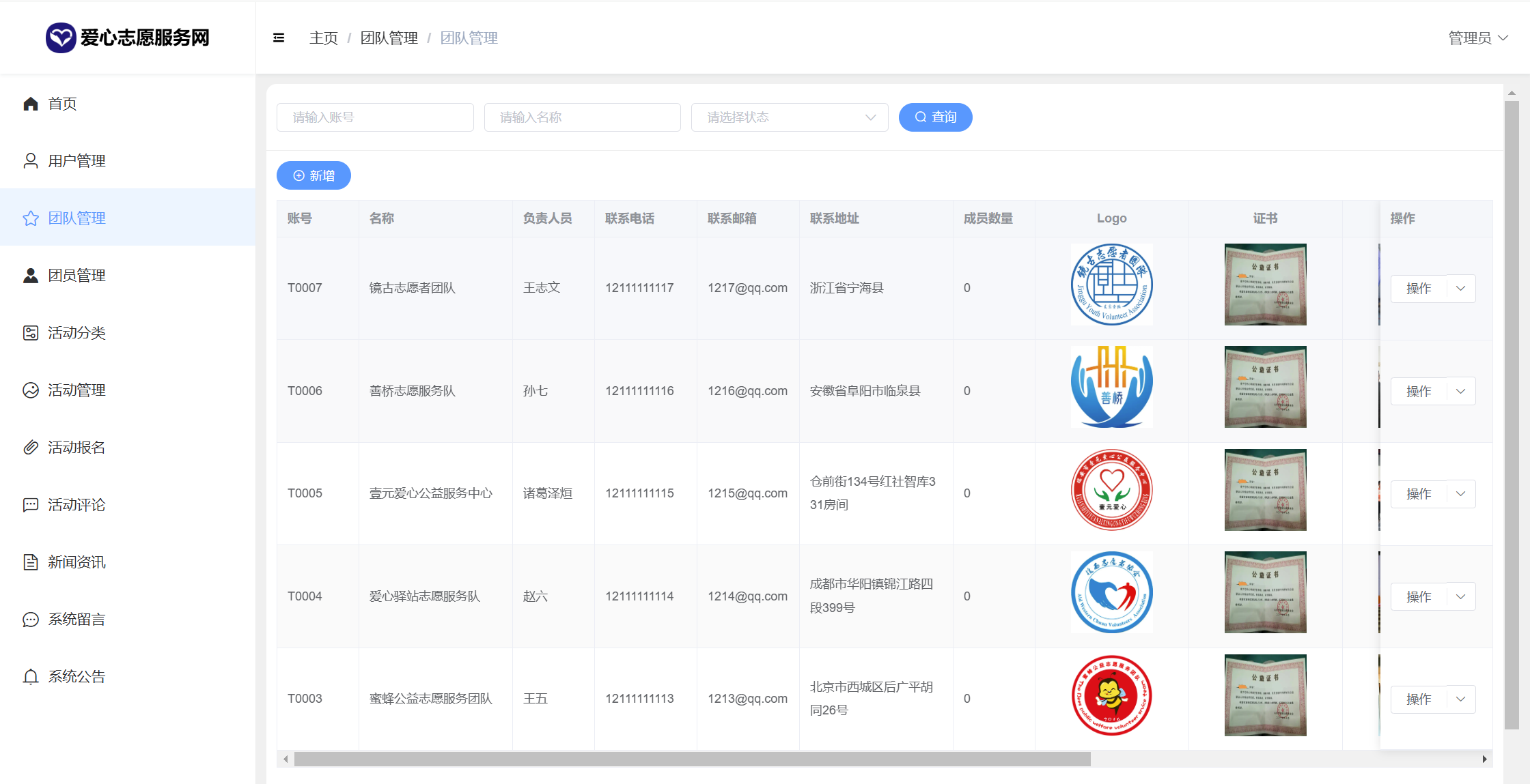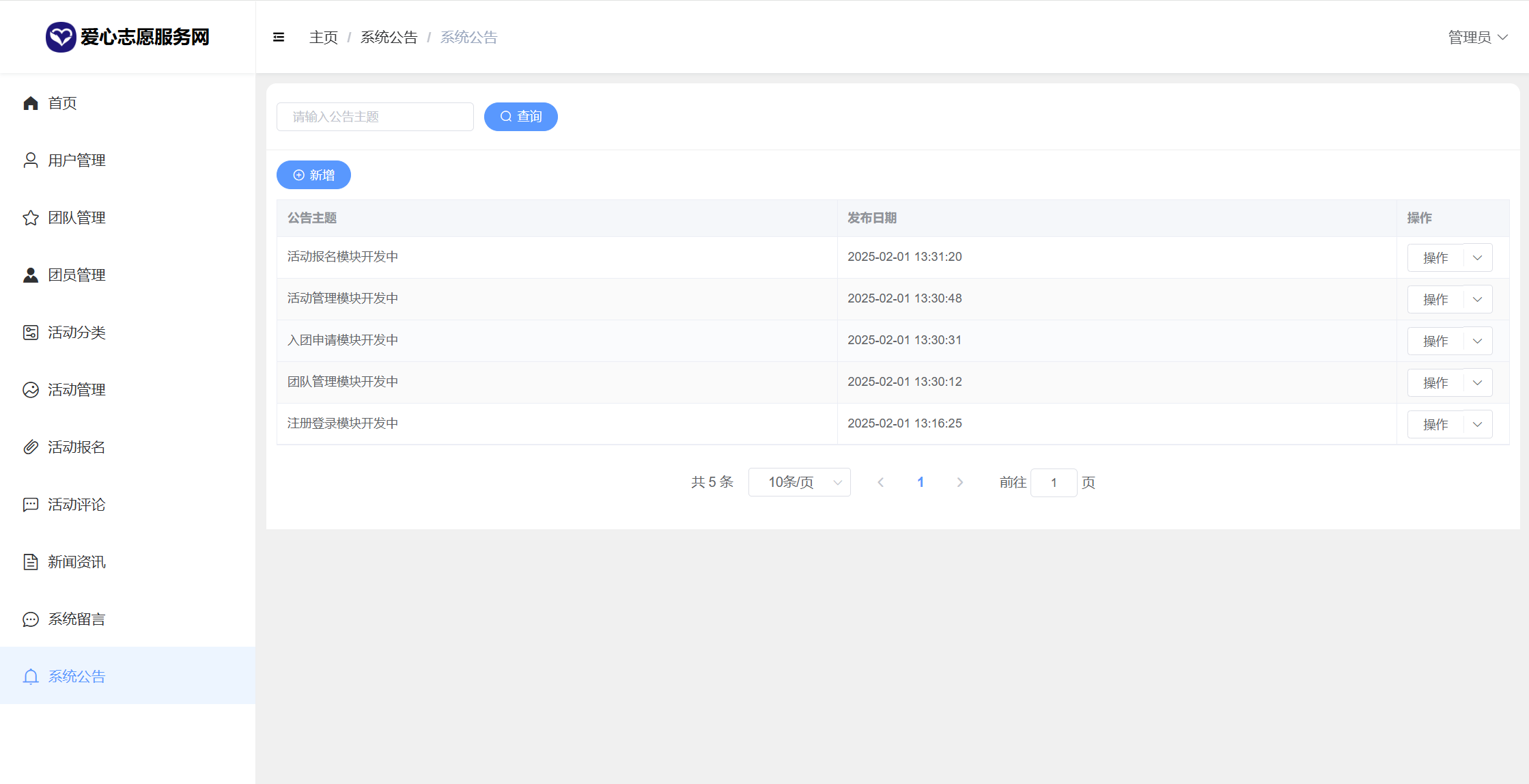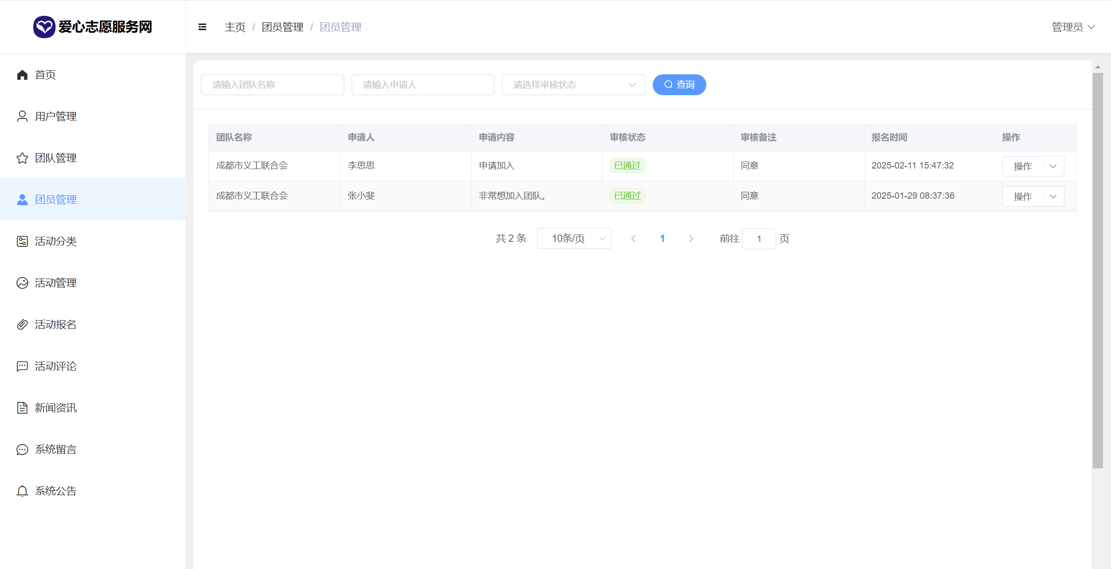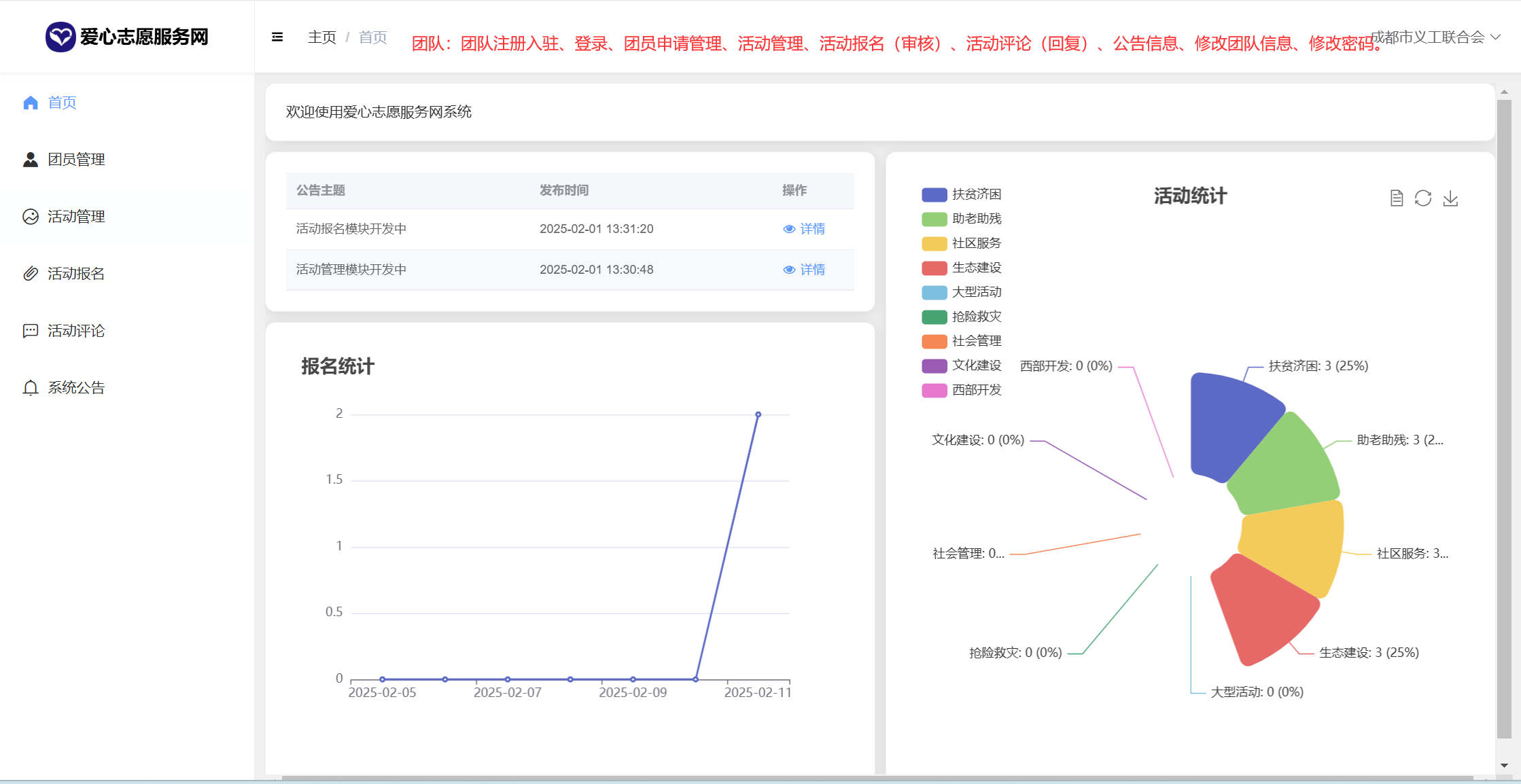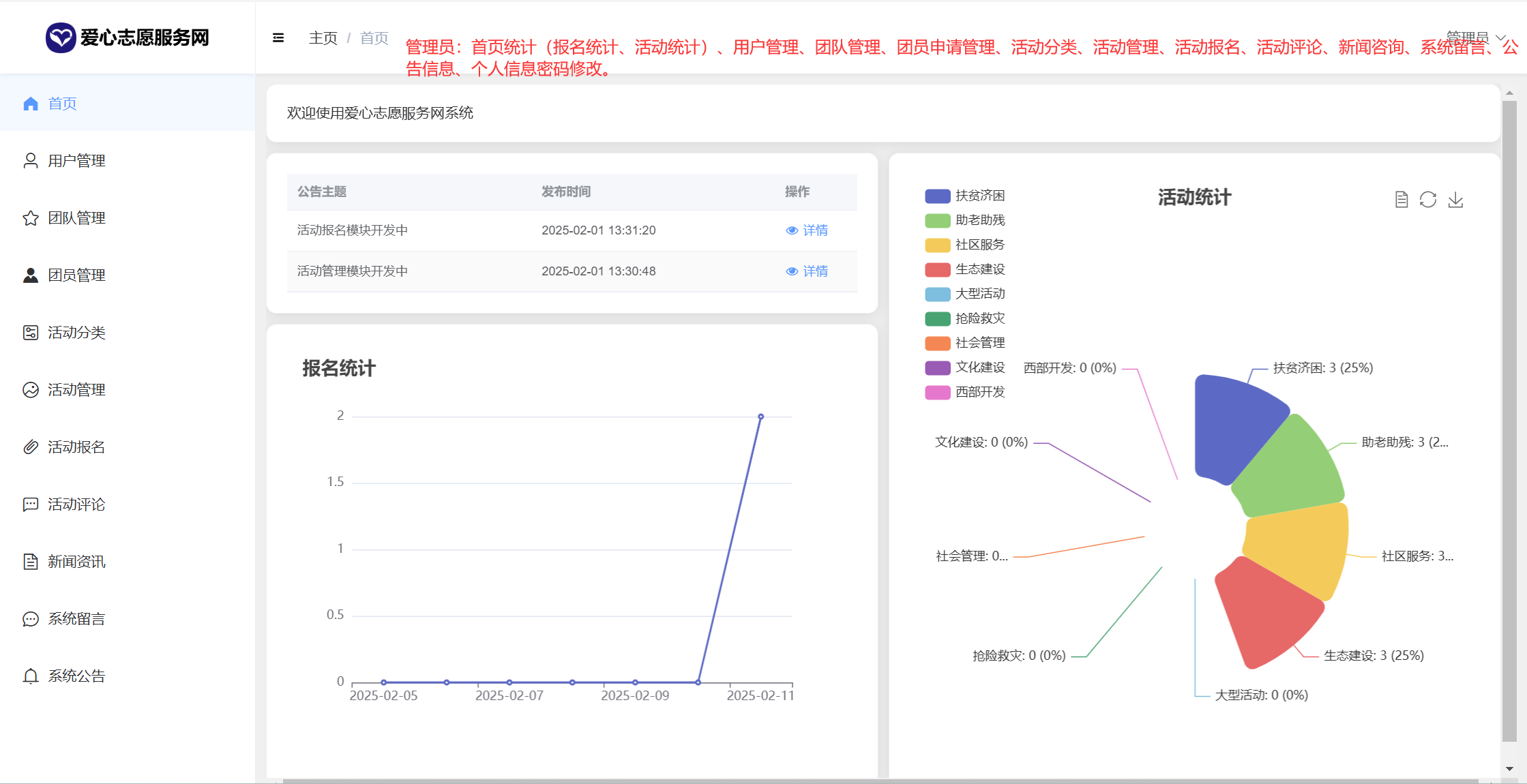 管理员:首页统计(报名统计、活动统计)、用户管理、团队管理、团员申请管理、活动分类、活动管理、活动报名、活动评论、新闻咨询、系统留言、公告信息、个人信息密码修改。