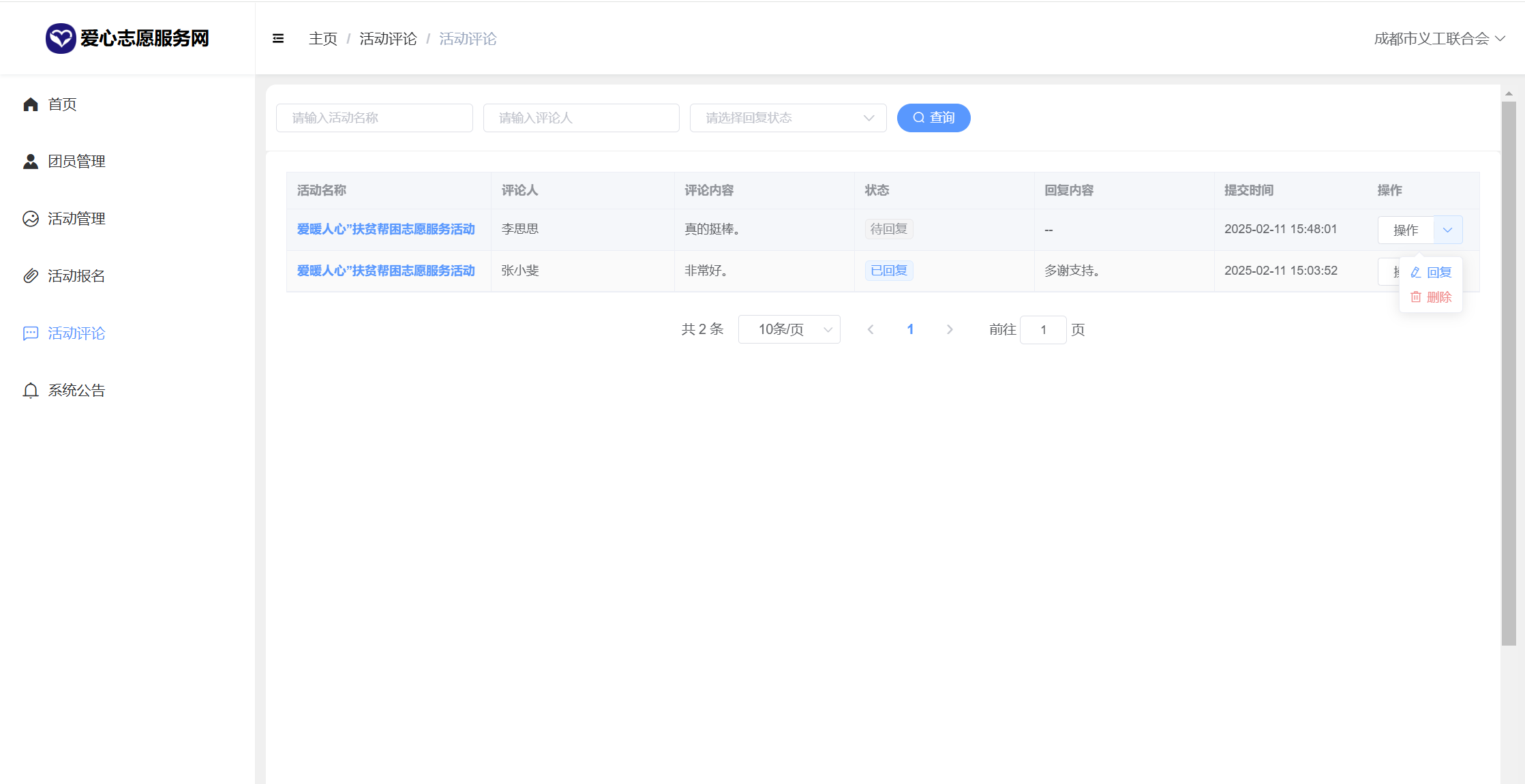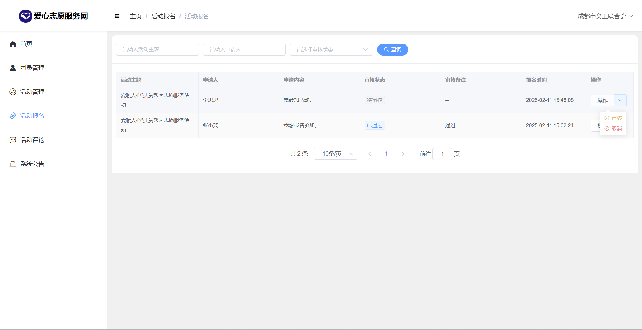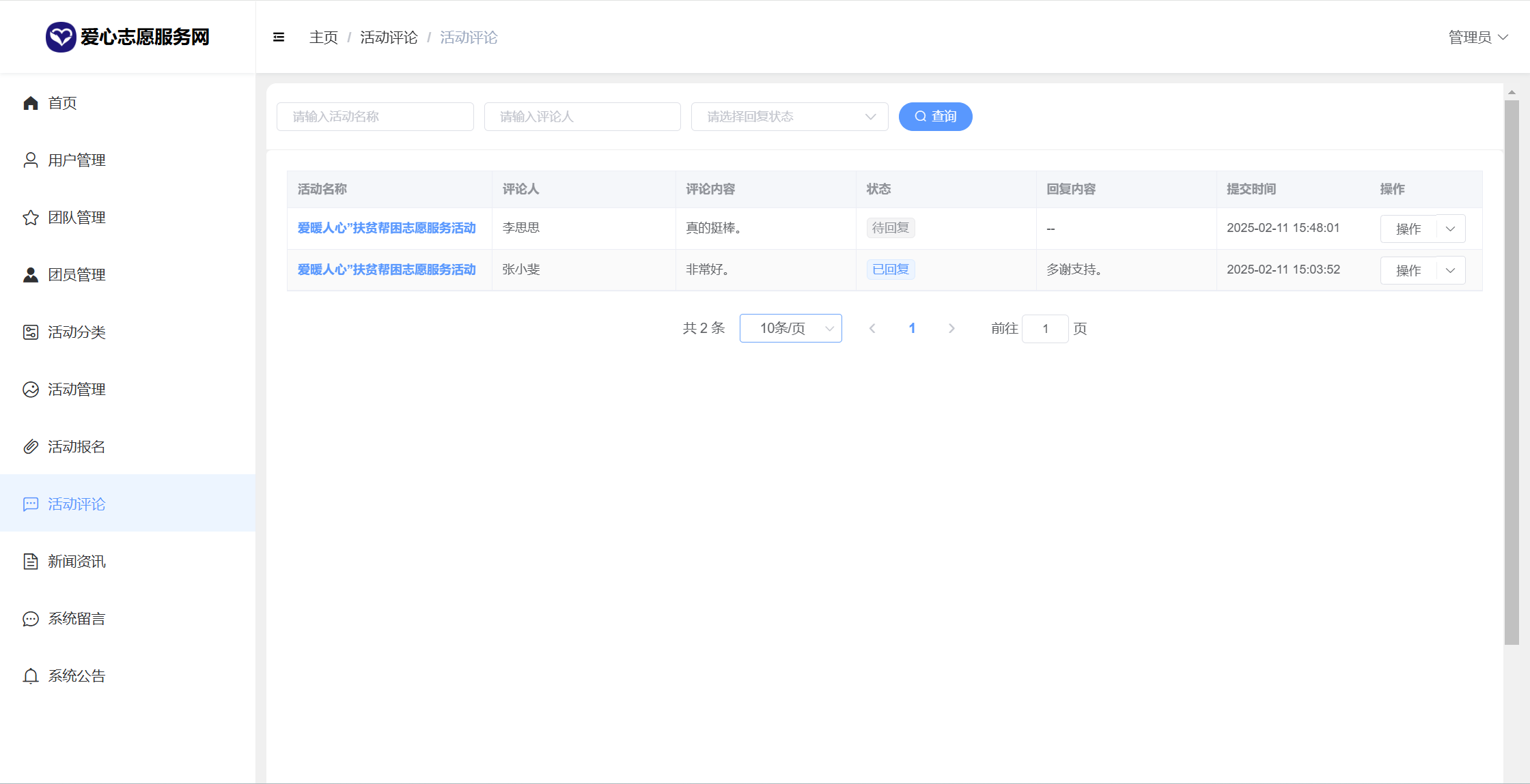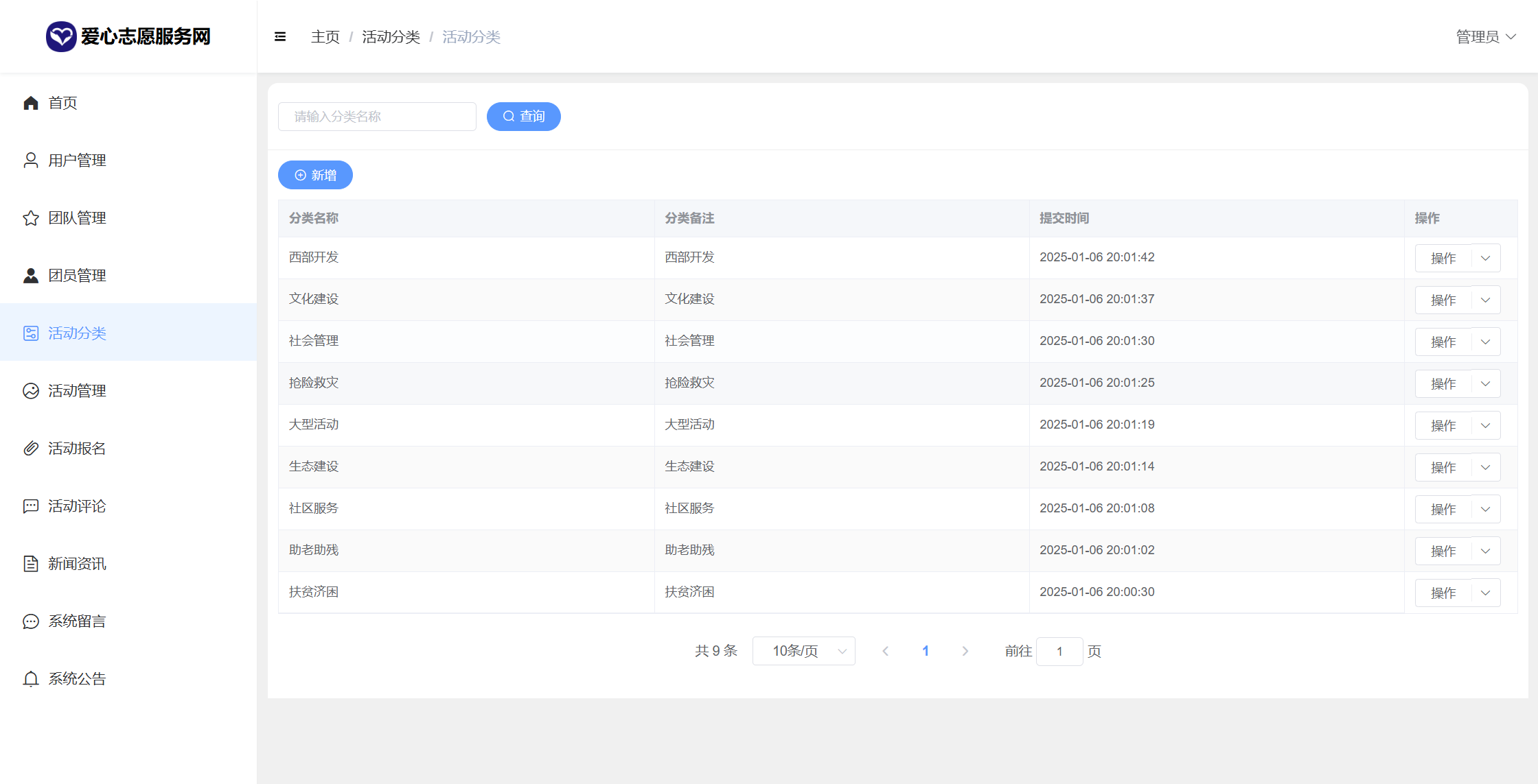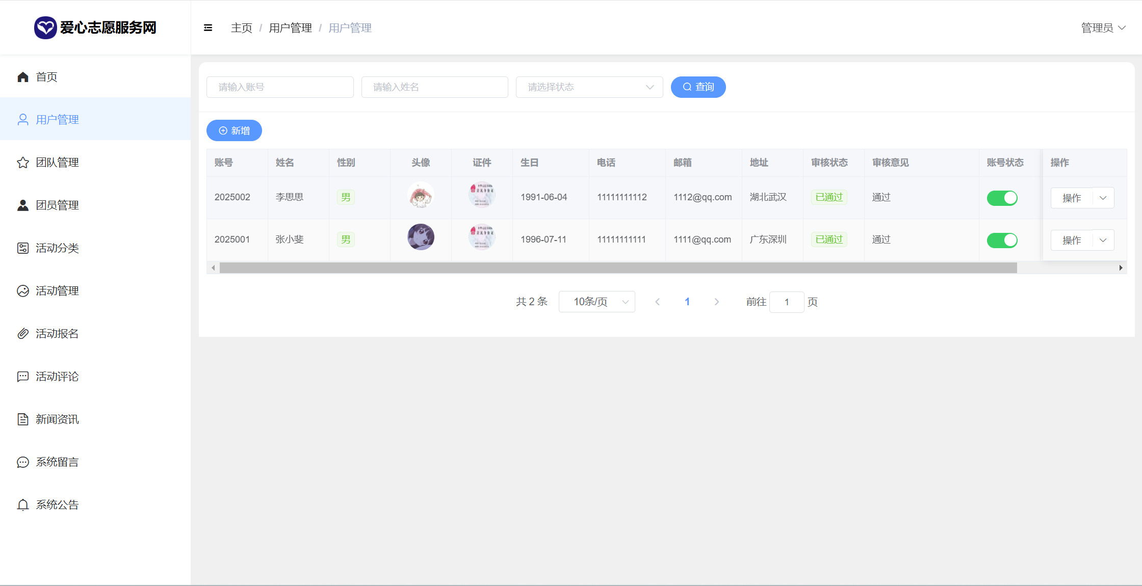 管理员:首页统计(报名统计、活动统计)、用户管理、团队管理、团员申请管理、活动分类、活动管理、活动报名、活动评论、新闻咨询、系统留言、公告信息、个人信息密码修改。
