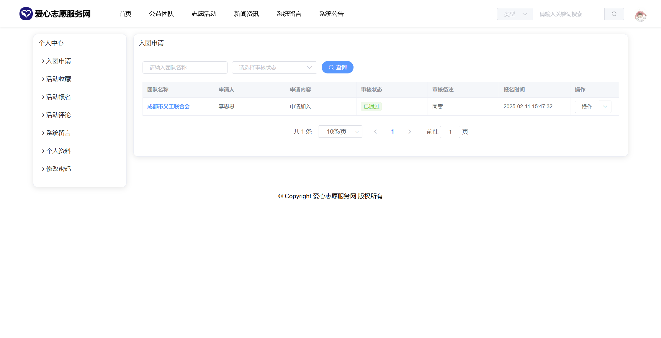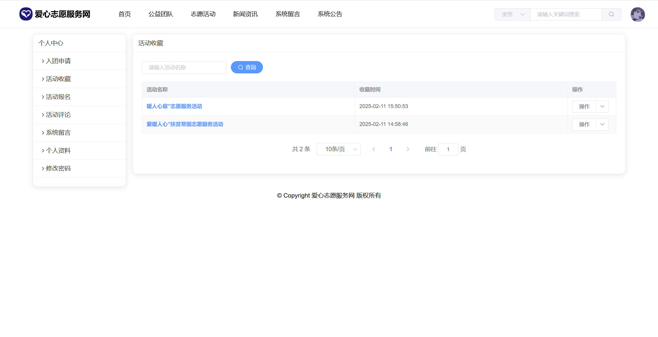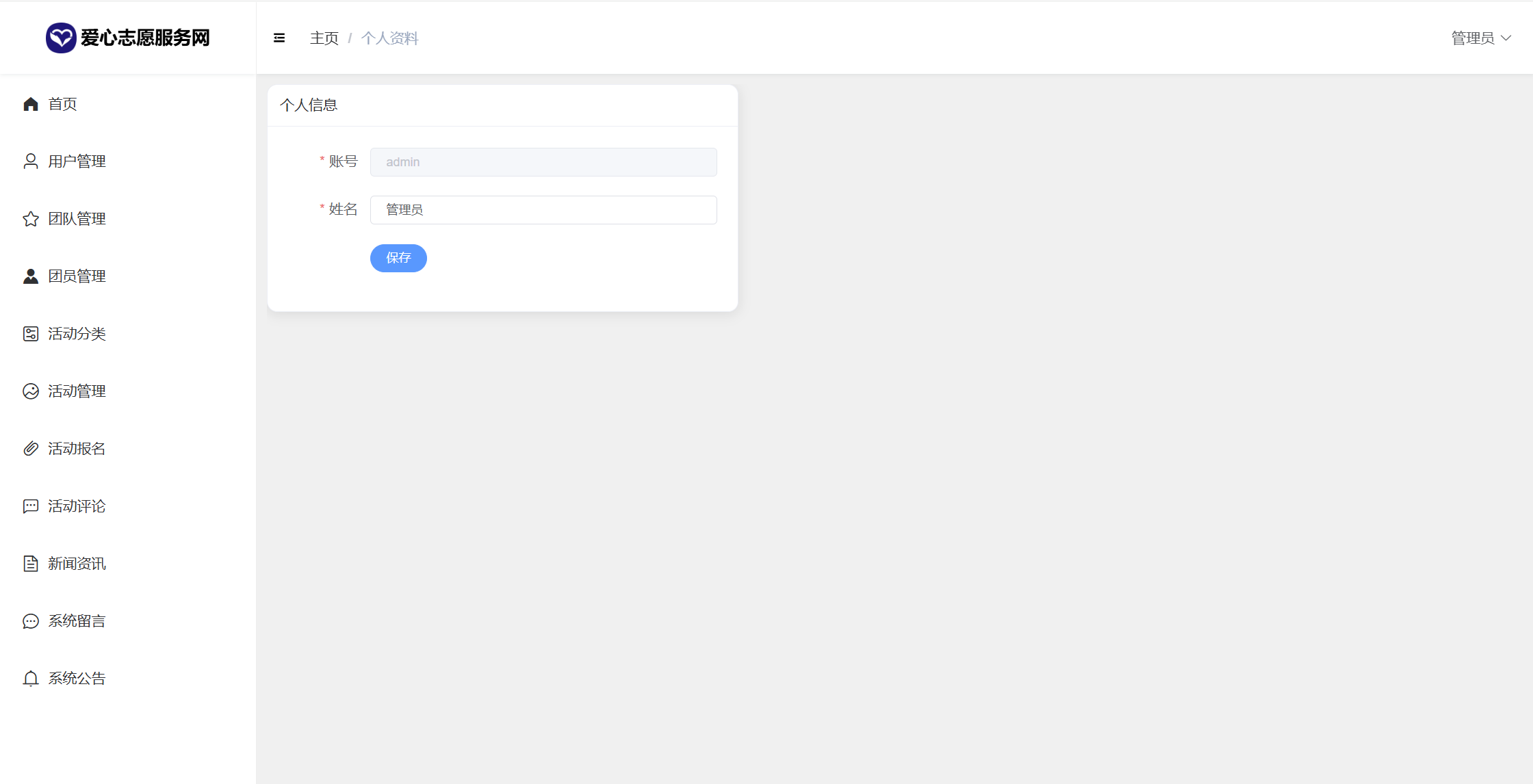 基于SpringBoot+Vue前后端分离的爱心志愿服务网系统,系统包含管理员、团队、用户角色,功能如下: