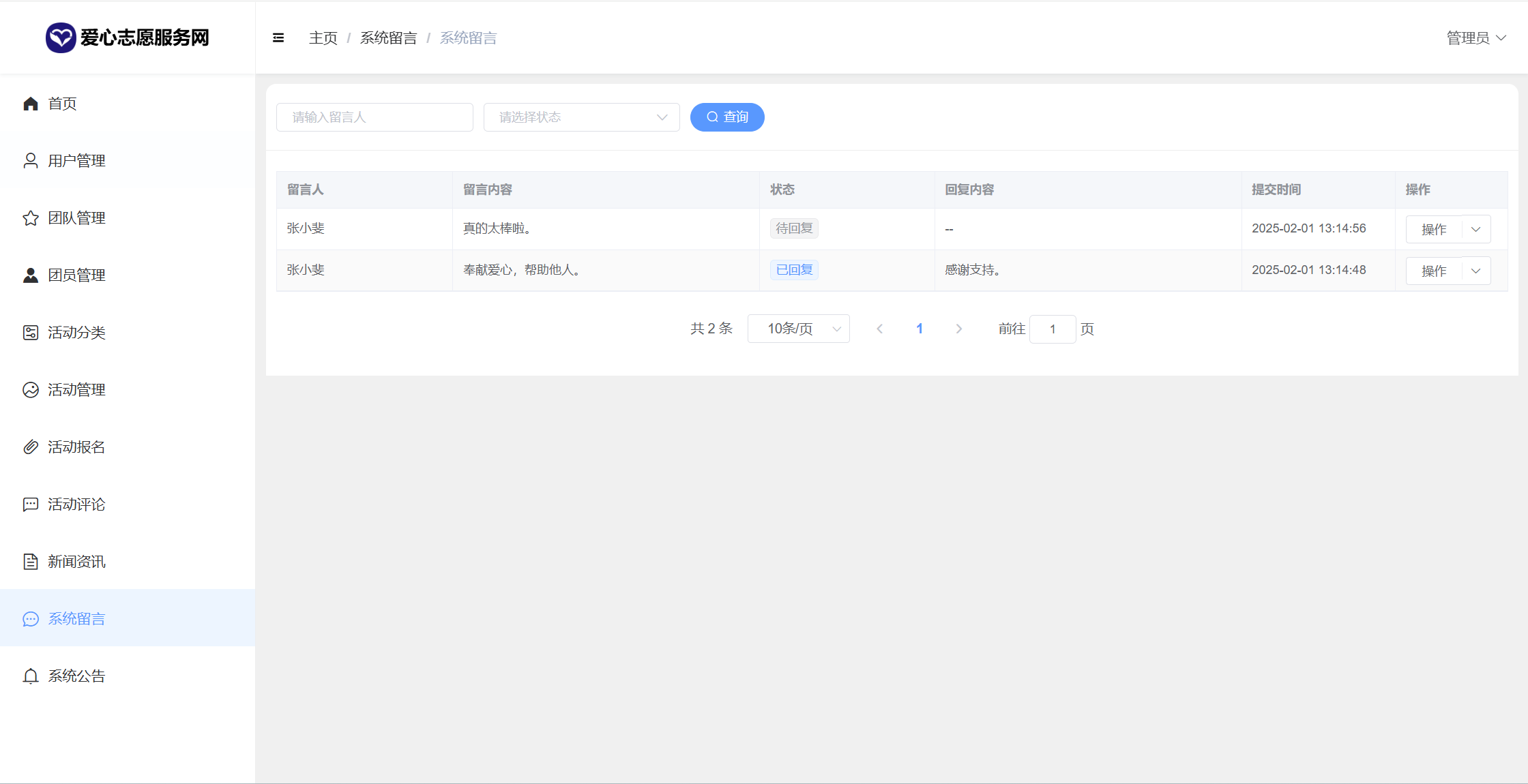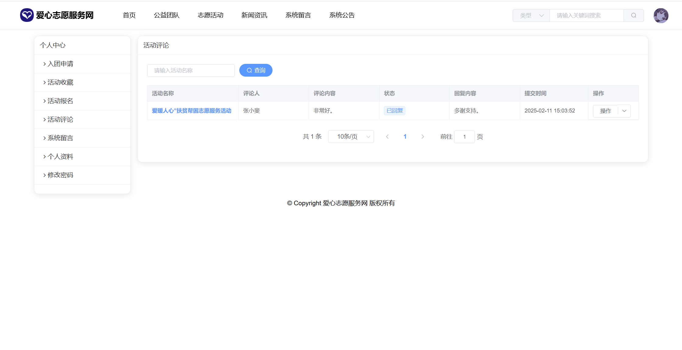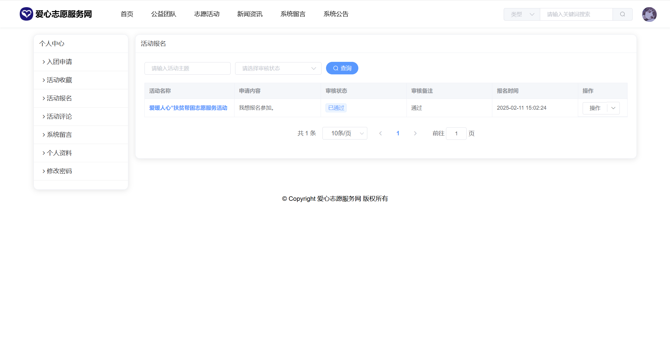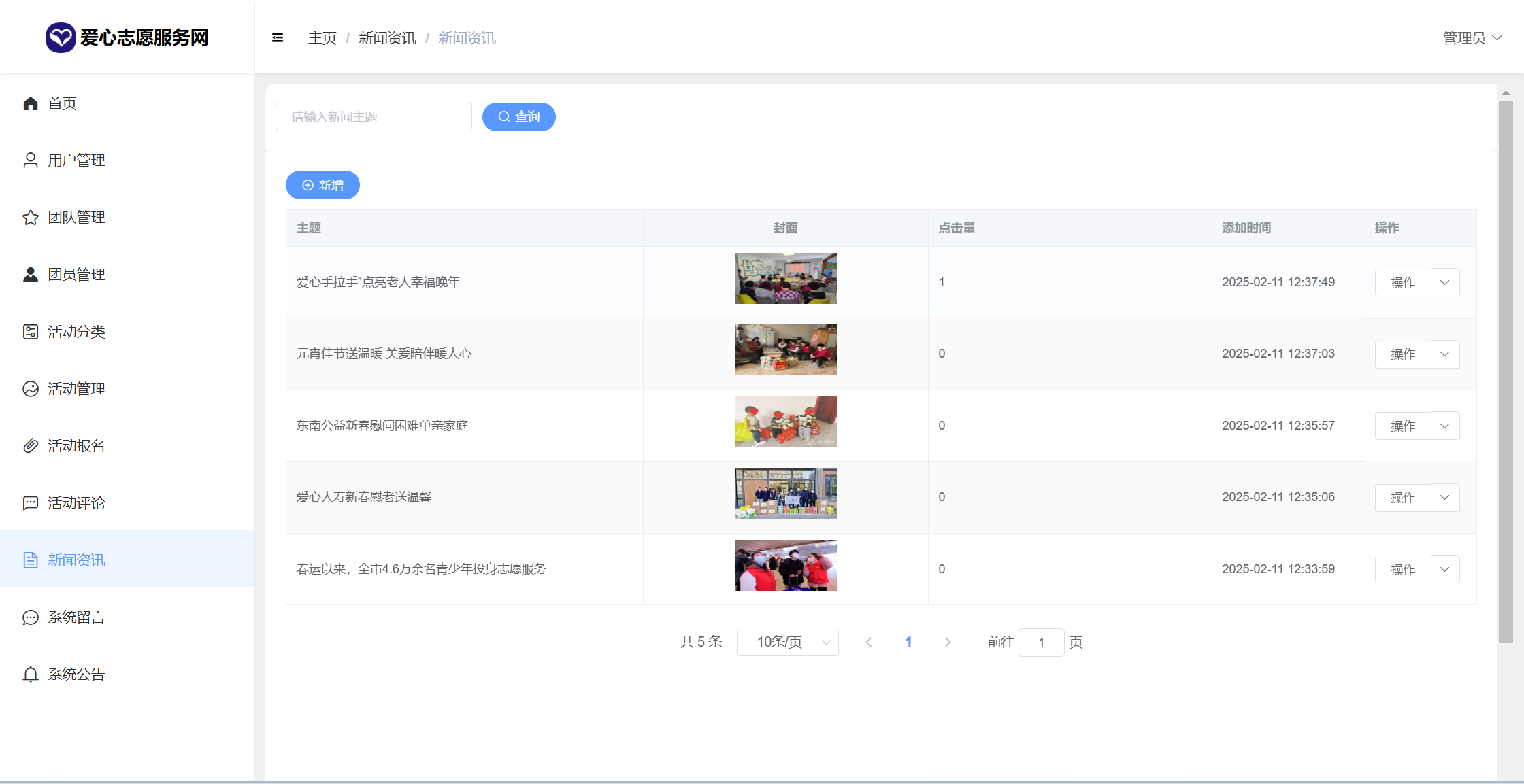 基于SpringBoot+Vue前后端分离的爱心志愿服务网系统,系统包含管理员、团队、用户角色,功能如下: