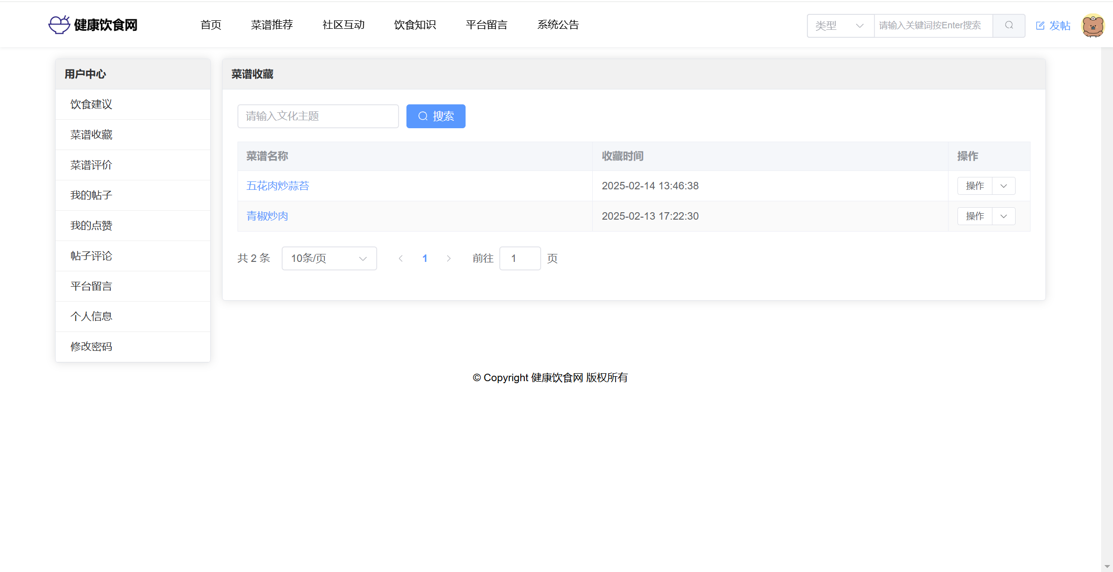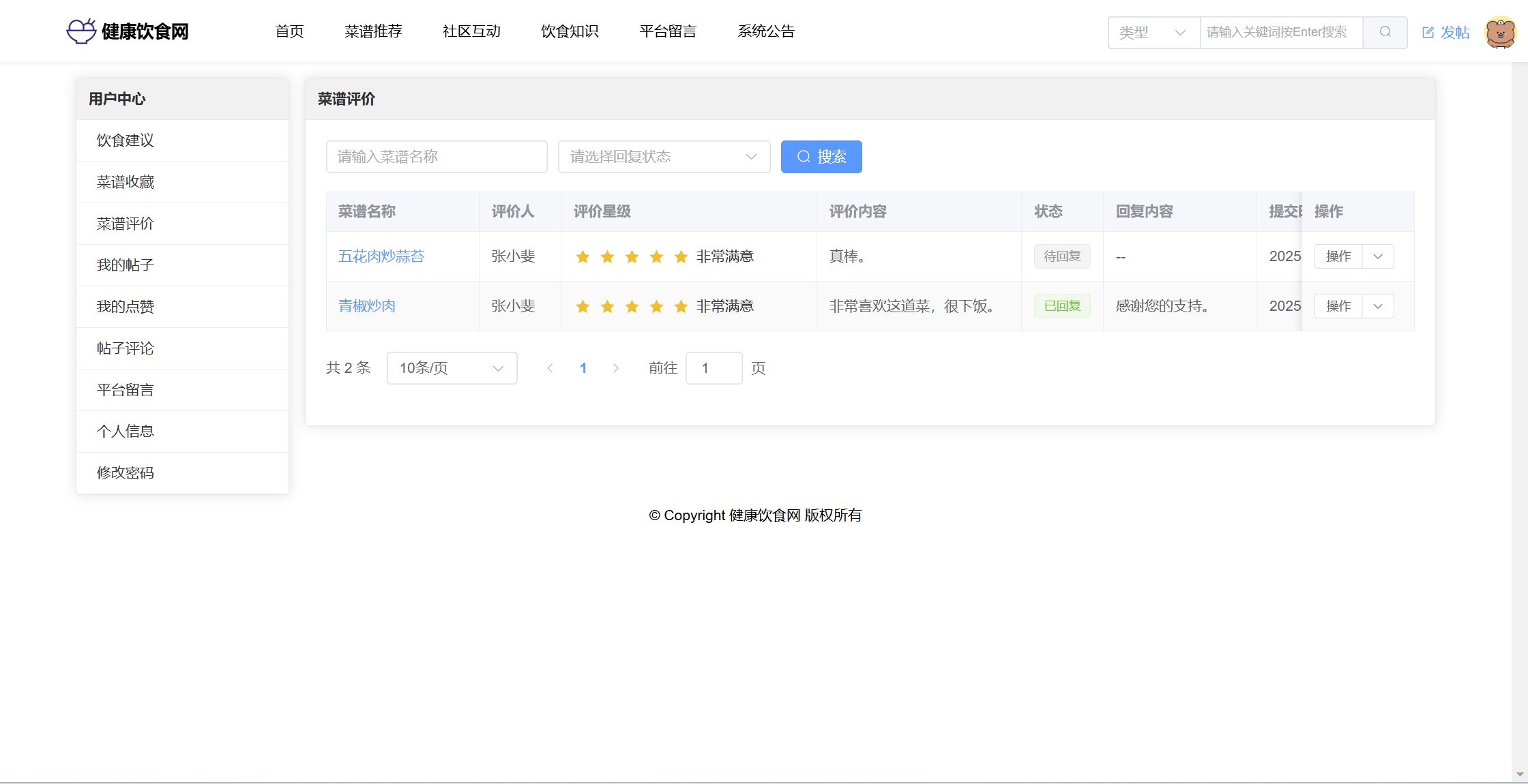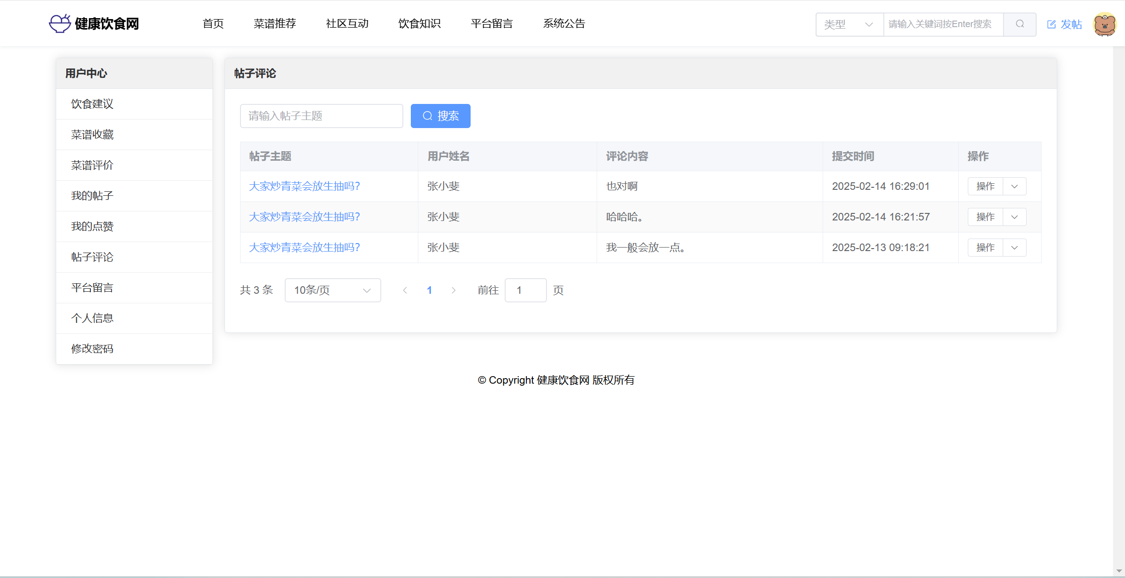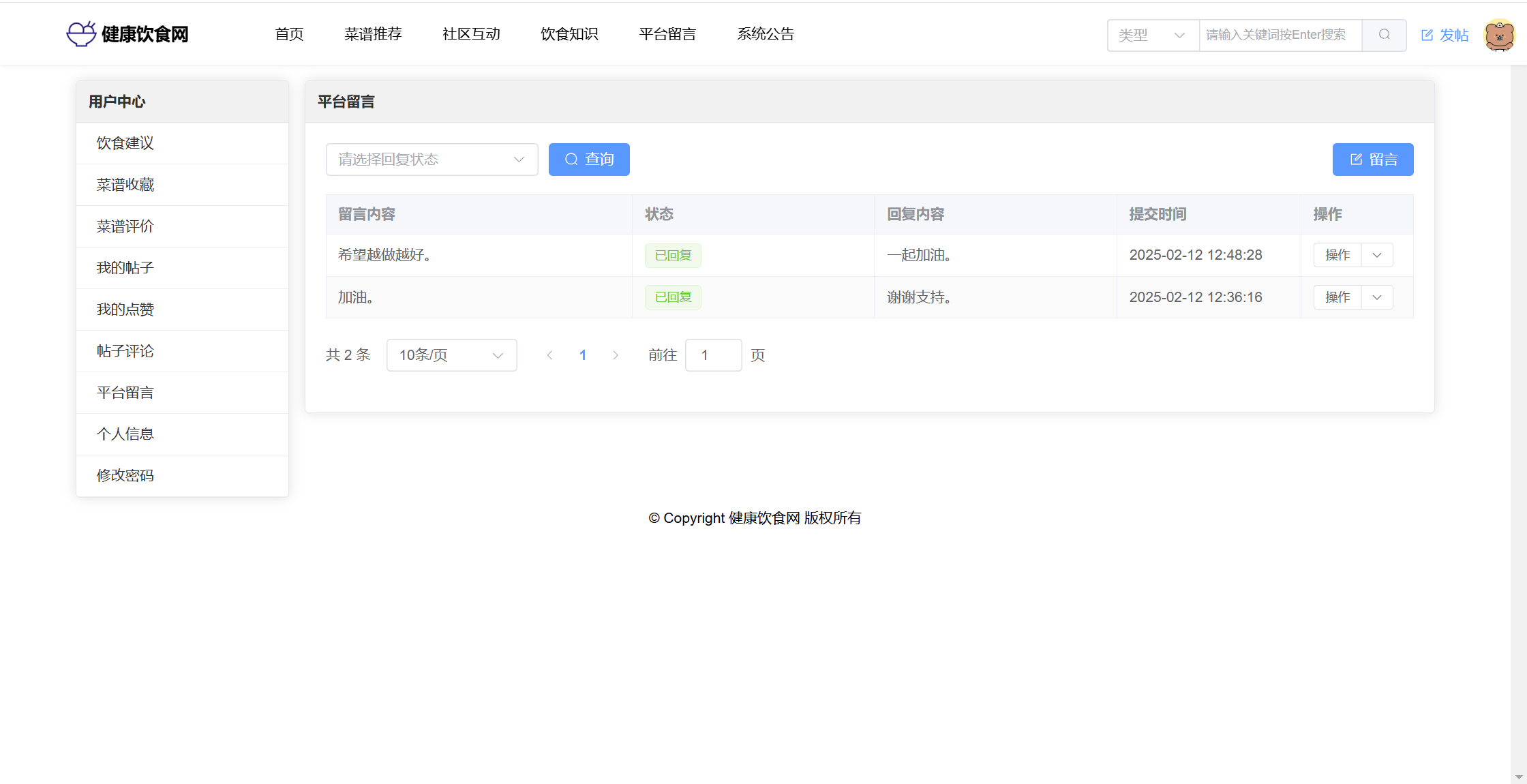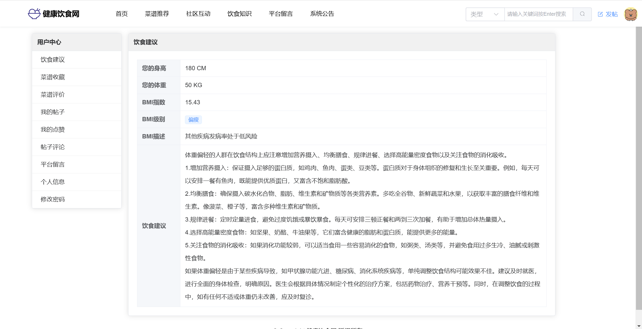 用户:注册、登录、首页、菜谱推荐(菜谱详情、收藏、食材、评价)、社区互动(版块、帖子列表、帖子详情、点赞、评论)、饮食知识、平台留言、系统公告。用户还具有个人中心功能,功能包括:饮食建议、菜谱收藏、菜谱评价、我的帖子、我的点赞、帖子评论、平台留言、个人信息、密码修改。