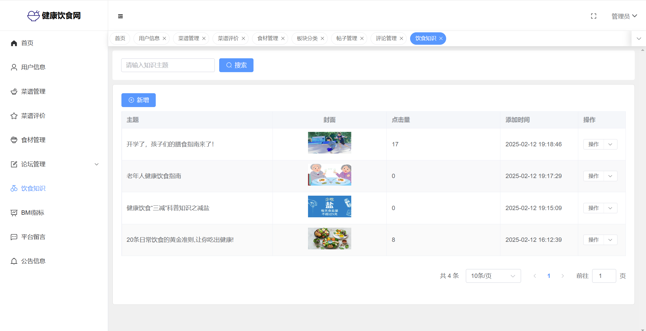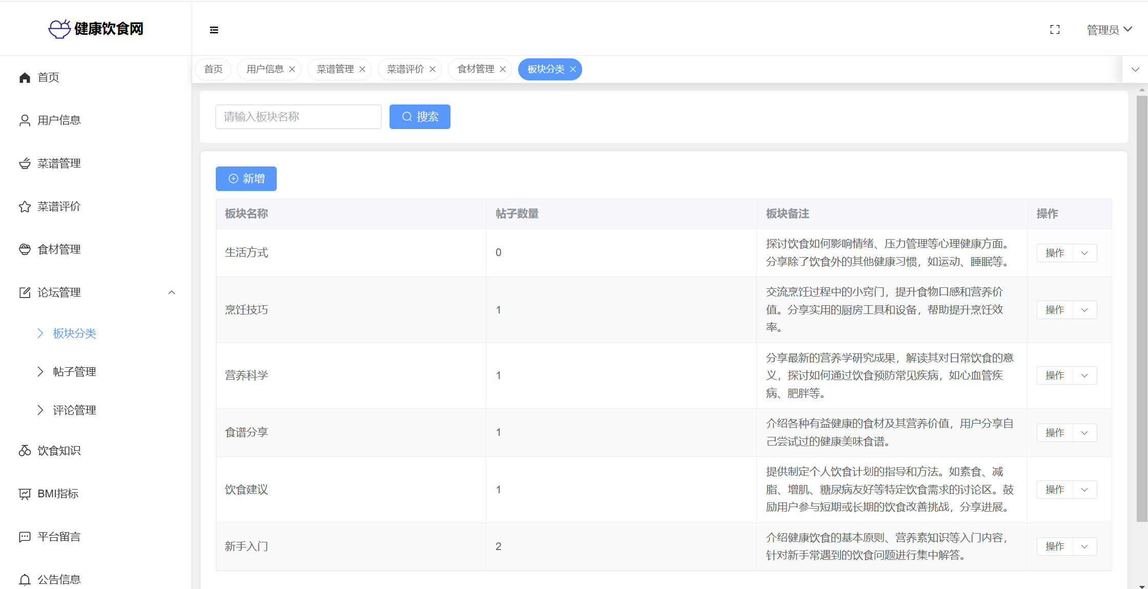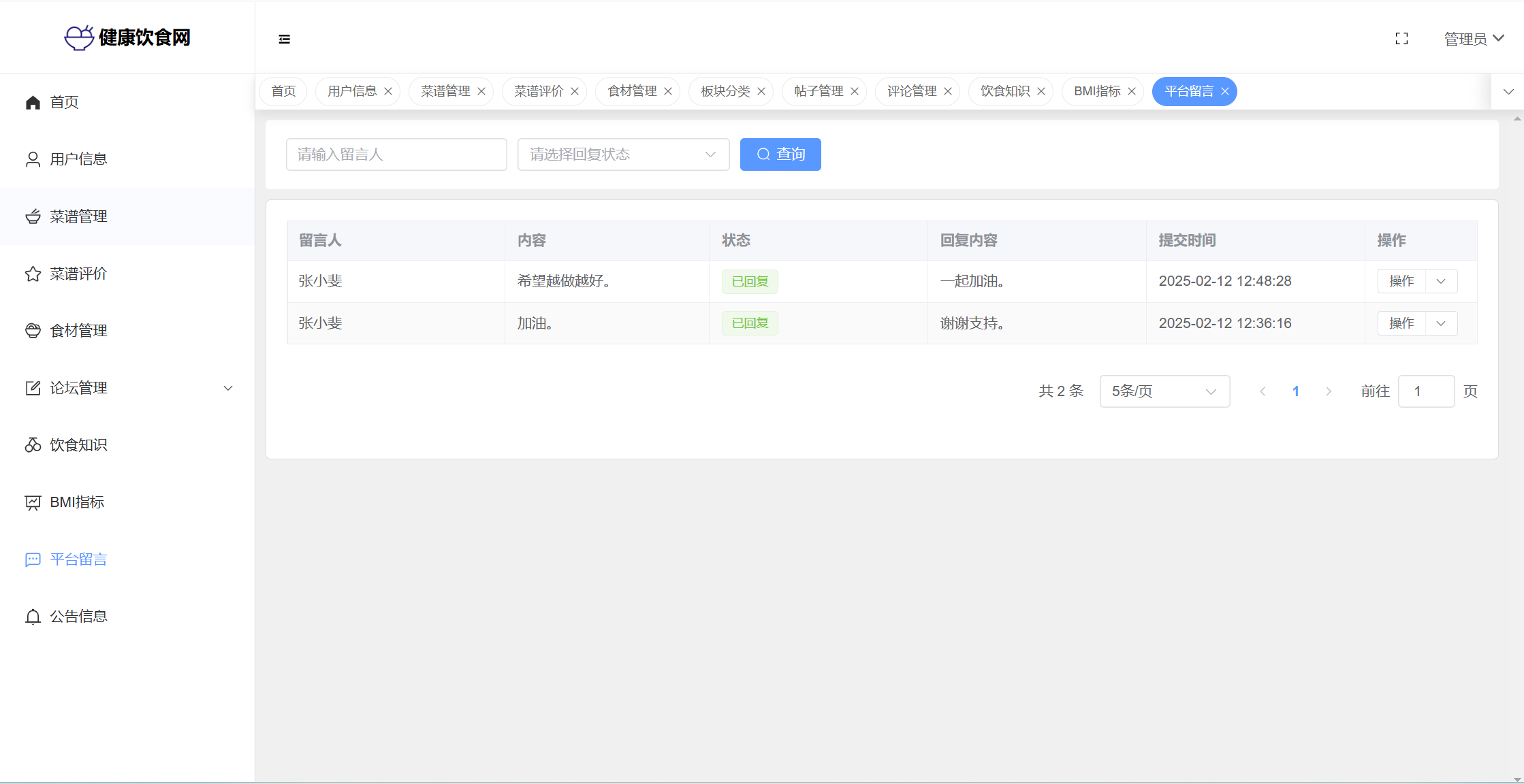 管理员:首页统计(帖子统计、注册人数统计)、用户管理、菜谱管理(菜谱食材管理)、菜谱评价、食材管理、论坛管理(版块管理、帖子管理、评论管理)、饮食知识、BMI指标、平台留言、公告信息、个人信息密码修改。