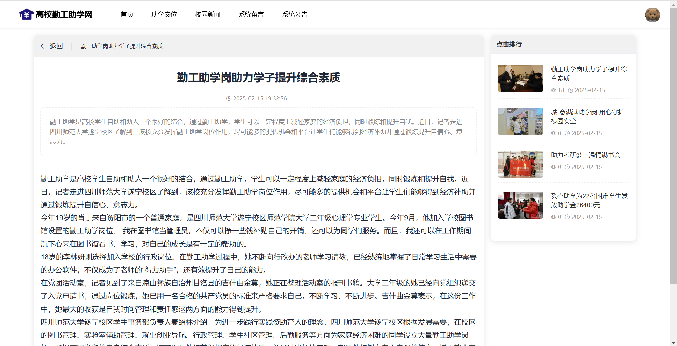 学生:注册、登录系统;首页;助学岗位(岗位详情、申请岗位);校园新闻;系统留言;公告信息。