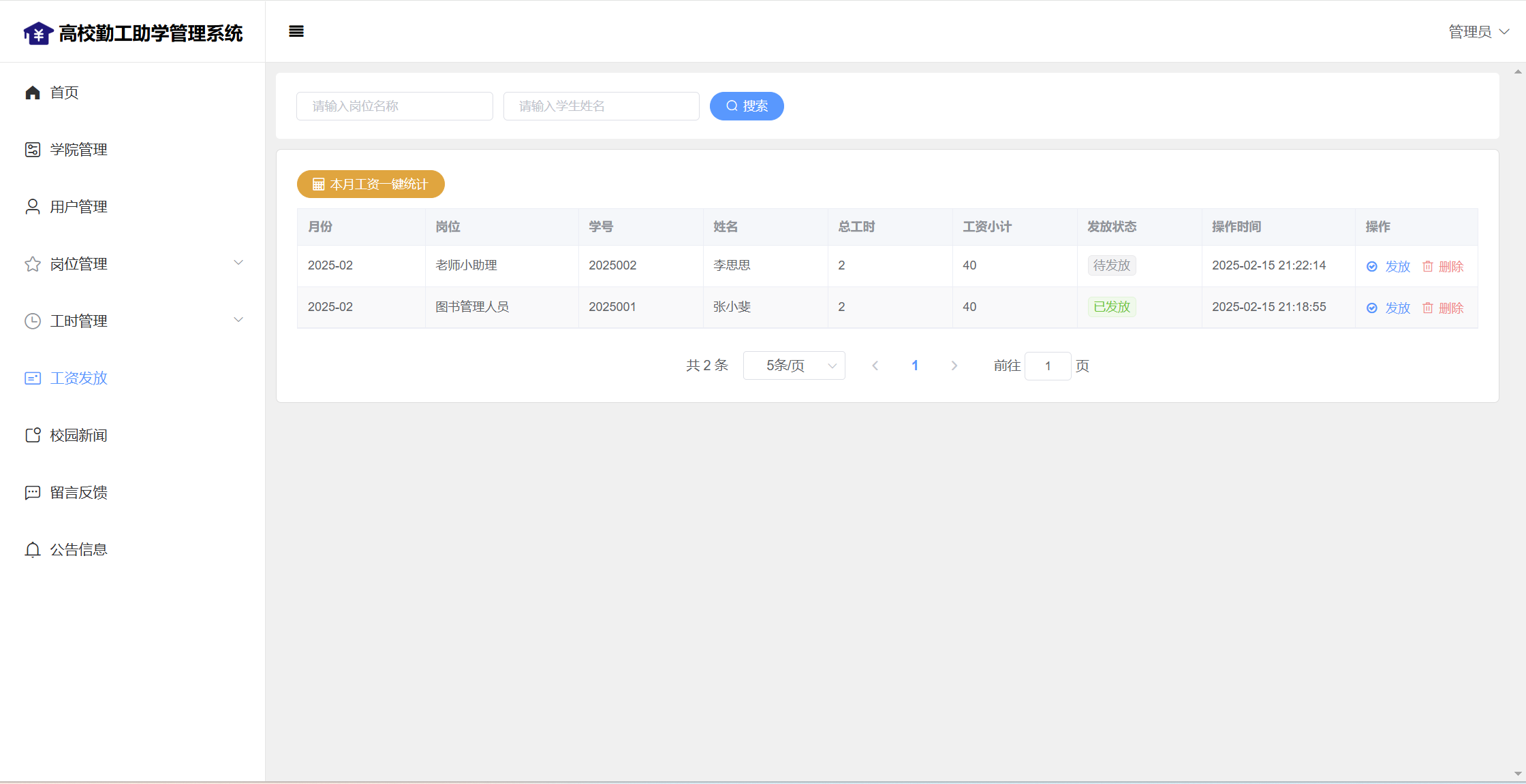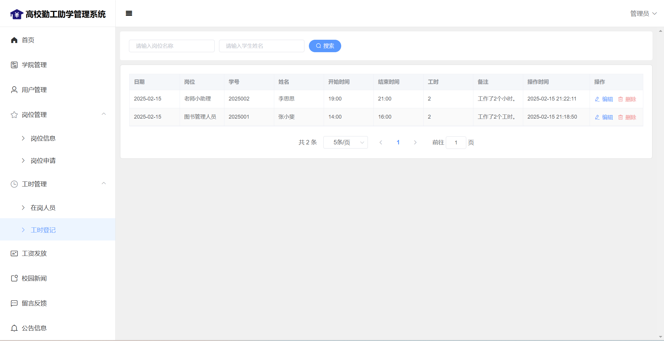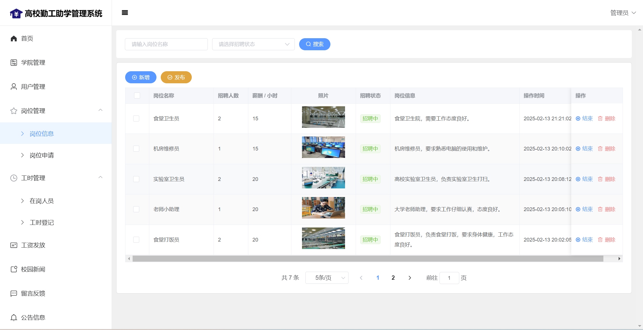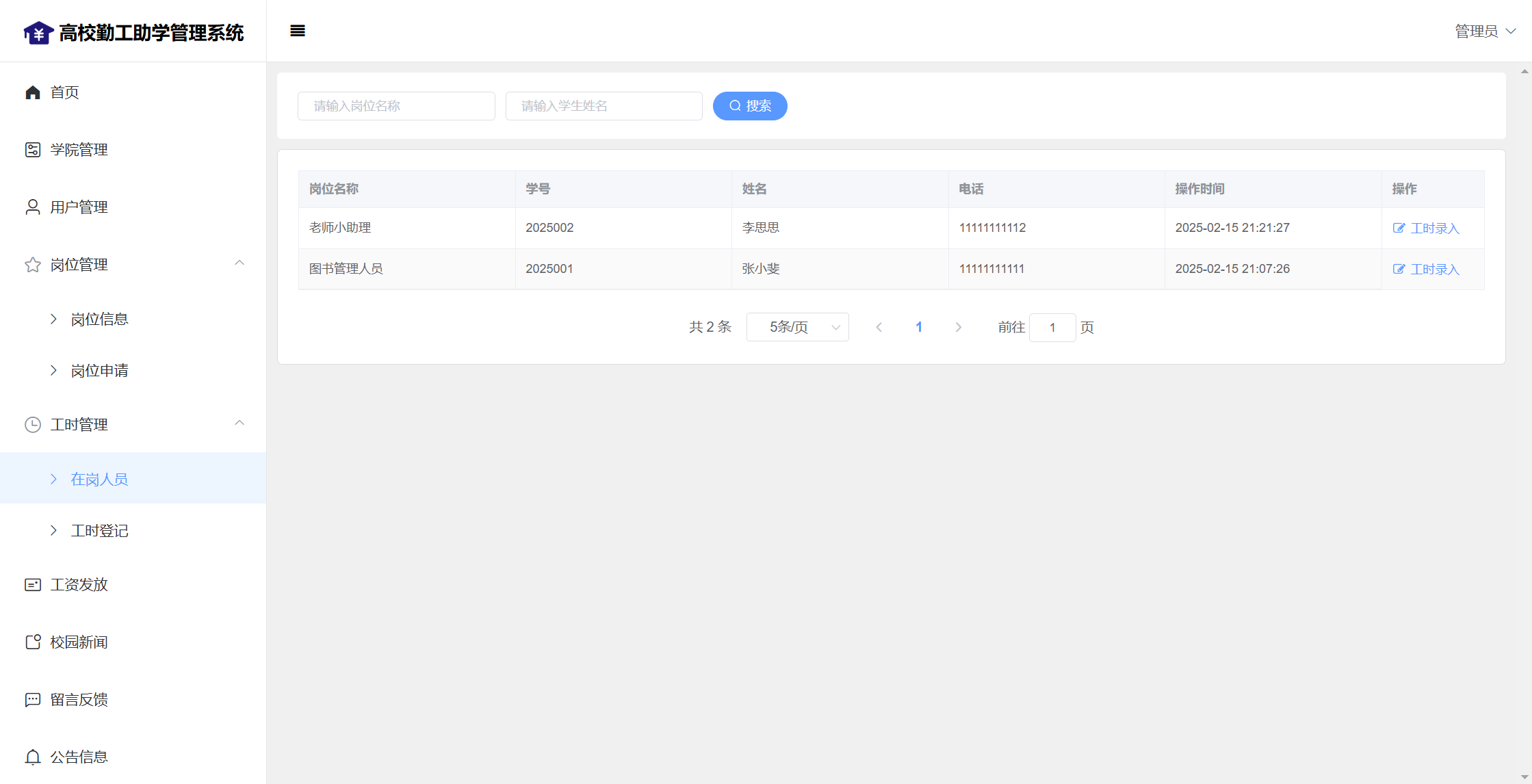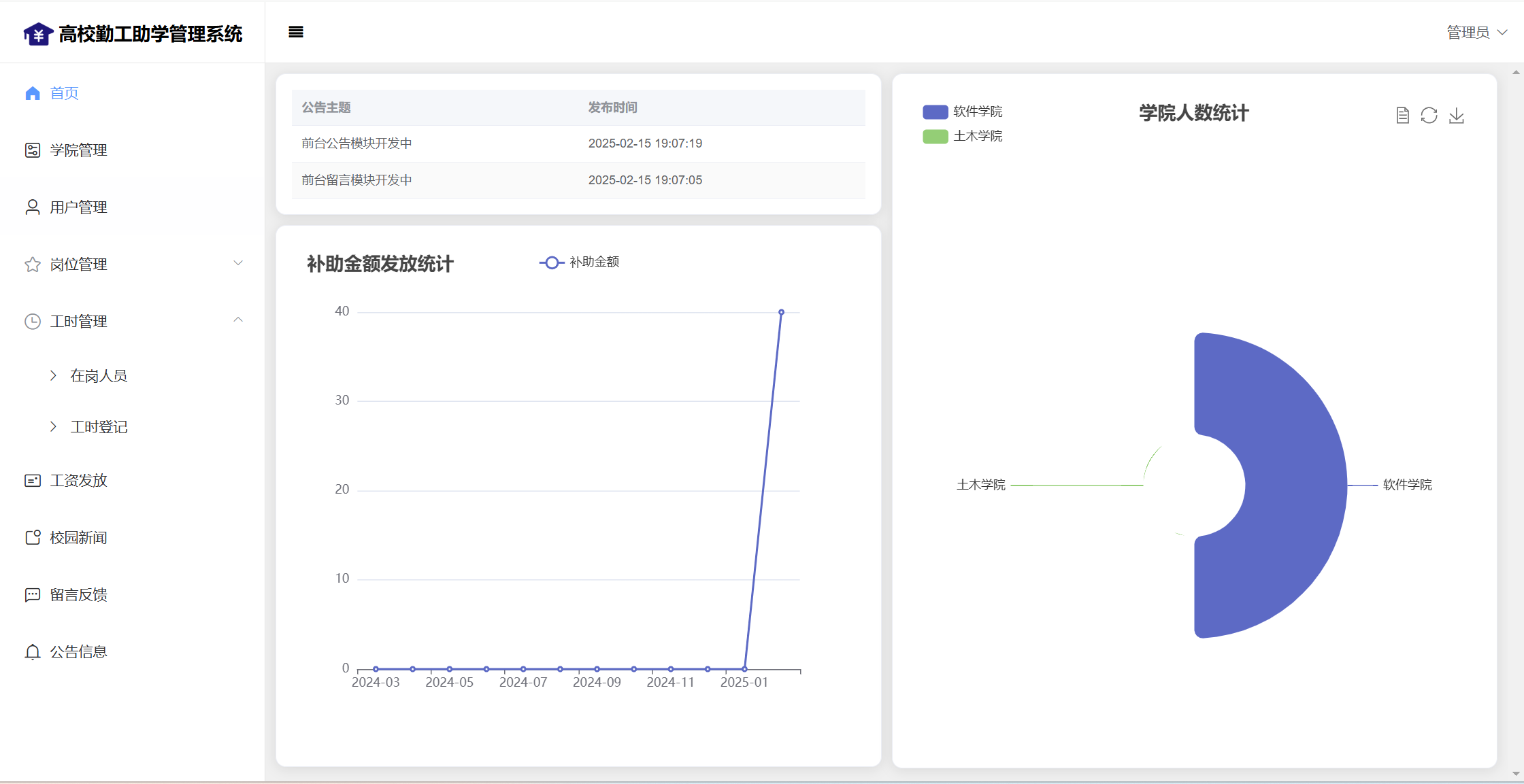 管理员:首页统计(补助金额发放统计、学院人员统计);学院管理;用户管理;岗位管理(岗位信息、岗位申请);工时管理(在岗人员、工时管理)、工资发放;校园新闻管理;留言管理;公告信息;个人信息;密码修改;