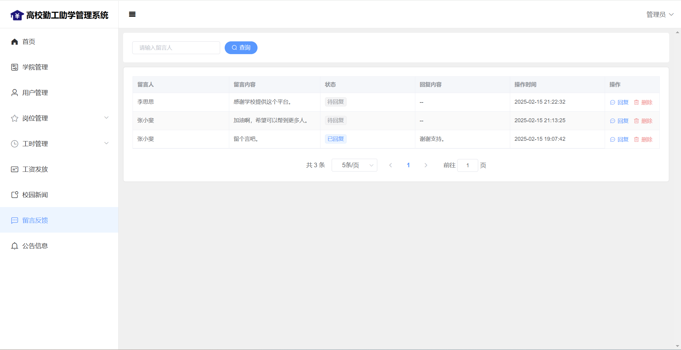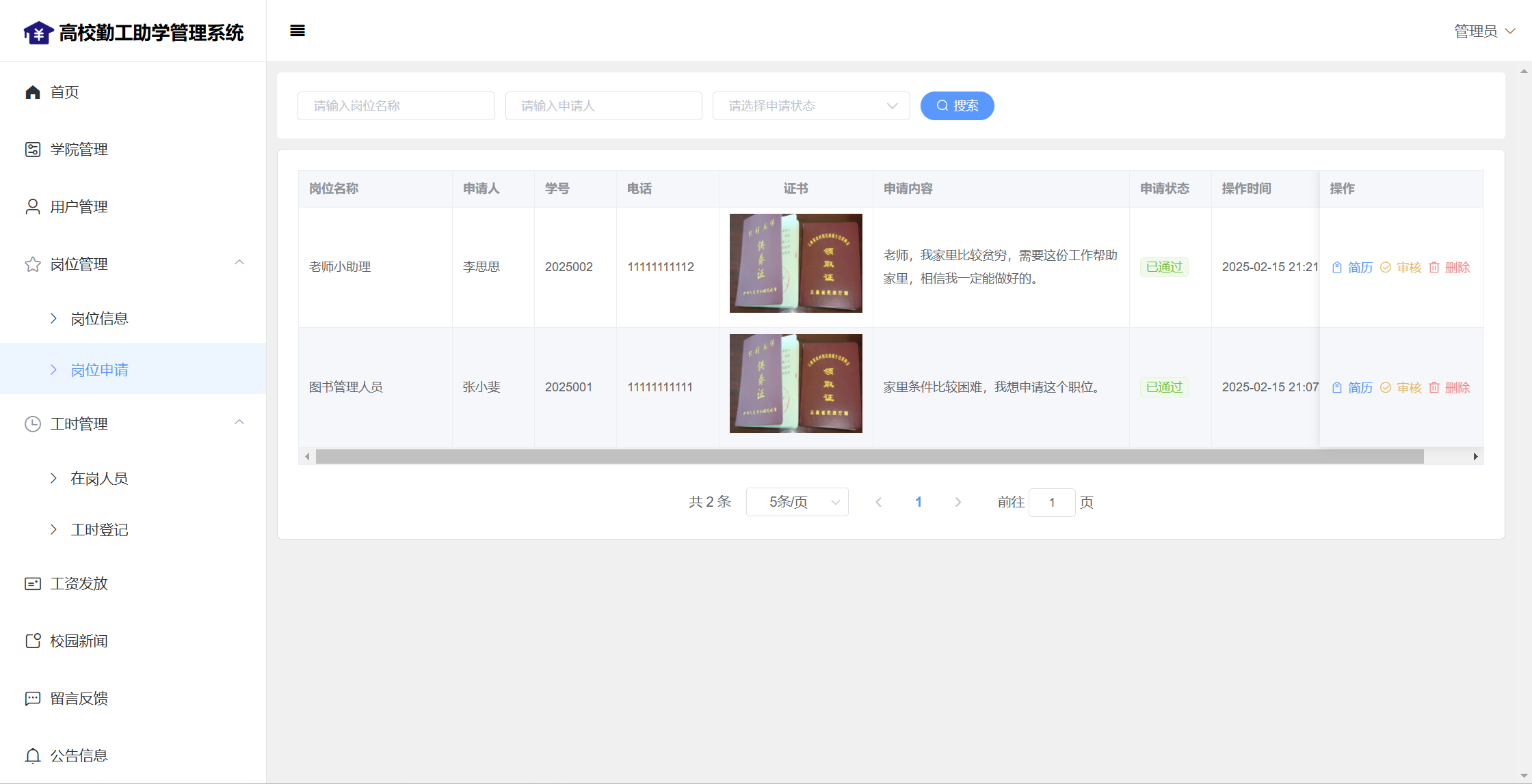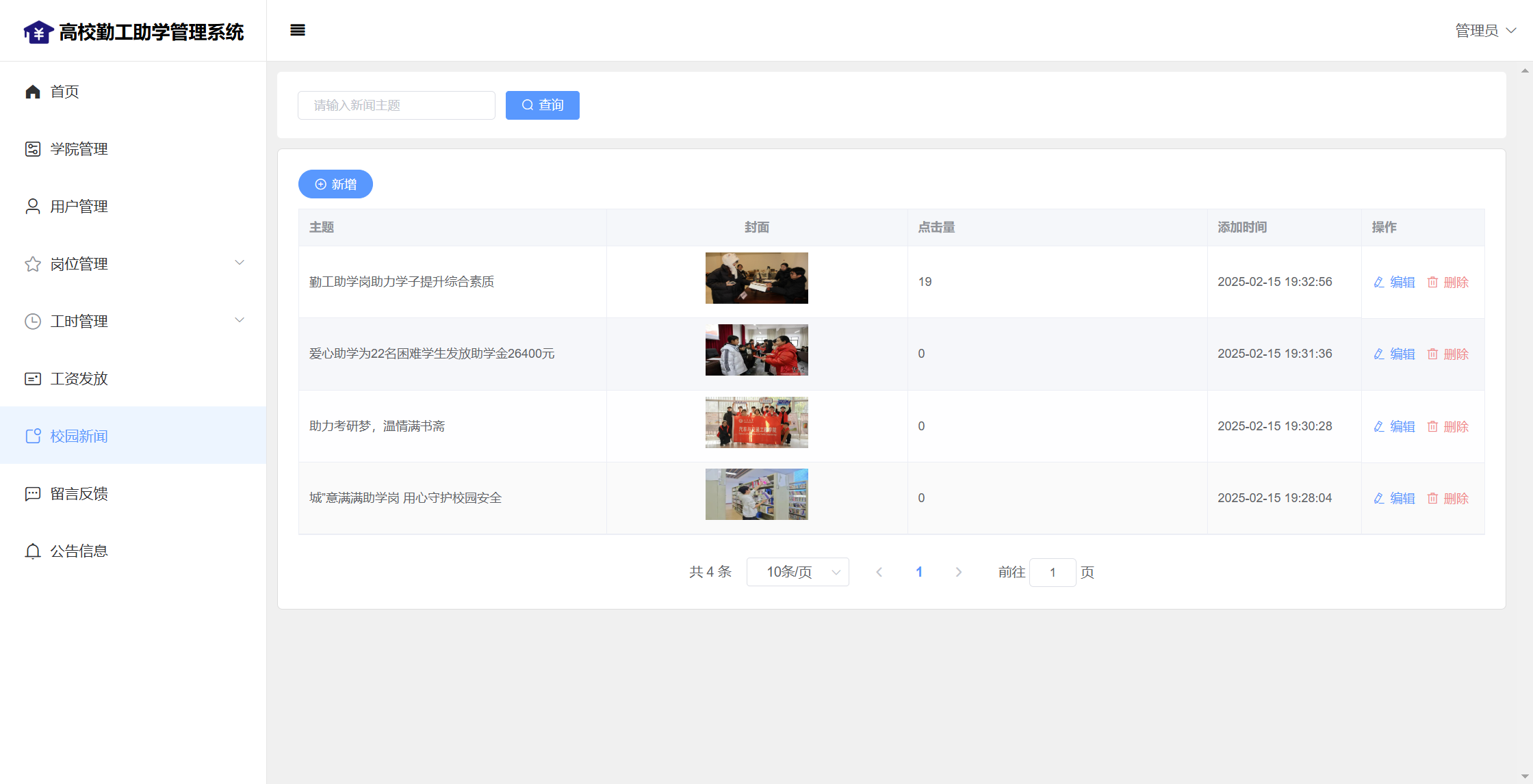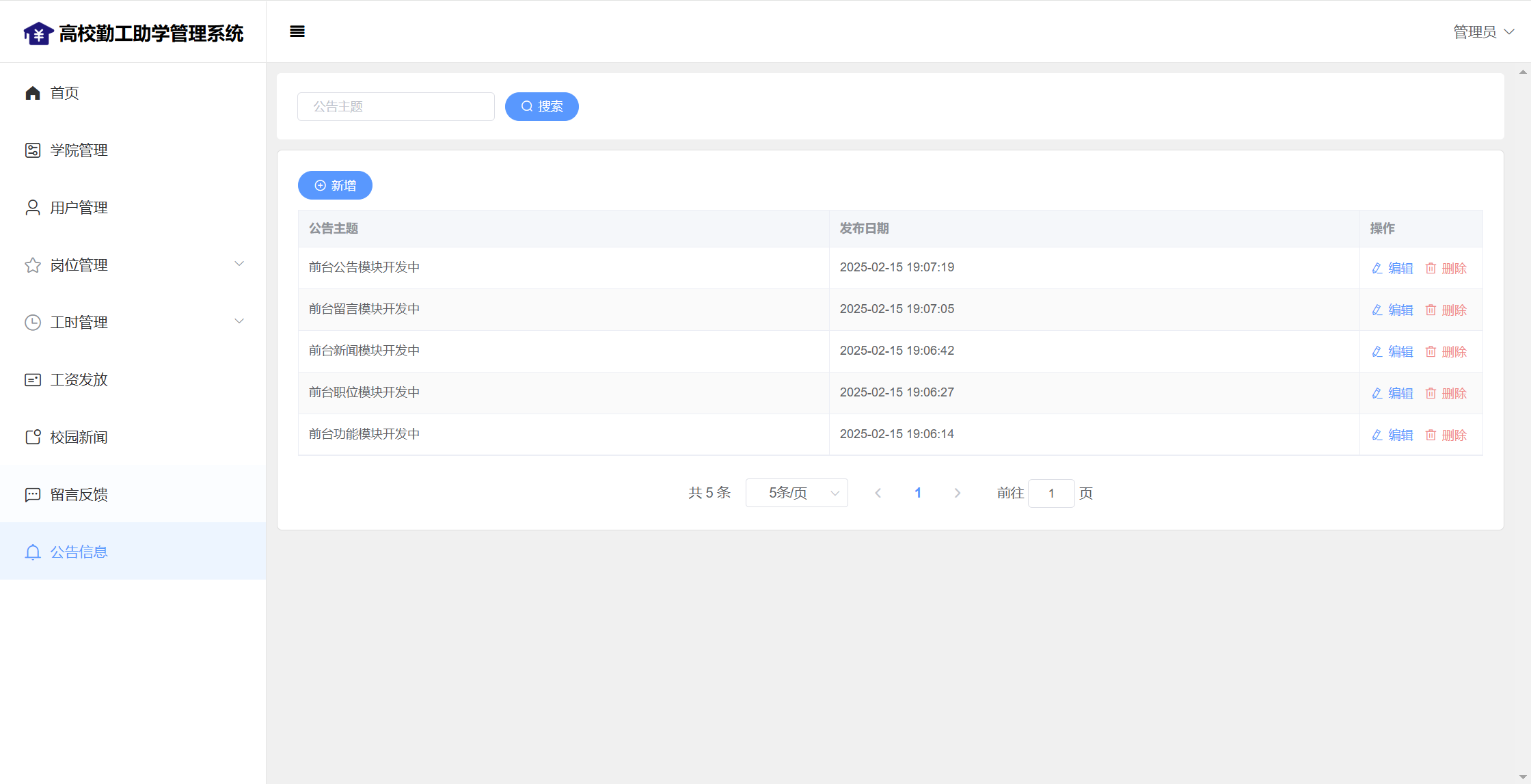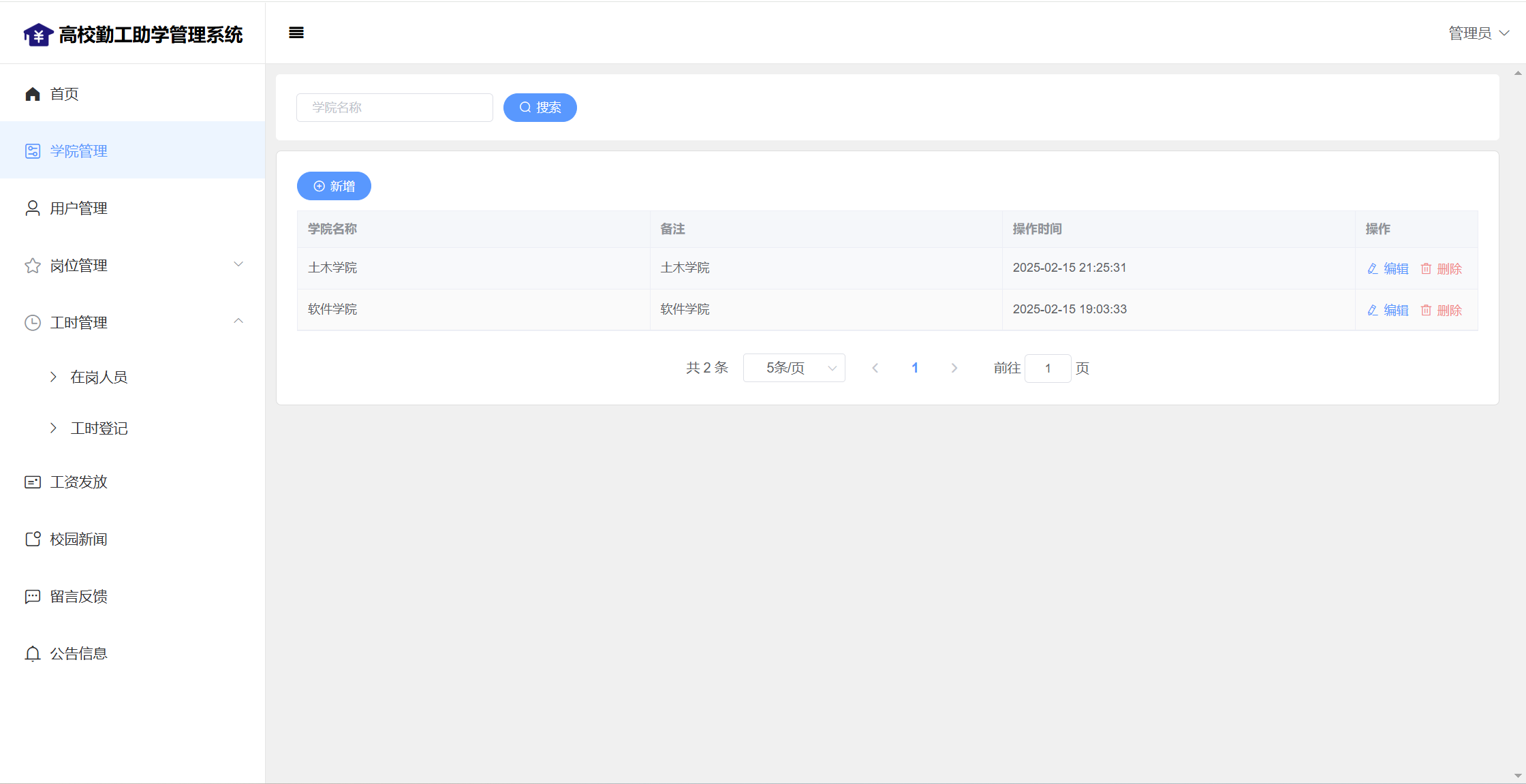 管理员:首页统计(补助金额发放统计、学院人员统计);学院管理;用户管理;岗位管理(岗位信息、岗位申请);工时管理(在岗人员、工时管理)、工资发放;校园新闻管理;留言管理;公告信息;个人信息;密码修改;