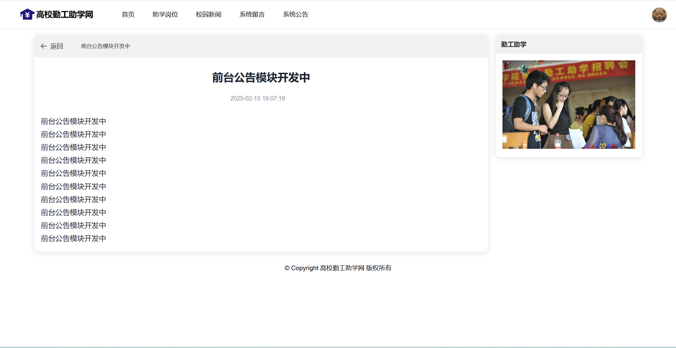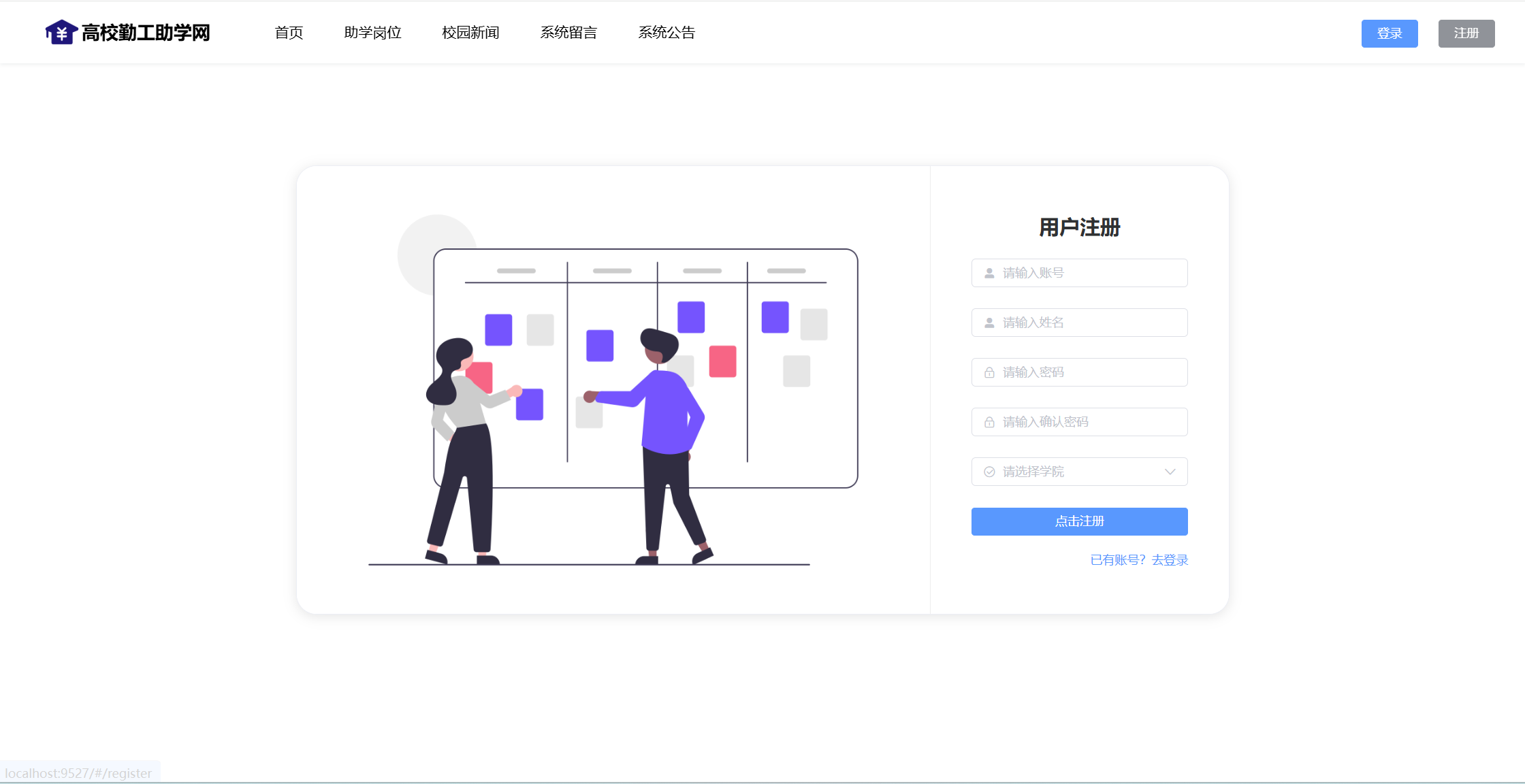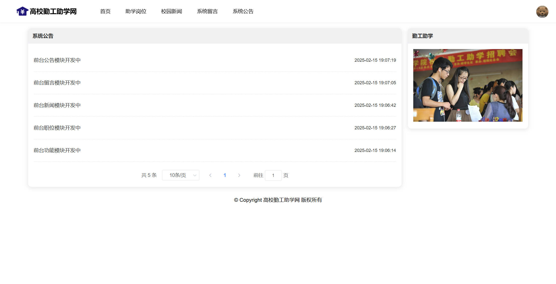 基于SpringBoot+Vue前后端分离的高校勤工助学网,本人原创开发。