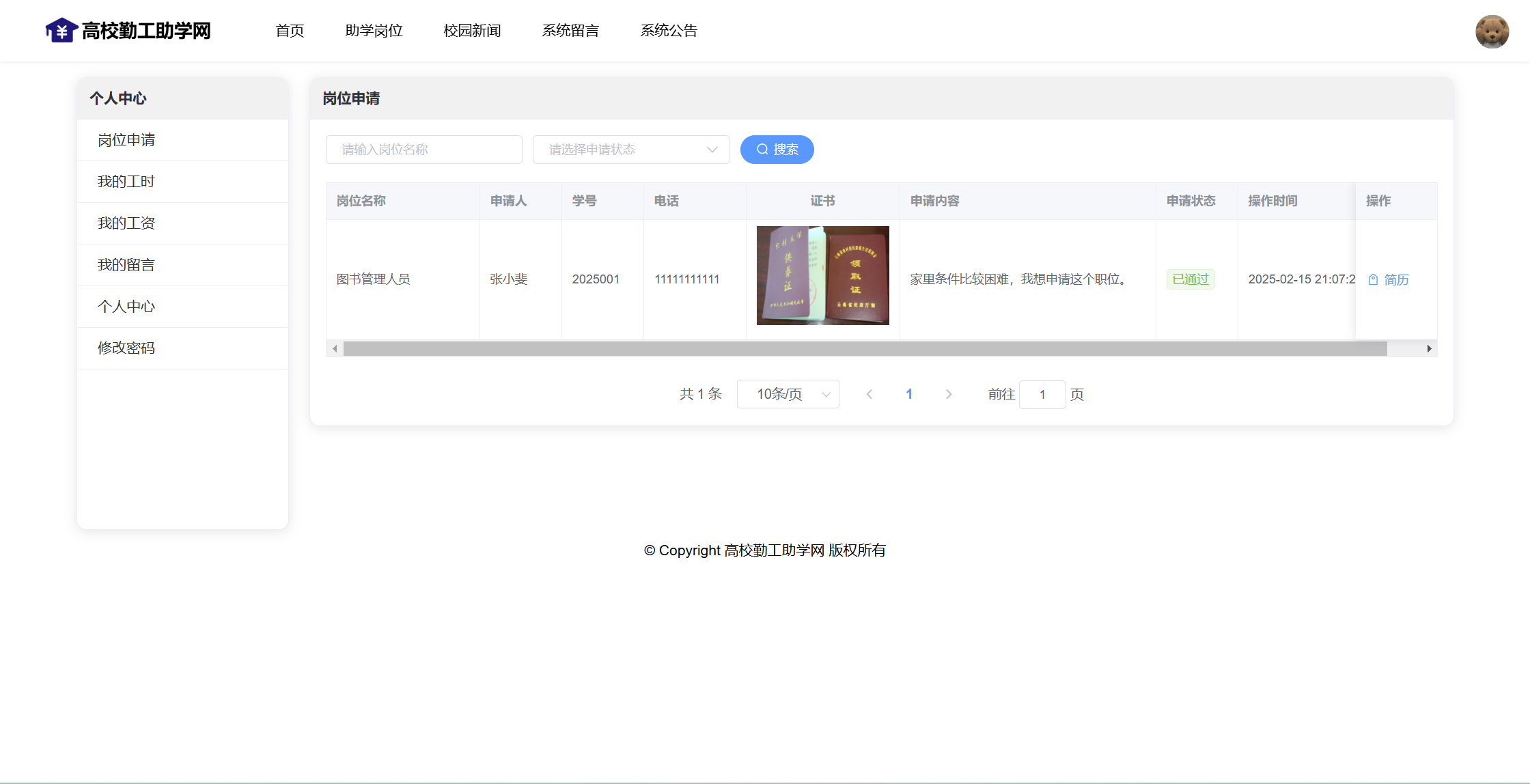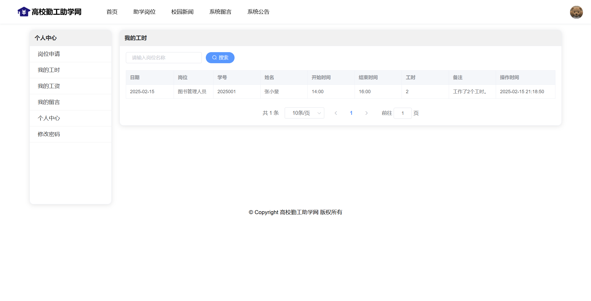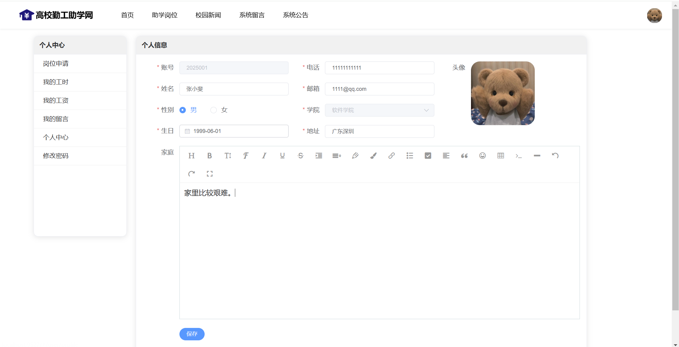 用户还具有个人中心功能,可以管理岗位申请、我的工时、我的工资、我的留言、个人资料、修改密码。