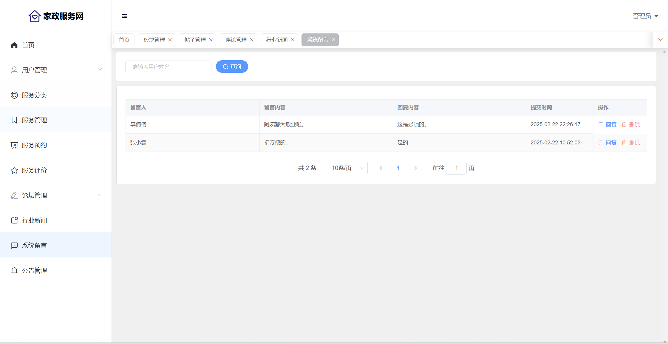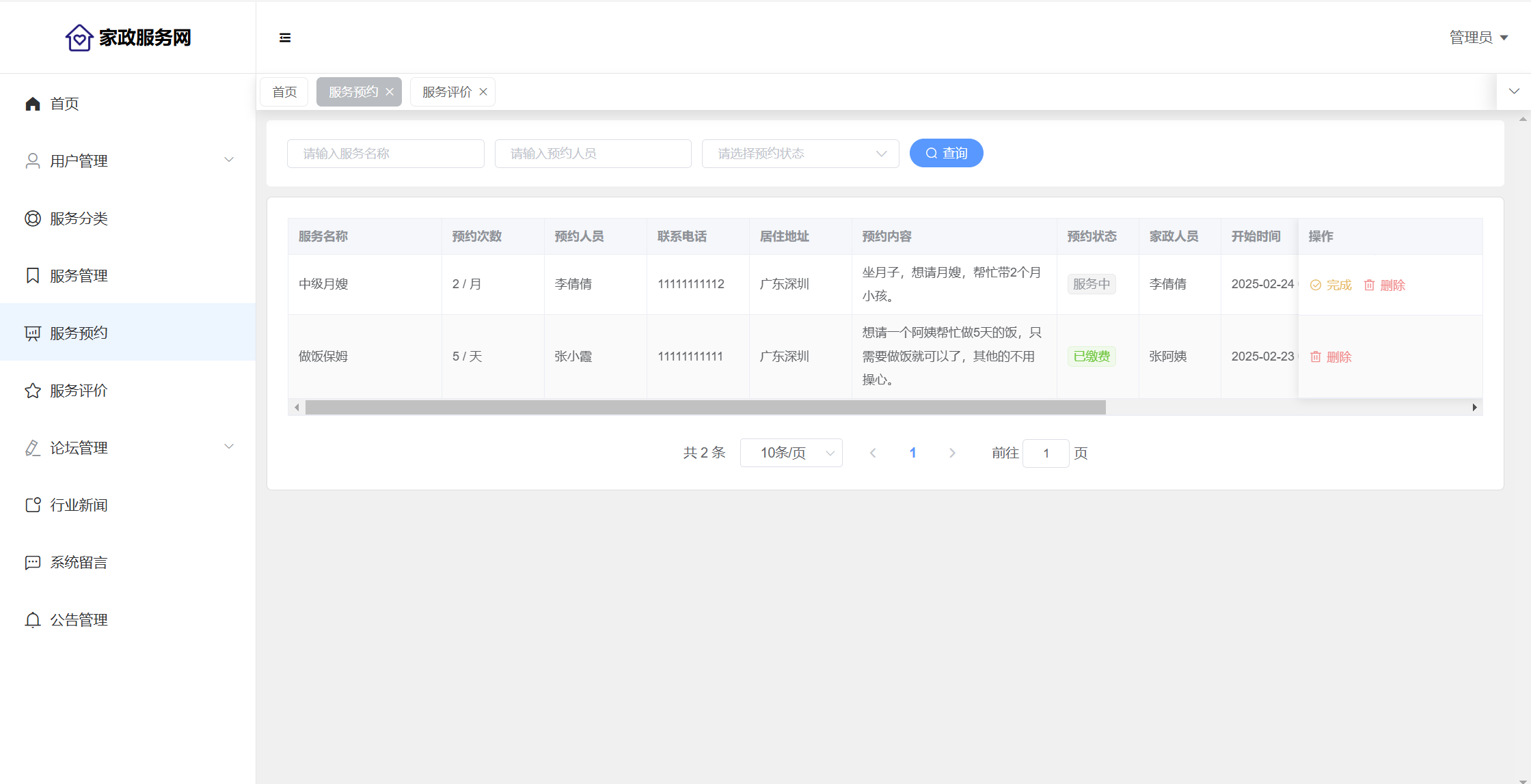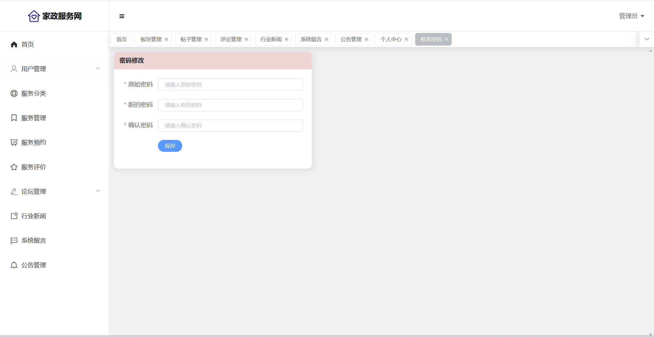 管理员:首页统计(评价统计、预约统计);用户管理(用户信息、员工信息);服务分类;服务管理;服务预约;服务评价;论坛管理(论坛版块、帖子管理、评论管理);行业新闻;系统留言;公告信息;个人信息;密码修改。