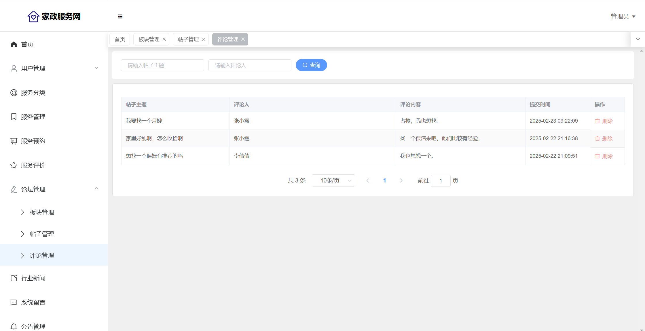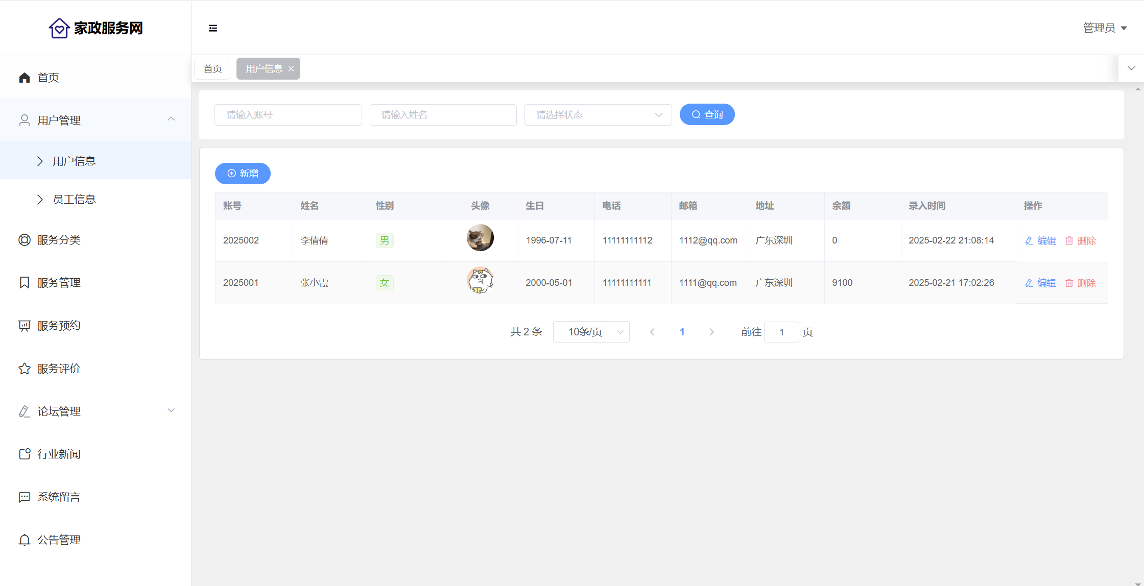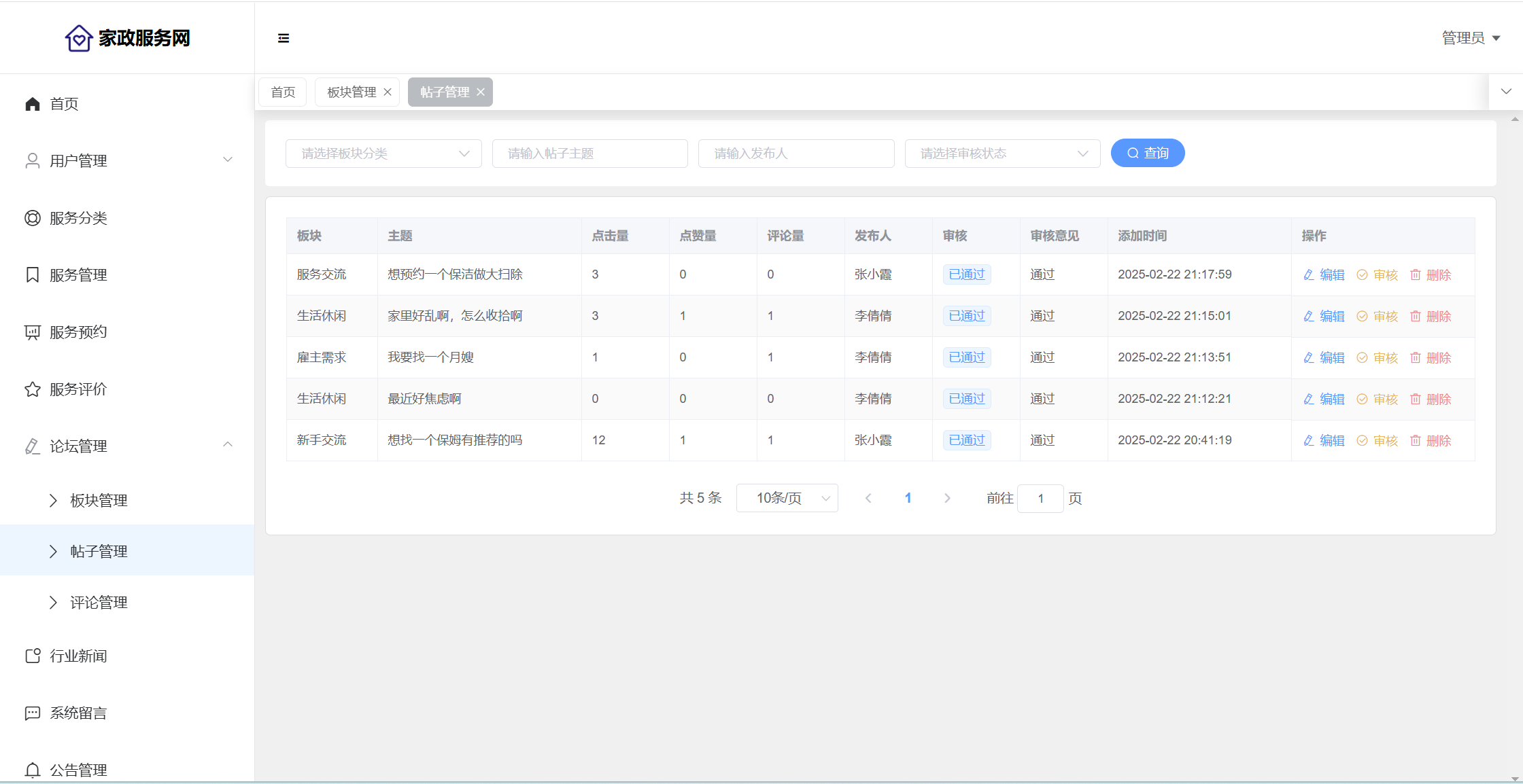 管理员:首页统计(评价统计、预约统计);用户管理(用户信息、员工信息);服务分类;服务管理;服务预约;服务评价;论坛管理(论坛版块、帖子管理、评论管理);行业新闻;系统留言;公告信息;个人信息;密码修改。
