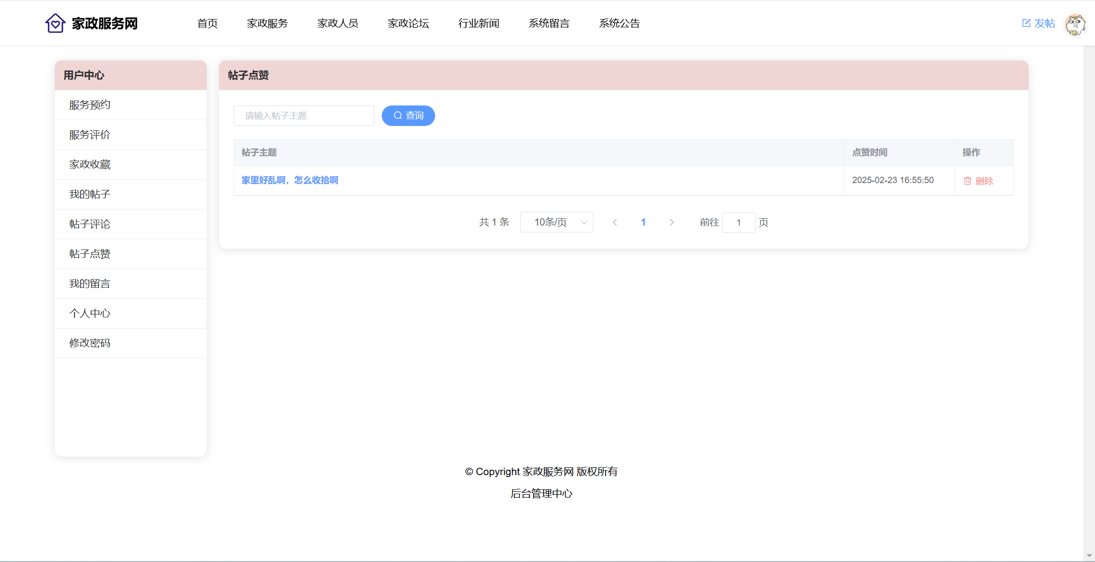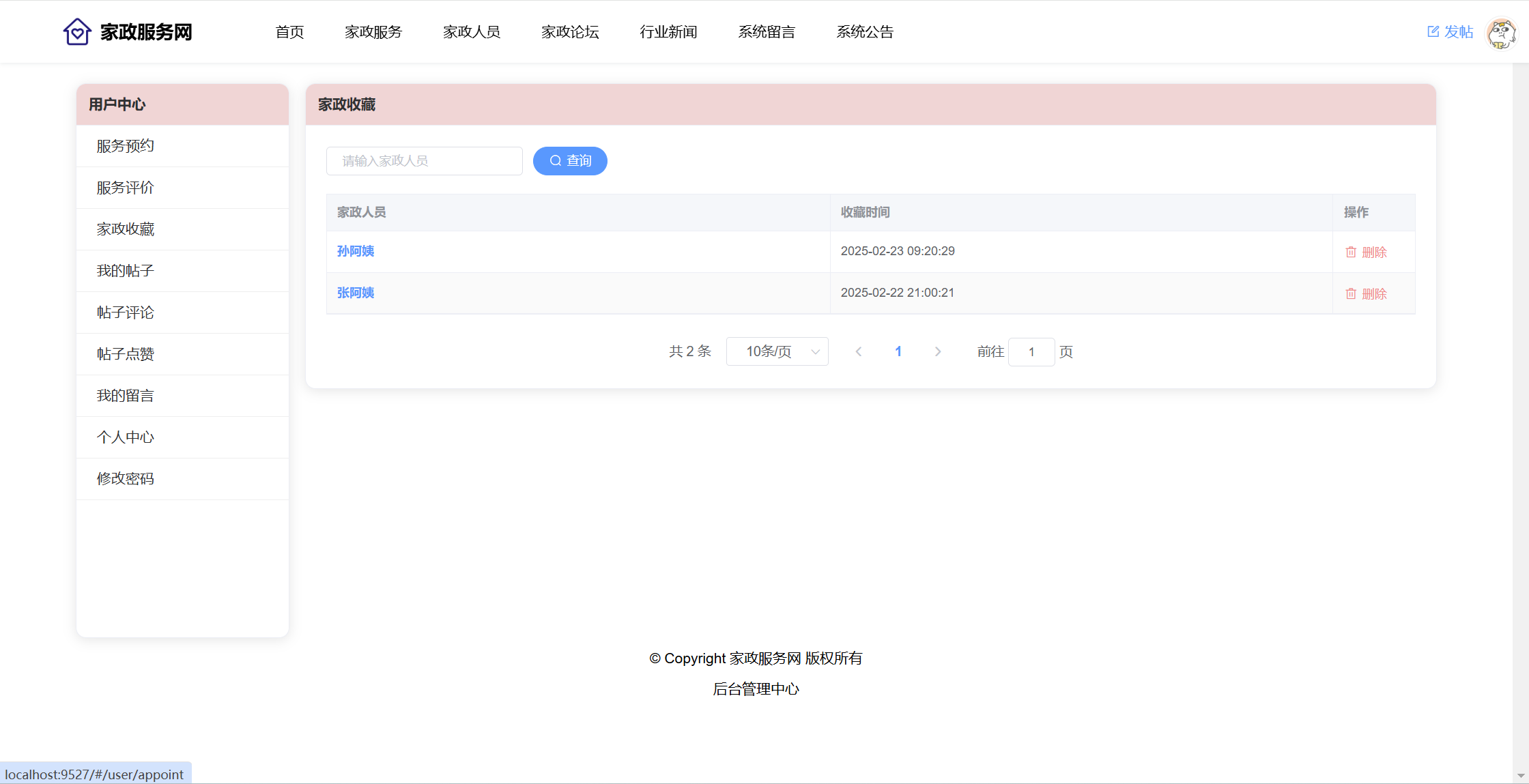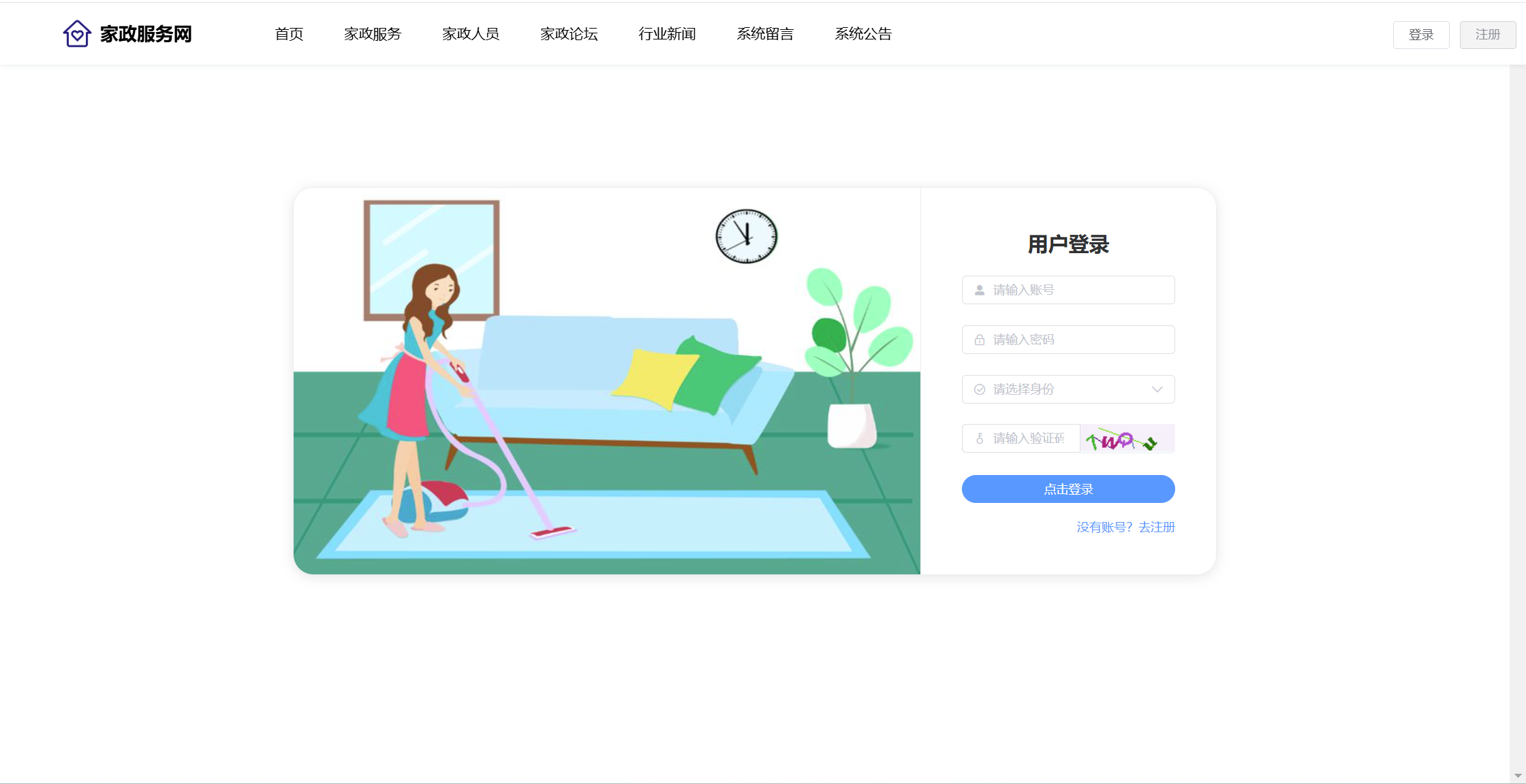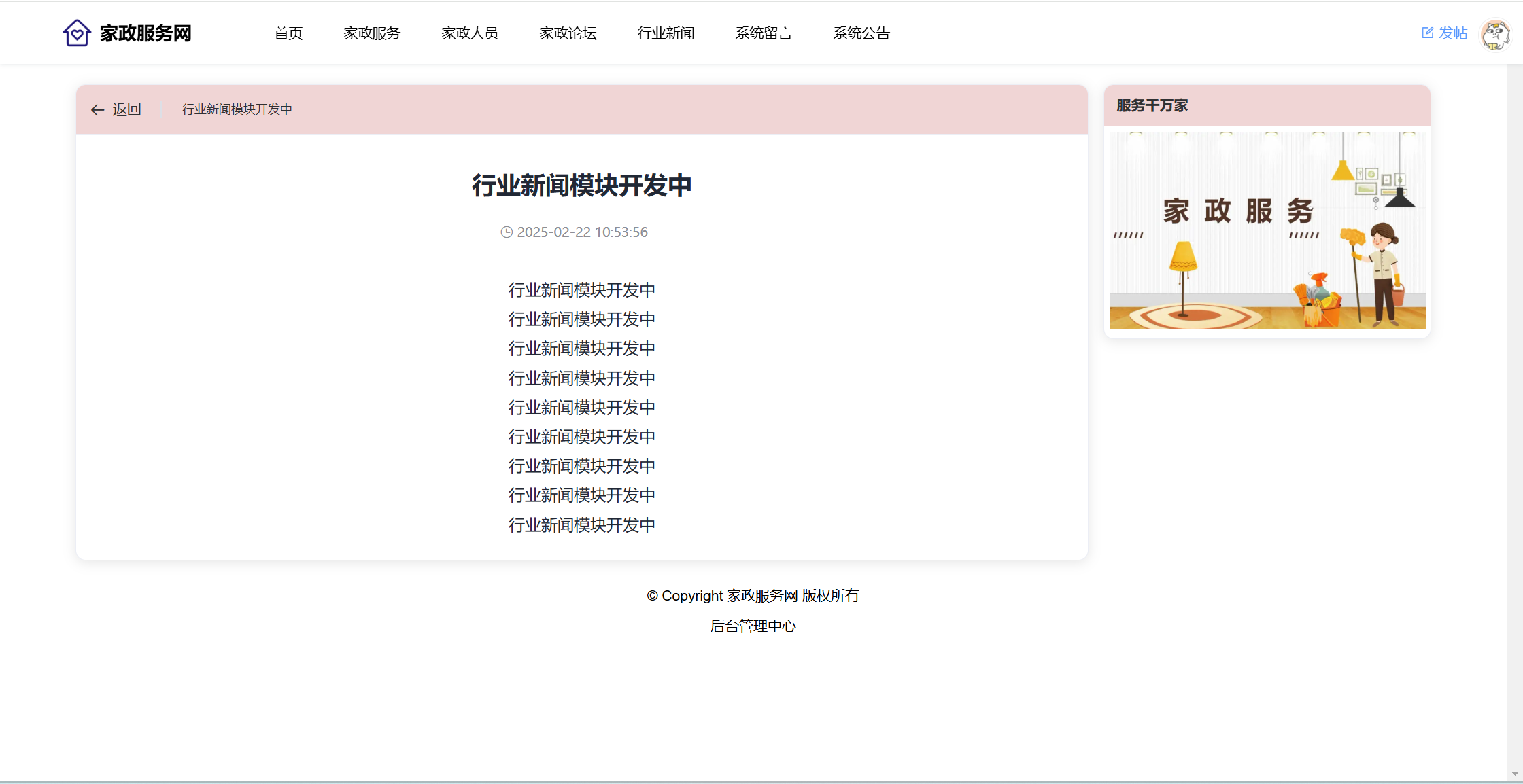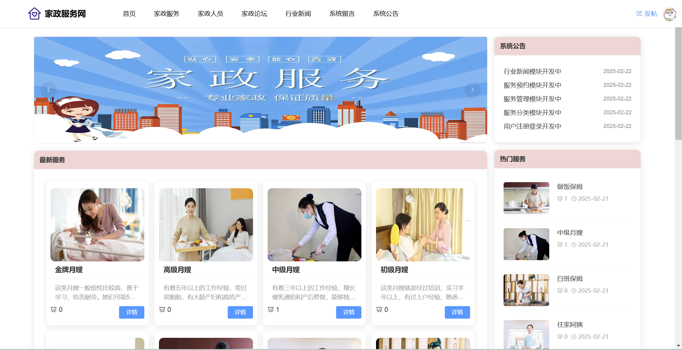 用户:注册、登录系统;首页;家政服务(服务分类、服务列表、服务详情、预约);家政人员(查看评价、收藏)、家政论坛(版块、帖子、评论、点赞);行业新闻;系统留言;公告信息。用户还具有个人中心功能,功能包括:服务预约、服务评价、家政收藏、我的帖子、帖子评论、帖子点赞、我的留言、个人中心、修改密码。