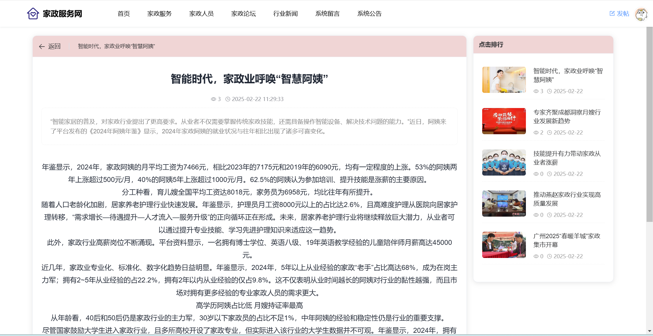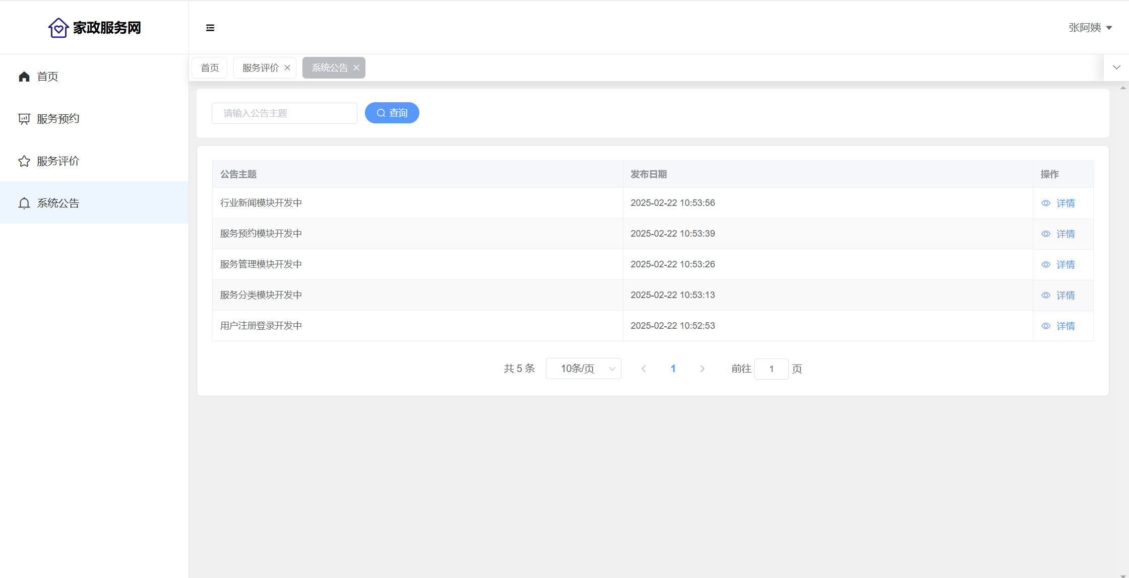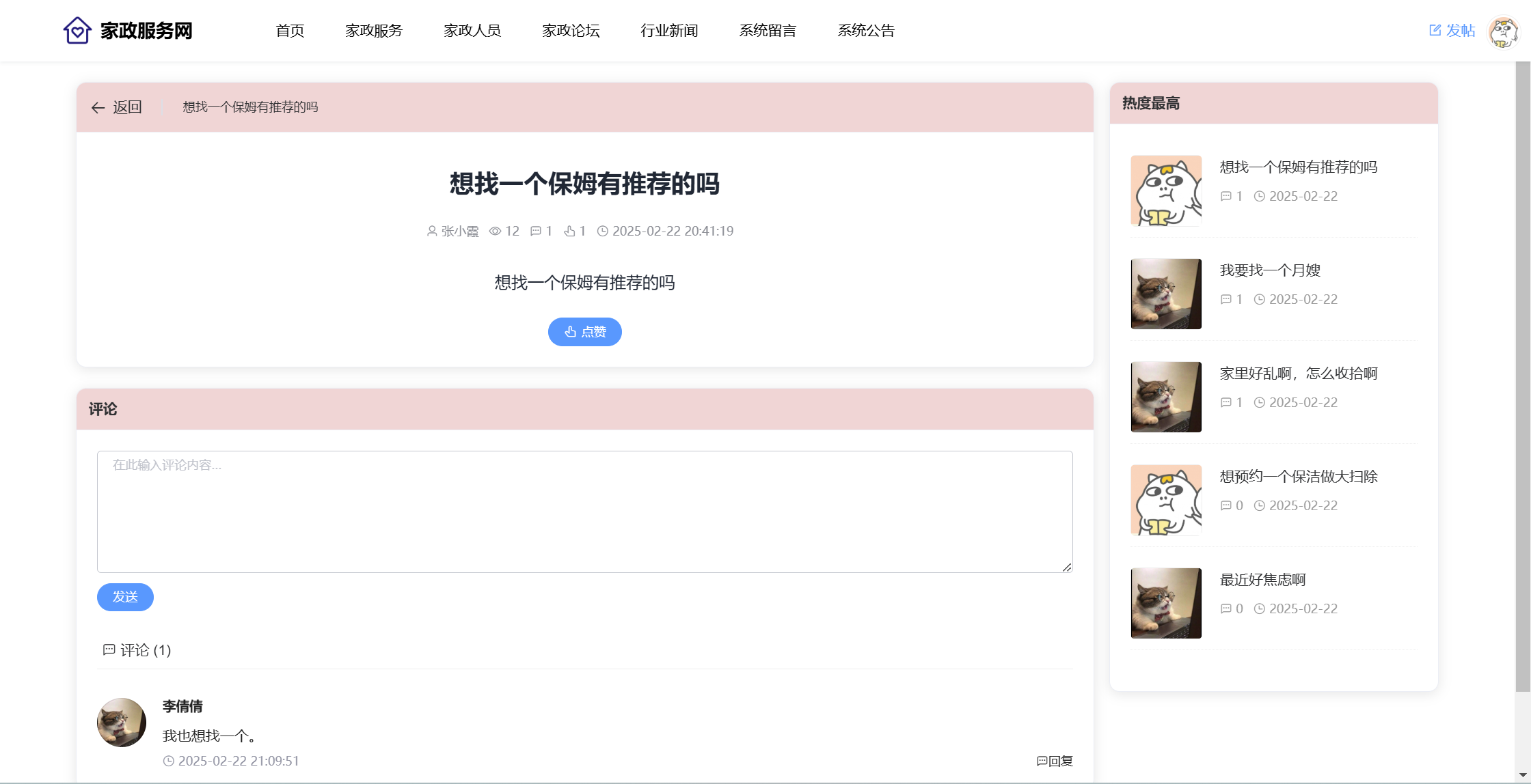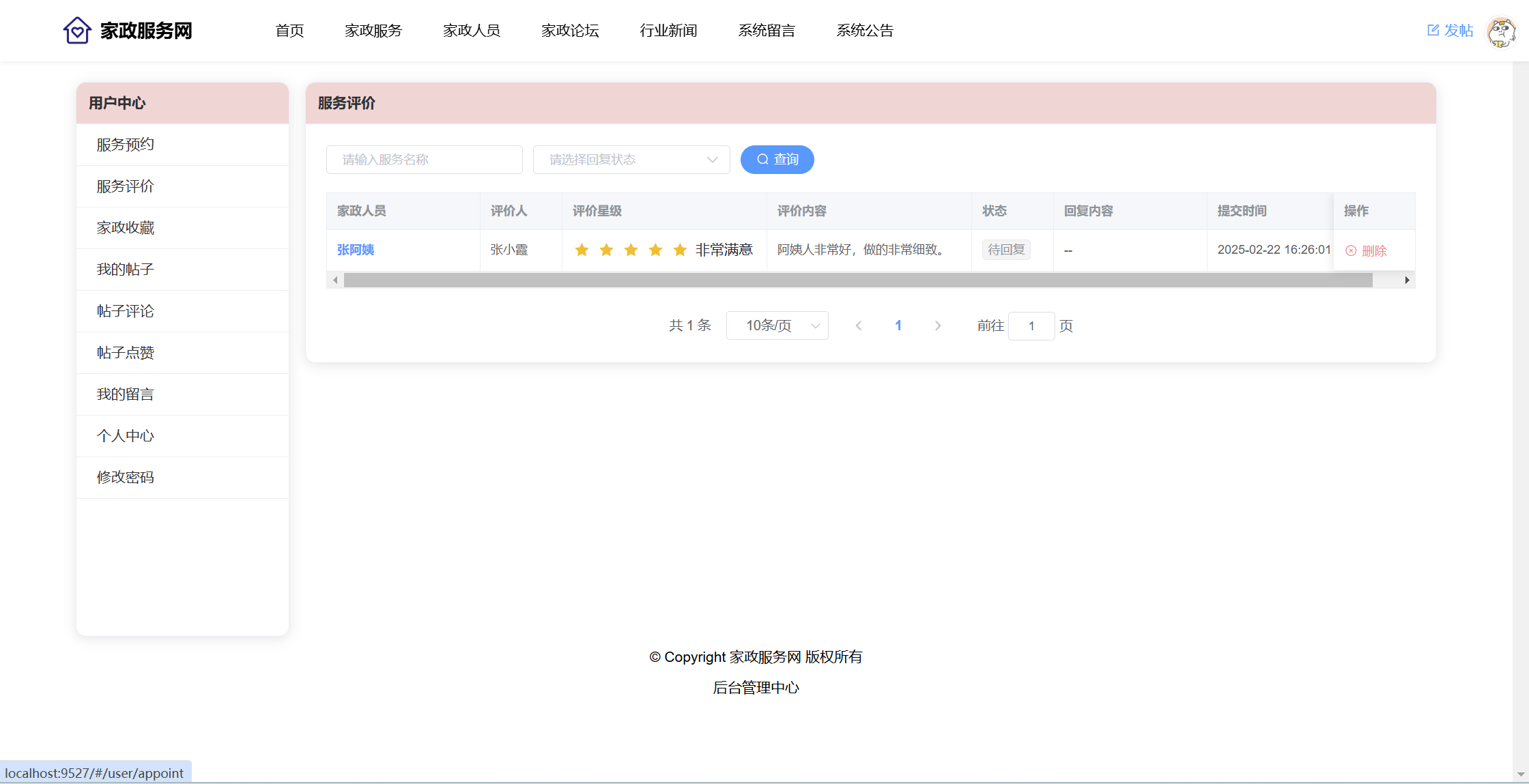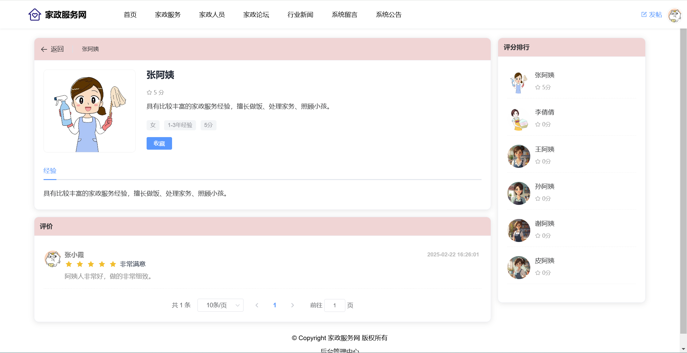 用户:注册、登录系统;首页;家政服务(服务分类、服务列表、服务详情、预约);家政人员(查看评价、收藏)、家政论坛(版块、帖子、评论、点赞);行业新闻;系统留言;公告信息。用户还具有个人中心功能,功能包括:服务预约、服务评价、家政收藏、我的帖子、帖子评论、帖子点赞、我的留言、个人中心、修改密码。
