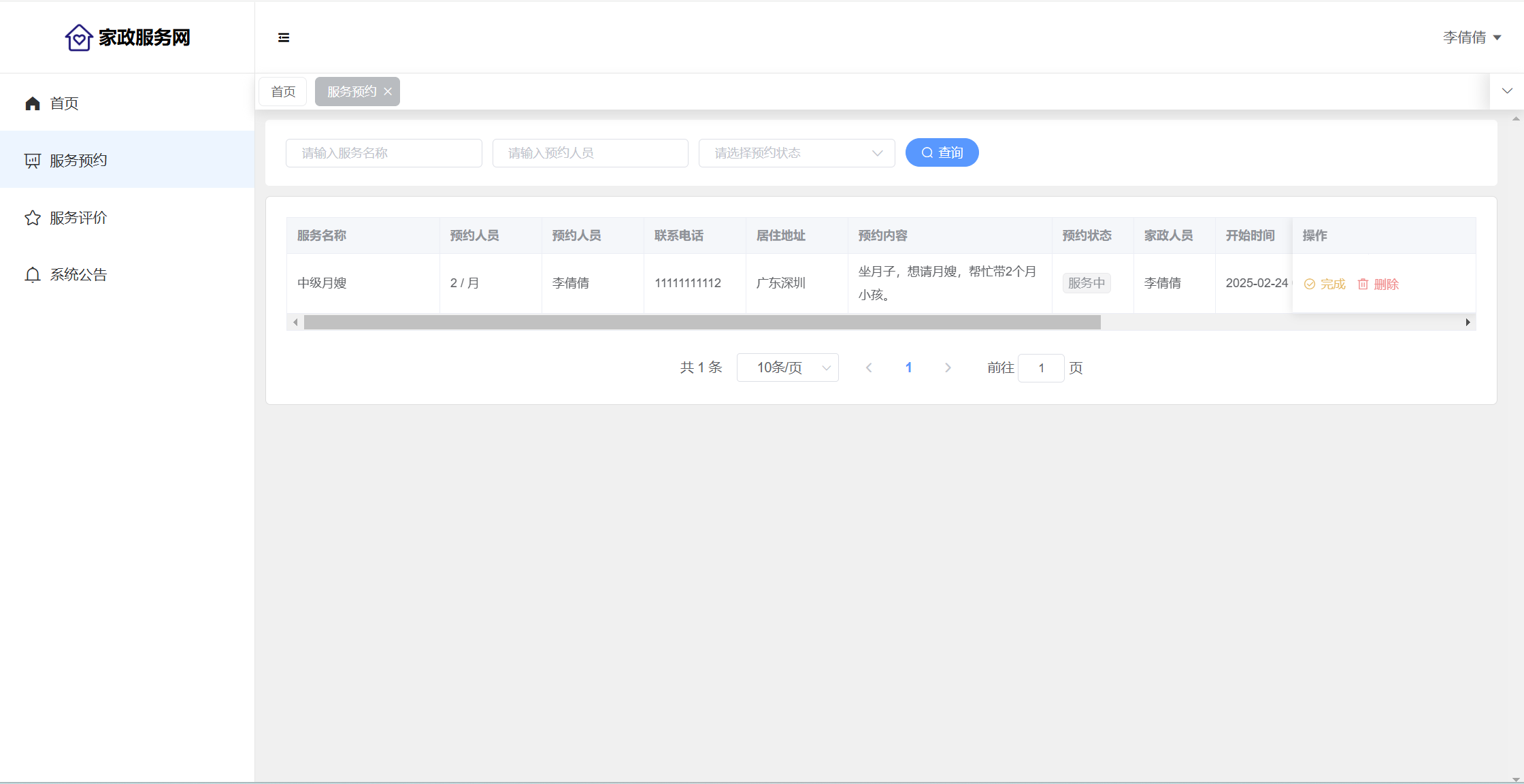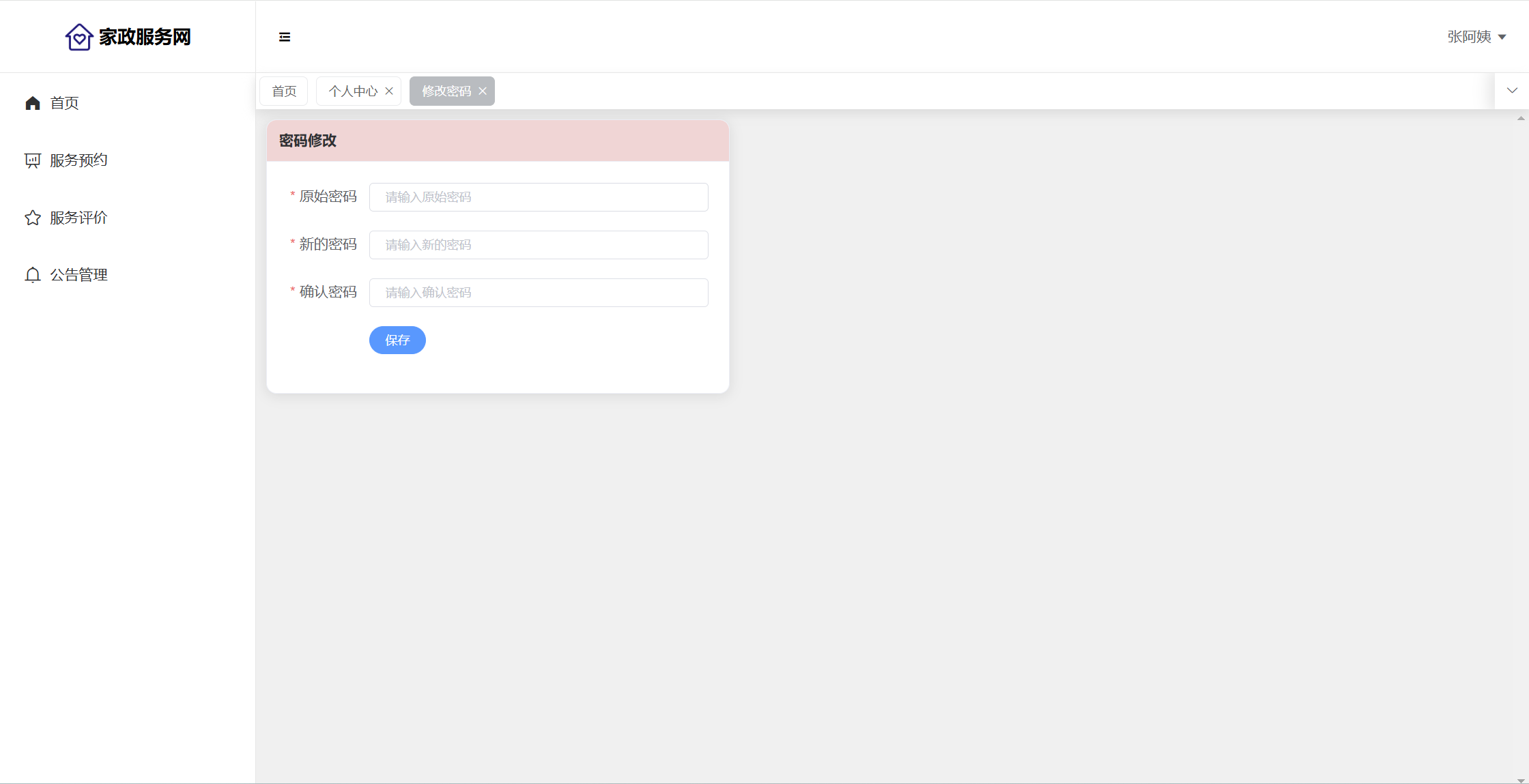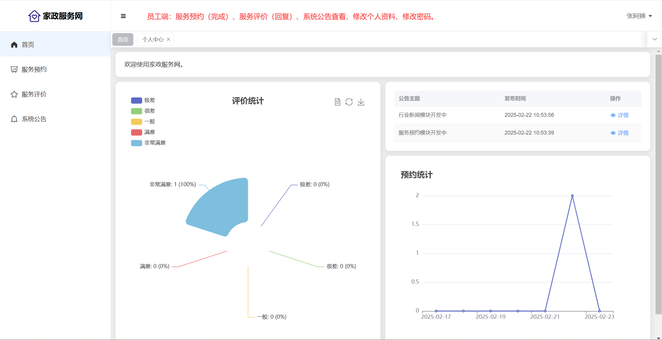 员工:服务预约(完成)、服务评价(回复)、公告查看;个人信息(可上传照片和证书)、修改密码。
