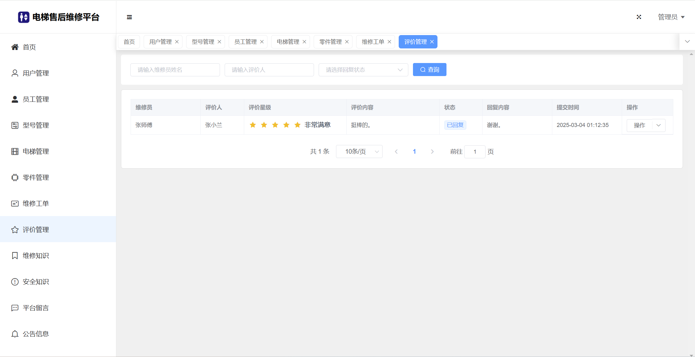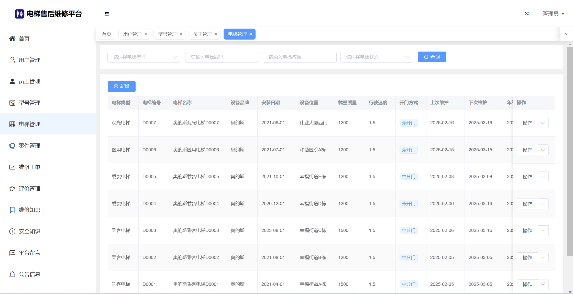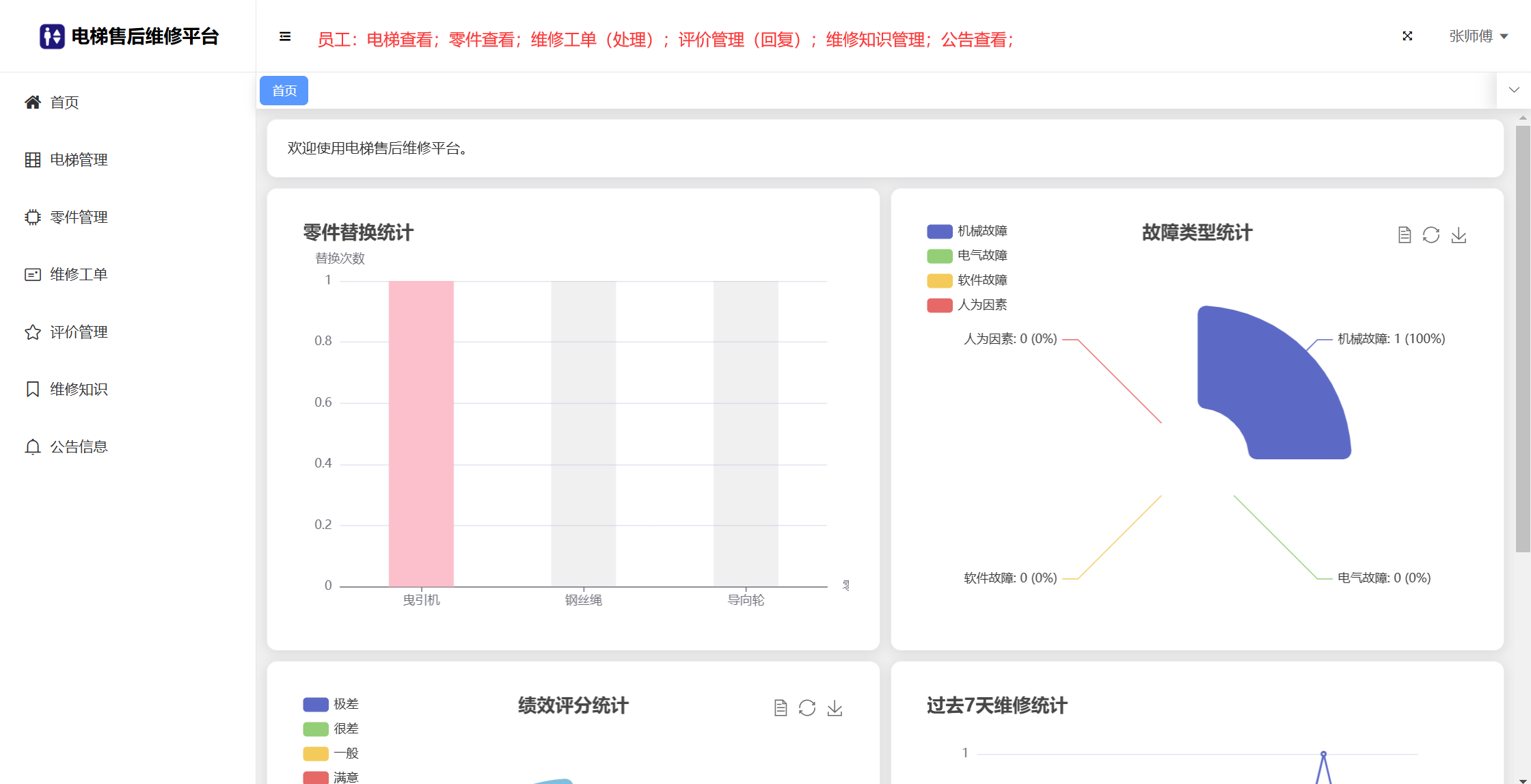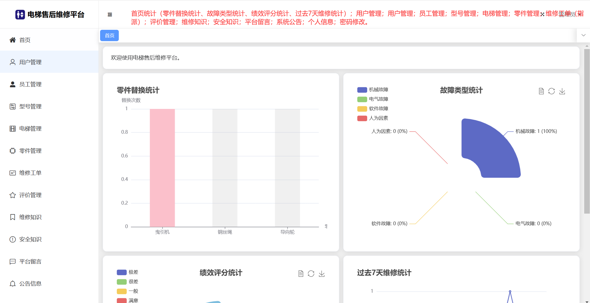 管理员:首页统计(零件替换统计、故障类型统计、绩效评分统计、过去7天维修统计);用户管理;用户管理;员工管理;型号管理;电梯管理;零件管理;维修工单(指派);评价管理;维修知识;安全知识;平台留言;系统公告;个人信息;密码修改。