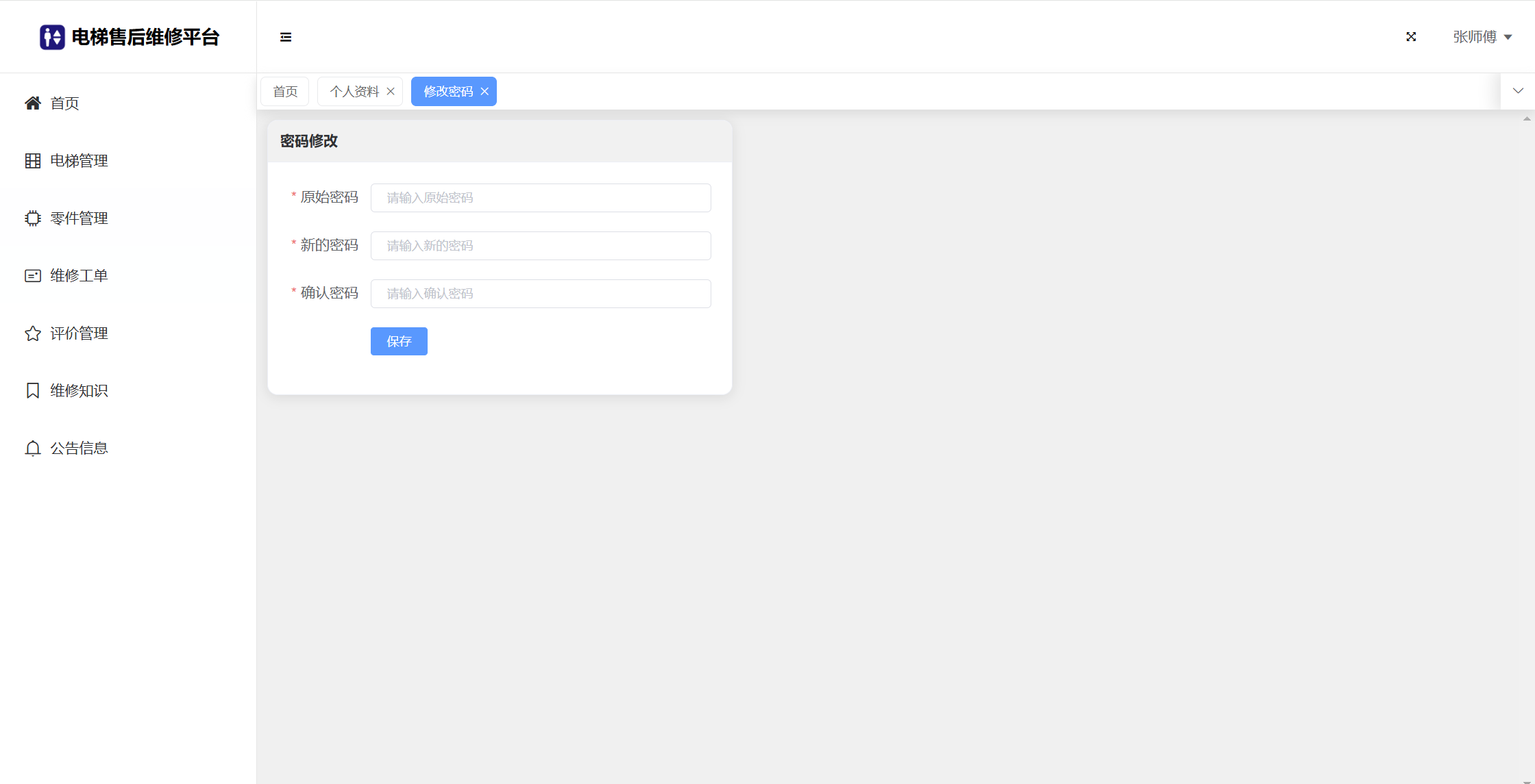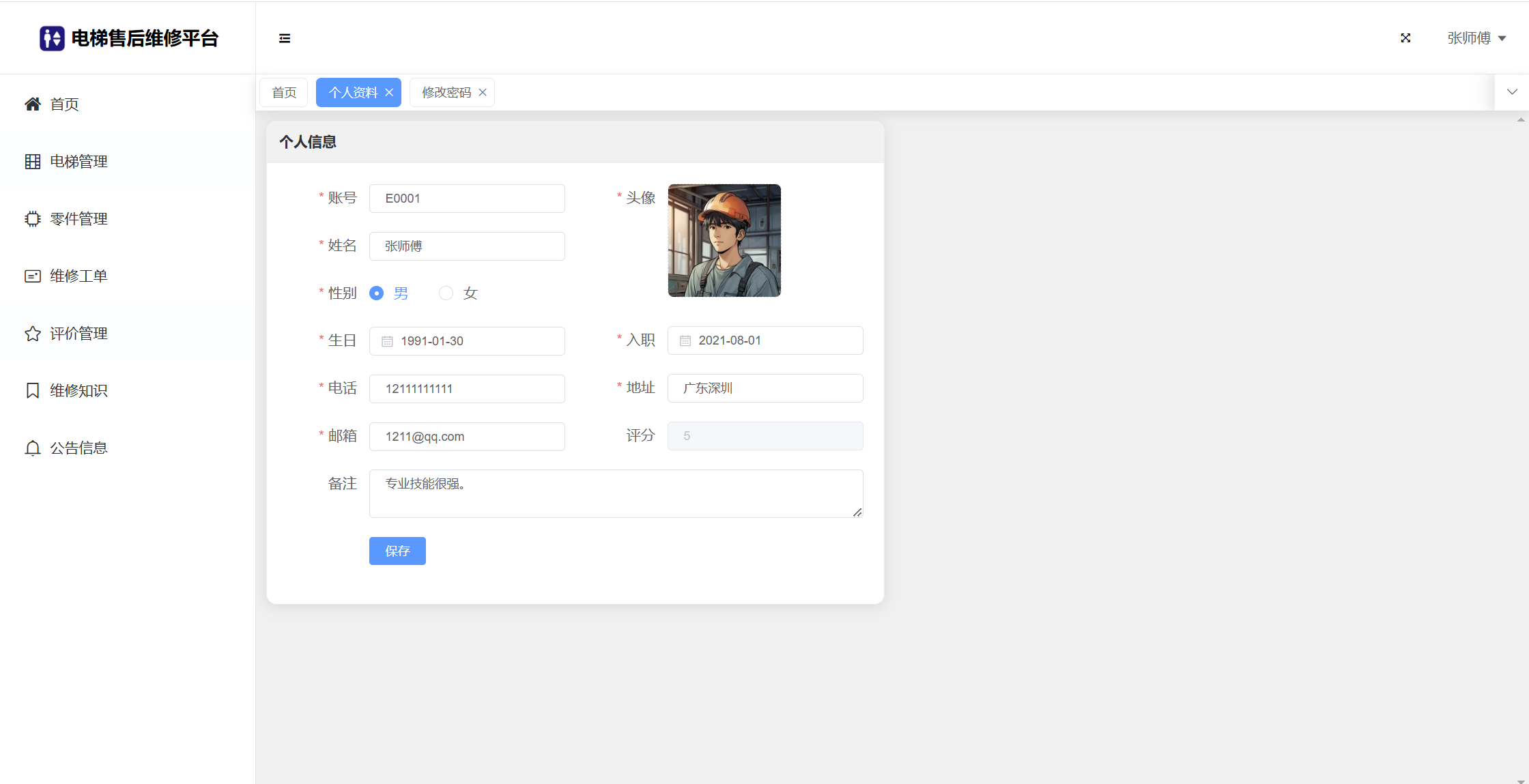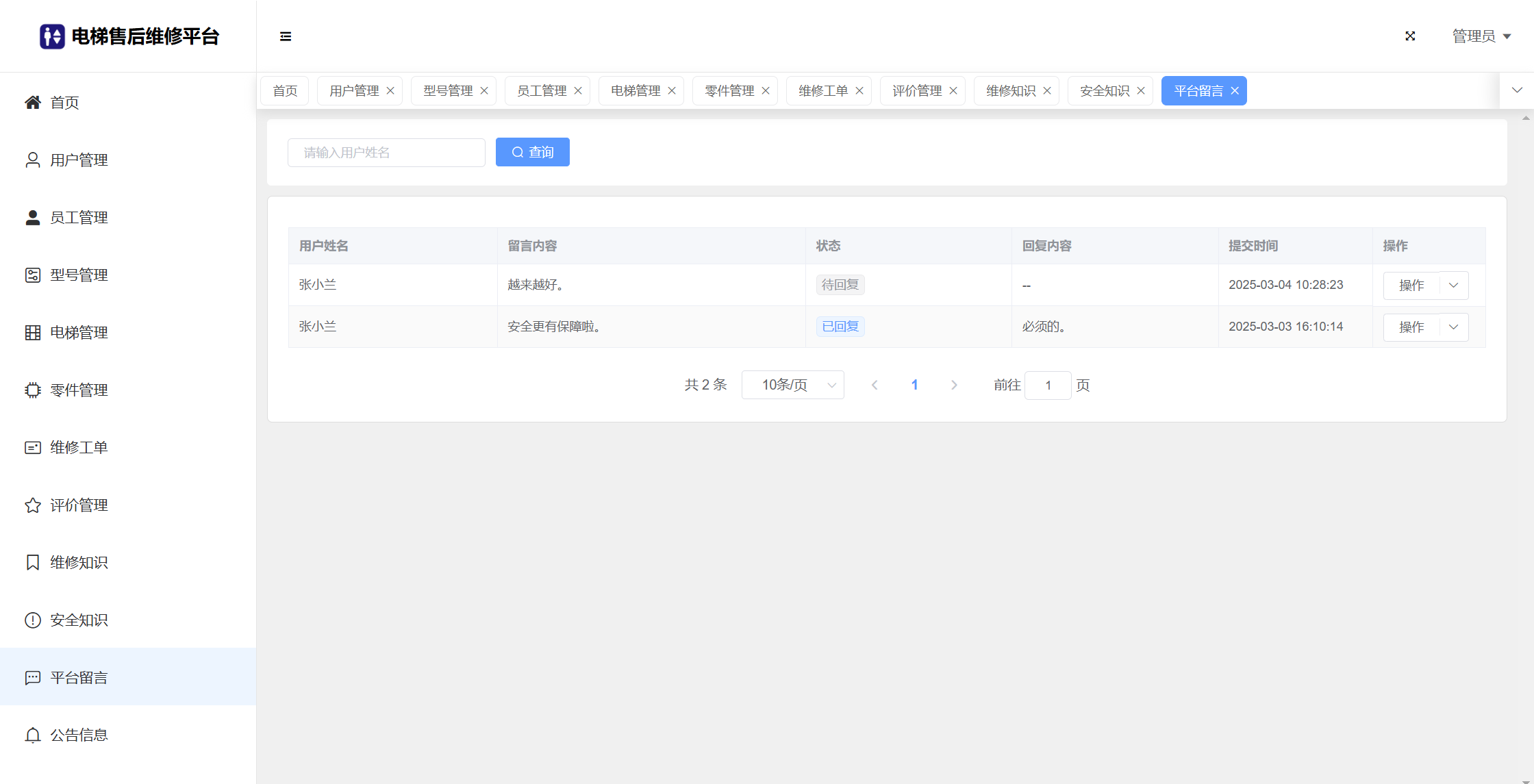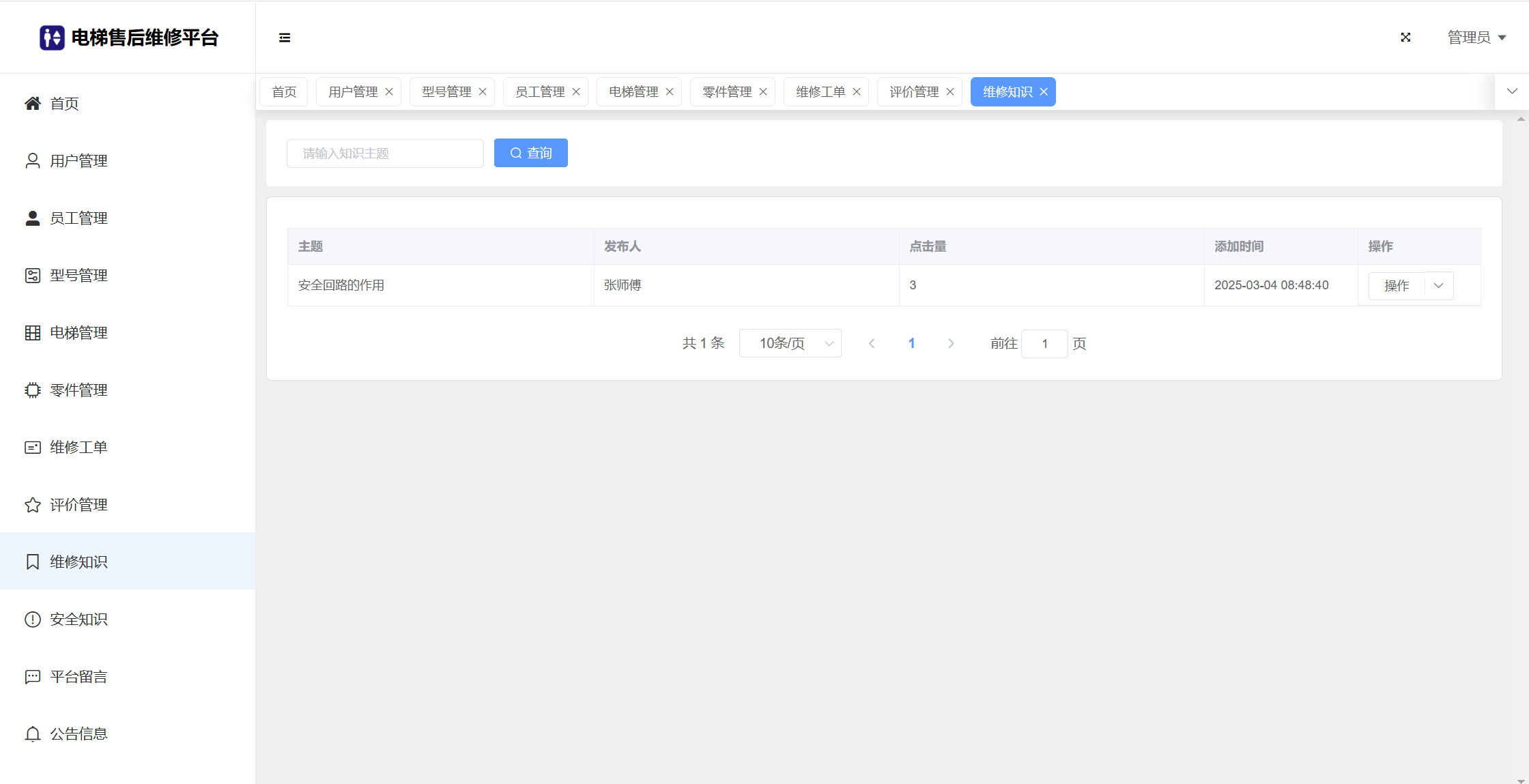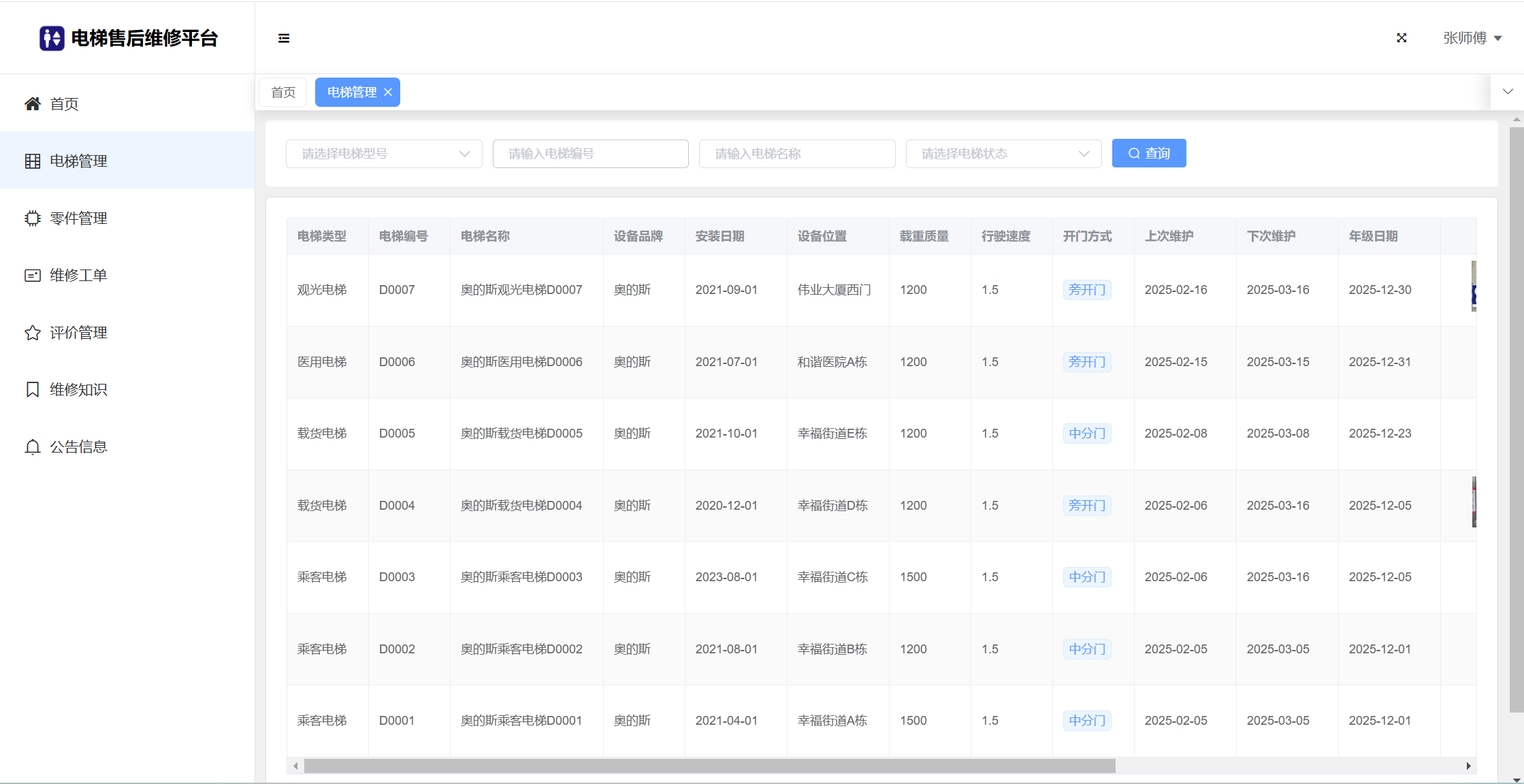 管理员:首页统计(零件替换统计、故障类型统计、绩效评分统计、过去7天维修统计);用户管理;用户管理;员工管理;型号管理;电梯管理;零件管理;维修工单(指派);评价管理;维修知识;安全知识;平台留言;系统公告;个人信息;密码修改。