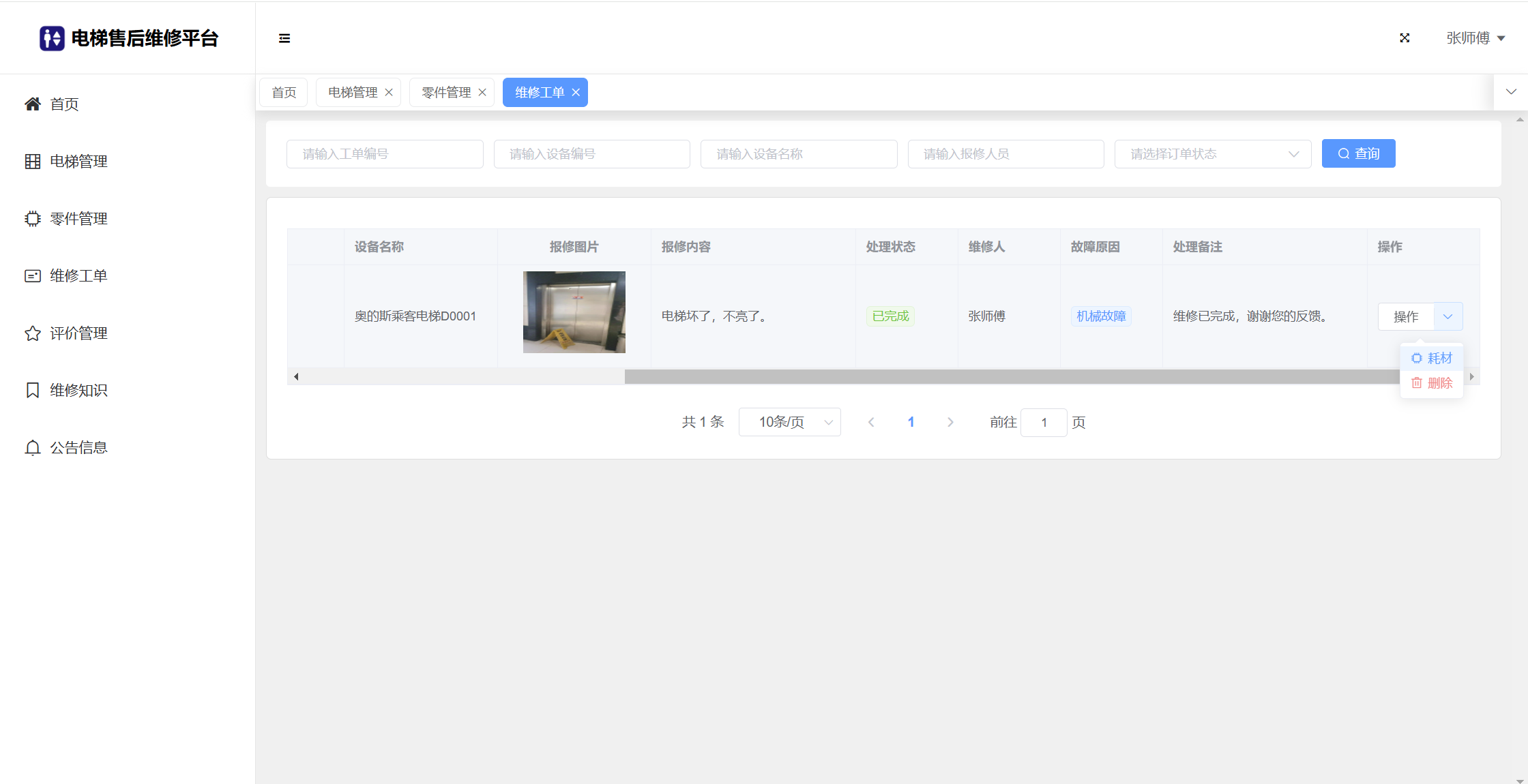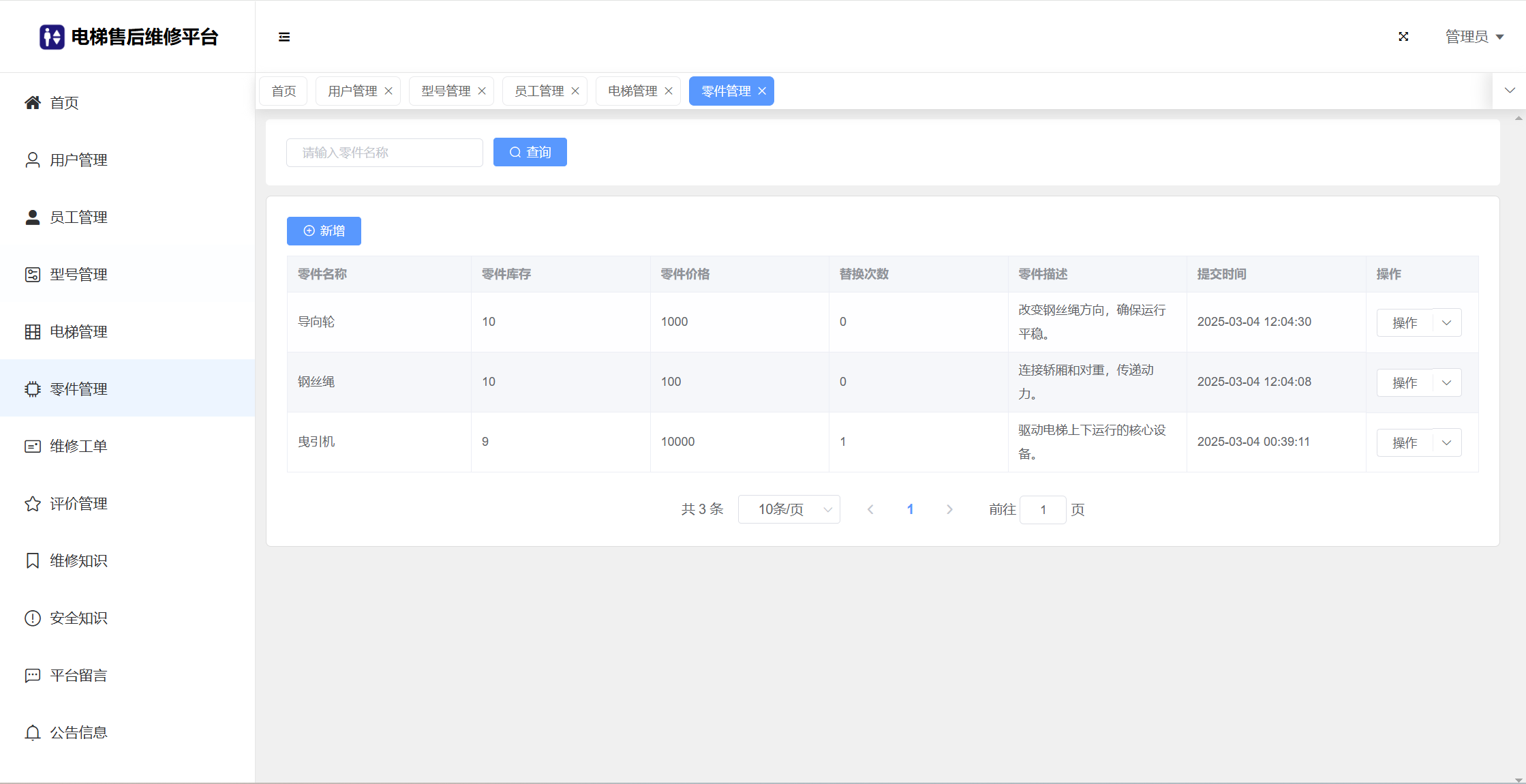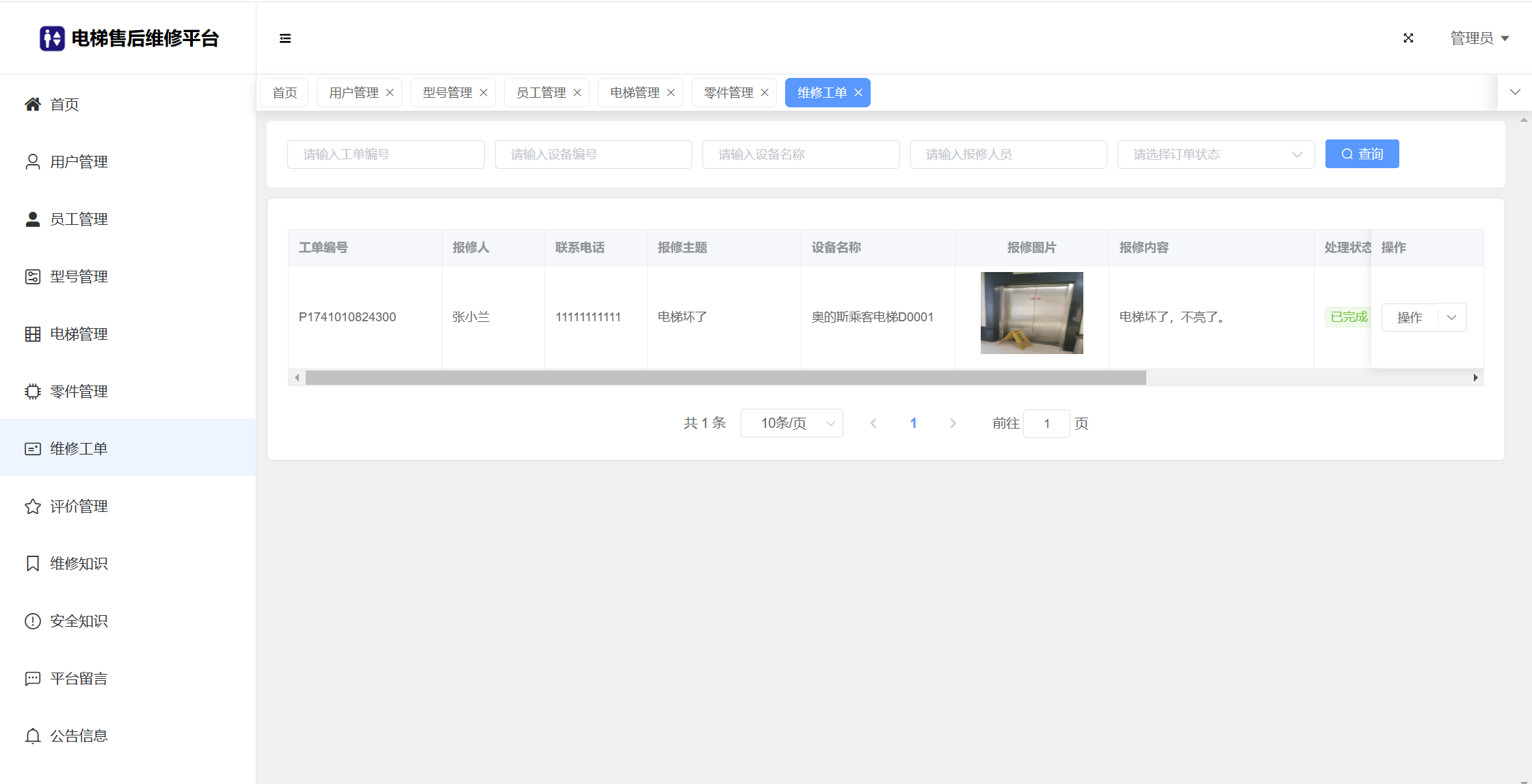 员工:电梯查看;零件查看;维修工单(处理);评价管理(回复);维修知识管理;公告查看;