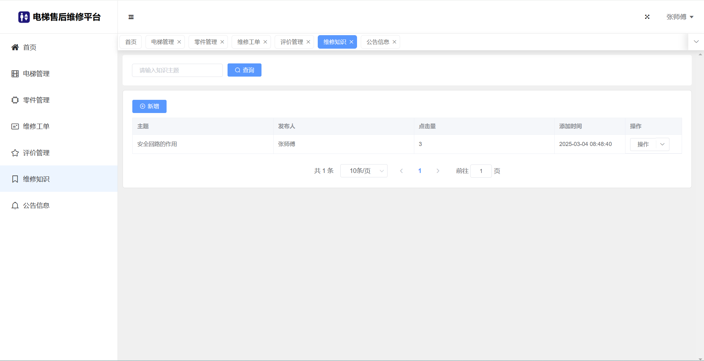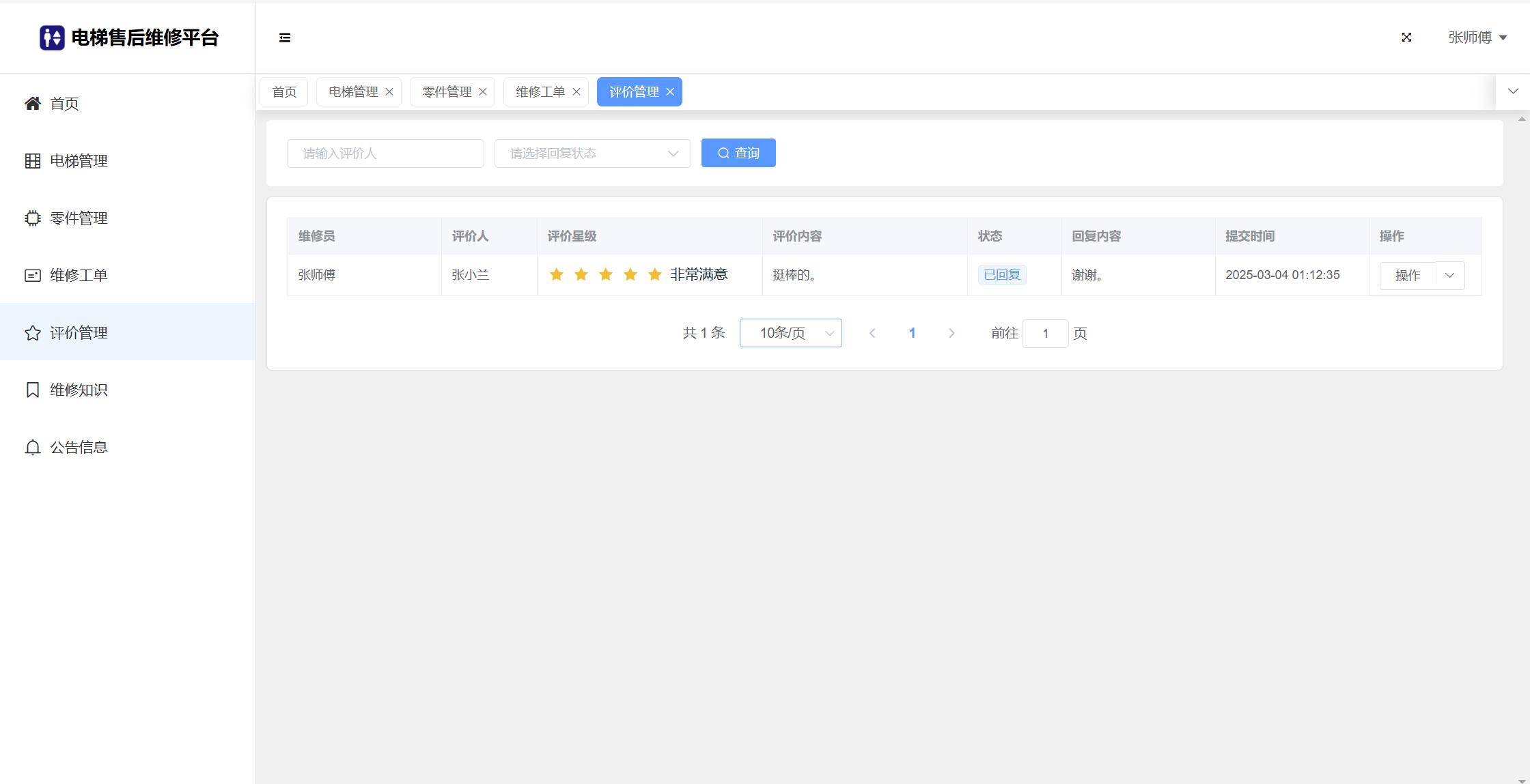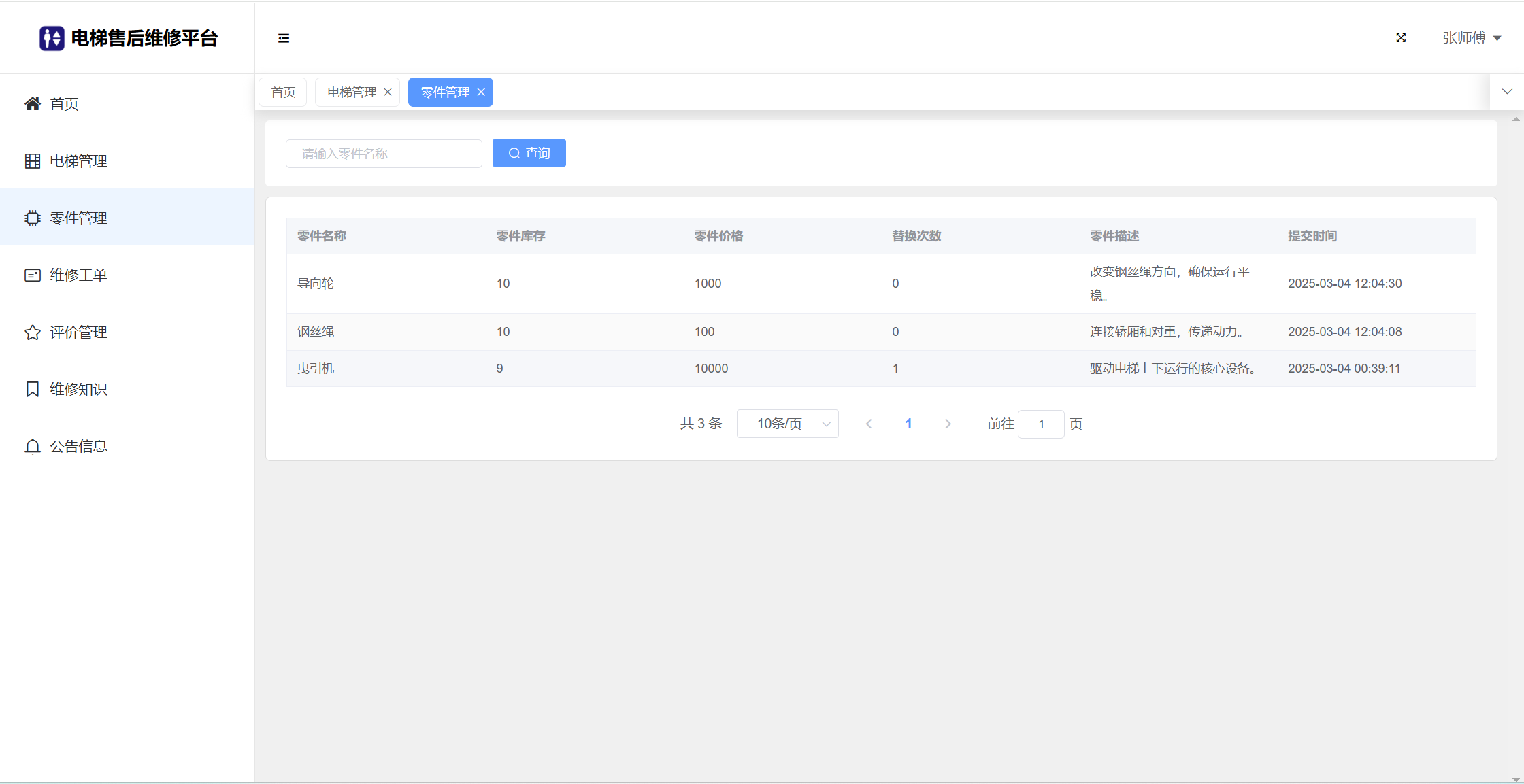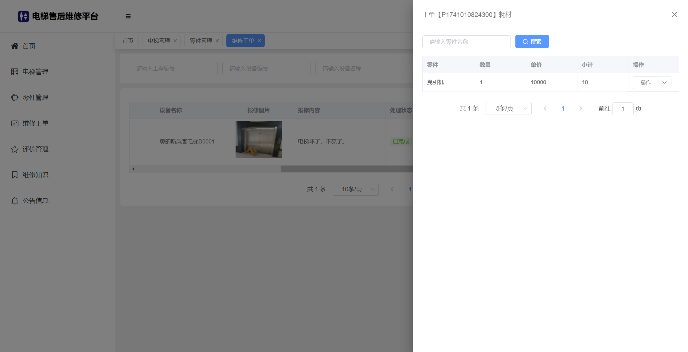 员工:电梯查看;零件查看;维修工单(处理);评价管理(回复);维修知识管理;公告查看;