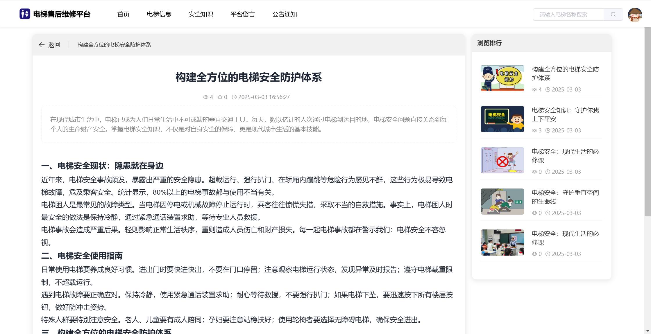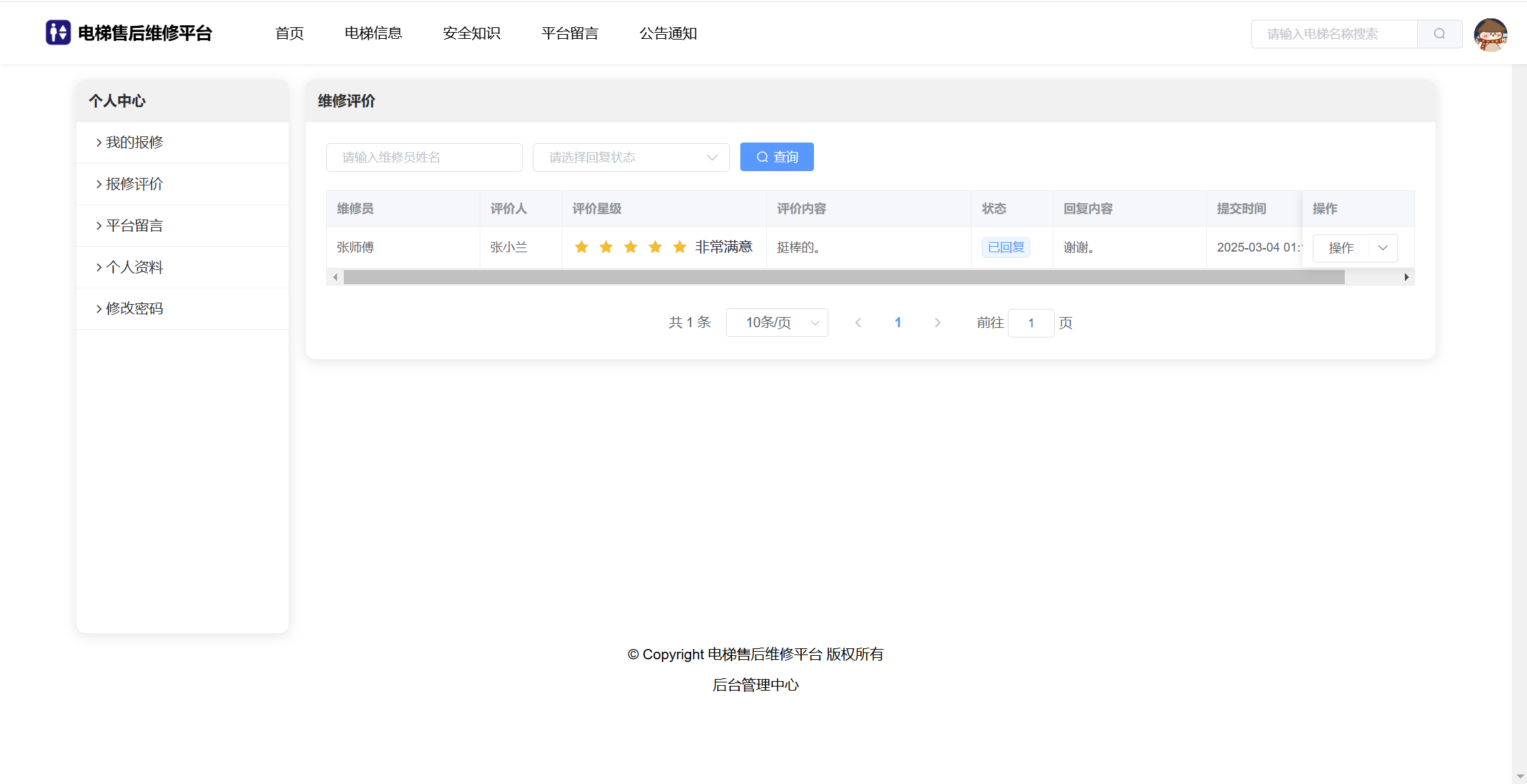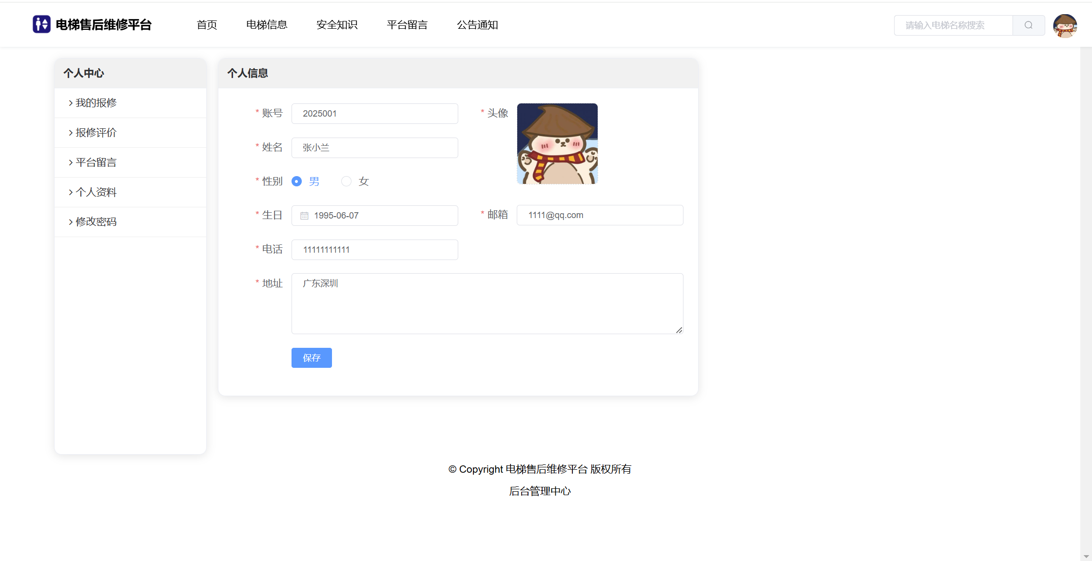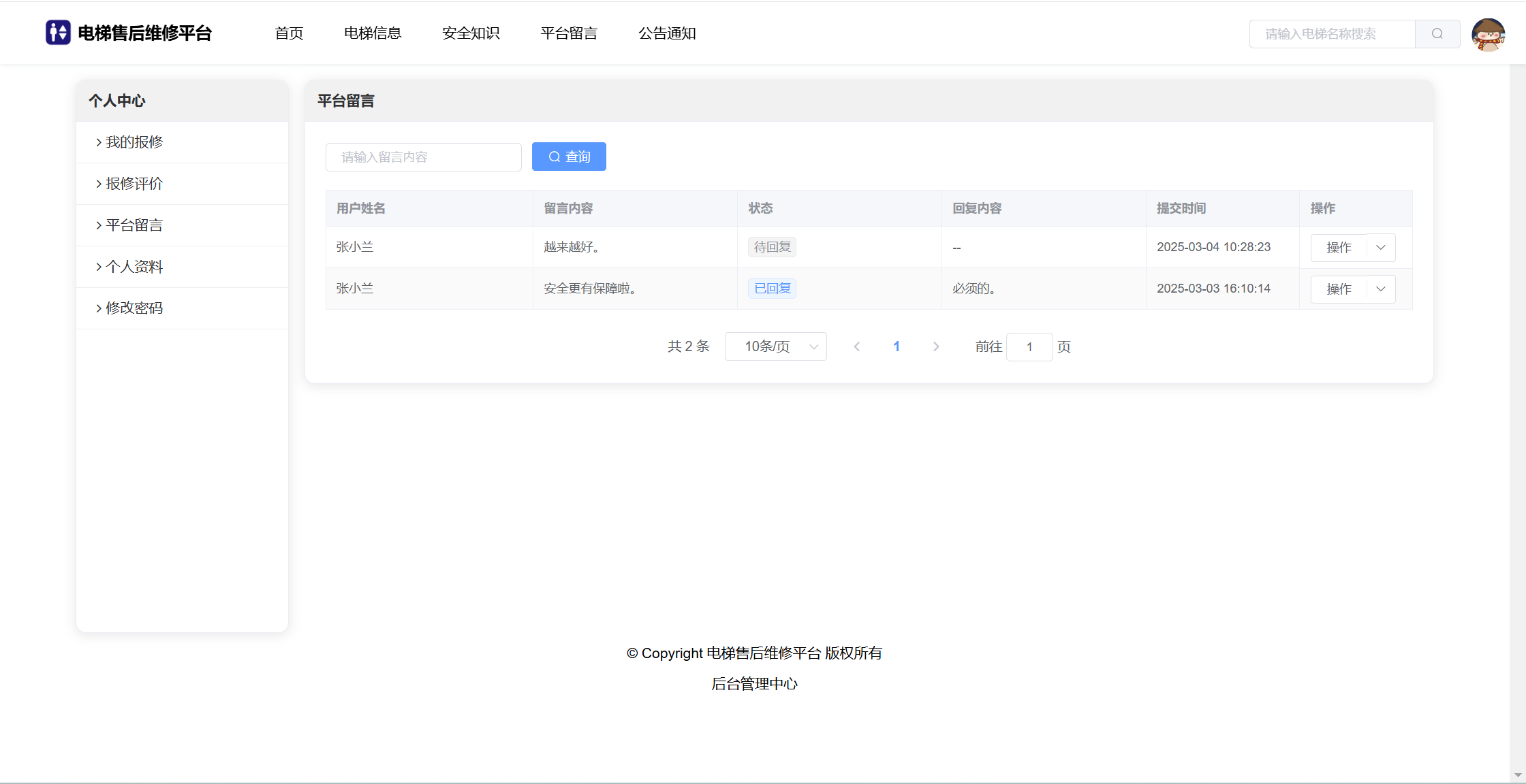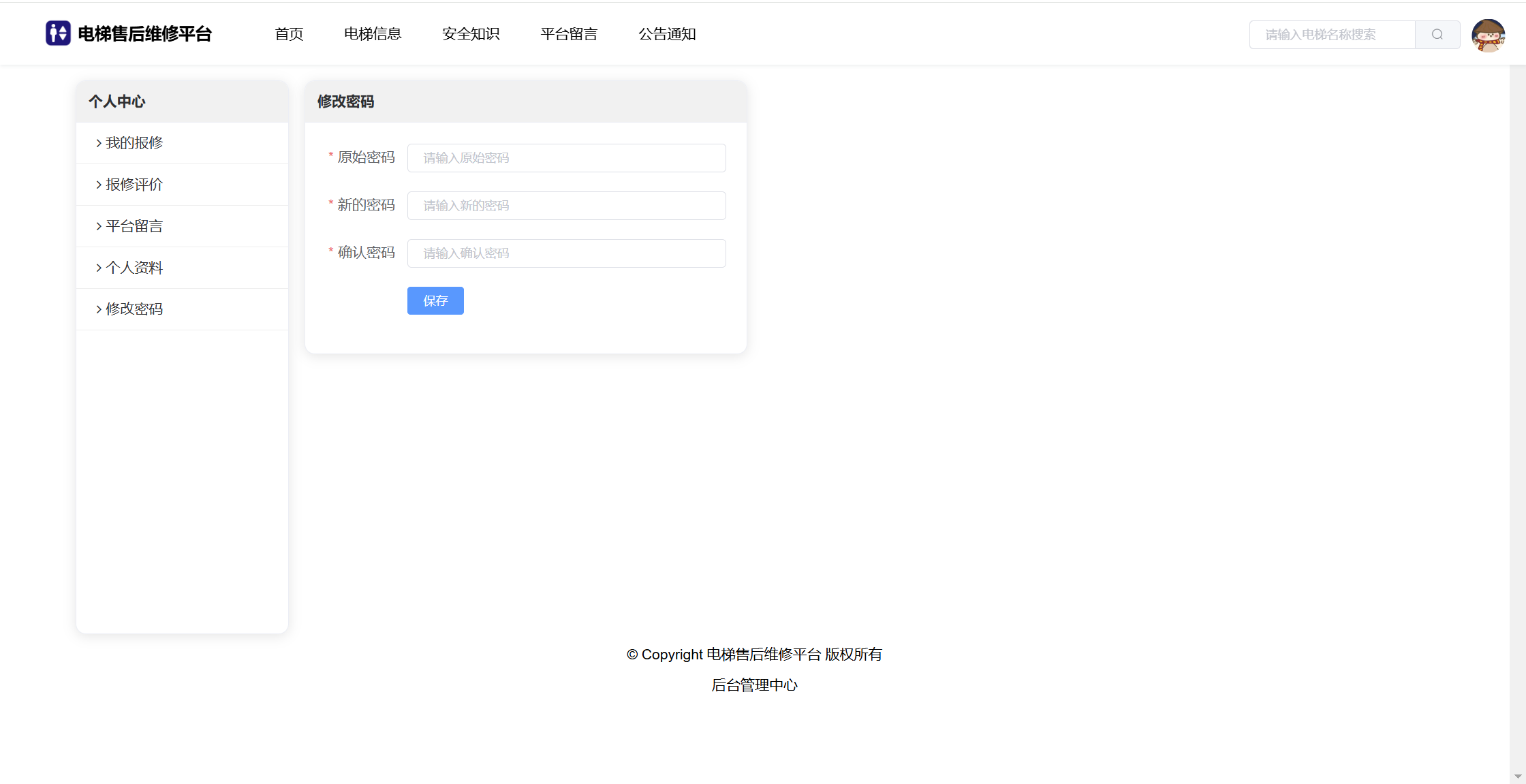 用户:注册、登录系统;首页;电梯信息(分类、详情、报修);安全知识(详情、收藏);平台留言;个人信息、修改密码。用户还具有个人中心功能,可以管理我的报修、报修评价、平台留言、个人资料、修改密码。