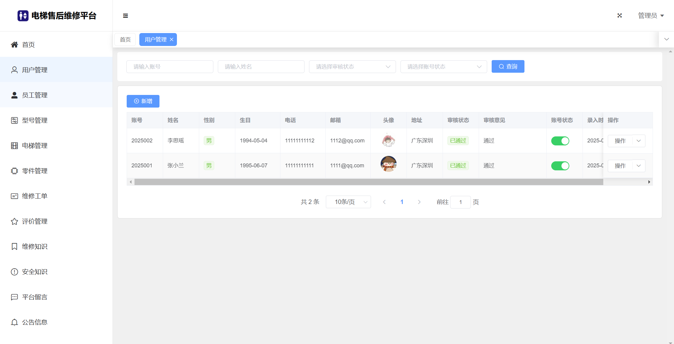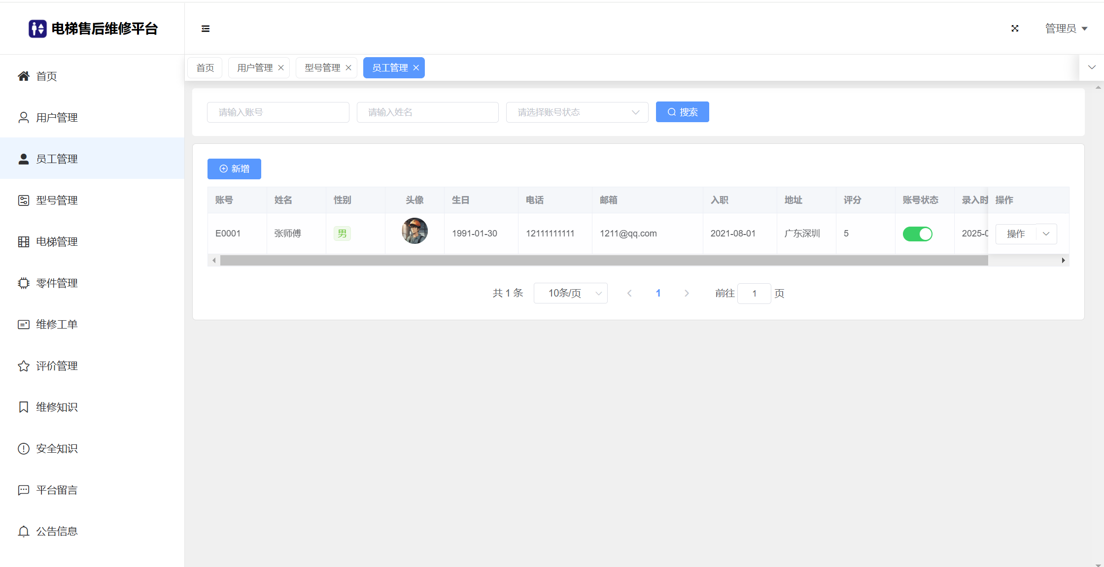 基于SpringBoot+Vue前后端分离的电梯售后维修平台网站,系统包含管理员、员工、用户角色,功能如下: